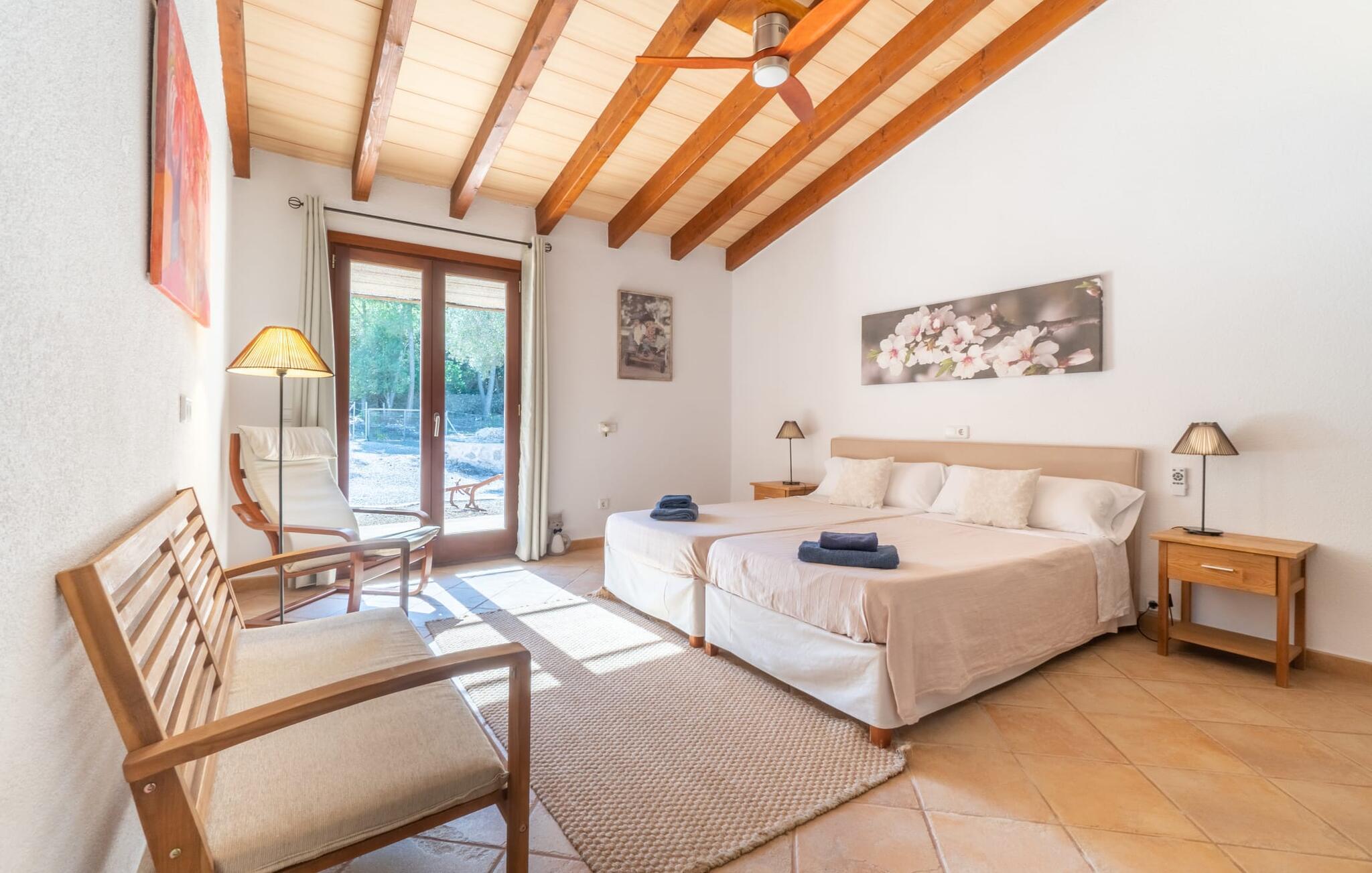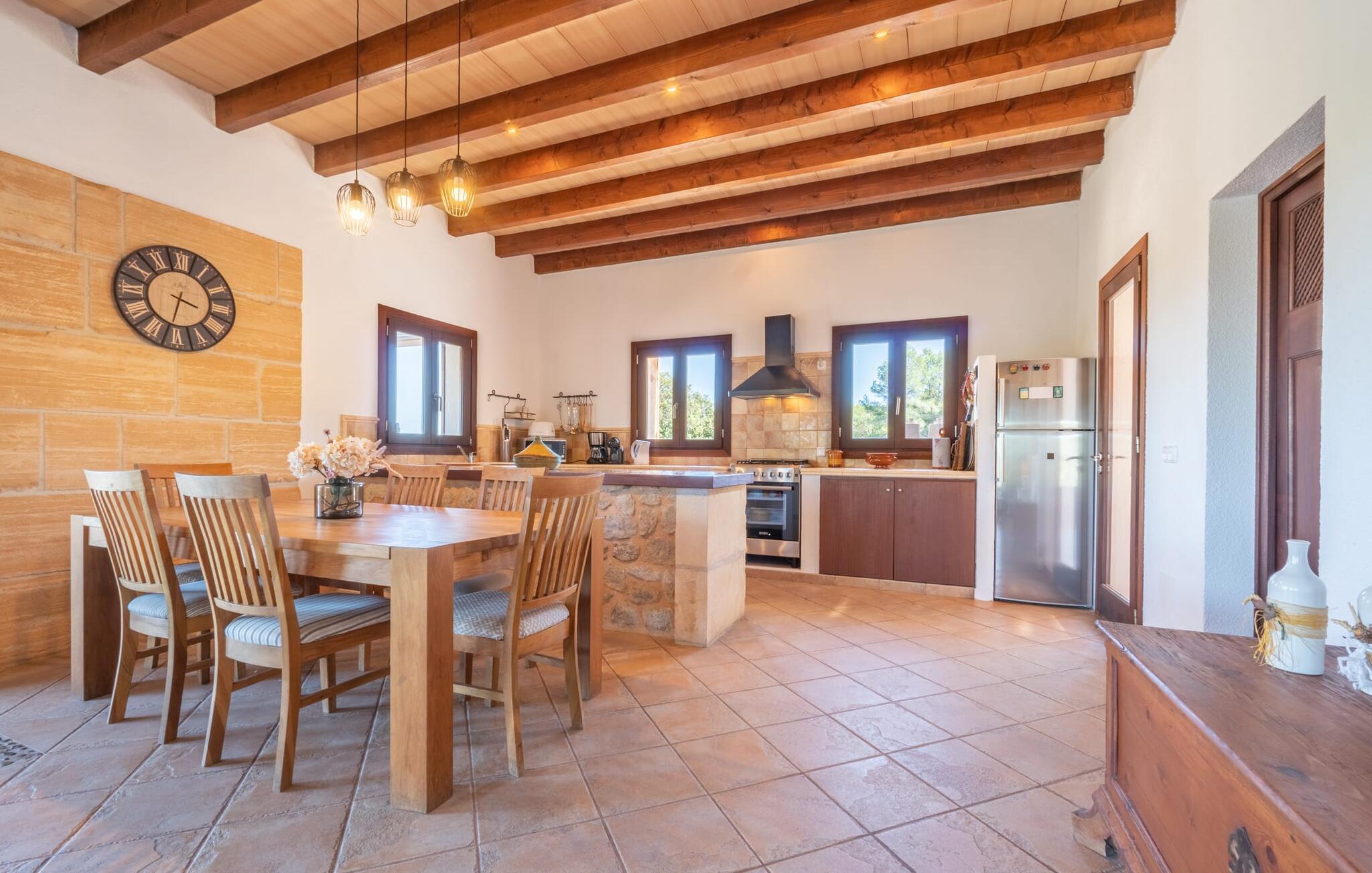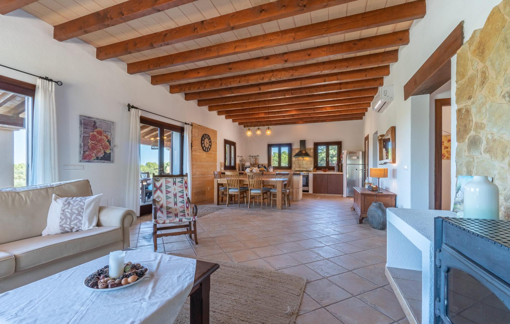 Interiøret i "Bellpuig d'Artà" er moderne, indbydende og hyggeligt - et behagelig midlertidigt hjem. Naturlige og hvide toner dominerer farvesammensætningen, smukt suppleret af de rustikke træbjælker på lofterne og naturstensdetaljer forskellige steder i huset. Det, der er særligt praktisk, er, at I kan finde alt på ét plan – især en aflastning for familier med børn. Det åbne køkken med stort køleskab og spisepladsen med træbord og tilhørende stole samt stuen med den gylden gule sofa, gyngestolen og pejsen er placeret i et rummeligt, langt rum. Villaens boligareal suppleres af to kærligt møblerede soveværelser med dobbeltsenge, hver med rummelige garderobeskabe til jeres ferieudstyr og siddepladser, samt et badeværelse med smukke blå dekorative fliser, et badekar og en murstensbruser.