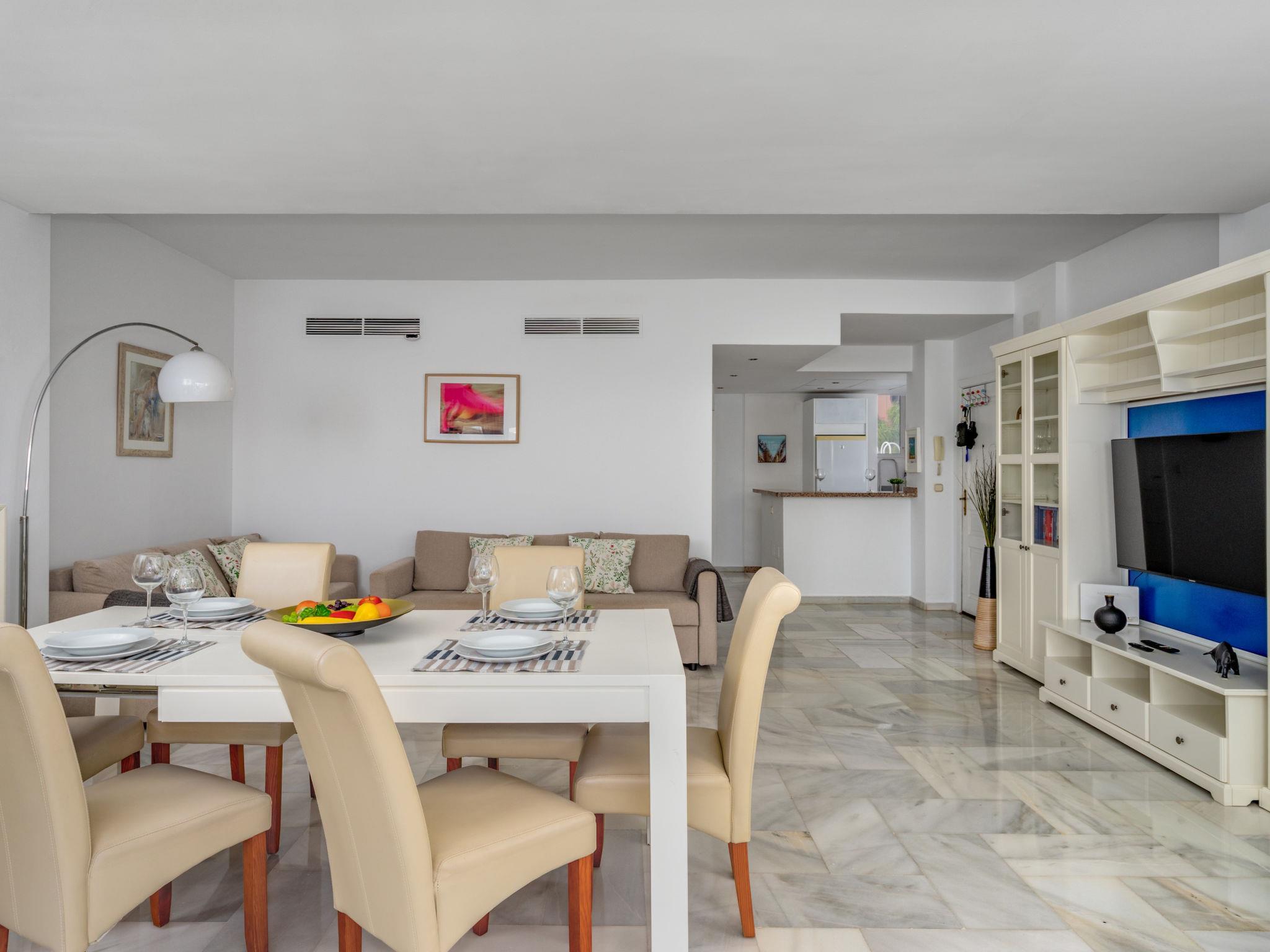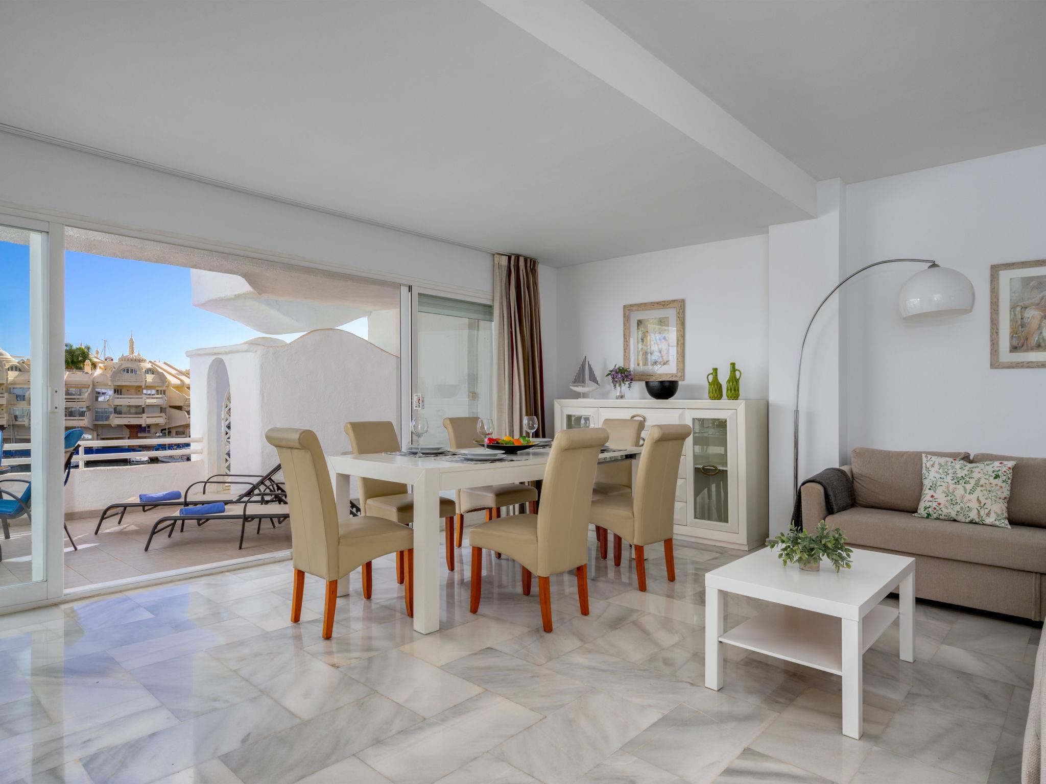 "Puerto Marina", 3-room apartment 100 m2 on 1st floor. Object suitable for 4 adults + 2 children. Beautiful and luxurious furnishings: living/dining room with 1 sofabed, digital TV and flat screen. Exit to the terrace, south facing position. 1 double bedroom with 1 french bed (150 cm). 1 double bedroom with 2 beds (90 cm). Open kitchen (oven, dishwasher, 4 ceramic glass hob hotplates, microwave, freezer). Bath/bidet/WC, shower/WC. Electric heating, air-conditioning. Terrace. Terrace furniture, deck chairs. Marvellous view of the port. Facilities: washing machine. Internet (WiFi, free). Suitable for families. VUT/MA/52689 // Reg. Nr.: ESFCTU0000290350002329100000000000000000VUT/MA/526897