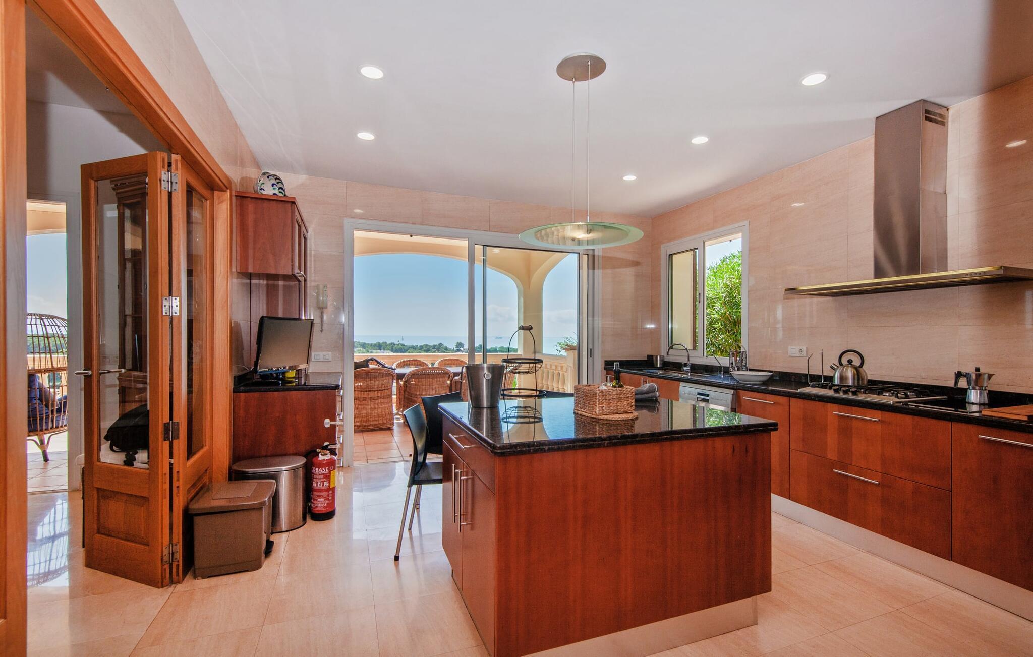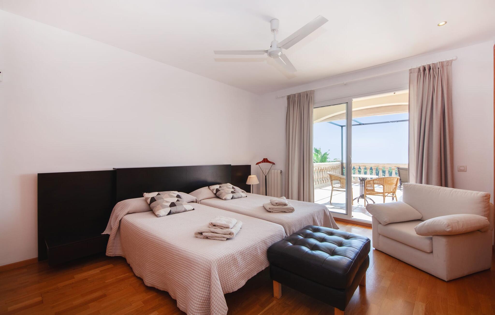 Den sydvendte villa "Bendinat 10" byder på masser af solskin og en betagende udsigt over Palma-bugten. Så snart du kommer ind i indkørslen, vil du bemærke de generøse faciliteter på alle niveauer. Dette er et Fincallorca feriehus. Du kan nå første sal via en elevator i garagen eller en udendørs trappe. En stor overdækket altanterrasse tilbyder vidunderlig udsigt over poolen og Middelhavet, ideel til udendørs spisning med en mobil grill. Den forhøjede poolterrasse, dekoreret med liggestole og i skyggen af palmer, understreger villaens middelhavscharme. Det primære opholdsrum på første sal har en lys-fyldt stue og spisestue i åbent plan med gulv-til-loft glasskydedøre, der fører til balkonterrassen. Det moderne køkken er veludstyret og har egen udgang til terrassen. På denne etage er der desuden et soveværelse med dobbeltseng, et badeværelse med badekar og et vaskerum. På øverste etage er der tre rummelige soveværelser med dobbeltsenge, hvoraf det ene har eget badeværelse, og yderligere to badeværelser. Alle soveværelser har direkte adgang til den øverste terrasse. De sydvendte vinduer har træskodder, og både stueetagen og et soveværelse ovenpå har loftsventilatorer. Villaen er udstyret med aircondition på hver etage, hvilket sikrer komfort under hele dit ophold. Villaen ligger på en bjergskråning i et eksklusivt boligområde 20 minutters kørsel vest for øens hovedstad Palma. Den adelige havn Portals Nous med sin sandstrand ligger mindre end 5 minutter væk i bil. De små badebugter i Illetas kan nås på 7 minutter i bil. Bendinat golfbane ligger kun 2 km fra villaen.