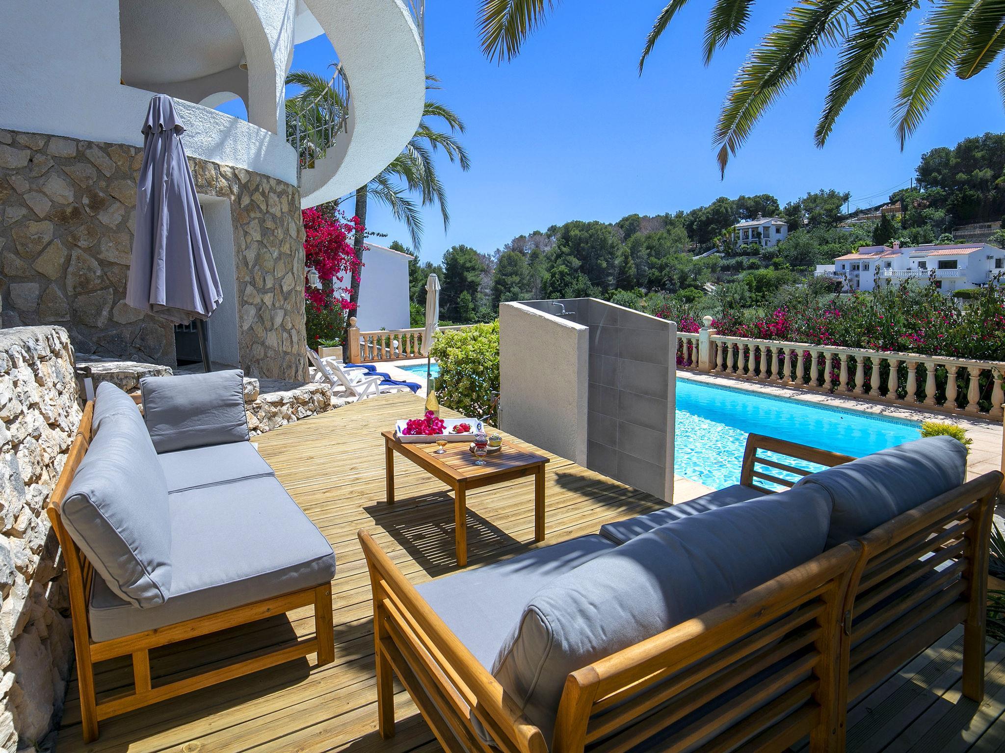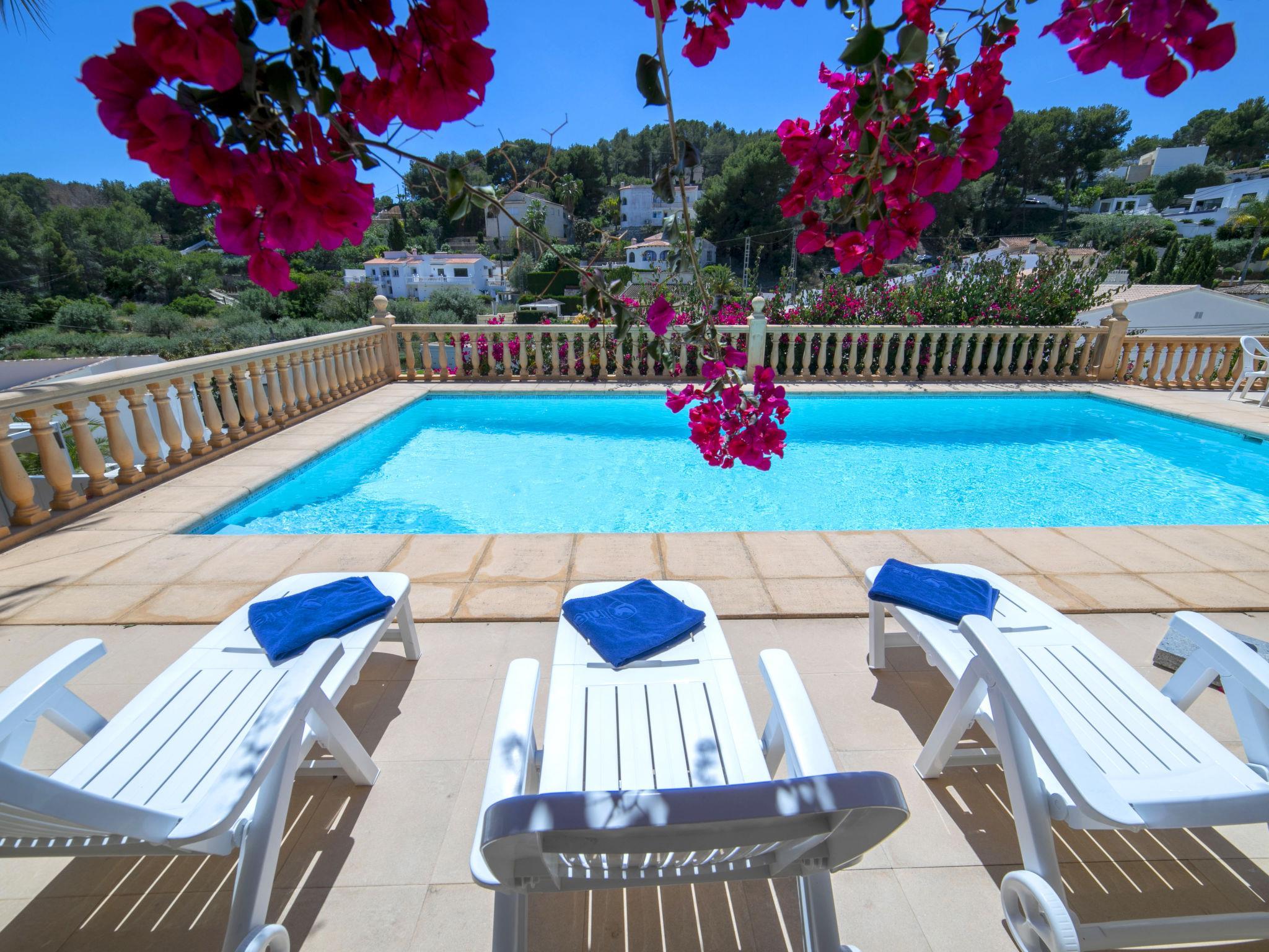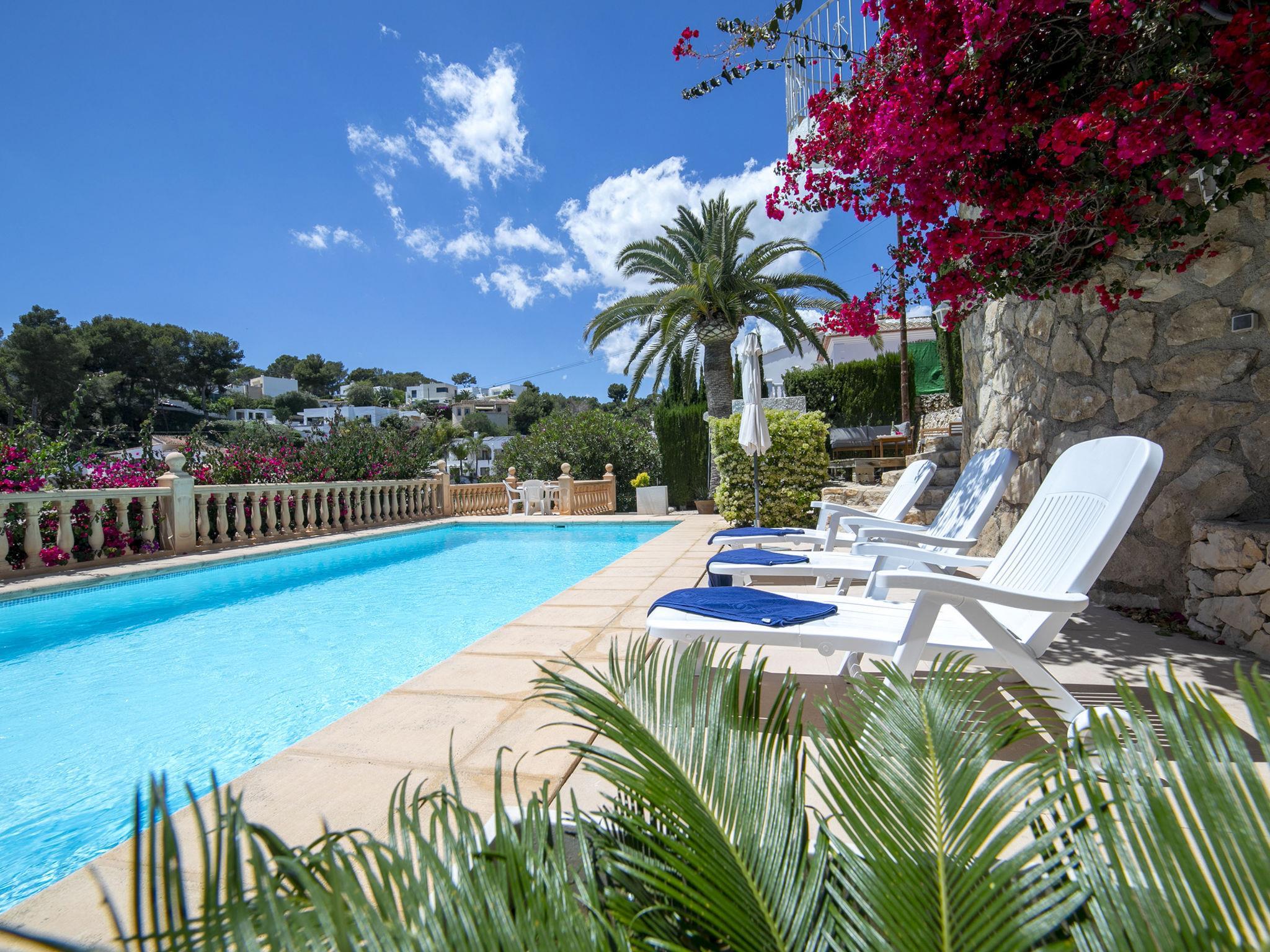 Fanadix: Beautiful villa "Los Amores", 2 storeys. 5 km from the centre of Moraira, 9 km from the centre of Calpe, in a quiet, sunny position residential area (villas), traffic calmed area, 1.3 km from the sea, 3 km from the beach. Private: property (fenced), beautiful garden, swimming pool (10 x 5 m, seasonal availability: 01.Jan. - 31.Dec.). Outdoor shower, terrace, garden furniture, barbecue. Steep motor access. Stepped path (25 steps) to the house. Shop, grocery, supermarket 650 m, restaurant 800 m, bus stop 3 km, sandy beach "Playa La Fustera" 3 km, swimming bay 1 km. Sports harbour 4 km, marina 4 km, golf course (12 hole) 4 km, surf school 4 km, sailing school 4 km, tennis 200 m. Nearby attractions: Aqualandia, Mundomar, Terra Mítica, Terra Natura, Benidorm Palace (Benidorm), Les Fonts de l'Algar, Castillo de Guadalest. The owner does not accept any youth groups.