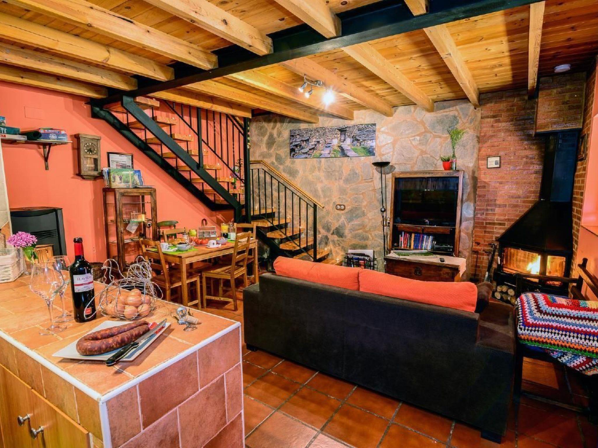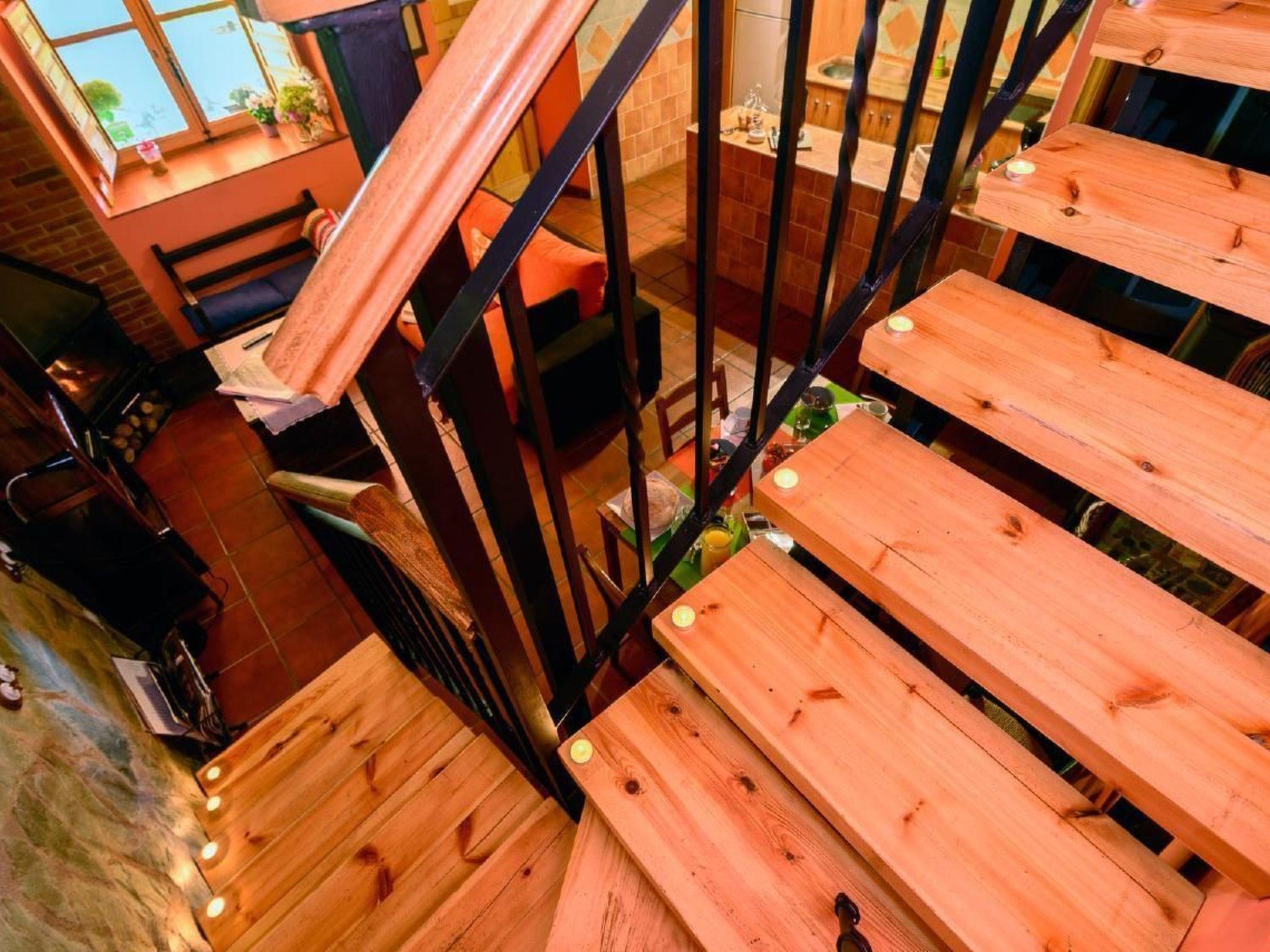 The kitchen has washing machine, fridge , hob , extractor , microwave , toaster, juicer , coffee maker, and all utensils needed for a comfortable stay . The living room has a large comfortable sofa and fireplace for guests to use a wrought iron and wood staircase from here that allows access to the upper floor .
