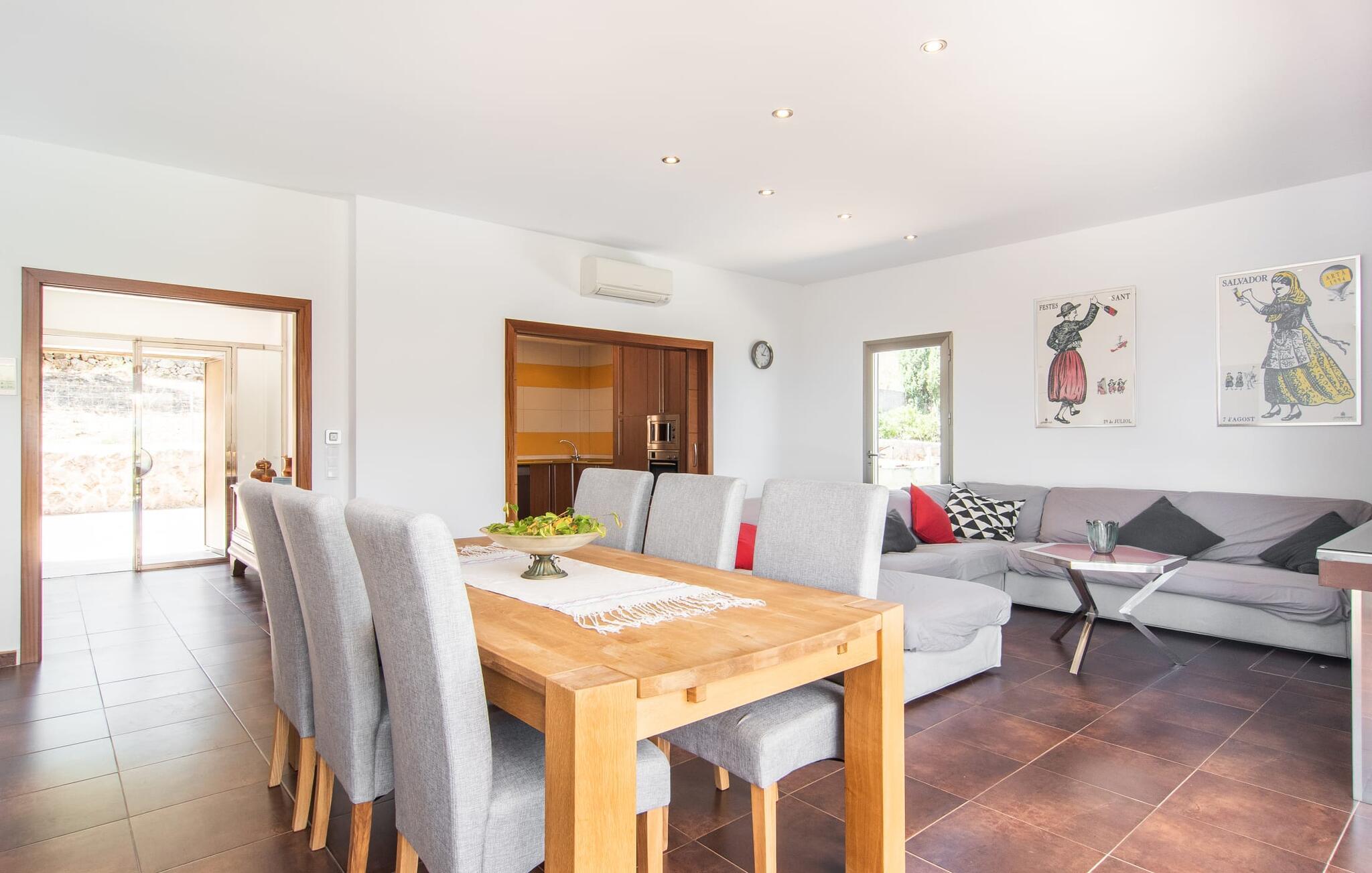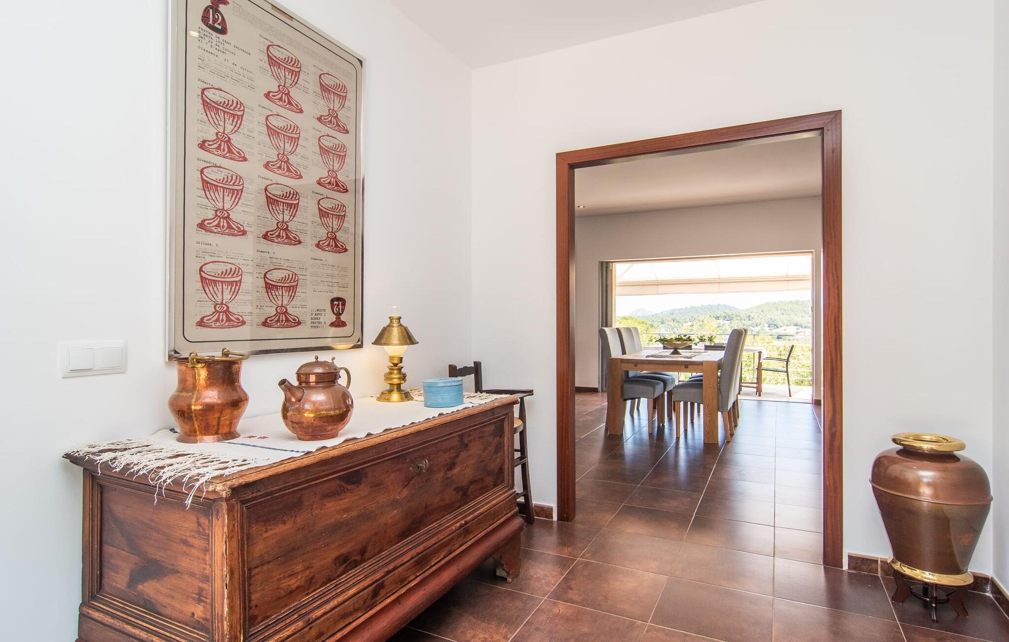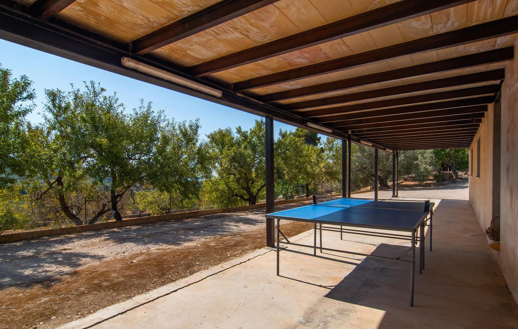 Den smukke villa "Bionic" er idyllisk beliggende mellem byerne Artà og Son Servera og byder sine gæster velkommen i en særdeles indbydende atmosfære. Omgivet af et blidt kuperet landskab, malerisk spækket med træer og skove, passer naturstenshuset dekorativt ind i billedet. Stien til dette feriehus fører forbi mandel- og oliventræer. Den lille beliggenhed på bjergsiden lover en sensationel udsigt. Det rummelige udendørsområde byder på en række muligheder for et skønt ophold udendørs. De små kan lege på græsplænen og terrassearealerne, mens de voksne leder efter et godt sted at slappe af. Et særligt højdepunkt er naturligvis poolen med en imponerende længde på 10 meter, som er designet til at være behagelig hele vejen rundt. Ud over det behagelige faktum, at poolen, beklædt med blå mosaiksten, er meget let tilgængelig via trapper, er det også værd at fremhæve muligheden for at finde masser af plads både under den blå middelhavshimmel og i den luftige skygge under den attraktive pavillon . Uanset hvor I slår jer ned og måske slapper af med stil på poolterrassen – udsigten her er ganske enkelt storslået og bidrager helt sikkert til at opfylde ro og afslapning. Taget på den møblerede terrasse ved huset kan bruges til at give skygge efter behov. I det originale overdækkede udekøkken kan I nemt og nemt tilberede jeres måltider udendørs og nyde dem i godt selskab. Her kan I mødes på varme aftener ved det store bord til en kulinarisk grillmad og nyde solide regionale specialiteter. Stueetagens villa præsenterer den besøgende med sit æstetiske interiør og den tilhørende elegante flair, så snart de kommer ind. I det kombinerede, meget muntert designede opholds- og spiseområde skaber brune toner meget vellykkede kontraster til de strålende lyse lofter og vægge. Store vinduespartier slipper masser af lys ind. Her kan I bruge tid på at læse, spille spil eller se tv og altid blive midt i handlingen. Hvis I ønsker at holde forbindelsen til omverdenen via internettet, kan I bruge den hurtige WiFi internetforbindelse. Spiseområdet er integreret i stuen og tilbyder plads nok til alle rejsende. Fra det store træbord kan I nyde udsigten til bjergene gennem den åbne udgang til terrassen. I det rummelige køkken sørger moderne, højkvalitets apparater for, at madlavning er en fornøjelse selv på ferie. Fuldt udstyret omfatter en kedel og en filterkaffemaskine. Meget forskellige soveværelser, alle kærligt indrettede, tilbyder et ideelt grundlag for en afslappende søvn. Der er fire senge, der måler 0,90 x 2,00 m og en, der måler 1,80 x 2,00 m. De lyse badeværelser imponerer med deres ultramoderne og smagfulde design og har badekar eller bruser. Et strygejern og en hårtørrer er til rådighed i huset, så I ikke behøver at medbringe jeres eget. Den maleriske by Artà kan nås på få minutter i bil. Langt i det fjerne kan man se en slotsbakke, hvorpå resterne af en middelalderfæstning og pilgrimskirken Sant Salvador ligger. I den maleriske gågade kan I se lokalt kunsthåndværk og butikker og opleve travlheden på markedsdagene (hver tirsdag). Hvis I er interesseret, giver det regionale museum information om traditionen med palmevævning og arven fra Talayot-kulturen. I Son Servera er pladsen omkring sognekirken (Sant Joan Baptista) fuld af liv om fredagen, og I kan også købe friske regionale delikatesser der. På få minutter i bil kan I nå de smukke badebyer Cala Torta og Costa de Los Pinos samt de livlige strandområder Cala Ratjada og Cala Millor. Den moderne havudsigt villa "Bionic" er beliggende i en rolig og høj beliggenhed mellem byerne Artà og Son Servera. Køreturen til den smukke by Artà, som er ideel til at shoppe og spise ude, tager cirka 10 minutter, mens Son Servera kun er et par minutter længere væk. Cala Ratjada med sin smukke strandpromenade og havn ligger omkring 13 km væk. Flere sandstrande og skønne badebugter kan nås på meget kort tid.