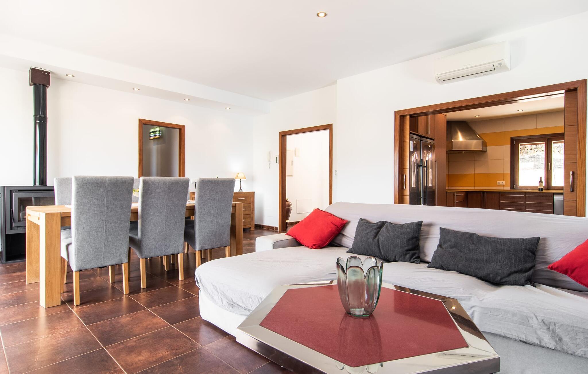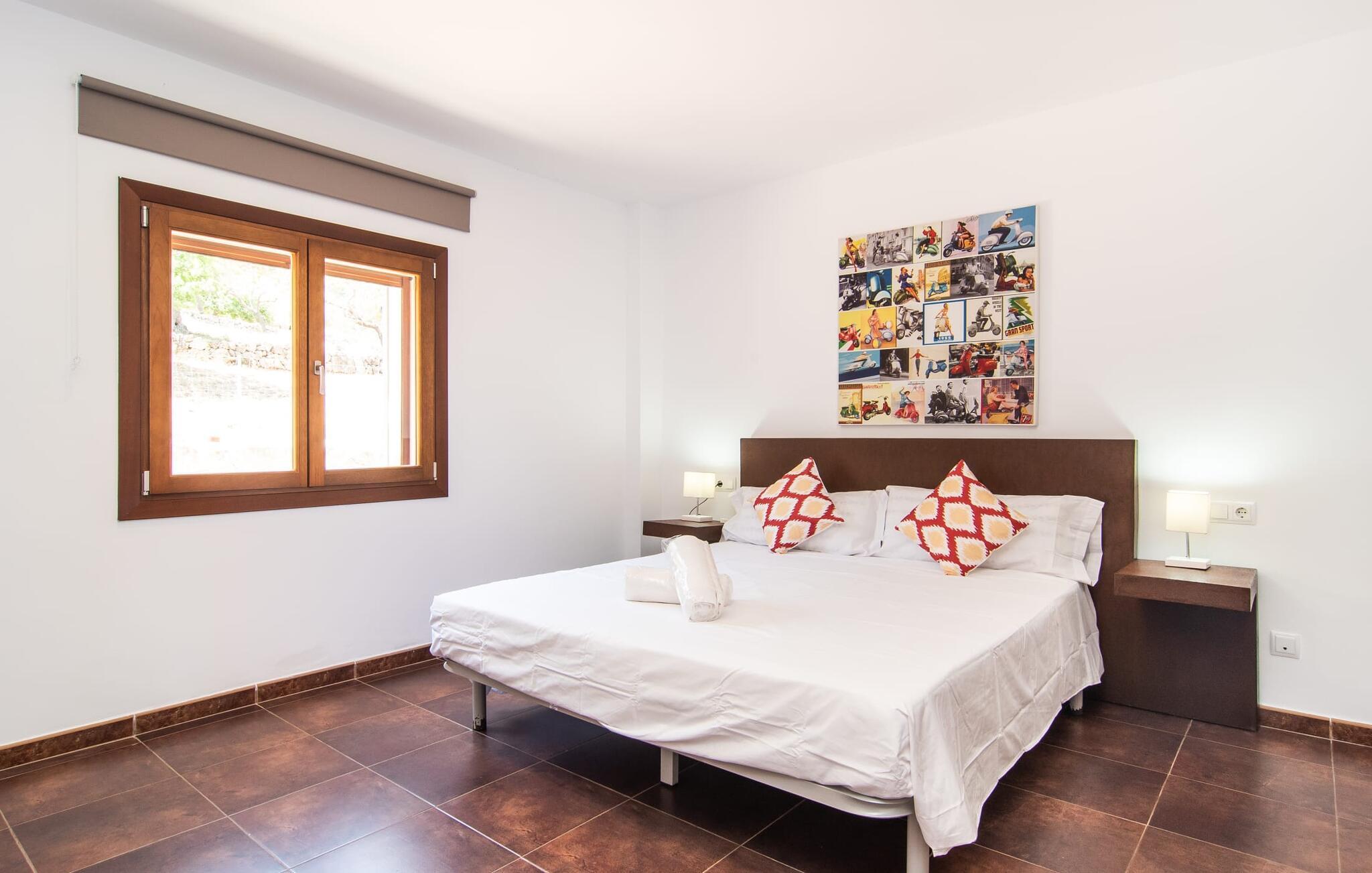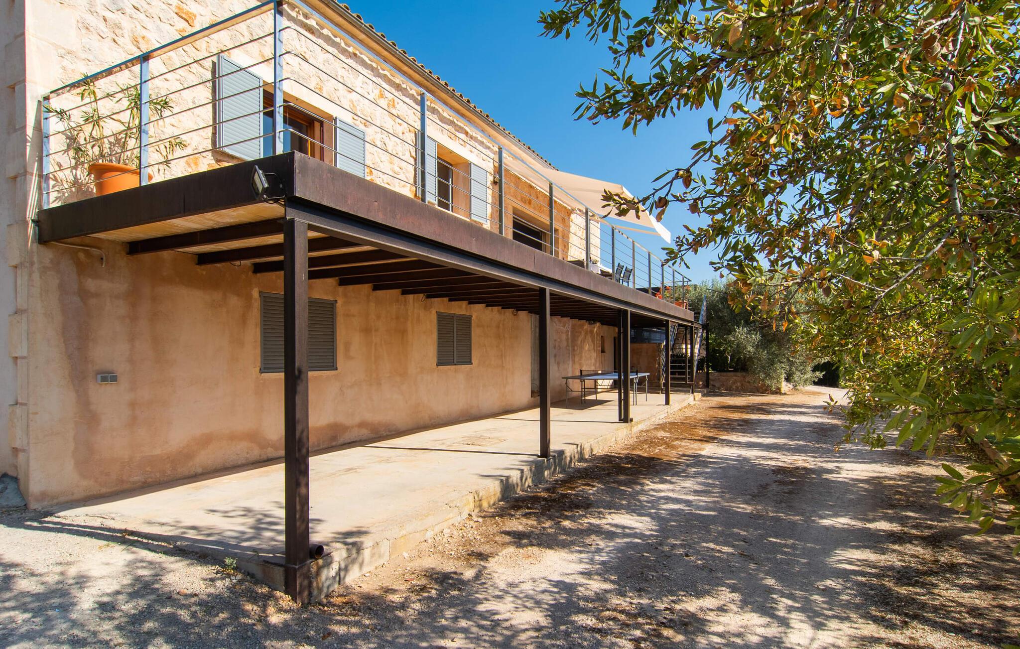 Den smukke villa "Bionic" er idyllisk beliggende mellem byerne Artà og Son Servera og byder sine gæster velkommen i en særdeles indbydende atmosfære. Omgivet af et blidt kuperet landskab, malerisk spækket med træer og skove, passer naturstenshuset dekorativt ind i billedet. Stien til dette feriehus fører forbi mandel- og oliventræer. Den lille beliggenhed på bjergsiden lover en sensationel udsigt. Det rummelige udendørsområde byder på en række muligheder for et skønt ophold udendørs. De små kan lege på græsplænen og terrassearealerne, mens de voksne leder efter et godt sted at slappe af. Et særligt højdepunkt er naturligvis poolen med en imponerende længde på 10 meter, som er designet til at være behagelig hele vejen rundt. Ud over det behagelige faktum, at poolen, beklædt med blå mosaiksten, er meget let tilgængelig via trapper, er det også værd at fremhæve muligheden for at finde masser af plads både under den blå middelhavshimmel og i den luftige skygge under den attraktive pavillon . Uanset hvor I slår jer ned og måske slapper af med stil på poolterrassen – udsigten her er ganske enkelt storslået og bidrager helt sikkert til at opfylde ro og afslapning. Taget på den møblerede terrasse ved huset kan bruges til at give skygge efter behov. I det originale overdækkede udekøkken kan I nemt og nemt tilberede jeres måltider udendørs og nyde dem i godt selskab. Her kan I mødes på varme aftener ved det store bord til en kulinarisk grillmad og nyde solide regionale specialiteter. Stueetagens villa præsenterer den besøgende med sit æstetiske interiør og den tilhørende elegante flair, så snart de kommer ind. I det kombinerede, meget muntert designede opholds- og spiseområde skaber brune toner meget vellykkede kontraster til de strålende lyse lofter og vægge. Store vinduespartier slipper masser af lys ind. Her kan I bruge tid på at læse, spille spil eller se tv og altid blive midt i handlingen. Hvis I ønsker at holde forbindelsen til omverdenen via internettet, kan I bruge den hurtige WiFi internetforbindelse. Spiseområdet er integreret i stuen og tilbyder plads nok til alle rejsende. Fra det store træbord kan I nyde udsigten til bjergene gennem den åbne udgang til terrassen. I det rummelige køkken sørger moderne, højkvalitets apparater for, at madlavning er en fornøjelse selv på ferie. Fuldt udstyret omfatter en kedel og en filterkaffemaskine. Meget forskellige soveværelser, alle kærligt indrettede, tilbyder et ideelt grundlag for en afslappende søvn. Der er fire senge, der måler 0,90 x 2,00 m og en, der måler 1,80 x 2,00 m. De lyse badeværelser imponerer med deres ultramoderne og smagfulde design og har badekar eller bruser. Et strygejern og en hårtørrer er til rådighed i huset, så I ikke behøver at medbringe jeres eget. Den maleriske by Artà kan nås på få minutter i bil. Langt i det fjerne kan man se en slotsbakke, hvorpå resterne af en middelalderfæstning og pilgrimskirken Sant Salvador ligger. I den maleriske gågade kan I se lokalt kunsthåndværk og butikker og opleve travlheden på markedsdagene (hver tirsdag). Hvis I er interesseret, giver det regionale museum information om traditionen med palmevævning og arven fra Talayot-kulturen. I Son Servera er pladsen omkring sognekirken (Sant Joan Baptista) fuld af liv om fredagen, og I kan også købe friske regionale delikatesser der. På få minutter i bil kan I nå de smukke badebyer Cala Torta og Costa de Los Pinos samt de livlige strandområder Cala Ratjada og Cala Millor. Den moderne havudsigt villa "Bionic" er beliggende i en rolig og høj beliggenhed mellem byerne Artà og Son Servera. Køreturen til den smukke by Artà, som er ideel til at shoppe og spise ude, tager cirka 10 minutter, mens Son Servera kun er et par minutter længere væk. Cala Ratjada med sin smukke strandpromenade og havn ligger omkring 13 km væk. Flere sandstrande og skønne badebugter kan nås på meget kort tid.