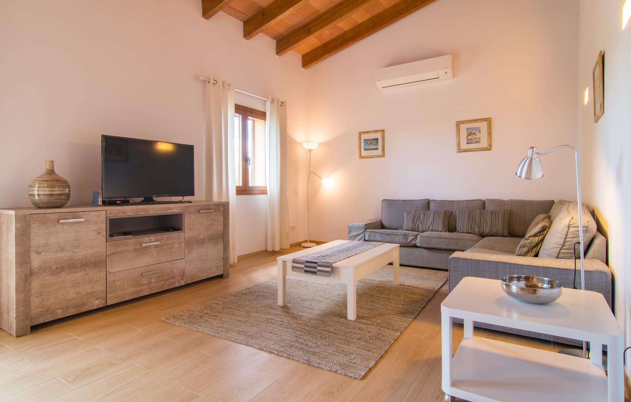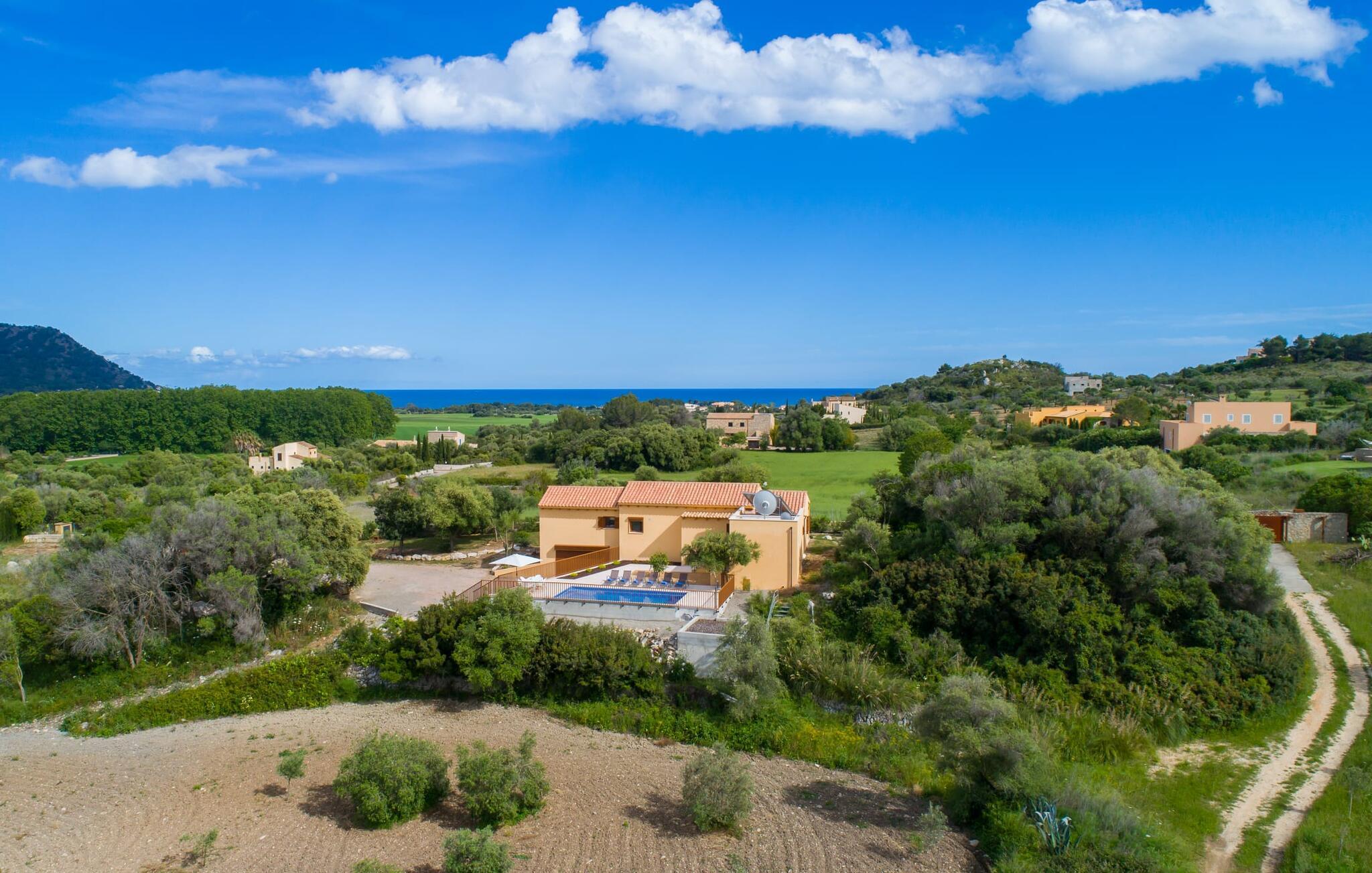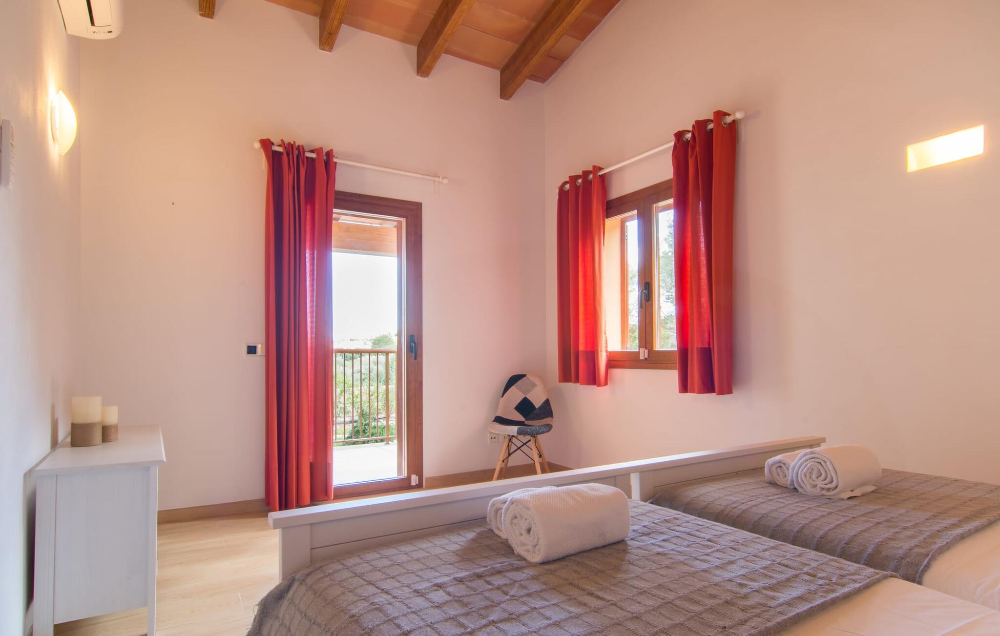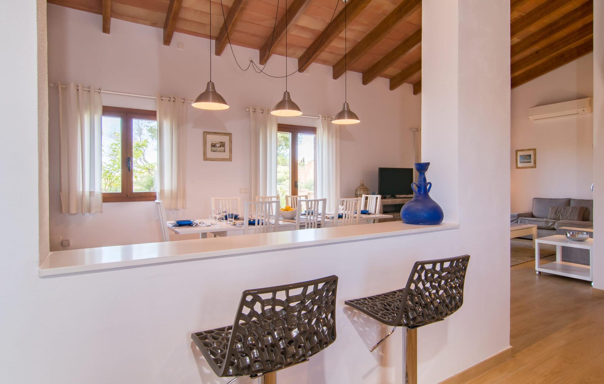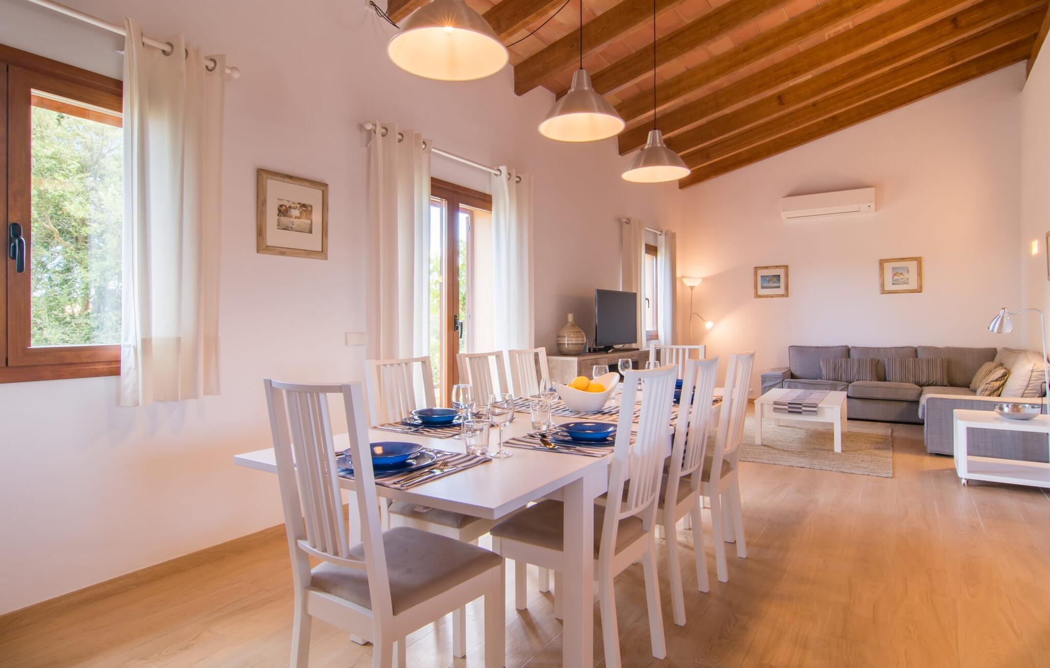 Villaen "Bon Temps Pula Rustic" ligger på en kæmpe 15.000 m² stor grund. I kan parkere jeres bil lige ved siden af huset; En lille trappe fører op til hoveddøren. Lad os først tage et kig på det udendørs område: Fra den store solterrasse har I en fantastisk udsigt over ejendommen og det maleriske landskab. En 8 x 4 m pool med trappetrin byder på velkommen afkøling og vandsjov for hele familien, især på varme sommerdage. Lige ved siden af poolen finder I komfortable liggestole, hvor I kan solbade af hjertens lyst. Det store spisebord, i skyggen af en parasol, er et hyggeligt sted til morgenmad. Det er særligt smukt om aftenen, når I kan se solnedgangen over Serres de Llevant-bjergkæden med en kølig drink. Til huset hører også en kulgrill, ideel til at grille frisk fisk og andre lækre delikatesser. En trappe fører fra terrassen ned til en indre gårdhave, som er velegnet til eksempelvis fodbold. Ejendommen har adgang til smukke vandrestier, der fører gennem uberørt natur. Alle værelser i denne 150 m² store ejendom ligger i stueetagen. Opholdsstuen med lyst, moderne design, komfortabel sofagruppe og stort spisebord er direkte forbundet med det åbne køkken. Træbjælkelofter, hvide møbler, beige og grå nuancer og indirekte lyskilder skaber en indbydende atmosfære. Et stort fladskærms-tv er også tilgængeligt. Hvis I foretrækker at surfe på internettet uden datavolumen, kan I nyde WLAN-forbindelsen: Det betyder, at I kan dele jeres feriebilleder med jeres kære derhjemme. Køkkenet med barområde har køleskab i fuld størrelse, ovn og mikroovn. Villaens tre soveværelser er indrettet i lyse farver. To soveværelser har dobbeltsenge, private badeværelser og små terrasser. Det andet soveværelse har to enkeltsenge og et badeværelse med bruseniche. Takket være klimaanlægget kan I regulere temperaturen i alle soveværelser, så I ikke sveder, selv når det er varmt. jeres feriehus ligger i landlige omgivelser, indlejret i smuk natur: Duften af vild fennikel, rosmarinplanter, fyrretræer og oleandere kombineres med den salte middelhavsluft for at skabe den umiskendelige duft af Serres de Llevant, som løber parallelt med den østlige del af kysten. Nærheden til havet og en række smukke små byer og landsbyer, der har bevaret essensen af Mallorca, gør denne ejendom særligt attraktiv for aktive feriegæster, der gerne vil pakke meget ind. Takket være gode transportforbindelser kan I være på den smukke Costa dels Pins på mindre end 10 minutter. Der kan I slentre gennem en drømmende kystby forbi imponerende villaer eller nyde det turkise vand og den utrolige sandstrand. Den populære Canyamel Bay med liggestole og brusere er heller ikke langt væk. I det nærliggende feriested San Lorenzo er der et helt særligt ugentligt marked hver torsdag: Økologiske produkter er i fokus på dette økologiske marked, men også kunsthåndværk og lokalt dyrket vin. Der er også flere golfbaner med varierede fairways i regionen. Villaen "Bon Temps Pula Rustic", bygget i 2017, er omgivet af smukke naturomgivelser i en afsondret landlig beliggenhed nær feriebyen Son Servera på Mallorcas østkyst. På mindre end 10 minutter i bil kan I nå Coasta dels Pins med dets turkise vand, fine sand og den legendariske Bar Playa. Den populære Pula Golf er endda i nærheden, en af de mest udfordrende golfbaner på øen. Der er talrige butikker og vidunderlige ugentlige markeder i de omkringliggende byer.