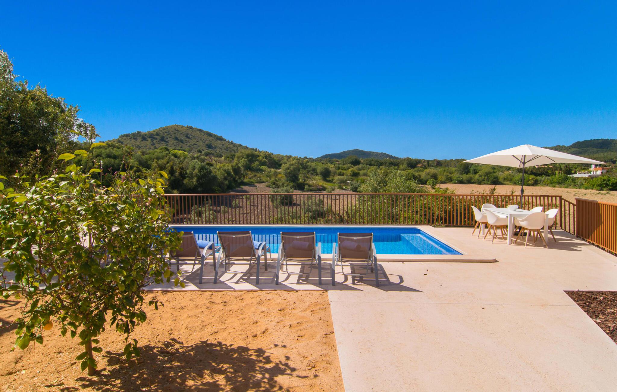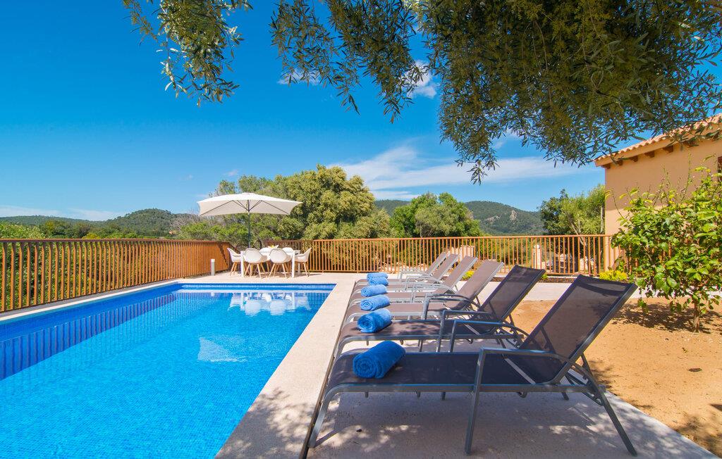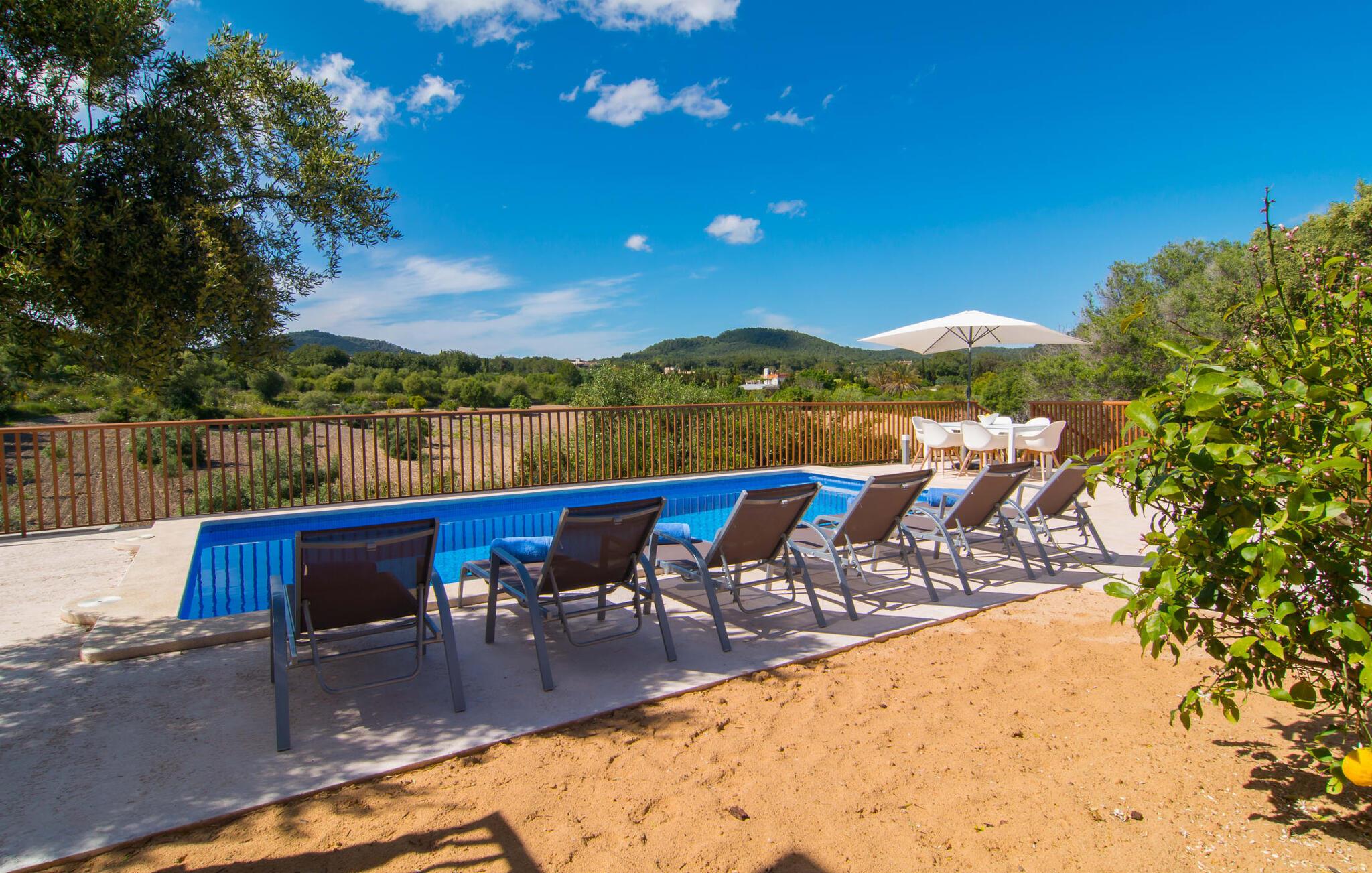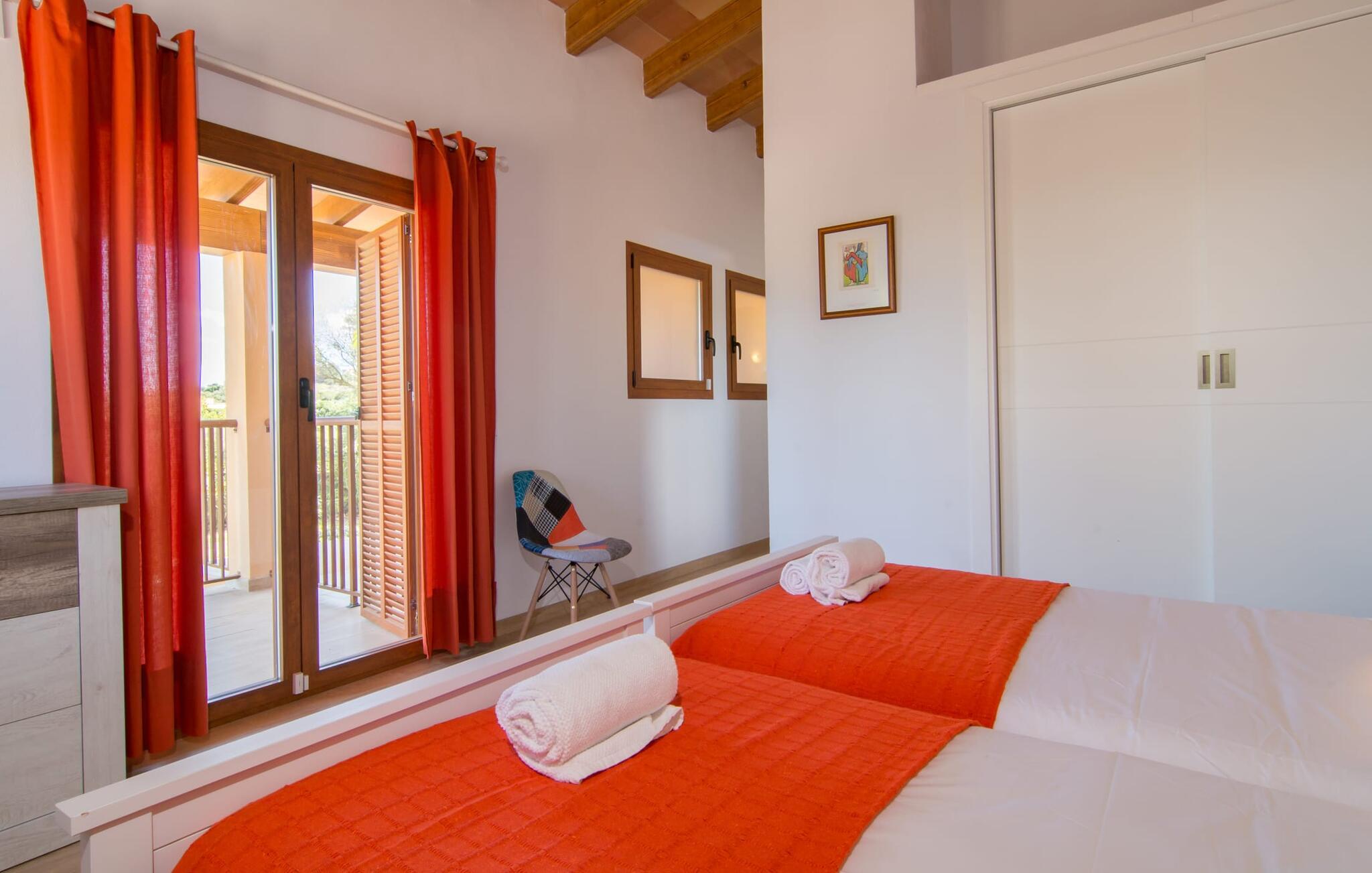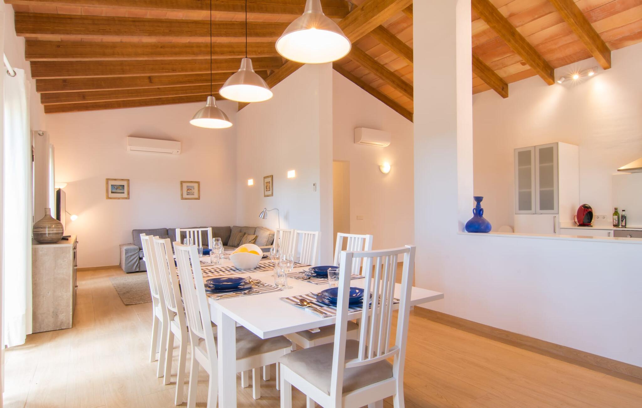 Villaen "Bon Temps Pula Rustic" ligger på en kæmpe 15.000 m² stor grund. I kan parkere jeres bil lige ved siden af huset; En lille trappe fører op til hoveddøren. Lad os først tage et kig på det udendørs område: Fra den store solterrasse har I en fantastisk udsigt over ejendommen og det maleriske landskab. En 8 x 4 m pool med trappetrin byder på velkommen afkøling og vandsjov for hele familien, især på varme sommerdage. Lige ved siden af poolen finder I komfortable liggestole, hvor I kan solbade af hjertens lyst. Det store spisebord, i skyggen af en parasol, er et hyggeligt sted til morgenmad. Det er særligt smukt om aftenen, når I kan se solnedgangen over Serres de Llevant-bjergkæden med en kølig drink. Til huset hører også en kulgrill, ideel til at grille frisk fisk og andre lækre delikatesser. En trappe fører fra terrassen ned til en indre gårdhave, som er velegnet til eksempelvis fodbold. Ejendommen har adgang til smukke vandrestier, der fører gennem uberørt natur. Alle værelser i denne 150 m² store ejendom ligger i stueetagen. Opholdsstuen med lyst, moderne design, komfortabel sofagruppe og stort spisebord er direkte forbundet med det åbne køkken. Træbjælkelofter, hvide møbler, beige og grå nuancer og indirekte lyskilder skaber en indbydende atmosfære. Et stort fladskærms-tv er også tilgængeligt. Hvis I foretrækker at surfe på internettet uden datavolumen, kan I nyde WLAN-forbindelsen: Det betyder, at I kan dele jeres feriebilleder med jeres kære derhjemme. Køkkenet med barområde har køleskab i fuld størrelse, ovn og mikroovn. Villaens tre soveværelser er indrettet i lyse farver. To soveværelser har dobbeltsenge, private badeværelser og små terrasser. Det andet soveværelse har to enkeltsenge og et badeværelse med bruseniche. Takket være klimaanlægget kan I regulere temperaturen i alle soveværelser, så I ikke sveder, selv når det er varmt. jeres feriehus ligger i landlige omgivelser, indlejret i smuk natur: Duften af vild fennikel, rosmarinplanter, fyrretræer og oleandere kombineres med den salte middelhavsluft for at skabe den umiskendelige duft af Serres de Llevant, som løber parallelt med den østlige del af kysten. Nærheden til havet og en række smukke små byer og landsbyer, der har bevaret essensen af Mallorca, gør denne ejendom særligt attraktiv for aktive feriegæster, der gerne vil pakke meget ind. Takket være gode transportforbindelser kan I være på den smukke Costa dels Pins på mindre end 10 minutter. Der kan I slentre gennem en drømmende kystby forbi imponerende villaer eller nyde det turkise vand og den utrolige sandstrand. Den populære Canyamel Bay med liggestole og brusere er heller ikke langt væk. I det nærliggende feriested San Lorenzo er der et helt særligt ugentligt marked hver torsdag: Økologiske produkter er i fokus på dette økologiske marked, men også kunsthåndværk og lokalt dyrket vin. Der er også flere golfbaner med varierede fairways i regionen. Villaen "Bon Temps Pula Rustic", bygget i 2017, er omgivet af smukke naturomgivelser i en afsondret landlig beliggenhed nær feriebyen Son Servera på Mallorcas østkyst. På mindre end 10 minutter i bil kan I nå Coasta dels Pins med dets turkise vand, fine sand og den legendariske Bar Playa. Den populære Pula Golf er endda i nærheden, en af de mest udfordrende golfbaner på øen. Der er talrige butikker og vidunderlige ugentlige markeder i de omkringliggende byer.