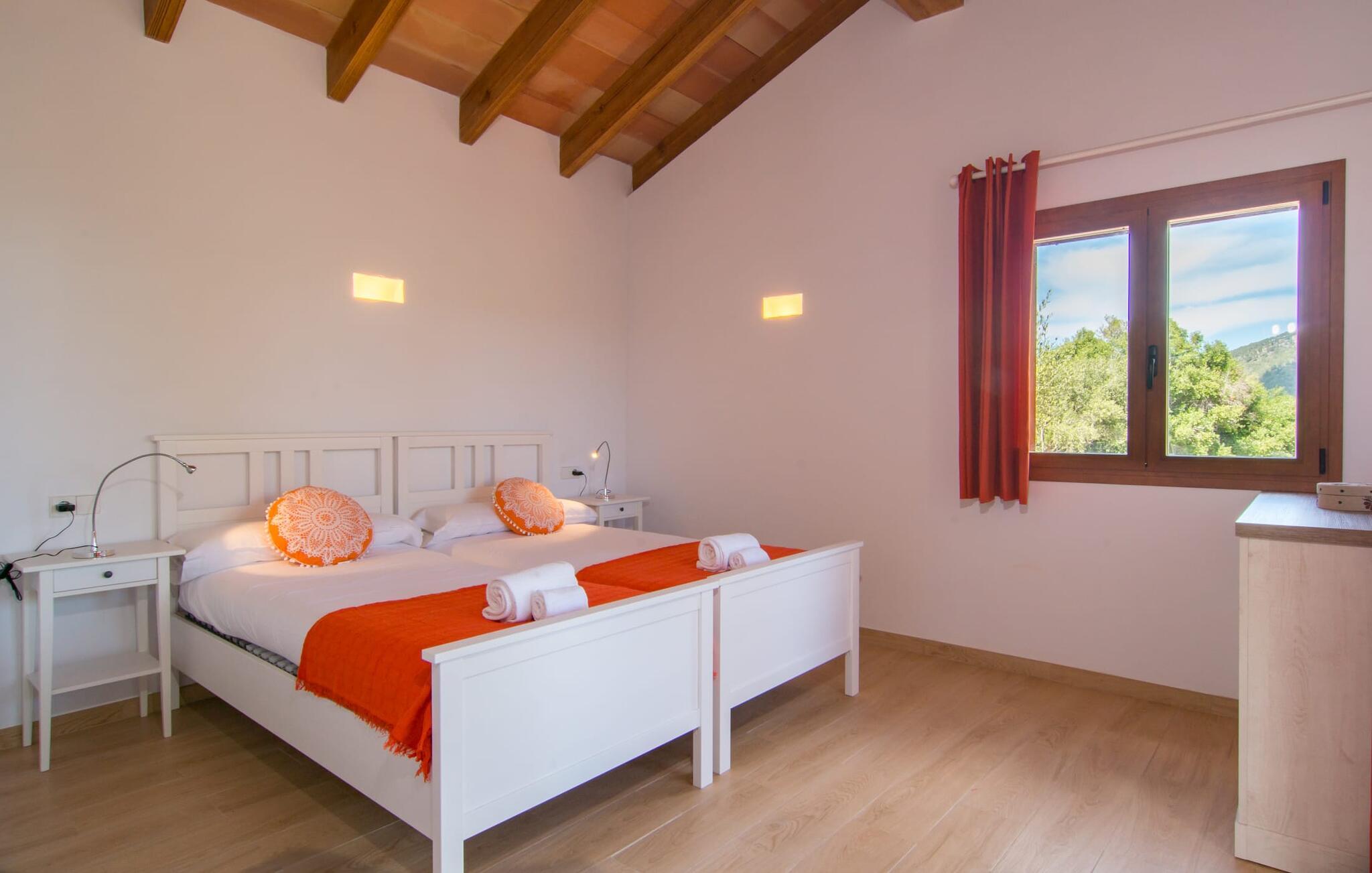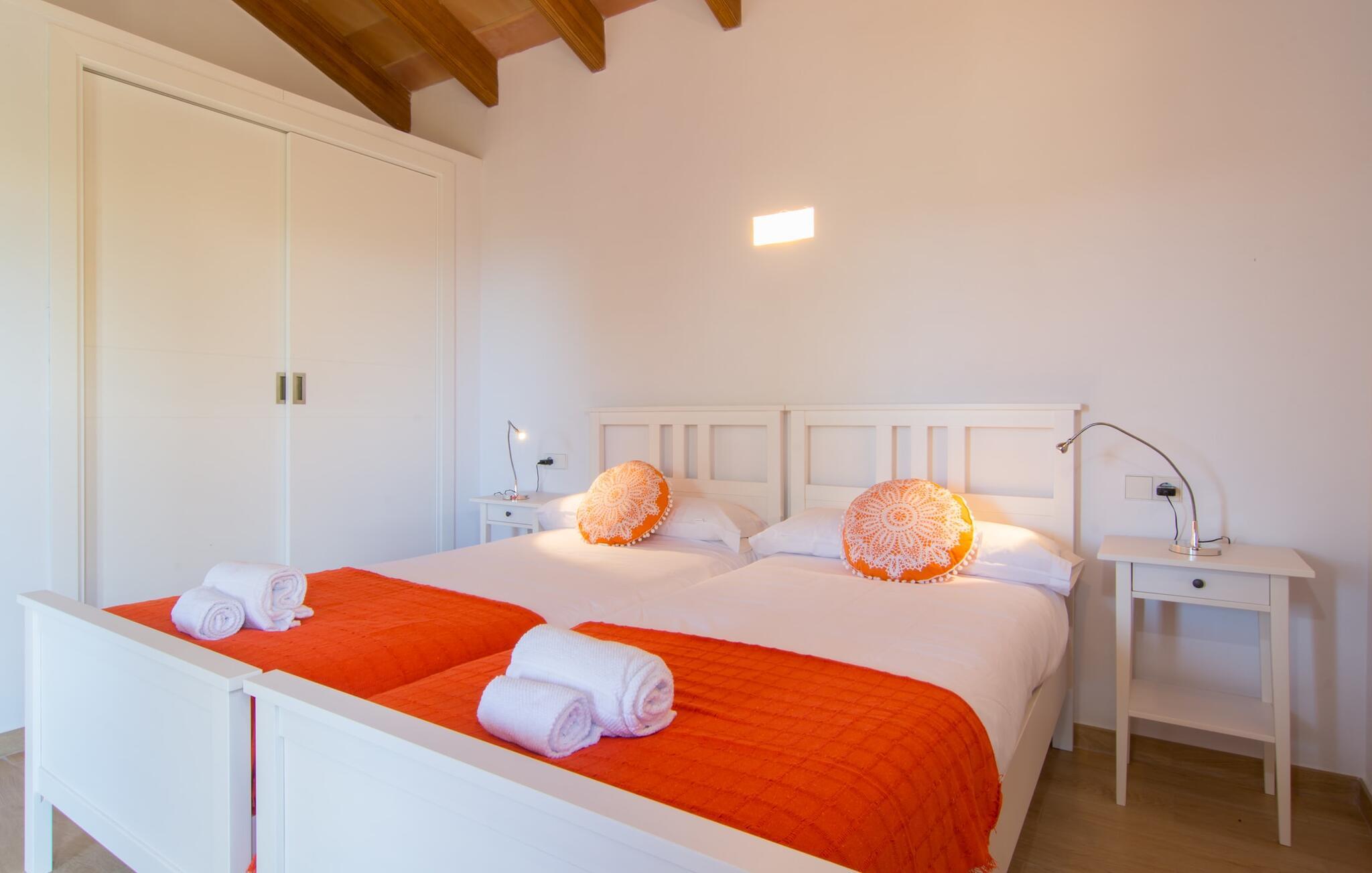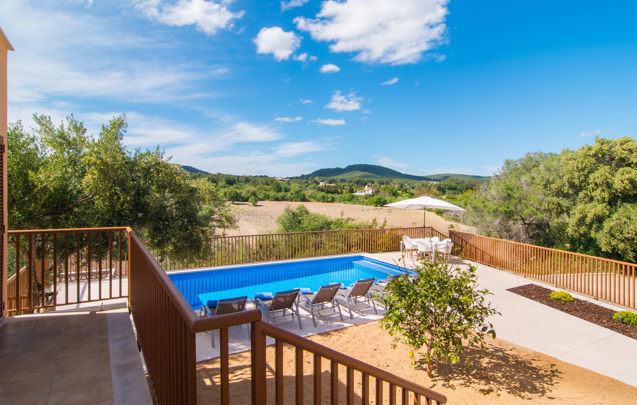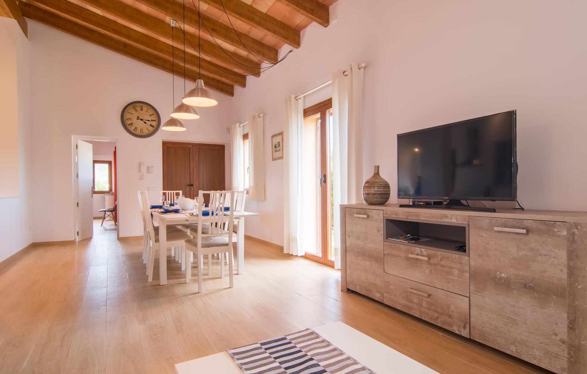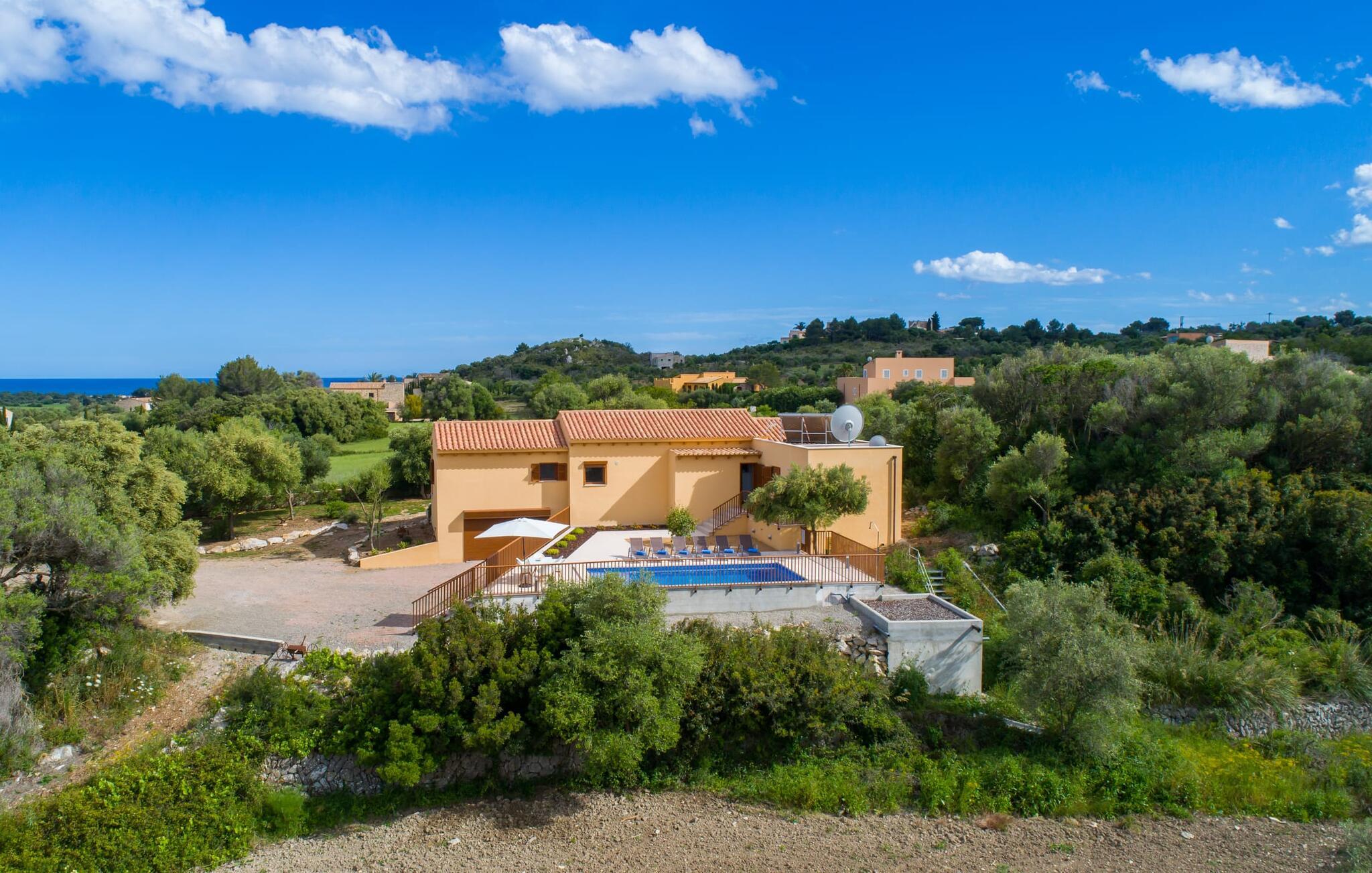 Villaen "Bon Temps Pula Rustic" ligger på en kæmpe 15.000 m² stor grund. I kan parkere jeres bil lige ved siden af huset; En lille trappe fører op til hoveddøren. Lad os først tage et kig på det udendørs område: Fra den store solterrasse har I en fantastisk udsigt over ejendommen og det maleriske landskab. En 8 x 4 m pool med trappetrin byder på velkommen afkøling og vandsjov for hele familien, især på varme sommerdage. Lige ved siden af poolen finder I komfortable liggestole, hvor I kan solbade af hjertens lyst. Det store spisebord, i skyggen af en parasol, er et hyggeligt sted til morgenmad. Det er særligt smukt om aftenen, når I kan se solnedgangen over Serres de Llevant-bjergkæden med en kølig drink. Til huset hører også en kulgrill, ideel til at grille frisk fisk og andre lækre delikatesser. En trappe fører fra terrassen ned til en indre gårdhave, som er velegnet til eksempelvis fodbold. Ejendommen har adgang til smukke vandrestier, der fører gennem uberørt natur. Alle værelser i denne 150 m² store ejendom ligger i stueetagen. Opholdsstuen med lyst, moderne design, komfortabel sofagruppe og stort spisebord er direkte forbundet med det åbne køkken. Træbjælkelofter, hvide møbler, beige og grå nuancer og indirekte lyskilder skaber en indbydende atmosfære. Et stort fladskærms-tv er også tilgængeligt. Hvis I foretrækker at surfe på internettet uden datavolumen, kan I nyde WLAN-forbindelsen: Det betyder, at I kan dele jeres feriebilleder med jeres kære derhjemme. Køkkenet med barområde har køleskab i fuld størrelse, ovn og mikroovn. Villaens tre soveværelser er indrettet i lyse farver. To soveværelser har dobbeltsenge, private badeværelser og små terrasser. Det andet soveværelse har to enkeltsenge og et badeværelse med bruseniche. Takket være klimaanlægget kan I regulere temperaturen i alle soveværelser, så I ikke sveder, selv når det er varmt. jeres feriehus ligger i landlige omgivelser, indlejret i smuk natur: Duften af vild fennikel, rosmarinplanter, fyrretræer og oleandere kombineres med den salte middelhavsluft for at skabe den umiskendelige duft af Serres de Llevant, som løber parallelt med den østlige del af kysten. Nærheden til havet og en række smukke små byer og landsbyer, der har bevaret essensen af Mallorca, gør denne ejendom særligt attraktiv for aktive feriegæster, der gerne vil pakke meget ind. Takket være gode transportforbindelser kan I være på den smukke Costa dels Pins på mindre end 10 minutter. Der kan I slentre gennem en drømmende kystby forbi imponerende villaer eller nyde det turkise vand og den utrolige sandstrand. Den populære Canyamel Bay med liggestole og brusere er heller ikke langt væk. I det nærliggende feriested San Lorenzo er der et helt særligt ugentligt marked hver torsdag: Økologiske produkter er i fokus på dette økologiske marked, men også kunsthåndværk og lokalt dyrket vin. Der er også flere golfbaner med varierede fairways i regionen. Villaen "Bon Temps Pula Rustic", bygget i 2017, er omgivet af smukke naturomgivelser i en afsondret landlig beliggenhed nær feriebyen Son Servera på Mallorcas østkyst. På mindre end 10 minutter i bil kan I nå Coasta dels Pins med dets turkise vand, fine sand og den legendariske Bar Playa. Den populære Pula Golf er endda i nærheden, en af de mest udfordrende golfbaner på øen. Der er talrige butikker og vidunderlige ugentlige markeder i de omkringliggende byer.