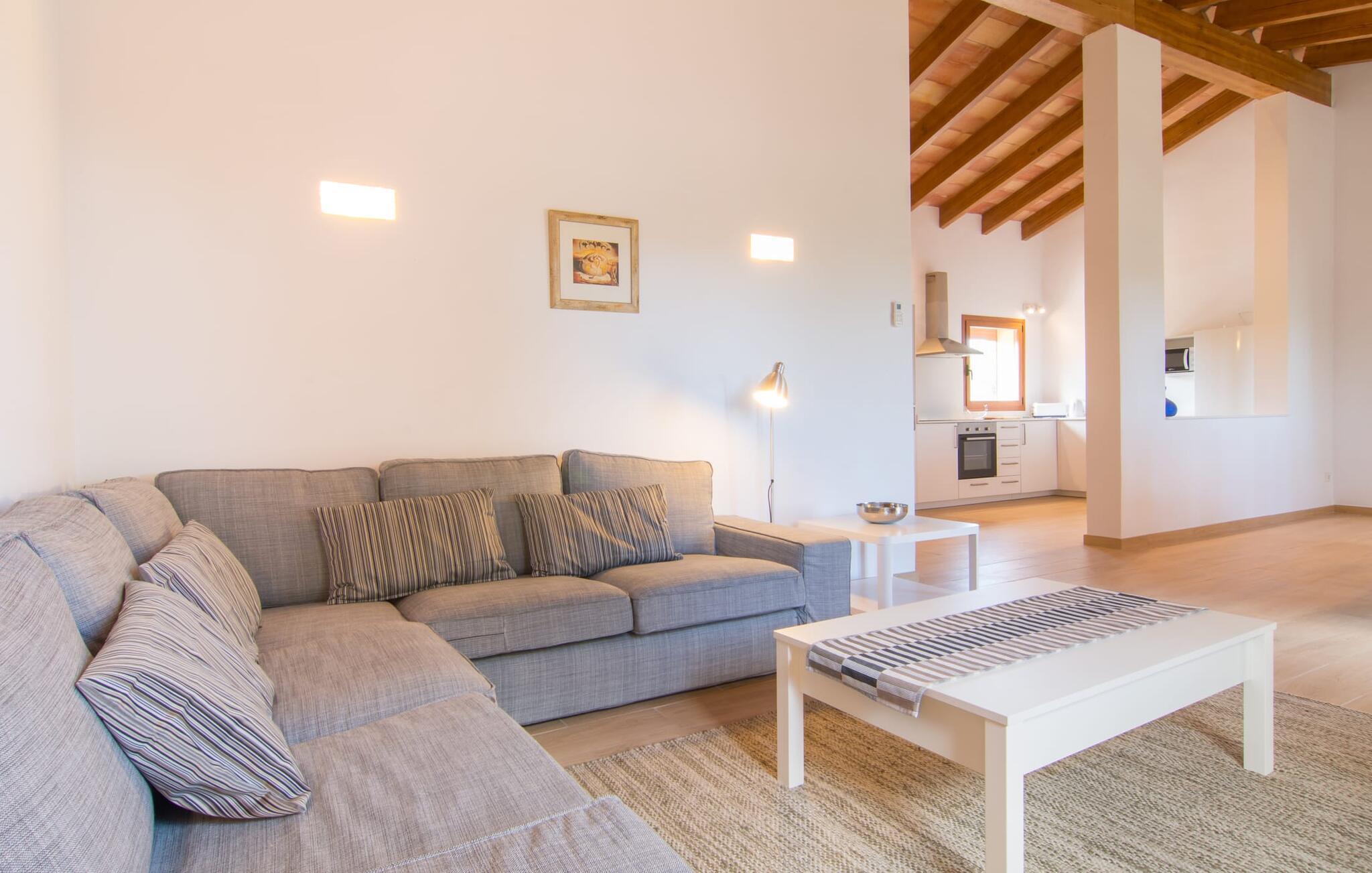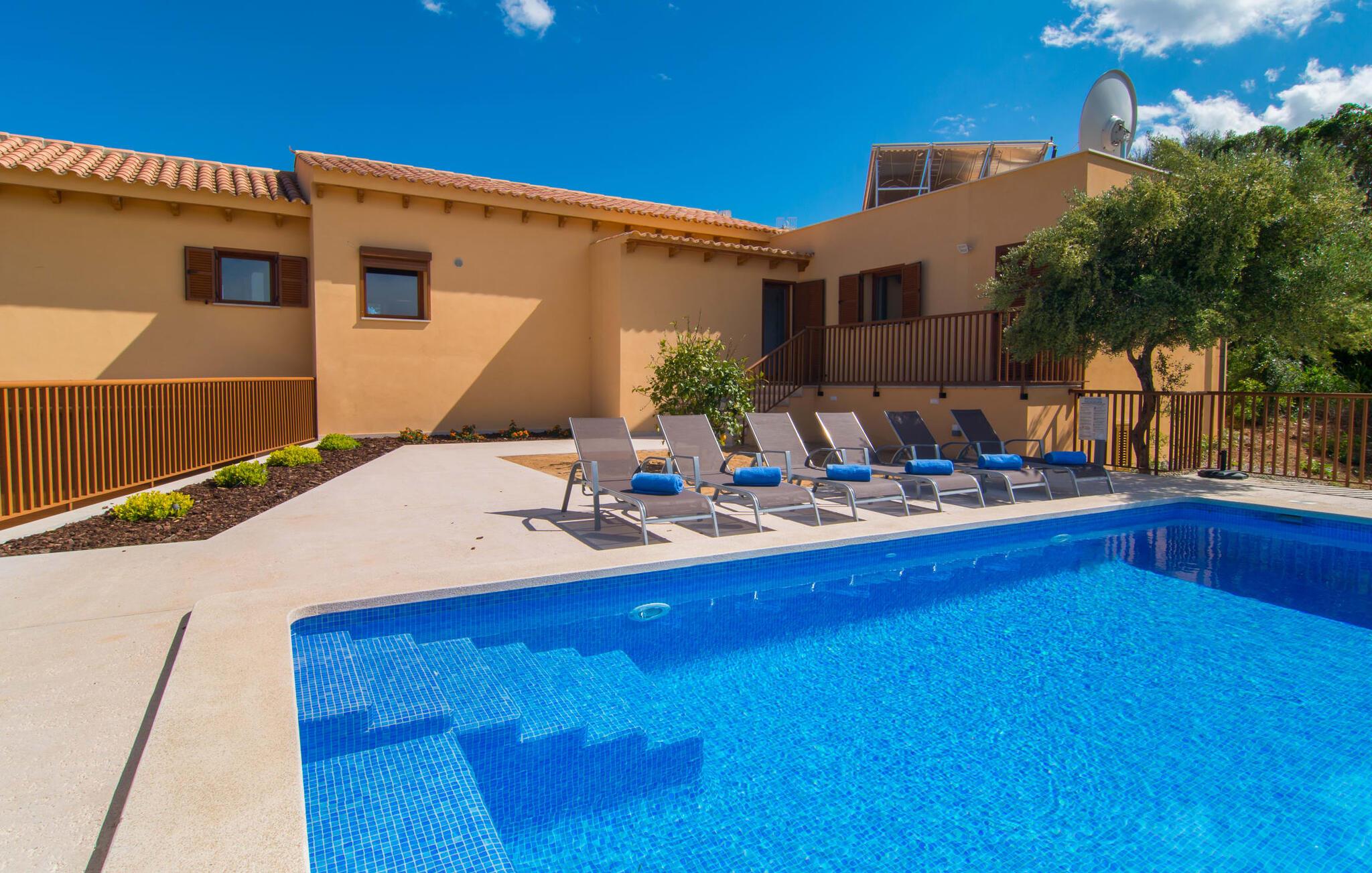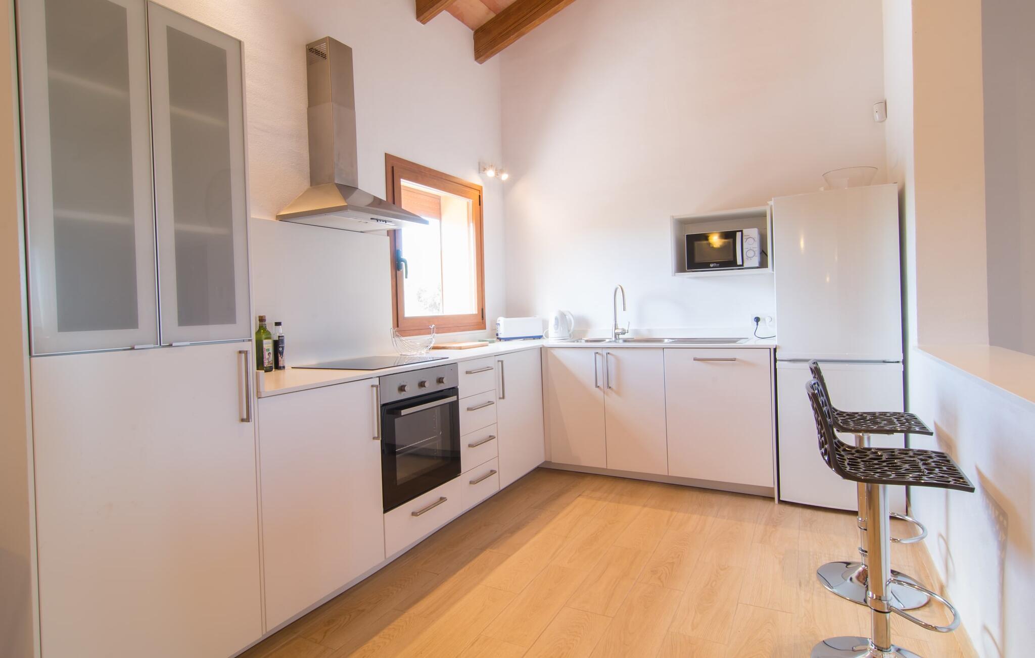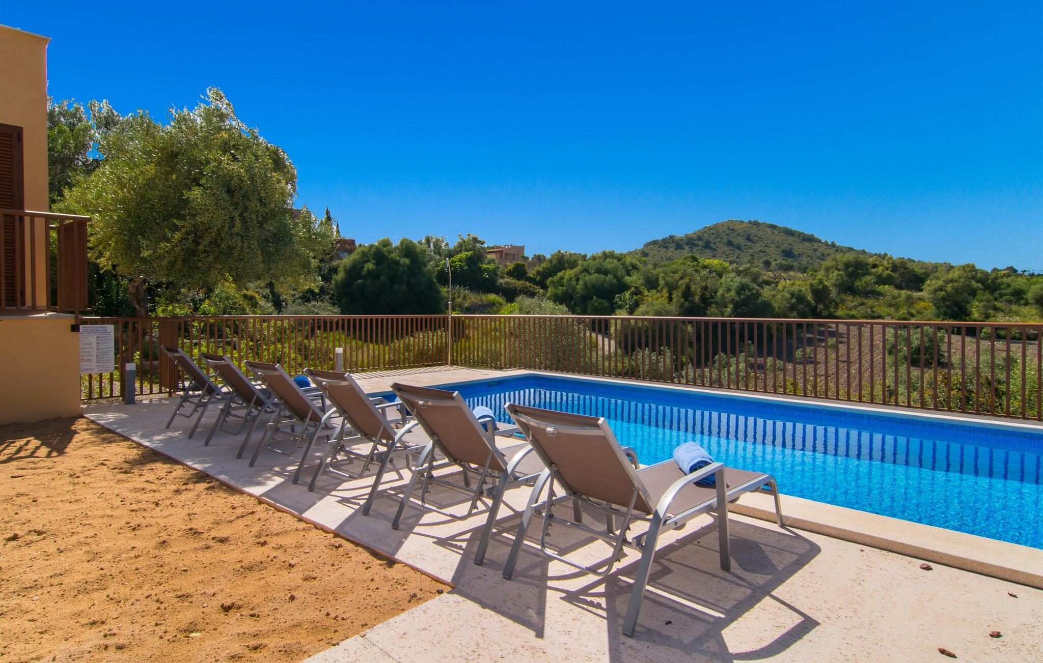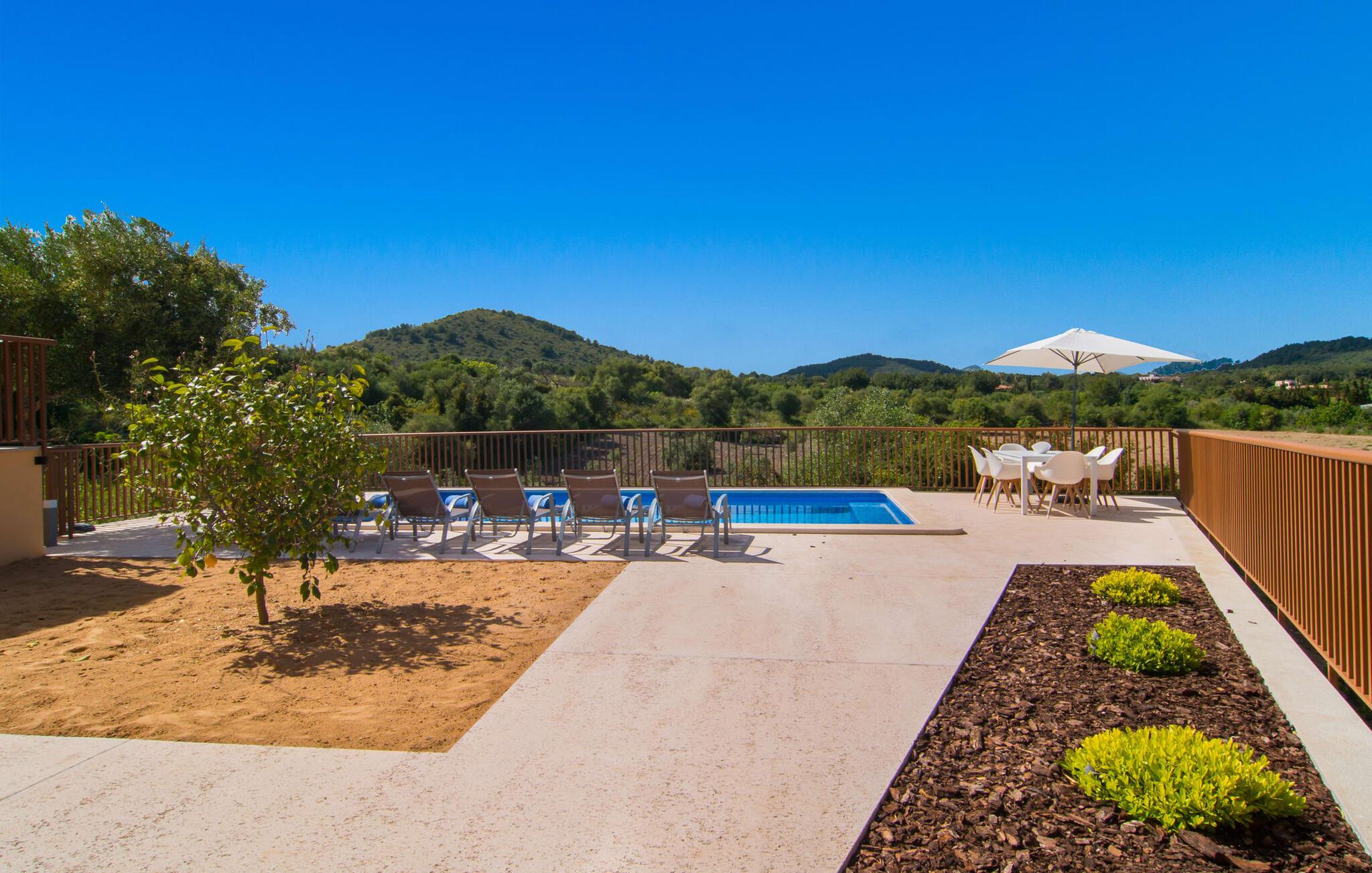 Villaen "Bon Temps Pula Rustic" ligger på en kæmpe 15.000 m² stor grund. I kan parkere jeres bil lige ved siden af huset; En lille trappe fører op til hoveddøren. Lad os først tage et kig på det udendørs område: Fra den store solterrasse har I en fantastisk udsigt over ejendommen og det maleriske landskab. En 8 x 4 m pool med trappetrin byder på velkommen afkøling og vandsjov for hele familien, især på varme sommerdage. Lige ved siden af poolen finder I komfortable liggestole, hvor I kan solbade af hjertens lyst. Det store spisebord, i skyggen af en parasol, er et hyggeligt sted til morgenmad. Det er særligt smukt om aftenen, når I kan se solnedgangen over Serres de Llevant-bjergkæden med en kølig drink. Til huset hører også en kulgrill, ideel til at grille frisk fisk og andre lækre delikatesser. En trappe fører fra terrassen ned til en indre gårdhave, som er velegnet til eksempelvis fodbold. Ejendommen har adgang til smukke vandrestier, der fører gennem uberørt natur. Alle værelser i denne 150 m² store ejendom ligger i stueetagen. Opholdsstuen med lyst, moderne design, komfortabel sofagruppe og stort spisebord er direkte forbundet med det åbne køkken. Træbjælkelofter, hvide møbler, beige og grå nuancer og indirekte lyskilder skaber en indbydende atmosfære. Et stort fladskærms-tv er også tilgængeligt. Hvis I foretrækker at surfe på internettet uden datavolumen, kan I nyde WLAN-forbindelsen: Det betyder, at I kan dele jeres feriebilleder med jeres kære derhjemme. Køkkenet med barområde har køleskab i fuld størrelse, ovn og mikroovn. Villaens tre soveværelser er indrettet i lyse farver. To soveværelser har dobbeltsenge, private badeværelser og små terrasser. Det andet soveværelse har to enkeltsenge og et badeværelse med bruseniche. Takket være klimaanlægget kan I regulere temperaturen i alle soveværelser, så I ikke sveder, selv når det er varmt. jeres feriehus ligger i landlige omgivelser, indlejret i smuk natur: Duften af vild fennikel, rosmarinplanter, fyrretræer og oleandere kombineres med den salte middelhavsluft for at skabe den umiskendelige duft af Serres de Llevant, som løber parallelt med den østlige del af kysten. Nærheden til havet og en række smukke små byer og landsbyer, der har bevaret essensen af Mallorca, gør denne ejendom særligt attraktiv for aktive feriegæster, der gerne vil pakke meget ind. Takket være gode transportforbindelser kan I være på den smukke Costa dels Pins på mindre end 10 minutter. Der kan I slentre gennem en drømmende kystby forbi imponerende villaer eller nyde det turkise vand og den utrolige sandstrand. Den populære Canyamel Bay med liggestole og brusere er heller ikke langt væk. I det nærliggende feriested San Lorenzo er der et helt særligt ugentligt marked hver torsdag: Økologiske produkter er i fokus på dette økologiske marked, men også kunsthåndværk og lokalt dyrket vin. Der er også flere golfbaner med varierede fairways i regionen. Villaen "Bon Temps Pula Rustic", bygget i 2017, er omgivet af smukke naturomgivelser i en afsondret landlig beliggenhed nær feriebyen Son Servera på Mallorcas østkyst. På mindre end 10 minutter i bil kan I nå Coasta dels Pins med dets turkise vand, fine sand og den legendariske Bar Playa. Den populære Pula Golf er endda i nærheden, en af de mest udfordrende golfbaner på øen. Der er talrige butikker og vidunderlige ugentlige markeder i de omkringliggende byer.