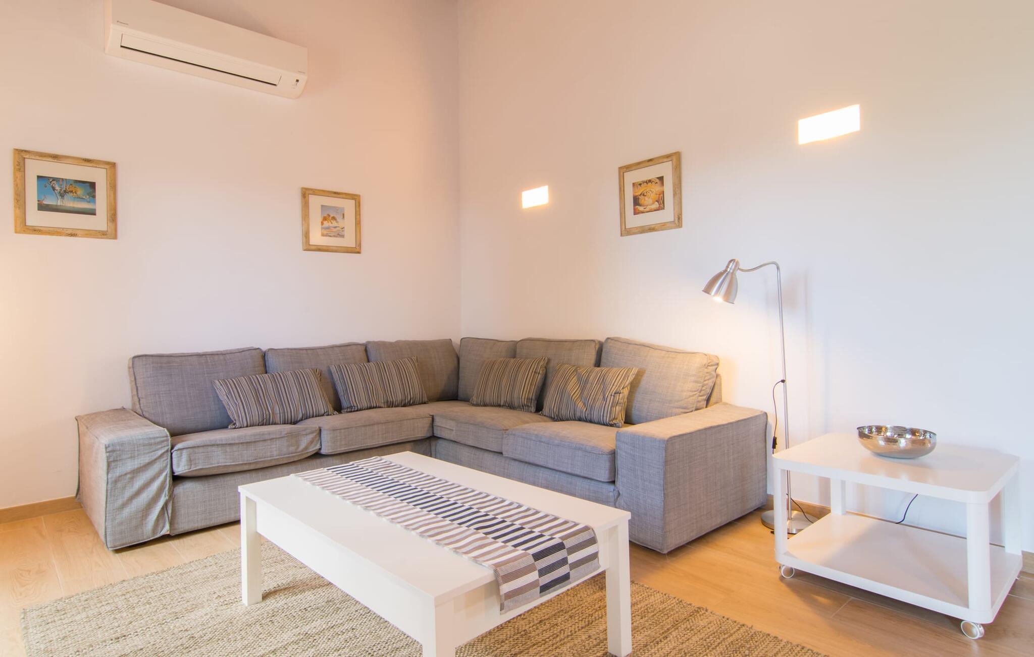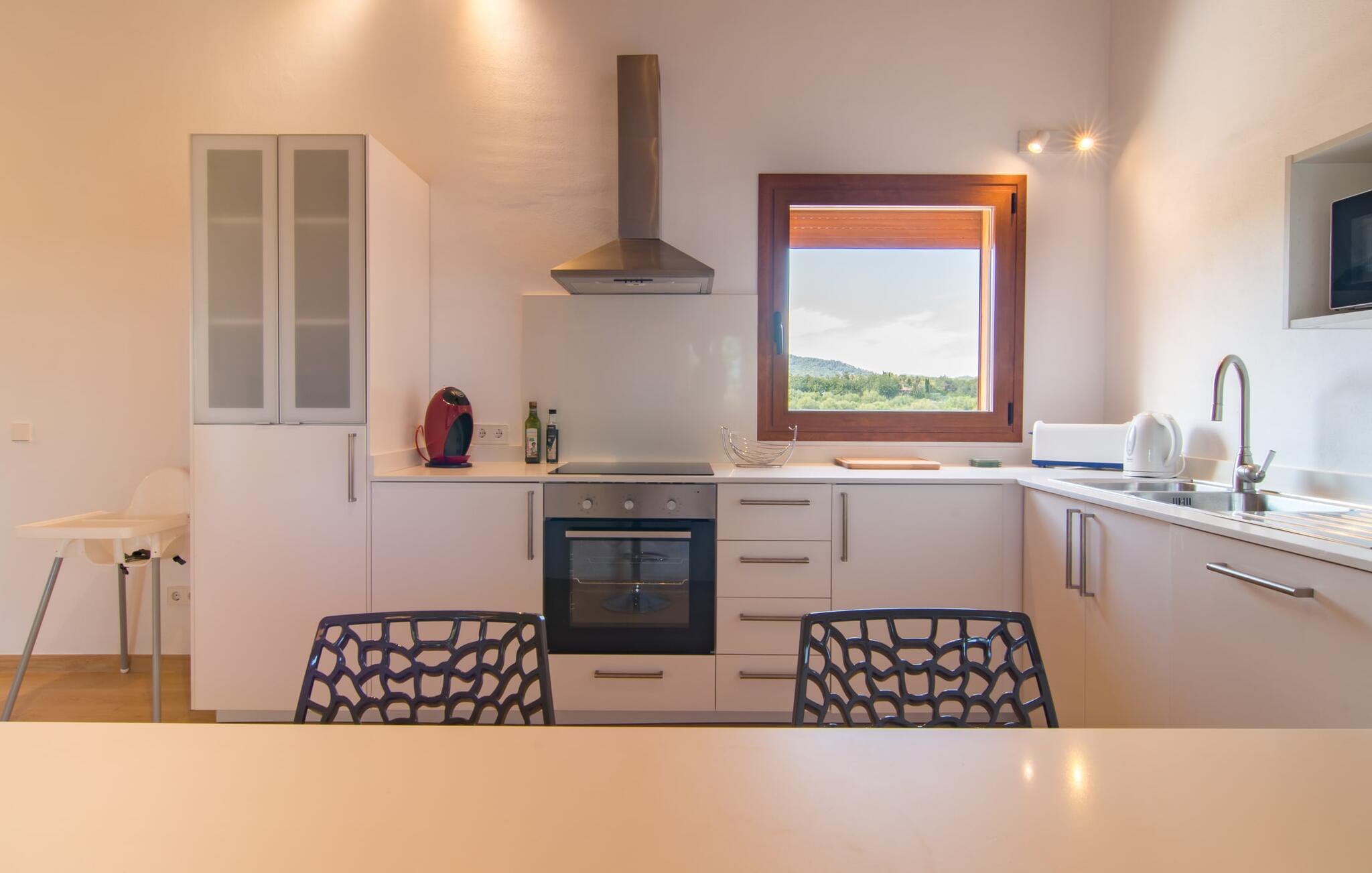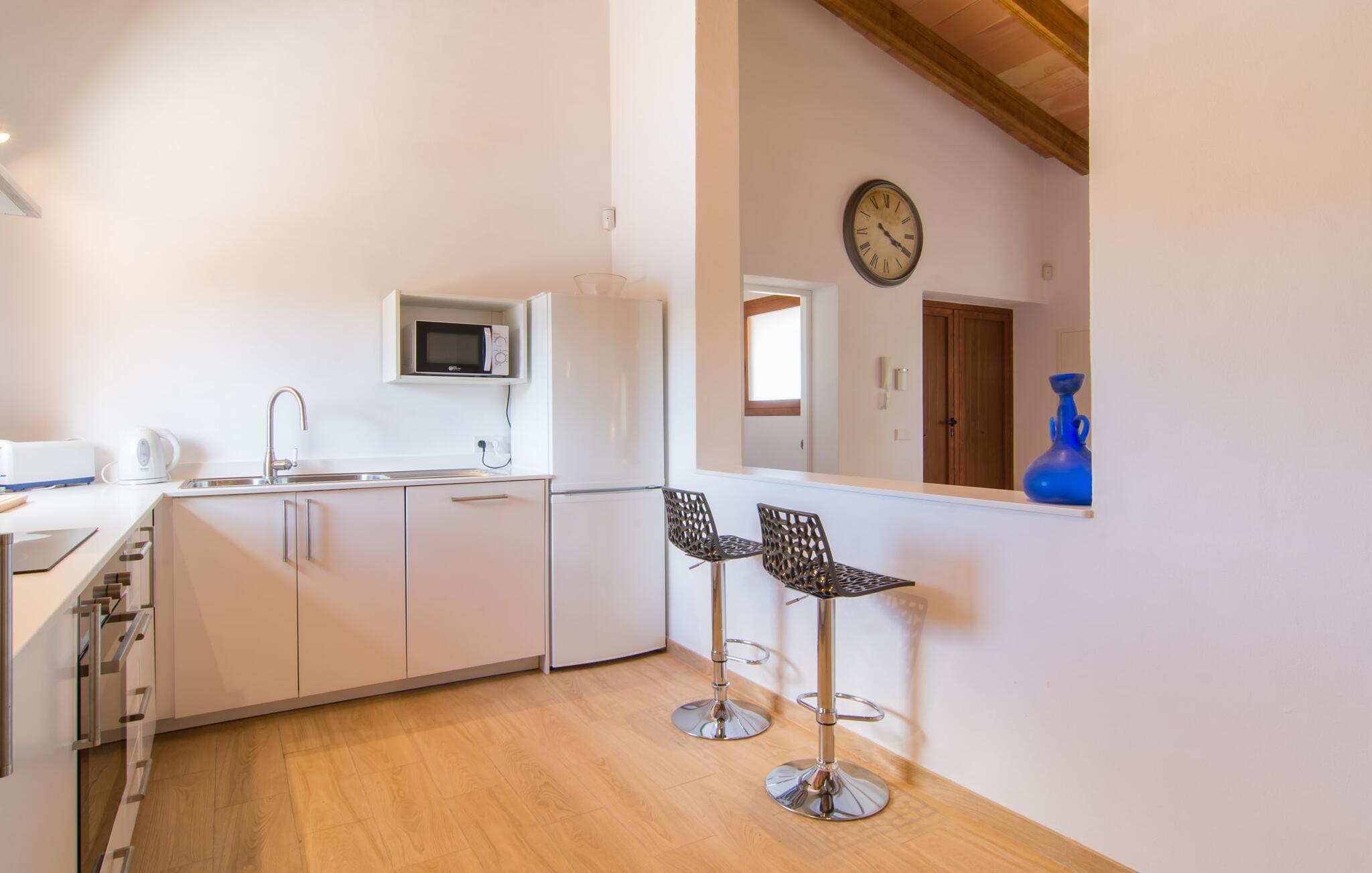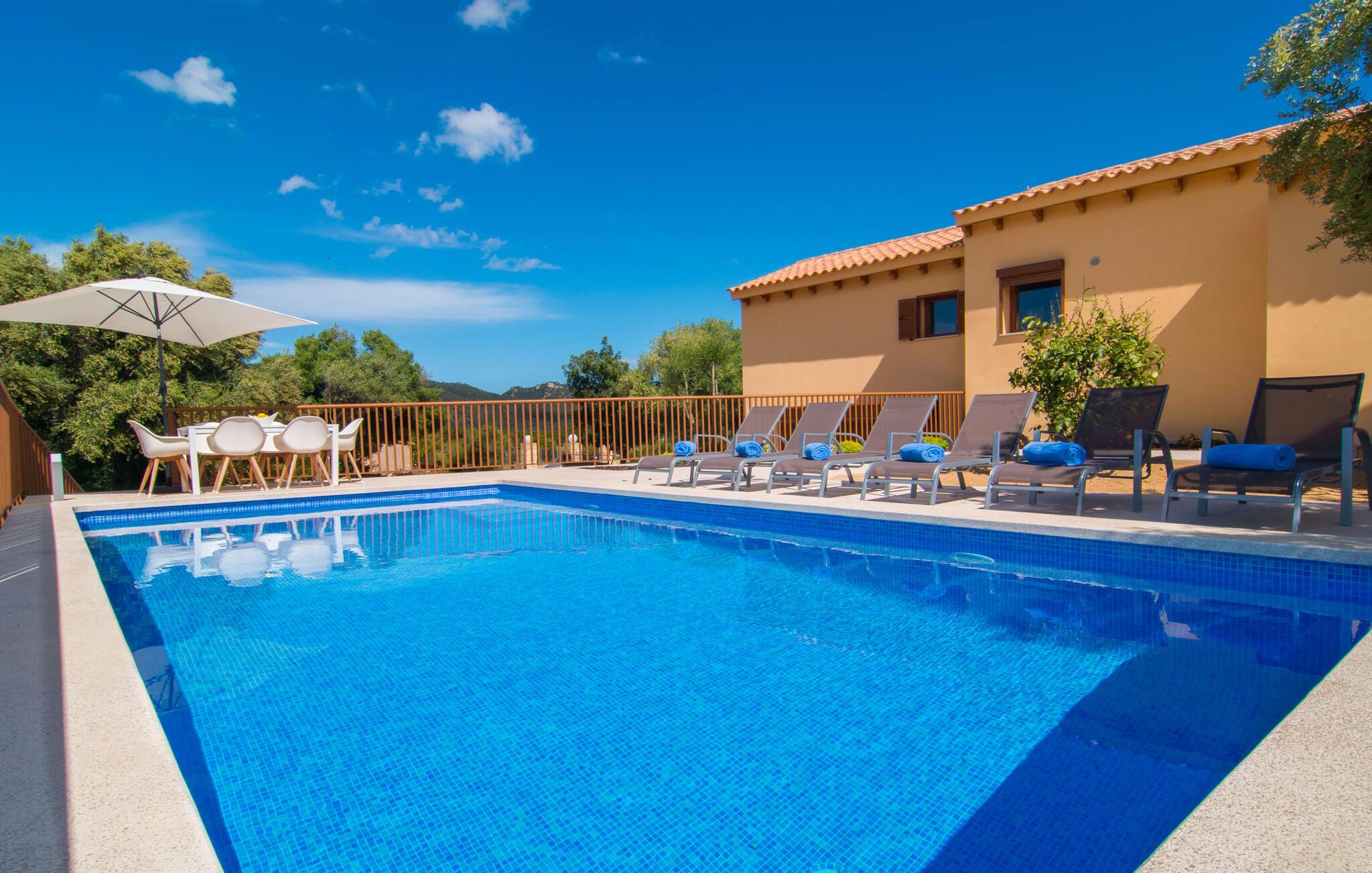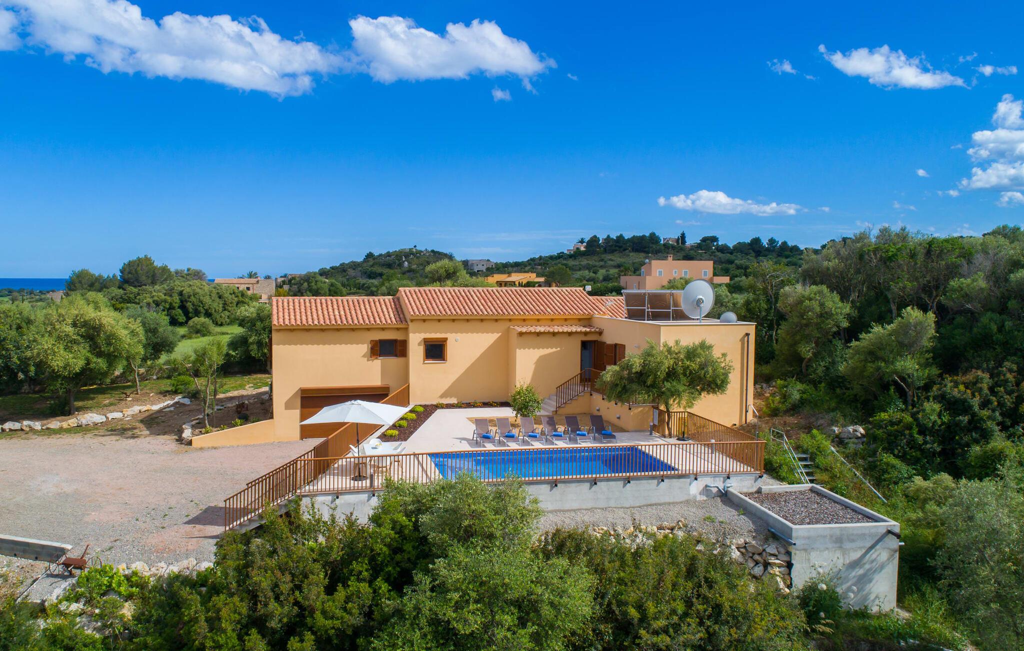 Villaen "Bon Temps Pula Rustic" ligger på en kæmpe 15.000 m² stor grund. I kan parkere jeres bil lige ved siden af huset; En lille trappe fører op til hoveddøren. Lad os først tage et kig på det udendørs område: Fra den store solterrasse har I en fantastisk udsigt over ejendommen og det maleriske landskab. En 8 x 4 m pool med trappetrin byder på velkommen afkøling og vandsjov for hele familien, især på varme sommerdage. Lige ved siden af poolen finder I komfortable liggestole, hvor I kan solbade af hjertens lyst. Det store spisebord, i skyggen af en parasol, er et hyggeligt sted til morgenmad. Det er særligt smukt om aftenen, når I kan se solnedgangen over Serres de Llevant-bjergkæden med en kølig drink. Til huset hører også en kulgrill, ideel til at grille frisk fisk og andre lækre delikatesser. En trappe fører fra terrassen ned til en indre gårdhave, som er velegnet til eksempelvis fodbold. Ejendommen har adgang til smukke vandrestier, der fører gennem uberørt natur. Alle værelser i denne 150 m² store ejendom ligger i stueetagen. Opholdsstuen med lyst, moderne design, komfortabel sofagruppe og stort spisebord er direkte forbundet med det åbne køkken. Træbjælkelofter, hvide møbler, beige og grå nuancer og indirekte lyskilder skaber en indbydende atmosfære. Et stort fladskærms-tv er også tilgængeligt. Hvis I foretrækker at surfe på internettet uden datavolumen, kan I nyde WLAN-forbindelsen: Det betyder, at I kan dele jeres feriebilleder med jeres kære derhjemme. Køkkenet med barområde har køleskab i fuld størrelse, ovn og mikroovn. Villaens tre soveværelser er indrettet i lyse farver. To soveværelser har dobbeltsenge, private badeværelser og små terrasser. Det andet soveværelse har to enkeltsenge og et badeværelse med bruseniche. Takket være klimaanlægget kan I regulere temperaturen i alle soveværelser, så I ikke sveder, selv når det er varmt. jeres feriehus ligger i landlige omgivelser, indlejret i smuk natur: Duften af vild fennikel, rosmarinplanter, fyrretræer og oleandere kombineres med den salte middelhavsluft for at skabe den umiskendelige duft af Serres de Llevant, som løber parallelt med den østlige del af kysten. Nærheden til havet og en række smukke små byer og landsbyer, der har bevaret essensen af Mallorca, gør denne ejendom særligt attraktiv for aktive feriegæster, der gerne vil pakke meget ind. Takket være gode transportforbindelser kan I være på den smukke Costa dels Pins på mindre end 10 minutter. Der kan I slentre gennem en drømmende kystby forbi imponerende villaer eller nyde det turkise vand og den utrolige sandstrand. Den populære Canyamel Bay med liggestole og brusere er heller ikke langt væk. I det nærliggende feriested San Lorenzo er der et helt særligt ugentligt marked hver torsdag: Økologiske produkter er i fokus på dette økologiske marked, men også kunsthåndværk og lokalt dyrket vin. Der er også flere golfbaner med varierede fairways i regionen. Villaen "Bon Temps Pula Rustic", bygget i 2017, er omgivet af smukke naturomgivelser i en afsondret landlig beliggenhed nær feriebyen Son Servera på Mallorcas østkyst. På mindre end 10 minutter i bil kan I nå Coasta dels Pins med dets turkise vand, fine sand og den legendariske Bar Playa. Den populære Pula Golf er endda i nærheden, en af de mest udfordrende golfbaner på øen. Der er talrige butikker og vidunderlige ugentlige markeder i de omkringliggende byer.