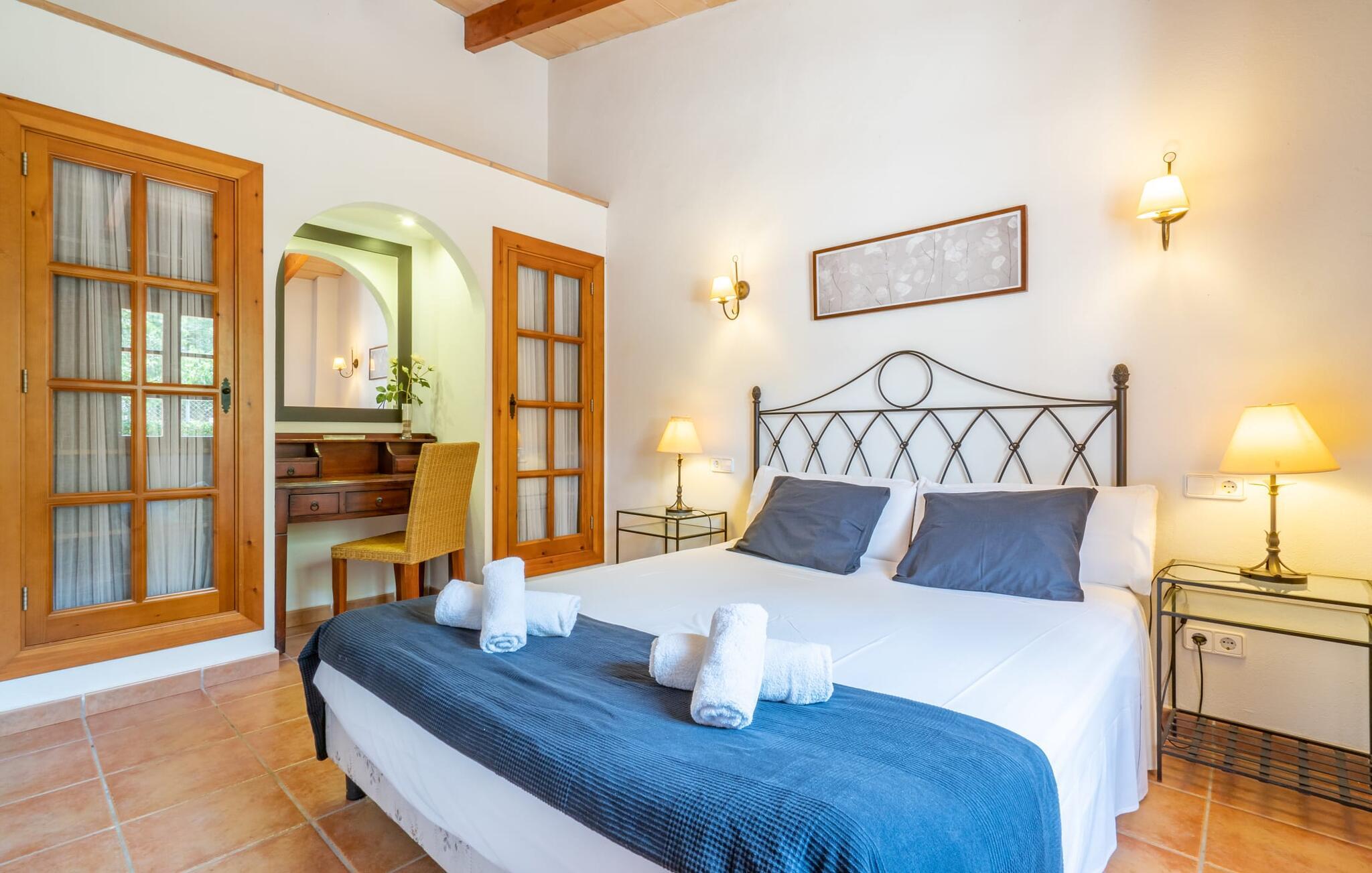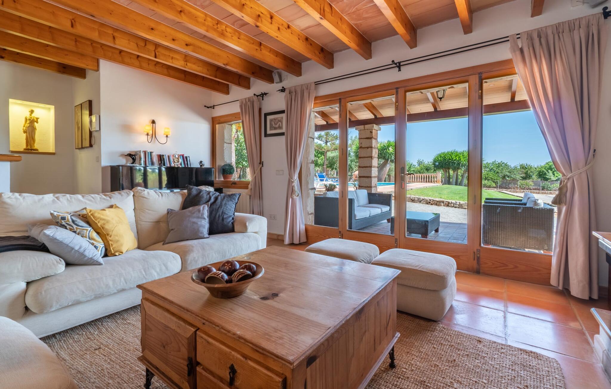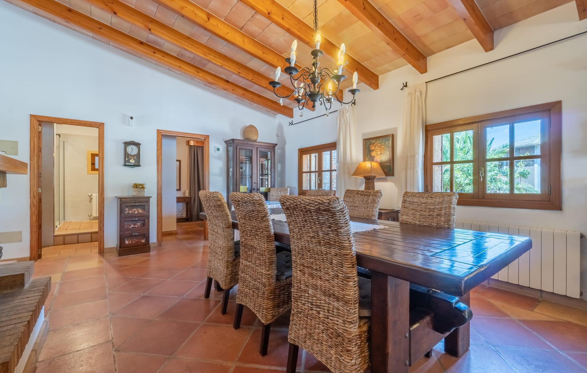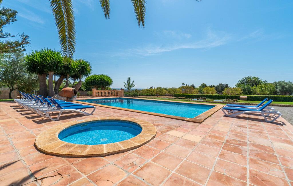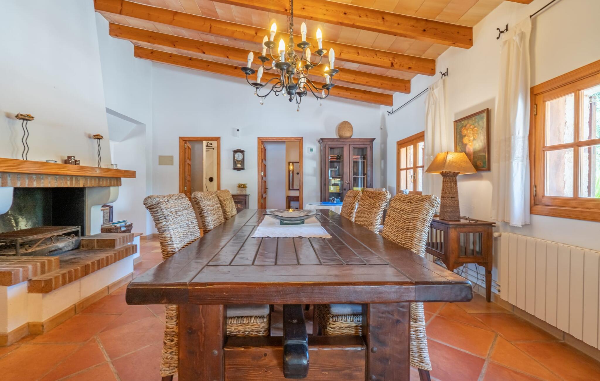 Med villaen "Bosco" har vi fornøjelsen af at kunne tilbyde jer en fantastisk, traditionel villa i typisk mallorcansk stil. Med et samlet boligareal på 450 m², fordelt på forskellige boligenheder, er den smukke villa ideel til en større rejsegruppe. Uanset om I rejser med flere generationer af en familie eller flere vennegrupper med eller uden børn, her finder I plads nok til jeres personlige behov og garanterer samtidig det højeste niveau af privatliv. Samtidig kan I nyde hyggelige gruppeudvekslinger i fællesarealerne ude og inde. Hovedbygningen rummer tre dobbeltværelser og et tredobbeltværelse; Pensionatet har et dobbeltværelse og et værelse med sovesofa. Den traditionelle stenbrudsvilla har forskellige opholdsområder og et ekstra gæstehus. Villaens udseende såvel som den lille mølle er levn fra ejendommens tidligere landbrugsanvendelse og er forvandlet til et vidnesbyrd om det traditionelle Mallorca med et absolut moderne og raffineret udtryk. De hyggelige stuer er kendetegnet ved en moderne indretning med komfortable siddepladser med LCD-tv og pejs. I kan helt sikkert tilbringe et par køligere nætter med stil her. I kan endda spille klaver. To fuldt udstyrede køkkenområder gør daglig madlavning til en fornøjelse. Tilbered måltidet med frisk kød og grøntsager fundet på det ugentlige marked i Son Servera. Hvis nogle medlemmer af jeres rejsegruppe kan lide at bruge lidt tid sammen, kan I nemt lette dette ved at have et separat spisebord i hvert køkken. Mens I laver mad, kan I nyde selskabet af den amerikanske bar i begge køkkener. Soveværelserne understreger husets indbydende karakter. De komplette badeværelser er tidløst moderne. Udearealet er særligt smukt designet og byder på plads nok til to til utallige personer. De høje og statelige træer på ejendommen vidner om denne velholdte ejendoms ærværdige historie. Tag plads på en af terrasserne eller altanerne, den overdækkede terrasse eller terrassen omgivet af blomster. Mange muligheder for at nyde det varme, behagelige middelhavsklima. Terrassen omkring den statelige pool på 50 m² med en dybde på 2,5 m er udstyret med 12 liggestole til omfattende solbadning. De små kan plaske rundt i den lille, separate børnepool. På den overdækkede terrasse ved siden af huset kan I solbade sammen, tilbringe en hyggelig aften ved grillen eller bare slappe af. De utallige udendørs siddepladser tilbyder faktisk udsigt over havet og frodige grønne områder. Stemningen i den klassisk elegante villa "Bosco" er overbevisende over hele linjen, suppleret med moderne elementer, der ikke lader noget tilbage at ønske. Den overdådige villa "Bosco" imponerer med sit rummelige opholdsrum og velholdte grundplan, ideel til en stor rejsegruppe eller to familier. Villaen er beliggende nær Son Carrio, en smuk landsby i den østlige del af øen. I den bedste naturlige beliggenhed kan I også nyde den bekvemme nærhed til landsbyer som Artà og Manacor. De populære sandstrande på østkysten som Sa Coma, Cala Millor eller S'Illot kan nemt nås med lejebil. Bemærk venligst, at denne ejendom ikke accepterer ungdomsgrupper eller polterabender. En ungdomsgruppe på denne ejendom består af personer på 25 år eller derunder. Book ikke denne ejendom, hvis I er en ungdomsgruppe eller polterabend, da jeres reservation vil blive afvist, når den er booket, hvilket også kan være tilfældet ved ankomst til ejendommen eller under jeres ophold, og I vil ikke modtage en refusion