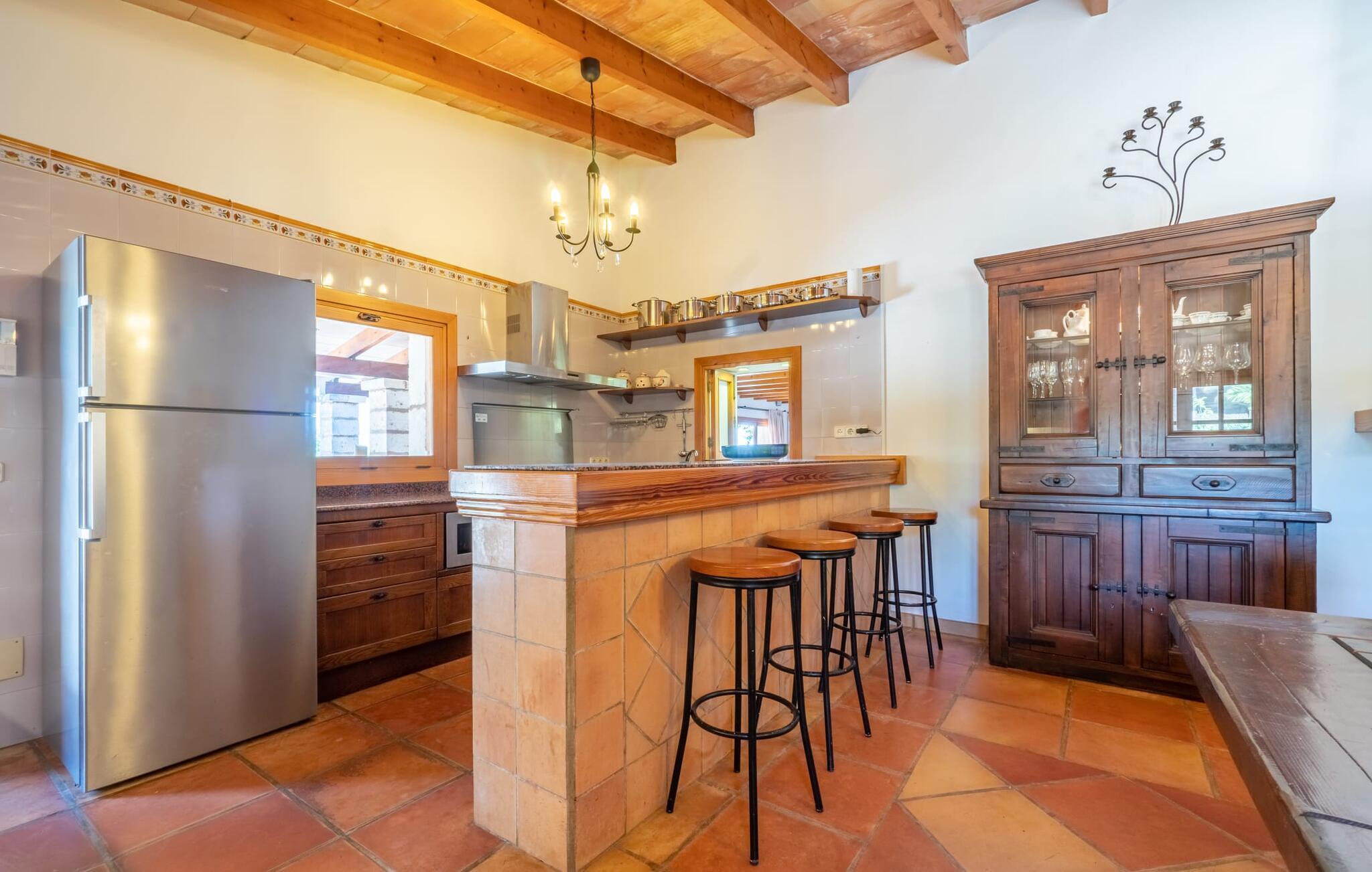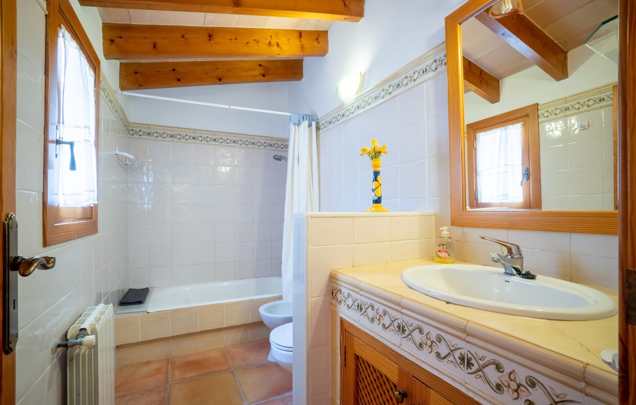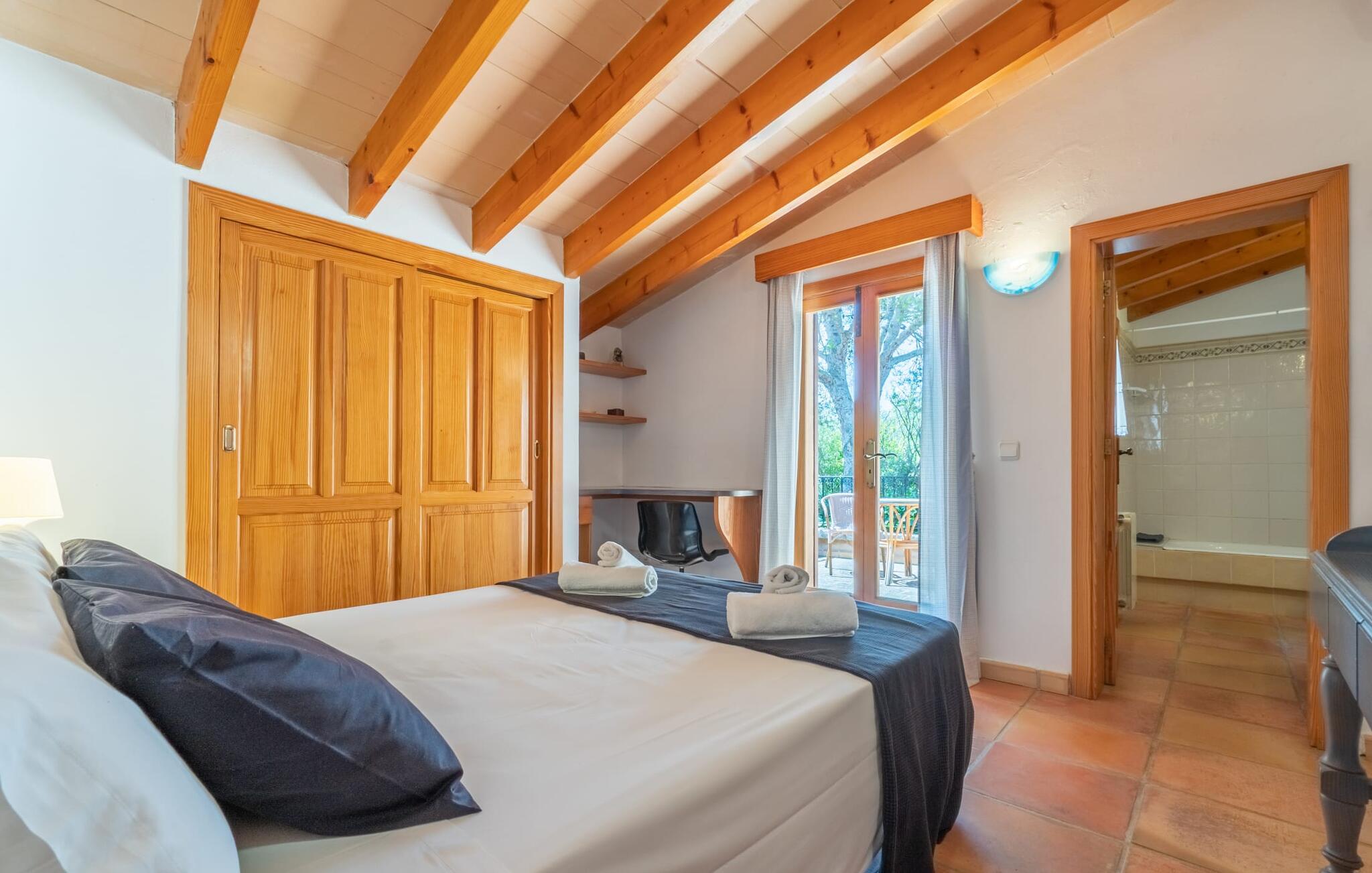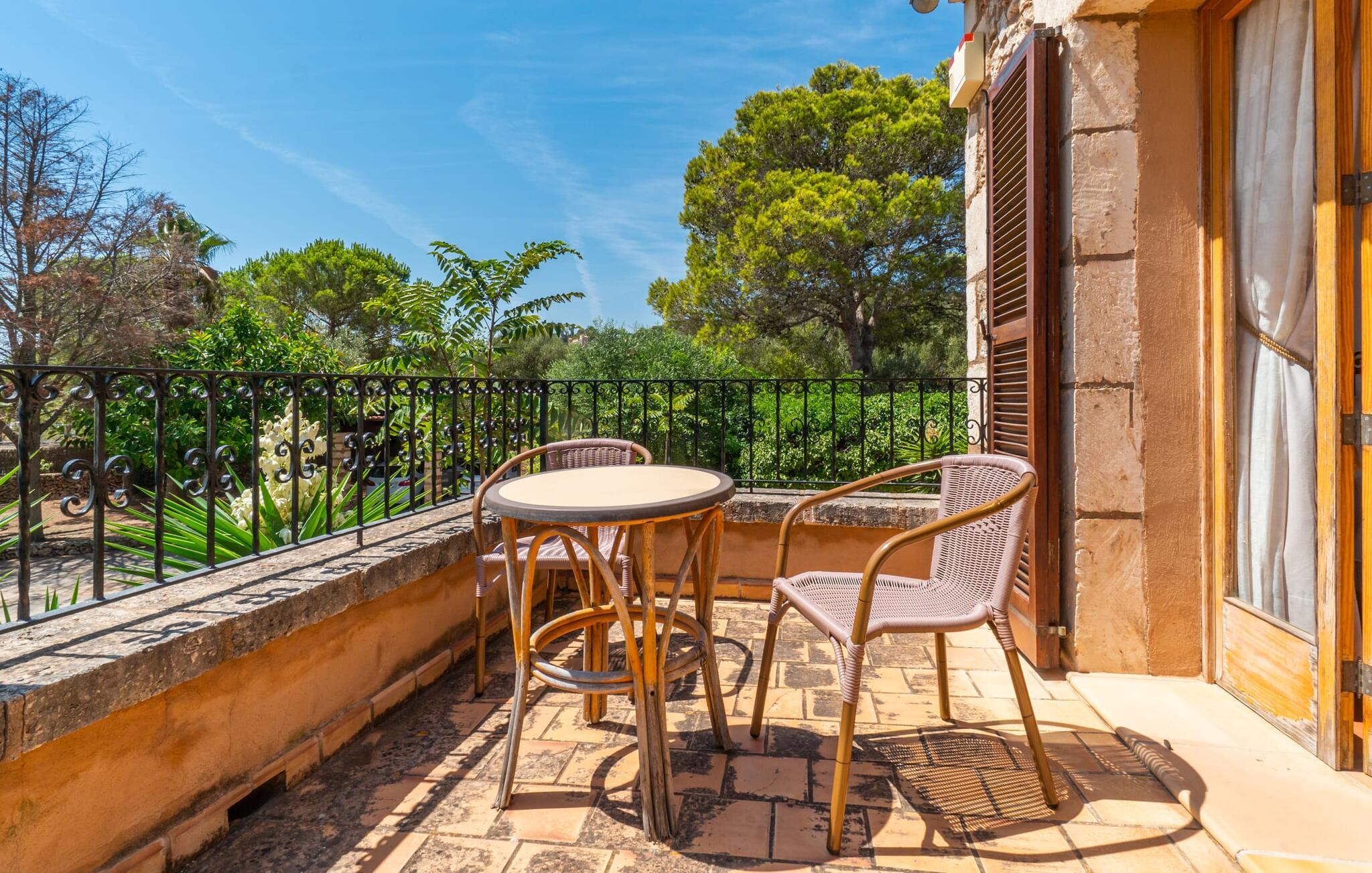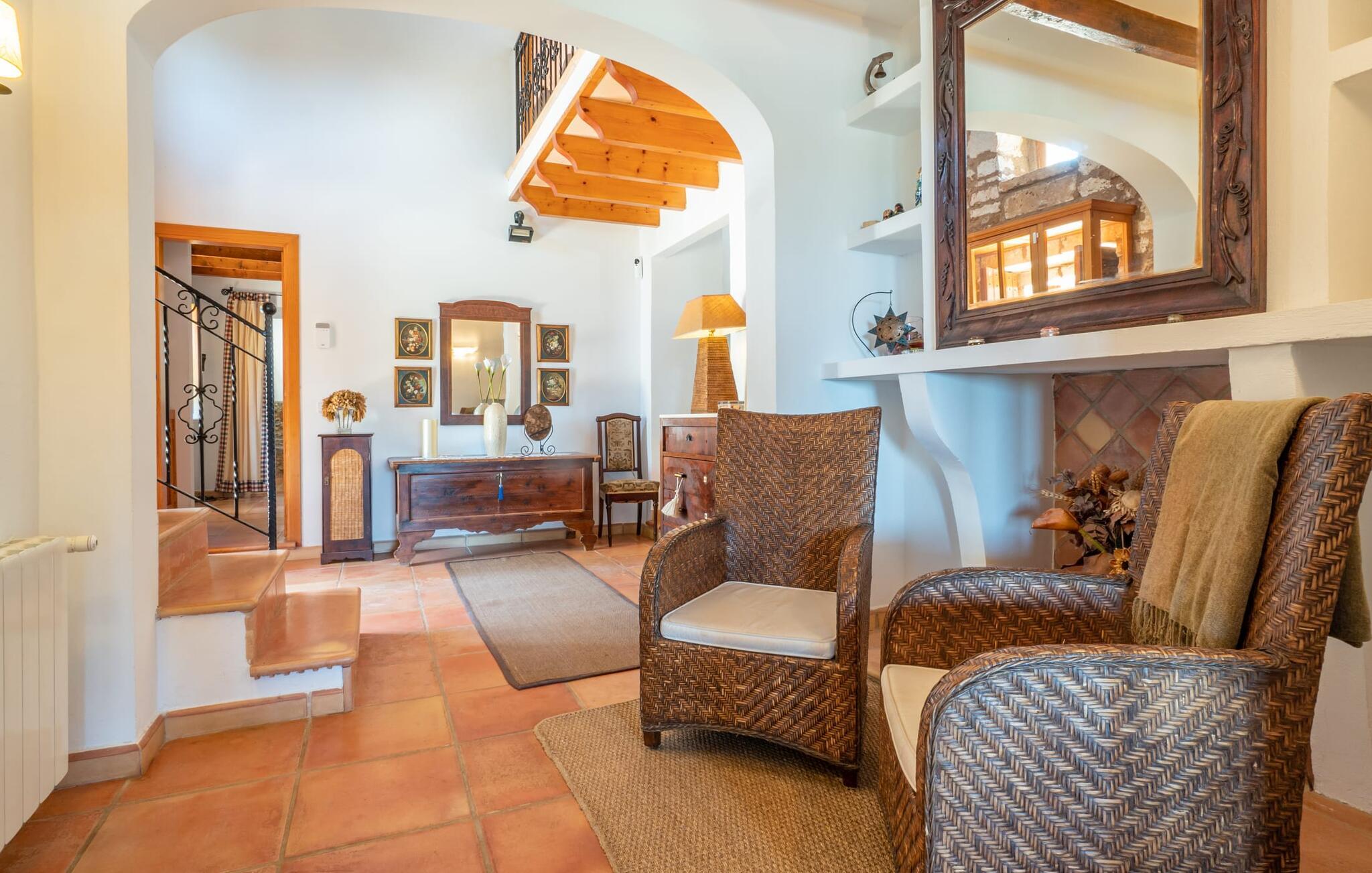 Med villaen "Bosco" har vi fornøjelsen af at kunne tilbyde jer en fantastisk, traditionel villa i typisk mallorcansk stil. Med et samlet boligareal på 450 m², fordelt på forskellige boligenheder, er den smukke villa ideel til en større rejsegruppe. Uanset om I rejser med flere generationer af en familie eller flere vennegrupper med eller uden børn, her finder I plads nok til jeres personlige behov og garanterer samtidig det højeste niveau af privatliv. Samtidig kan I nyde hyggelige gruppeudvekslinger i fællesarealerne ude og inde. Hovedbygningen rummer tre dobbeltværelser og et tredobbeltværelse; Pensionatet har et dobbeltværelse og et værelse med sovesofa. Den traditionelle stenbrudsvilla har forskellige opholdsområder og et ekstra gæstehus. Villaens udseende såvel som den lille mølle er levn fra ejendommens tidligere landbrugsanvendelse og er forvandlet til et vidnesbyrd om det traditionelle Mallorca med et absolut moderne og raffineret udtryk. De hyggelige stuer er kendetegnet ved en moderne indretning med komfortable siddepladser med LCD-tv og pejs. I kan helt sikkert tilbringe et par køligere nætter med stil her. I kan endda spille klaver. To fuldt udstyrede køkkenområder gør daglig madlavning til en fornøjelse. Tilbered måltidet med frisk kød og grøntsager fundet på det ugentlige marked i Son Servera. Hvis nogle medlemmer af jeres rejsegruppe kan lide at bruge lidt tid sammen, kan I nemt lette dette ved at have et separat spisebord i hvert køkken. Mens I laver mad, kan I nyde selskabet af den amerikanske bar i begge køkkener. Soveværelserne understreger husets indbydende karakter. De komplette badeværelser er tidløst moderne. Udearealet er særligt smukt designet og byder på plads nok til to til utallige personer. De høje og statelige træer på ejendommen vidner om denne velholdte ejendoms ærværdige historie. Tag plads på en af terrasserne eller altanerne, den overdækkede terrasse eller terrassen omgivet af blomster. Mange muligheder for at nyde det varme, behagelige middelhavsklima. Terrassen omkring den statelige pool på 50 m² med en dybde på 2,5 m er udstyret med 12 liggestole til omfattende solbadning. De små kan plaske rundt i den lille, separate børnepool. På den overdækkede terrasse ved siden af huset kan I solbade sammen, tilbringe en hyggelig aften ved grillen eller bare slappe af. De utallige udendørs siddepladser tilbyder faktisk udsigt over havet og frodige grønne områder. Stemningen i den klassisk elegante villa "Bosco" er overbevisende over hele linjen, suppleret med moderne elementer, der ikke lader noget tilbage at ønske. Den overdådige villa "Bosco" imponerer med sit rummelige opholdsrum og velholdte grundplan, ideel til en stor rejsegruppe eller to familier. Villaen er beliggende nær Son Carrio, en smuk landsby i den østlige del af øen. I den bedste naturlige beliggenhed kan I også nyde den bekvemme nærhed til landsbyer som Artà og Manacor. De populære sandstrande på østkysten som Sa Coma, Cala Millor eller S'Illot kan nemt nås med lejebil. Bemærk venligst, at denne ejendom ikke accepterer ungdomsgrupper eller polterabender. En ungdomsgruppe på denne ejendom består af personer på 25 år eller derunder. Book ikke denne ejendom, hvis I er en ungdomsgruppe eller polterabend, da jeres reservation vil blive afvist, når den er booket, hvilket også kan være tilfældet ved ankomst til ejendommen eller under jeres ophold, og I vil ikke modtage en refusion