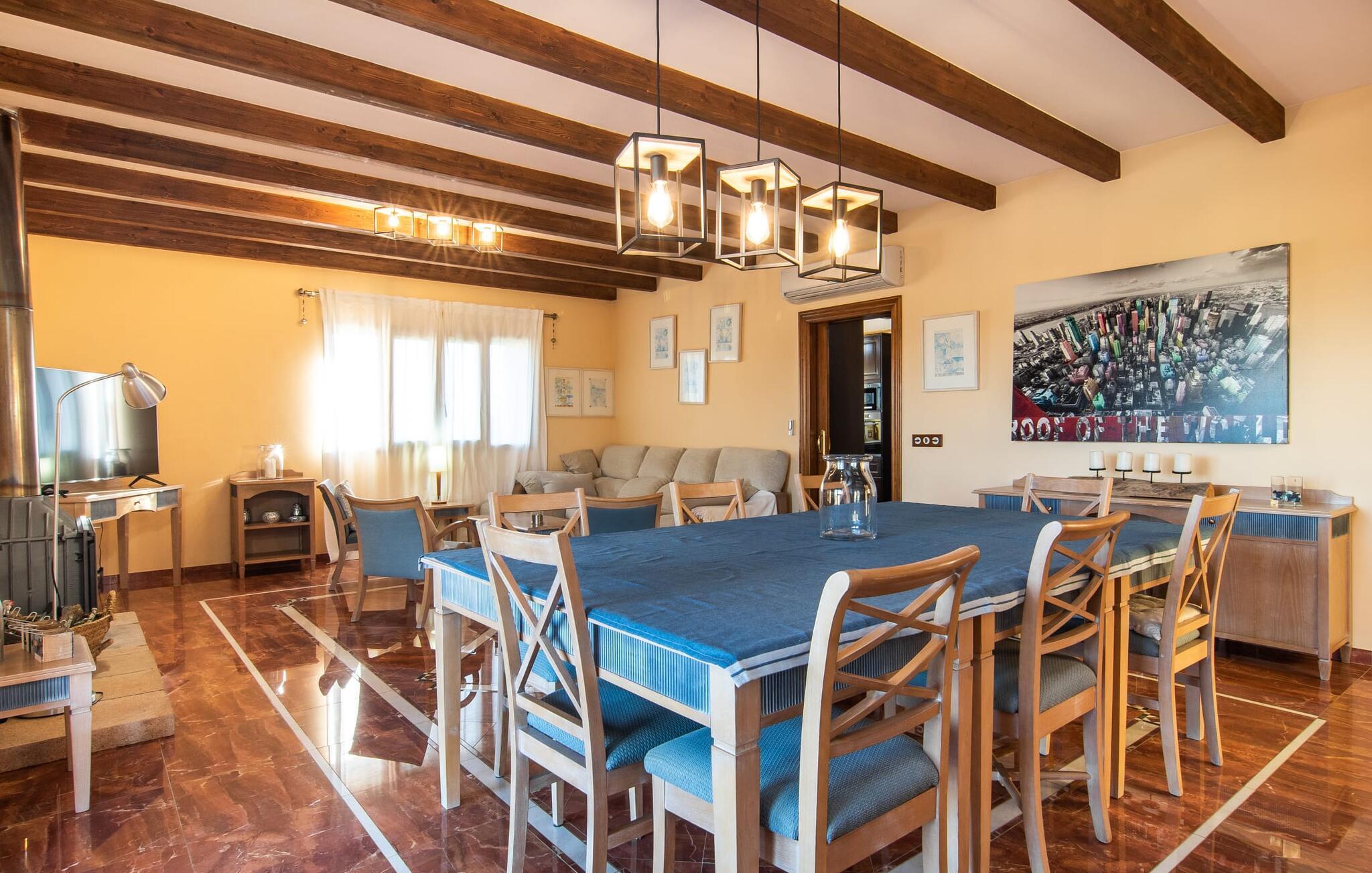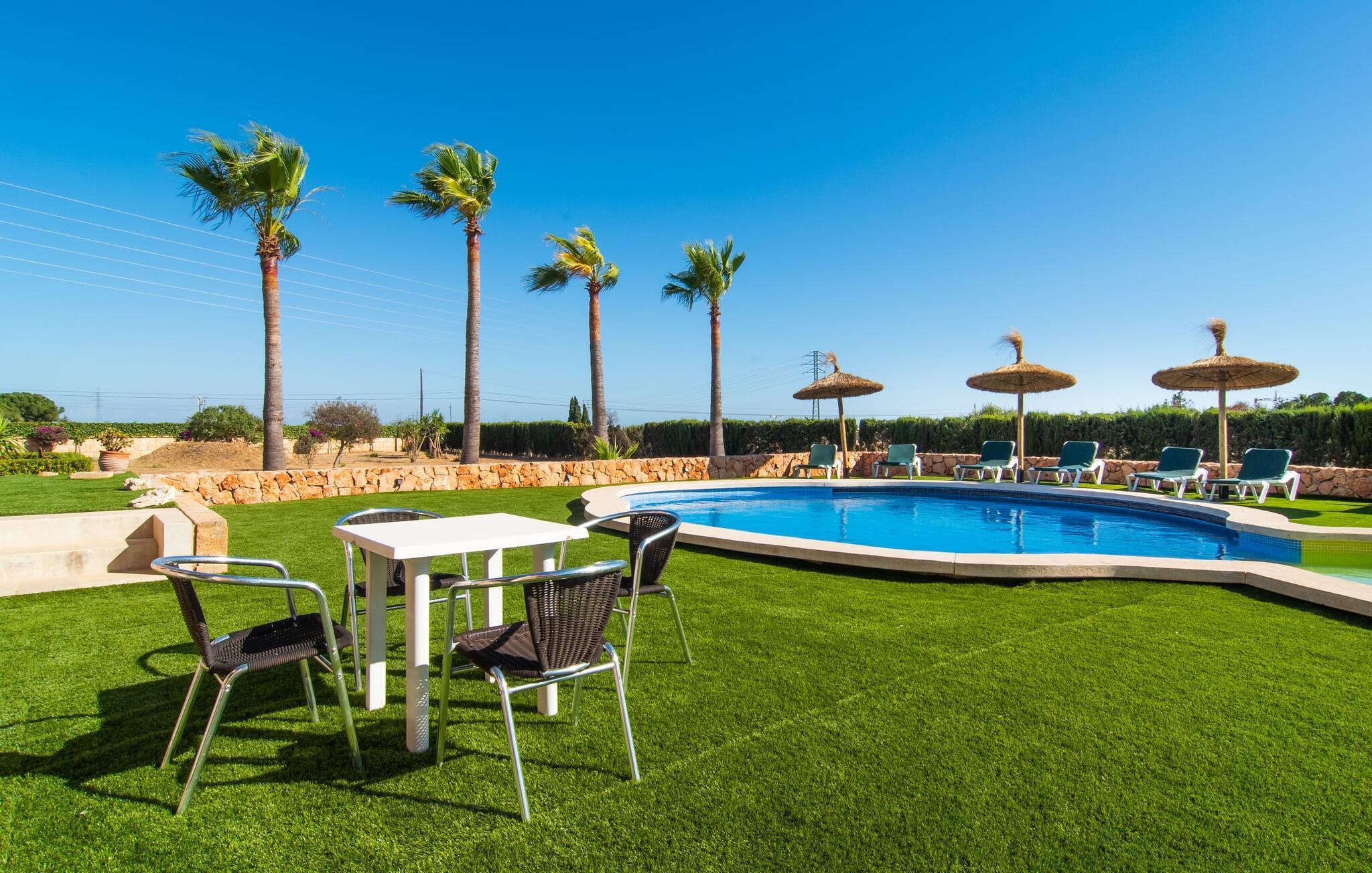 "Bouganville Resort" er en rummelig naturstensfinca nær Llucmajor i det maleriske sydlige Mallorca. Dette feriehus kan rumme op til ti gæster, hvilket gør det ideelt for familier, der rejser sammen. Dette er et Fincallorca feriehus. Den store have har høje palmer og masser af græsplæne, hvor børn kan lege, mens voksne kan slappe af på den overdækkede terrasse. En central attraktion er den runde pool med et lavvandet område, hvor små børn trygt kan more sig. Gæsterne kan slappe af på liggestolene ved poolen eller læse under en parasol. Der er praktisk parkering på en grusplads ved siden af huset. Fincaens indre kombinerer traditionel rustik charme med moderne komfort og er præget af venlige farver, mørke træaccenter og klinkegulve. Alle værelser er på ét plan, hvilket giver nem adgang for familier med små børn. Den indbydende indgang fører til et stort åbent opholds- og spiseområde, møbleret med en behagelig sofa, tv og pejs til køligere dage, samt et langt spisebord til familiemåltider. En skydedør adskiller dette værelse fra et veludstyret køkken. Ejendommen består af fem soveværelser med dobbeltsenge og tre stilfulde badeværelser, hvoraf det ene er en suite. Fincaen "Bouganville Resort" ligger kun få minutters kørsel fra den landlige by Llucmajor på det sydlige Mallorca. Der kan du nemt gøre dine indkøb og slentre gennem det ugentlige marked. Playa S'Arenal er kun omkring 18 km væk med lejebil, andre smukke strande er omkring 20 km væk.