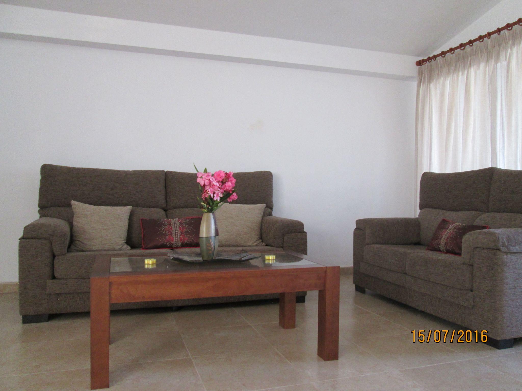 It has two bedrooms, one with a double bed, and the second bedroom with two single beds, with all the necessary linen. The bathroom has a shower with shower screen, toilet, washbasin, hairdryer and towels. The living room has a table and 6 chairs, bookcase, table with flat screen TV, DTT and satellite TV, and two armchairs, one three-seater and one two-seater, and a coffee table.