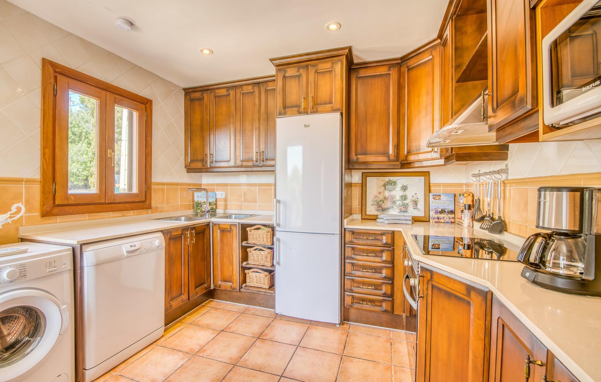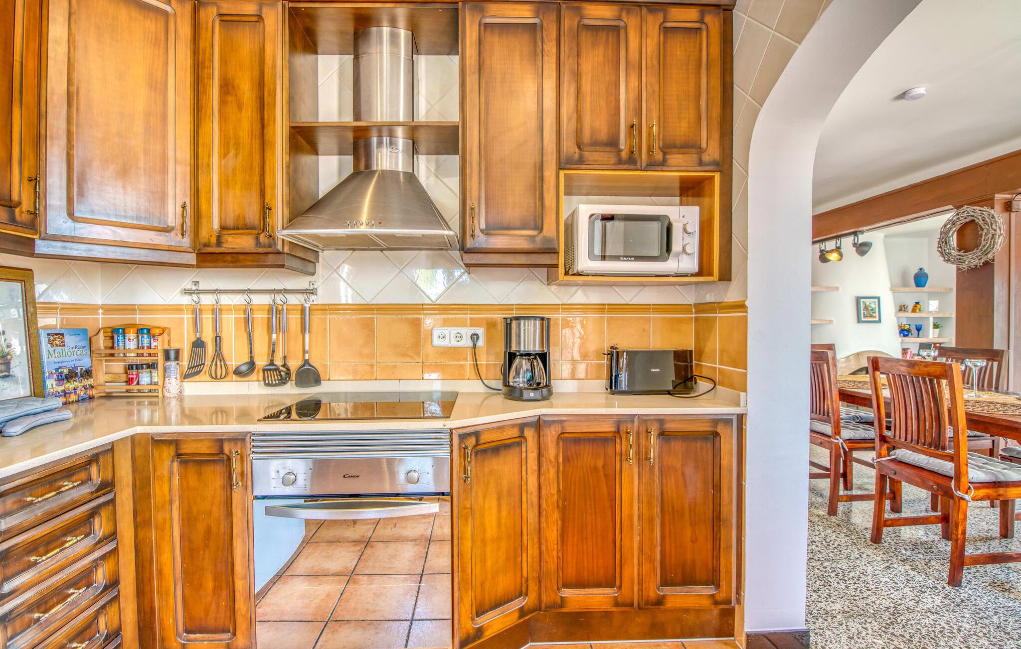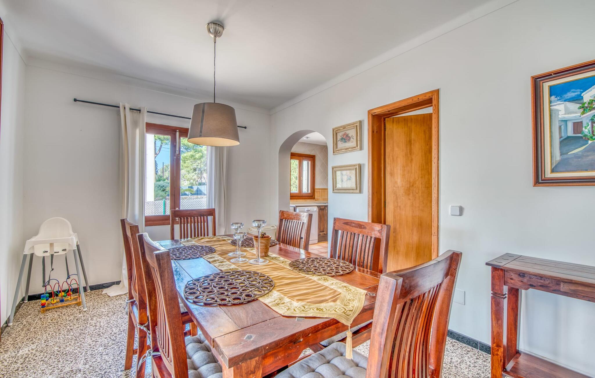 Den hyggelige villa "Buena Vista de Cala Pi" imponerer med sin vidunderlige beliggenhed på den anden kystlinje i den sydlige del af øen. Ligesom byen Cala Pí med sine 650 indbyggere, der ligger langt væk fra masseturismen, men stadig byder på en lang række turistattraktioner, er det familievenlige feriehus behageligt reserveret. Selvom villaen er omgivet af ligesindede boliger, imponerer den stadig med sin uforstyrrede havudsigt, som I kan nyde fra altanen og tagterrassen. Feriehusets pool byder på behagelig afkøling for hele familien. Terrasseområdet byder også på plads nok til omfattende og uforstyrret solbadning. Talrige udendørs siddepladser lokker jer på ethvert tidspunkt af dagen: Det hyggelige hjørne med caféstemning er omgivet af en række middelhavsblomster, og selvfølgelig er den overdækkede terrasse et must. Så I er garanteret at finde jeres personlige yndlingssted ved solopgang, efter grillen eller til en solnedgang. Men atmosfæren i denne kompakte villa er også meget harmonisk. Omdrejningspunktet er den åbne stue og spisestue med absolut komfortable sofasæder i en lys strandstil. Dette er dygtigt suppleret med kombinationen af højkvalitets naturstensgulve, varmt træ og typisk mallorcansk rusticitet. Resultatet er et charmerende traditionelt, men moderne feriehus. Det fuldt udstyrede køkken er forbundet med spisepladsen via en bue. Også her er landstedslooket og hyggen perfekt kombineret. Villaen med havudsigt er ideel for op til seks personer eller to familier. I finder hyggelige soveværelser i to etager, med enten dobbeltseng eller to børnevenlige enkeltsenge. For jeres komfort finder I baldakiner over sengerammen, som også fungerer som myggenet. To individuelt flisebelagte bruserum fuldender ensemblet. Den fabelagtige villa "Buena Vista de Cala Pi" er ikke kun velegnet til en ferie på Mallorca om sommeren, men også i lavsæsonen - og til meget attraktive lejepriser i en smuk beliggenhed. Havudsigtsvillaen “Buena Vista de Cala Pi” med sin spektakulære udsigt ligger på anden række i en velholdt urbanisering i den smukke kystby Cala Pí på Mallorca. Her kan I gøre alt til fods: shoppe, besøge restauranter, gå ture i de smukke omgivelser til fantastiske udsigtspunkter eller slentre til stranden. Den krystalklare, azurblå badebugt er særdeles børnevenlig og lavvandet og kan nås via en gangsti på kun 10 minutter eller i bil på 3 minutter.