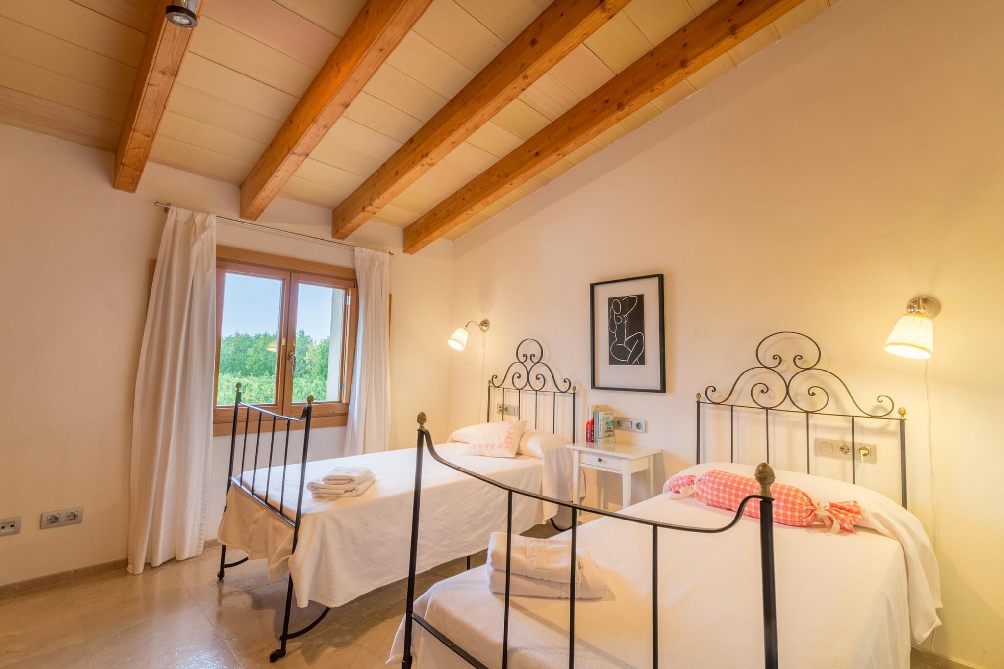 Dette charmerende feriehus, Son Fornes, tilbyder en perfekt blanding af komfort og privatliv, ideel til familier eller små grupper. Med tre hyggelige soveværelser - to med dobbeltsenge og et med to enkeltsenge - kan det komfortabelt rumme op til 6 gæster. Ejendommen har aircondition og tilbyder gratis Wi-Fi overalt, hvilket sikrer både komfort og forbindelse. Det private poolområde inviterer dig til at slappe af og slappe af, omgivet af frodige haver, mens det udendørs grillområde er perfekt til familiemåltider eller aftensammenkomster. Dette hjem er ikke kæledyrsvenligt, hvilket sikrer et fredeligt og roligt miljø for alle gæster. Dette landsted ligger i et roligt landområde og tilbyder nem adgang til lokale attraktioner og tjenester. Blot en kort køretur væk finder du den pulserende by Inca, berømt for sit ugentlige marked, hvor du kan udforske lokale varer, læderprodukter og friske råvarer. I nærheden kan du nyde et udvalg af caféer, barer og restauranter, der serverer traditionelle mallorcanske retter. Den berømte Platja de Muro-strand med sit krystalklare vand ligger kun 15 minutter i bil, hvilket tilbyder en perfekt dag ude til solbadning eller svømning. Naturelskere vil sætte pris på nærheden til Albufera Naturreservat, kun en kort køretur væk. Indvendigt har hjemmet et fuldt udstyret køkken med moderne apparater, herunder køleskab, mikroovn, ovn og opvaskemaskine, perfekt til at tilberede dine måltider. Den rummelige stue, komplet med en hyggelig pejs, tilbyder et afslappende sted at slappe af efter en dag med udforskning. To badeværelser, udstyret med håndklæder og hårtørrer, giver bekvemmelighed for alle gæster. Lejelicensnummeret er ETV/2096
