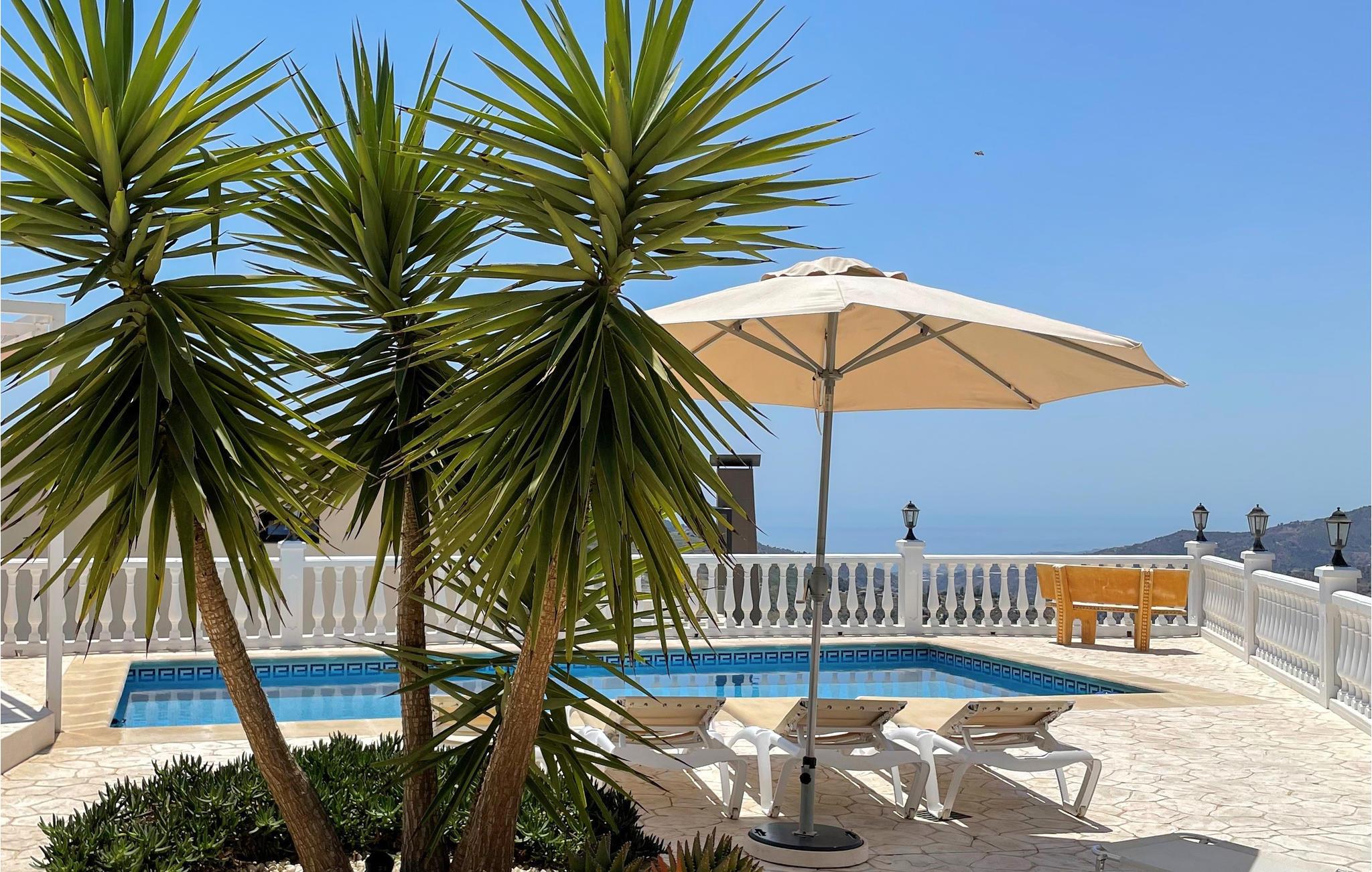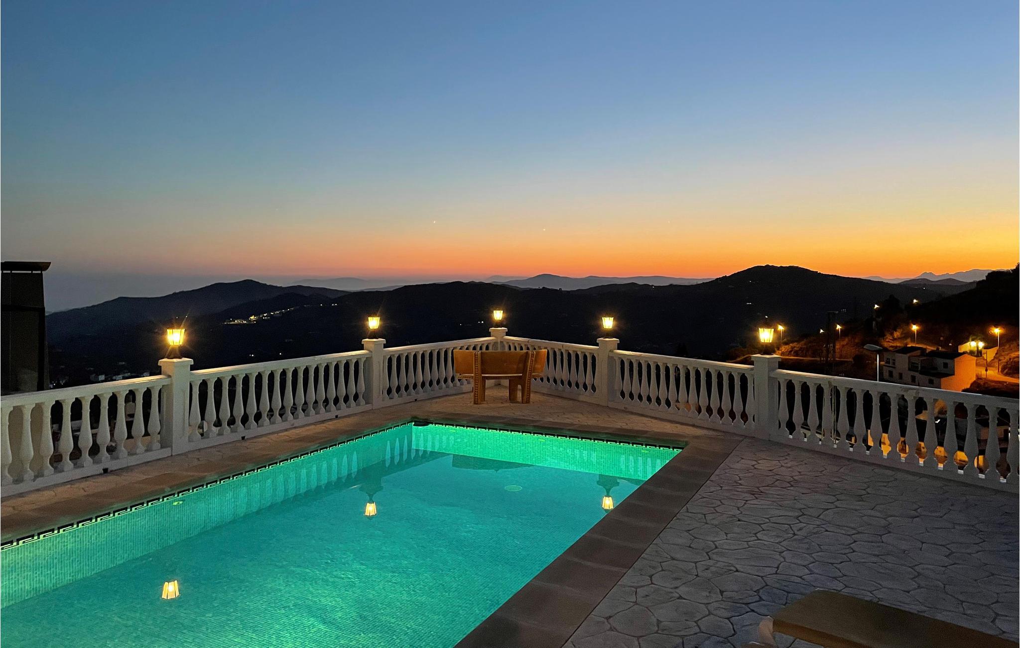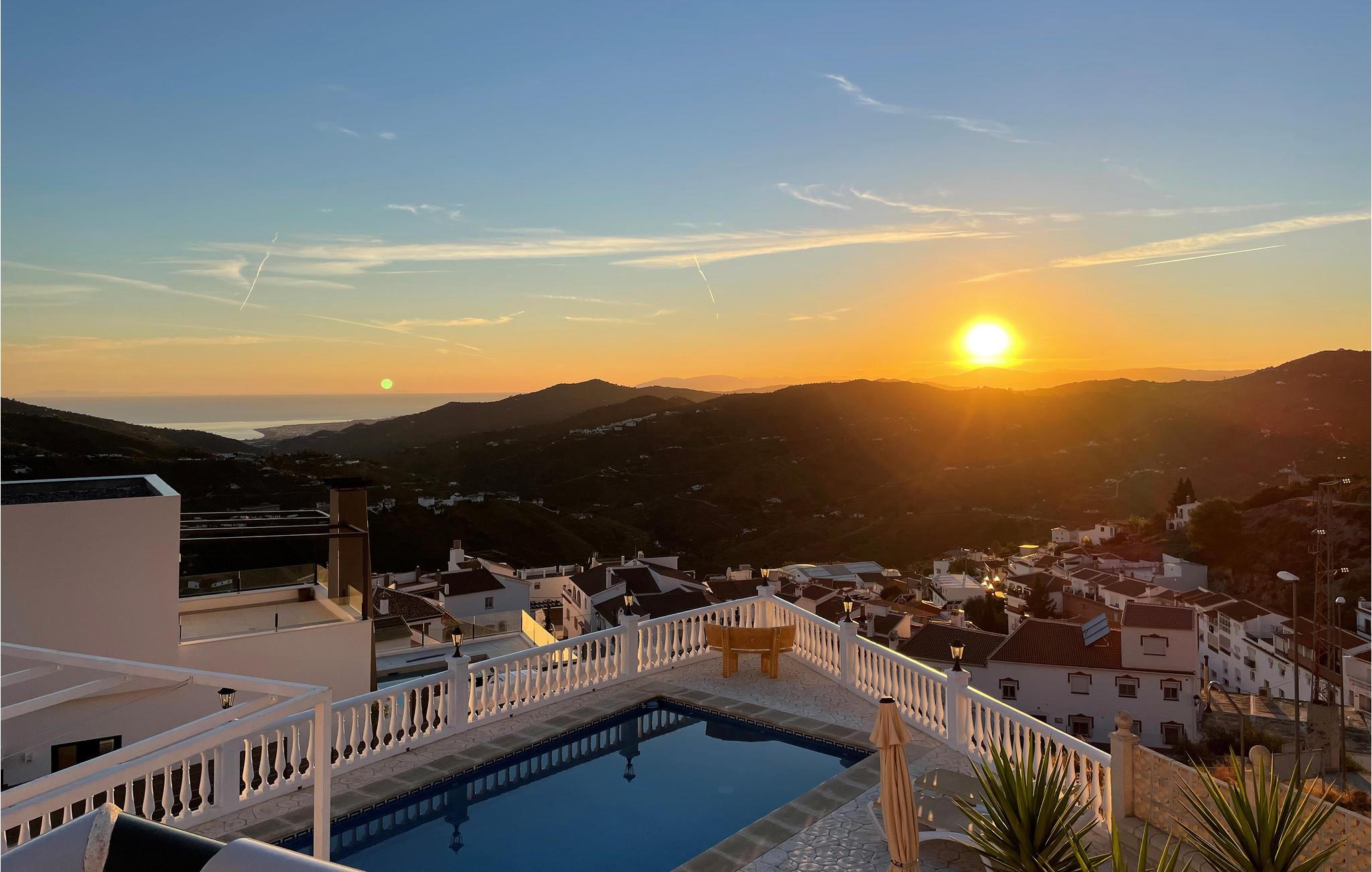 Udsigten fra grunden er fantastisk; I kan se det smukke bjerglandskab, ud over landsbyen, havet og Marokko i klart vejr. Der er terrasser i forskellige niveauer, blandt andet ved poolen, og bag ved huset er der anlagt en terrasse med den smukkeste udsigt.