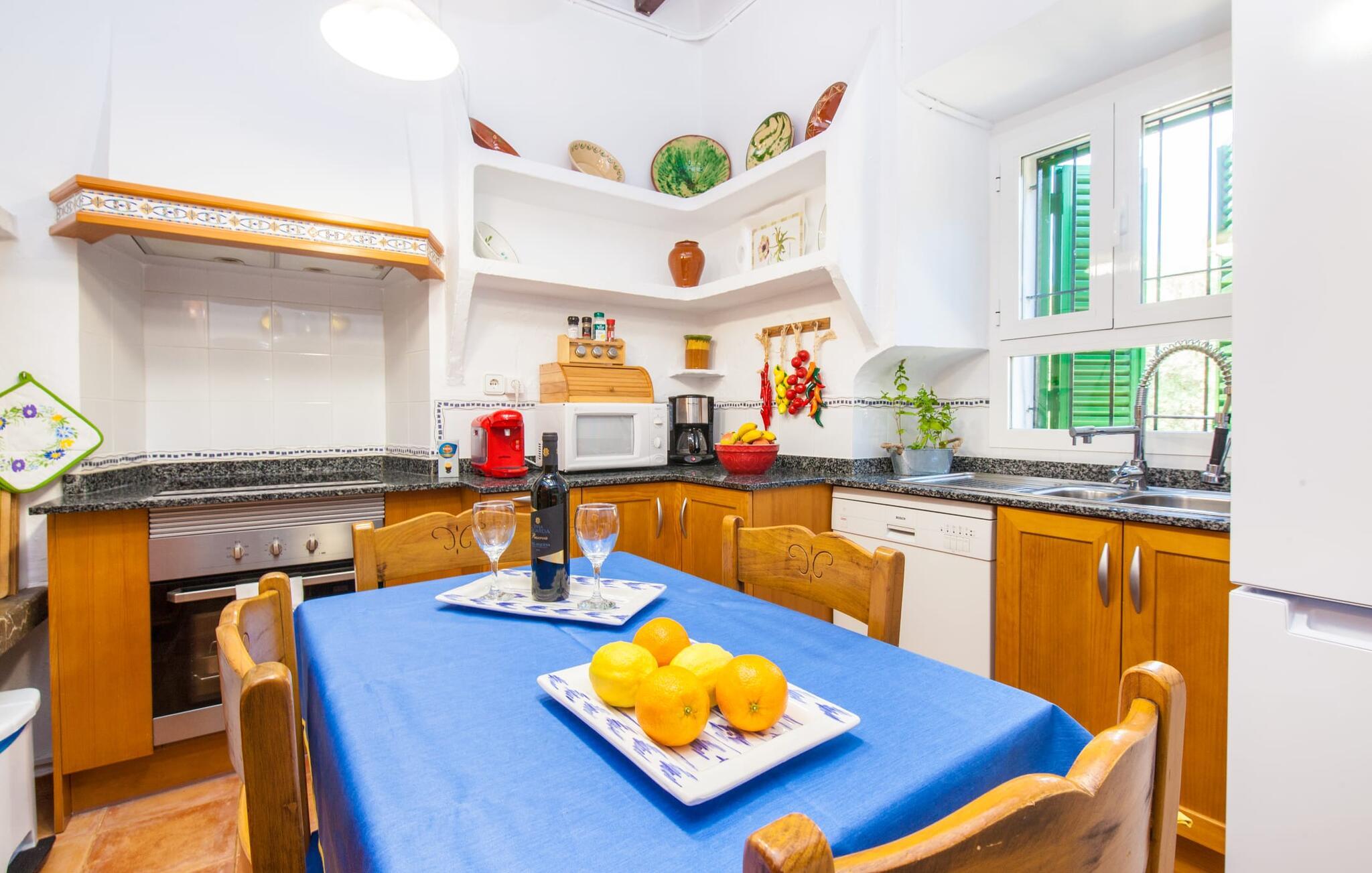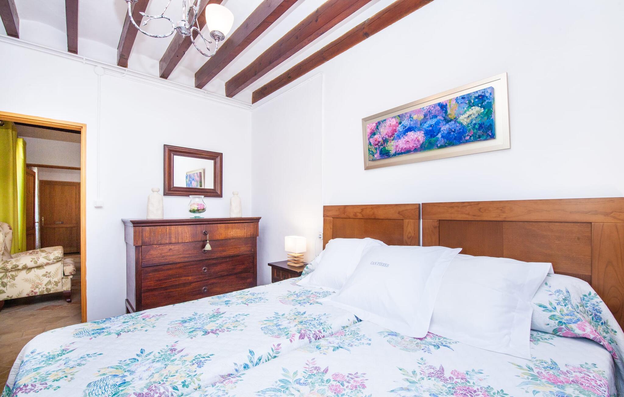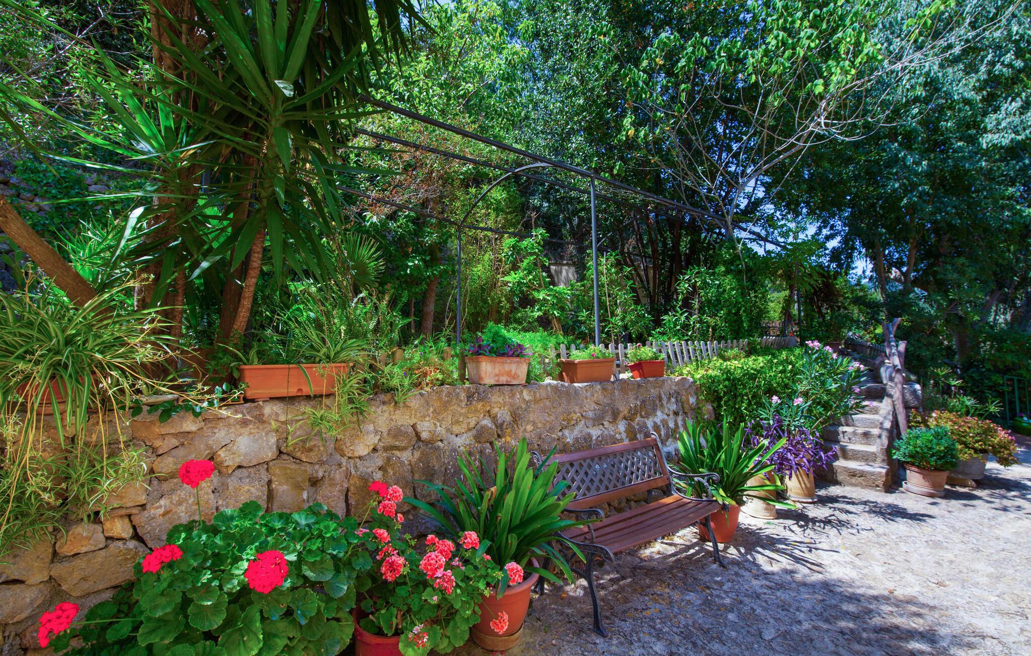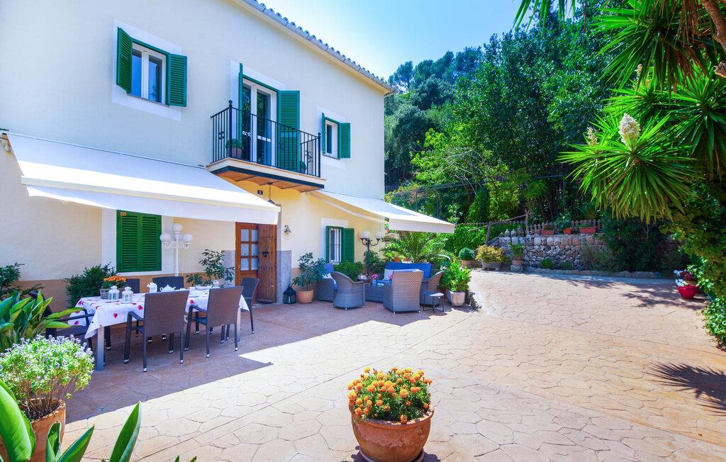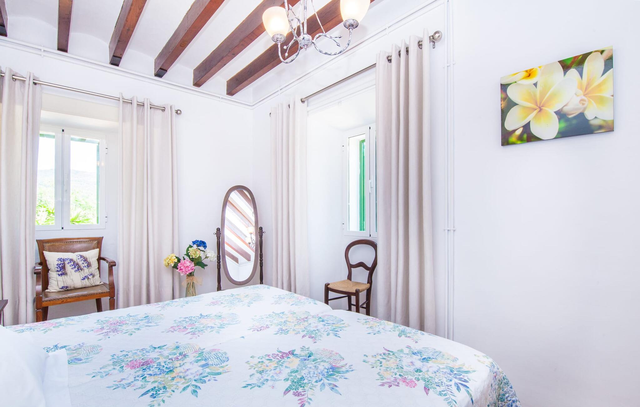 En sand sommerdrøm. Den solgule gamle bygning med hvide trim og æblegrønne skodder ser ud til at observere det afslappede liv i landsbyen Esporles. Det skyldes, at villaen ligger lidt over byen på en bjergskråning, hvilket giver jer en vidunderlig udsigt over den rolige by. Naturstensvægge blander sig i bjerget og skaber et smukt ensemble af terrasserede blomsterbede med frodige buske, buske og høje træer, herunder palmer. Poolen er skjult og skjult kun få meter fra huset. I kan nå det via en romantisk naturlig havesti. Der vil I finde en stor pool med et bugtende mosaikdesign og en omgivende solterrasse. Hvis I gerne vil slappe af på de komfortable liggestole efter en forfriskende svømmetur, er parasoller til rådighed. For enden af poolen er der et skyggefuldt område med en lounge - ideel til at læse en god bog. Det udendørs badeværelse gør det ekstra nemt at opholde sig udenfor hele dagen. Selve huset byder også på adskillige siddemuligheder med polyrattan-møbler og en spiseplads, der komplementerer murstensgrillen. I kan tilberede lækre BBQ-retter uden tidspres ved at bruge de aromatiske ingredienser, som den baleariske ø har at byde på. Det autentiske sommerhus formidler en følelse af mallorcansk ægthed ved at kombinere flair af et landsted med moderne standarder. Det gælder også indretningen, som består af komfortable siddepladser og træ med en varm farve. Dekorative gårdartikler og kærlige detaljer kendetegner den behagelige traditionelle flair. Stueetagen udgør det generelle opholdsrum med stue, stue og spisestue, badeværelse og køkken. Sidstnævnte er fuldt udstyret til jeres personlige komfort - og det lille siddeområde lavet af murstensbænke tilbyder et utroligt hyggeligt hjørne til at chatte med jeres medrejsende. Dette fører til en ubegrænset følelse af at bo og umiddelbar velvære, som også fortsætter i de tre soveværelser på øverste etage. Udover smukke sengerammer er der masser af opbevaringsplads til jeres feriegarderobe. Der er også to yderligere fuldt renoverede bruserum (et en-suite) til rådighed på dette niveau, så en familie eller en gruppe af venner ikke behøver at gå på kompromis. Der er meget mere at opdage på "C'an Pieres" - vi overlader resten til jer. En gotisk kirke, en landejendom med en naturlig kilde brugt som museum, en flod med talrige broer og utallige egeskove inviterer jer til at tage vandreskoene på. Dette er, hvad Esporles inkarnerer, og derfor er den indbydende villa det ideelle udgangspunkt, især for naturelskere, for at udforske Tramuntana-bjergene. Nogle gode restauranter og smukke butikker supplerer den gode infrastruktur. Takket være sin centrale beliggenhed tæt på landevejen, som kun er hørbar i en bestemt vindretning, kan I nå Valdemossa, kunstnerbyen Deià, og kysten med dens rolige havne og maleriske strande via en spektakulært smuk køretur gennem serpentine veje. Med alt, hvad det har at tilbyde, hjælper "C'an Pieres" jer gerne med at opleve skønheden og originaliteten på Mallorca i al dens mangfoldighed. Villaen "C'an Pieres" ligger midt i det romantiske, vilde bjerglandskab over den smukke bjerglandsby Esporles. Herfra kan I nyde en vidunderlig udsigt over bjergene og byen, som også er i gåafstand til jeres indkøb. Det kan selvfølgelig også lade sig gøre ved at besøge det ugentlige marked i det populære Valdemossa. Fantastiske badebugter som Port de Canonge eller Puta de sa Galera ligger 9 km derfra.