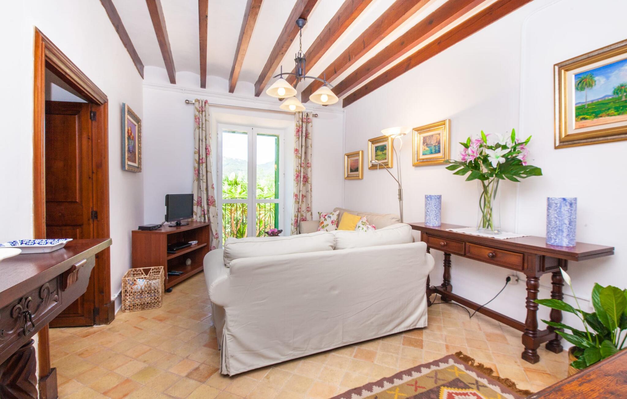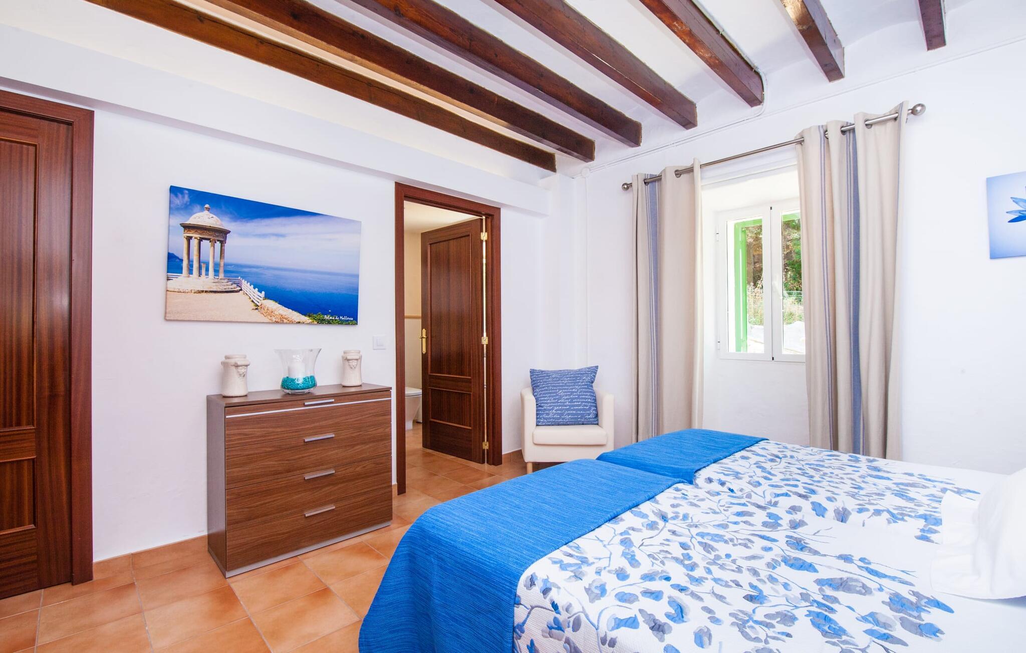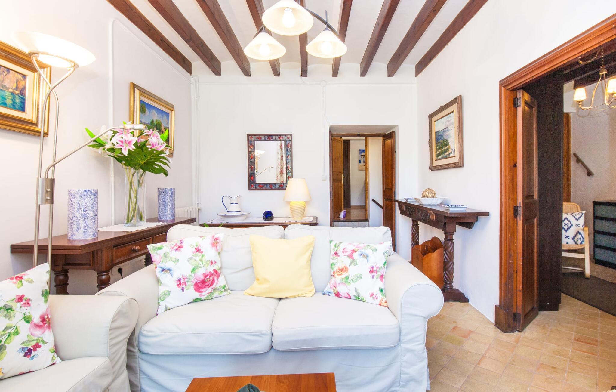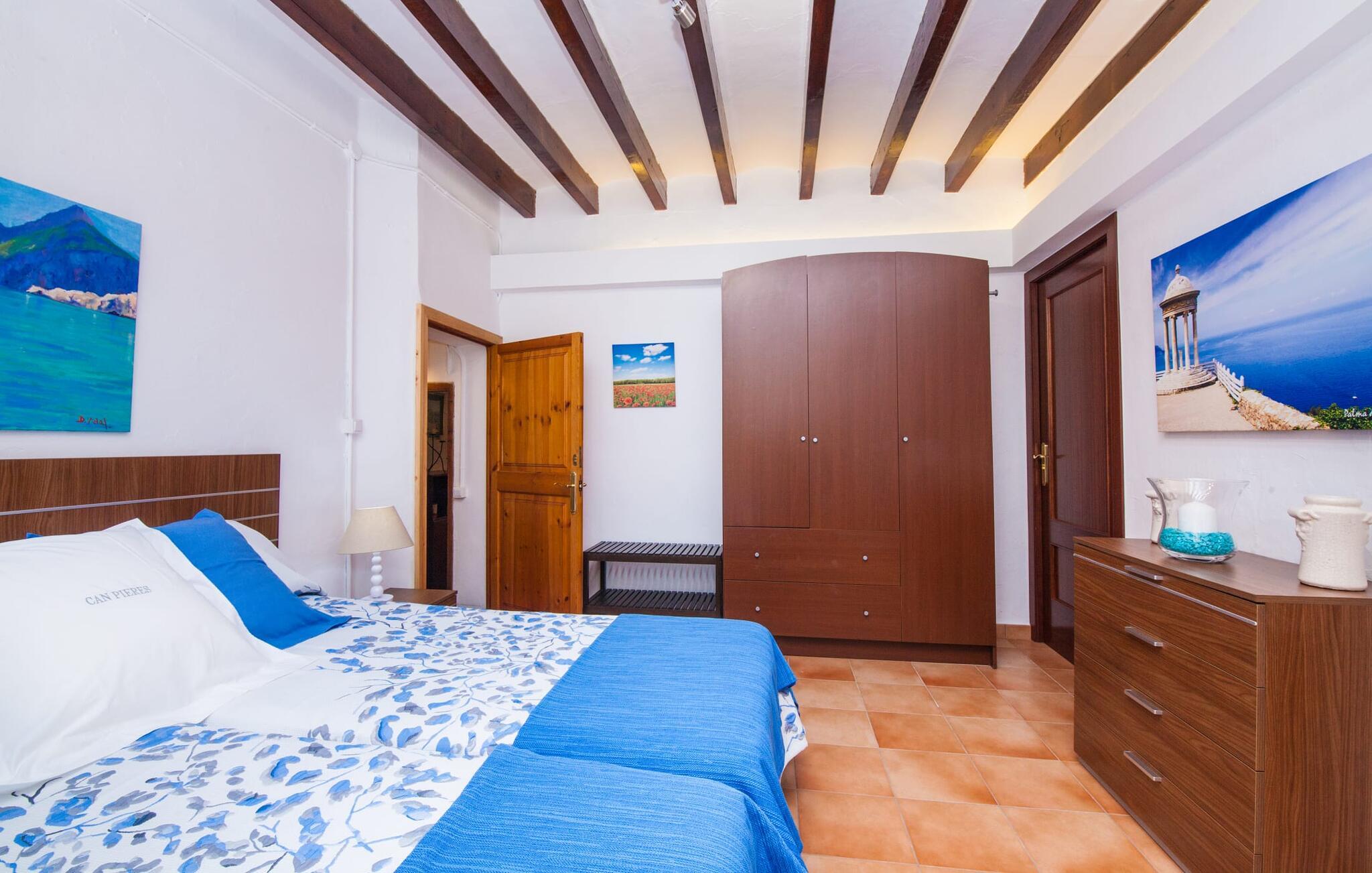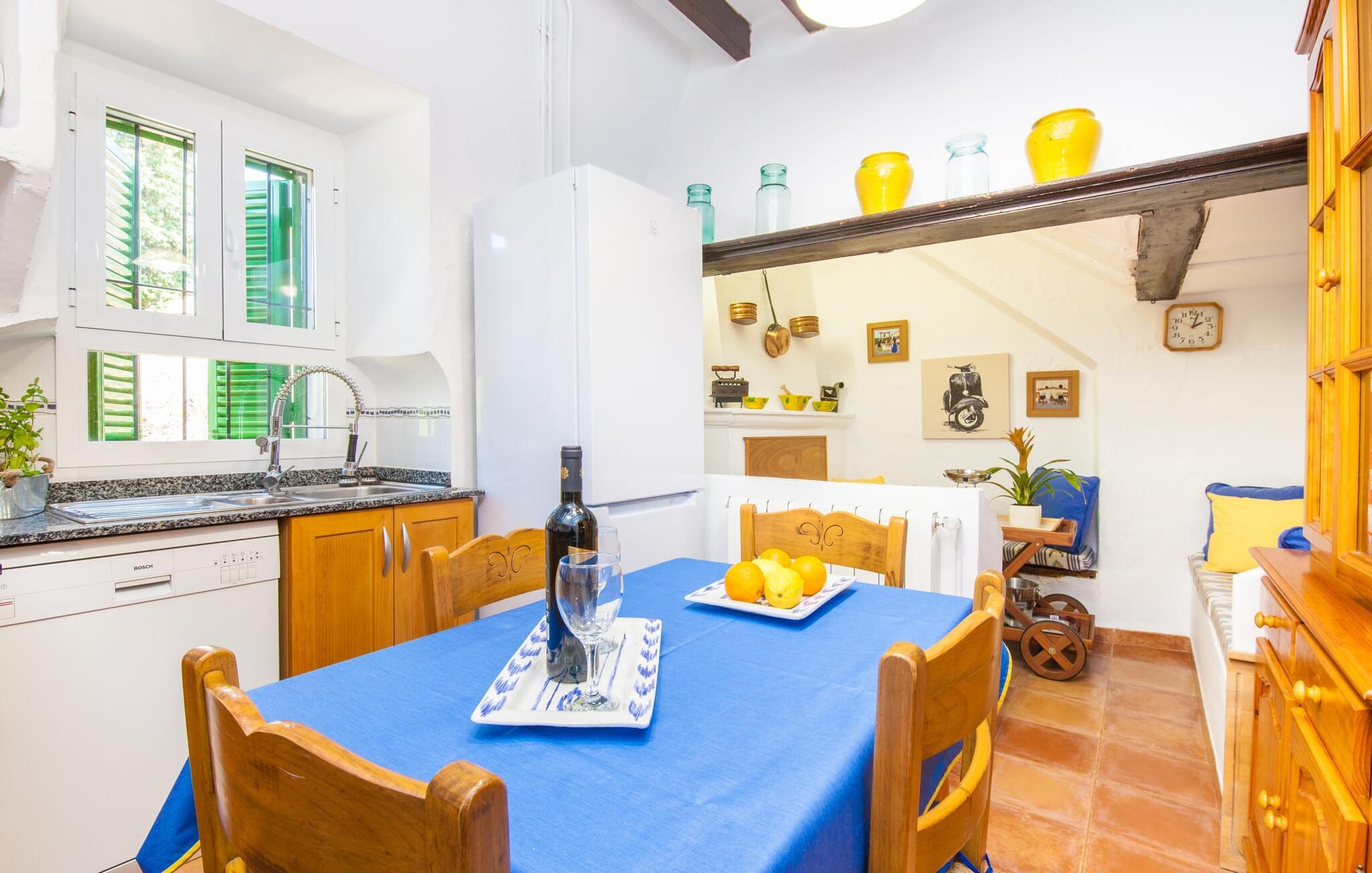 En sand sommerdrøm. Den solgule gamle bygning med hvide trim og æblegrønne skodder ser ud til at observere det afslappede liv i landsbyen Esporles. Det skyldes, at villaen ligger lidt over byen på en bjergskråning, hvilket giver jer en vidunderlig udsigt over den rolige by. Naturstensvægge blander sig i bjerget og skaber et smukt ensemble af terrasserede blomsterbede med frodige buske, buske og høje træer, herunder palmer. Poolen er skjult og skjult kun få meter fra huset. I kan nå det via en romantisk naturlig havesti. Der vil I finde en stor pool med et bugtende mosaikdesign og en omgivende solterrasse. Hvis I gerne vil slappe af på de komfortable liggestole efter en forfriskende svømmetur, er parasoller til rådighed. For enden af poolen er der et skyggefuldt område med en lounge - ideel til at læse en god bog. Det udendørs badeværelse gør det ekstra nemt at opholde sig udenfor hele dagen. Selve huset byder også på adskillige siddemuligheder med polyrattan-møbler og en spiseplads, der komplementerer murstensgrillen. I kan tilberede lækre BBQ-retter uden tidspres ved at bruge de aromatiske ingredienser, som den baleariske ø har at byde på. Det autentiske sommerhus formidler en følelse af mallorcansk ægthed ved at kombinere flair af et landsted med moderne standarder. Det gælder også indretningen, som består af komfortable siddepladser og træ med en varm farve. Dekorative gårdartikler og kærlige detaljer kendetegner den behagelige traditionelle flair. Stueetagen udgør det generelle opholdsrum med stue, stue og spisestue, badeværelse og køkken. Sidstnævnte er fuldt udstyret til jeres personlige komfort - og det lille siddeområde lavet af murstensbænke tilbyder et utroligt hyggeligt hjørne til at chatte med jeres medrejsende. Dette fører til en ubegrænset følelse af at bo og umiddelbar velvære, som også fortsætter i de tre soveværelser på øverste etage. Udover smukke sengerammer er der masser af opbevaringsplads til jeres feriegarderobe. Der er også to yderligere fuldt renoverede bruserum (et en-suite) til rådighed på dette niveau, så en familie eller en gruppe af venner ikke behøver at gå på kompromis. Der er meget mere at opdage på "C'an Pieres" - vi overlader resten til jer. En gotisk kirke, en landejendom med en naturlig kilde brugt som museum, en flod med talrige broer og utallige egeskove inviterer jer til at tage vandreskoene på. Dette er, hvad Esporles inkarnerer, og derfor er den indbydende villa det ideelle udgangspunkt, især for naturelskere, for at udforske Tramuntana-bjergene. Nogle gode restauranter og smukke butikker supplerer den gode infrastruktur. Takket være sin centrale beliggenhed tæt på landevejen, som kun er hørbar i en bestemt vindretning, kan I nå Valdemossa, kunstnerbyen Deià, og kysten med dens rolige havne og maleriske strande via en spektakulært smuk køretur gennem serpentine veje. Med alt, hvad det har at tilbyde, hjælper "C'an Pieres" jer gerne med at opleve skønheden og originaliteten på Mallorca i al dens mangfoldighed. Villaen "C'an Pieres" ligger midt i det romantiske, vilde bjerglandskab over den smukke bjerglandsby Esporles. Herfra kan I nyde en vidunderlig udsigt over bjergene og byen, som også er i gåafstand til jeres indkøb. Det kan selvfølgelig også lade sig gøre ved at besøge det ugentlige marked i det populære Valdemossa. Fantastiske badebugter som Port de Canonge eller Puta de sa Galera ligger 9 km derfra.