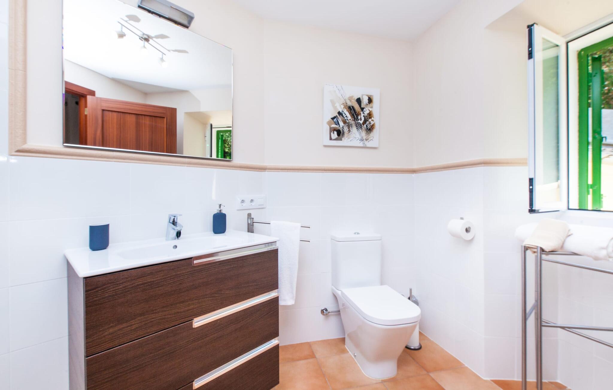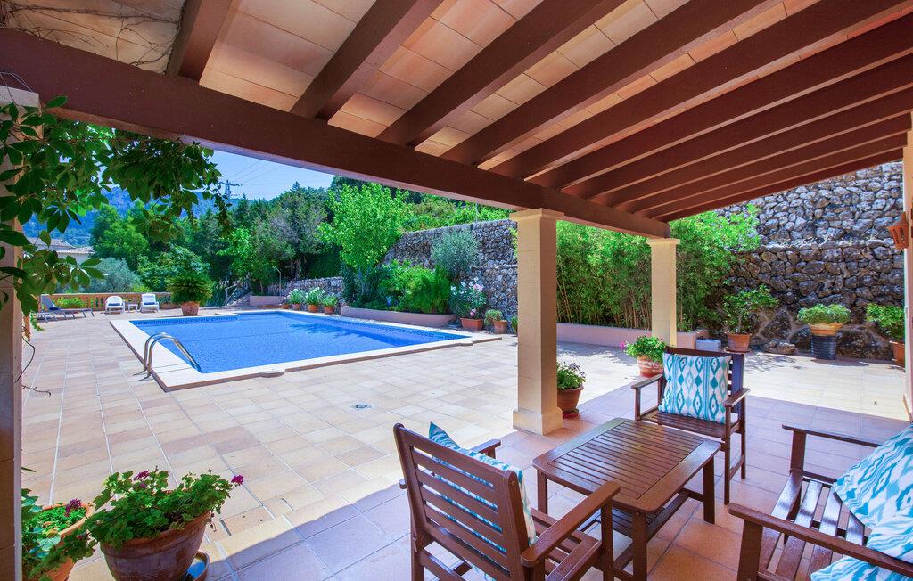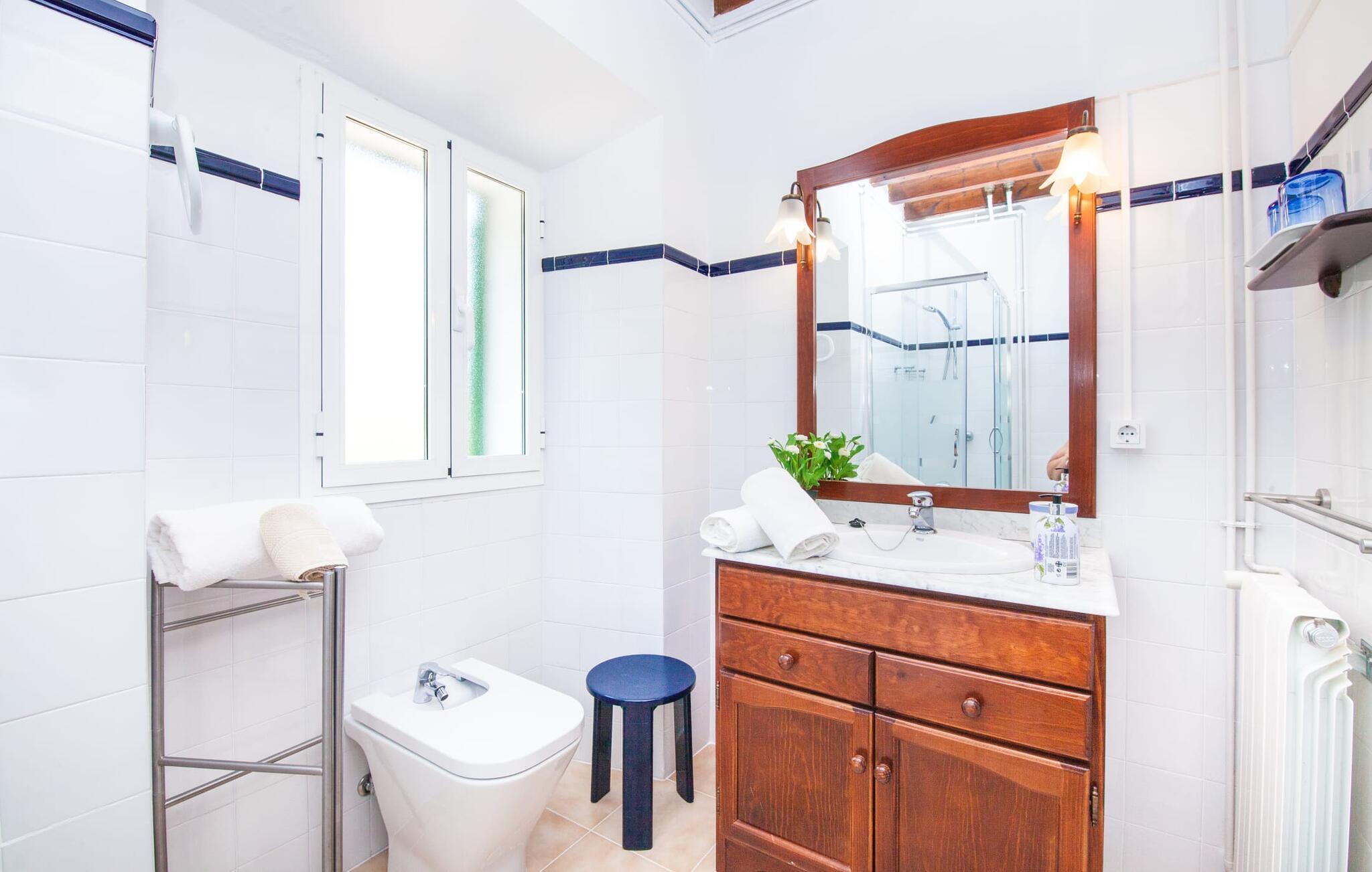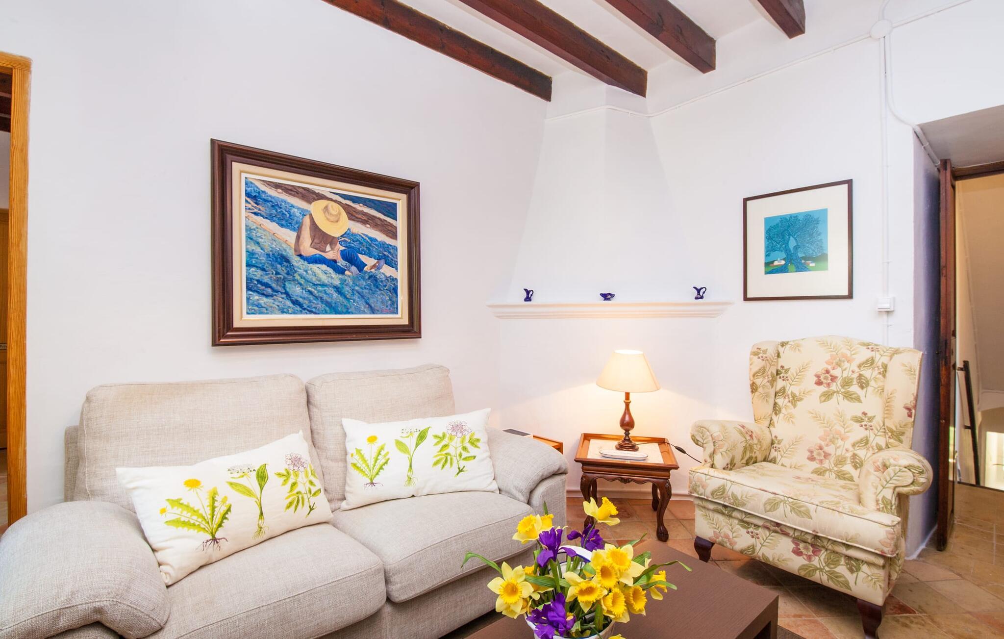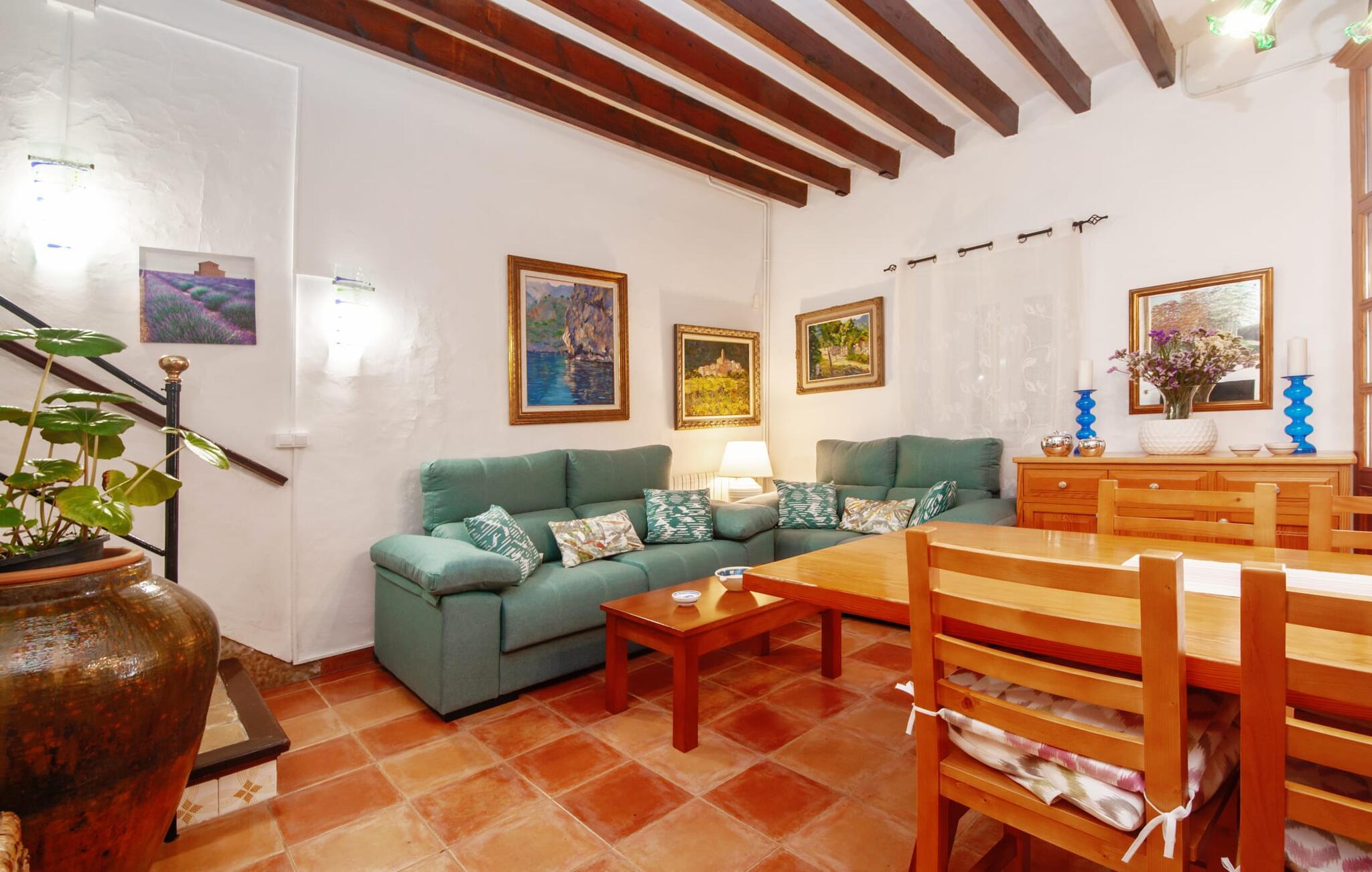En sand sommerdrøm. Den solgule gamle bygning med hvide trim og æblegrønne skodder ser ud til at observere det afslappede liv i landsbyen Esporles. Det skyldes, at villaen ligger lidt over byen på en bjergskråning, hvilket giver jer en vidunderlig udsigt over den rolige by. Naturstensvægge blander sig i bjerget og skaber et smukt ensemble af terrasserede blomsterbede med frodige buske, buske og høje træer, herunder palmer. Poolen er skjult og skjult kun få meter fra huset. I kan nå det via en romantisk naturlig havesti. Der vil I finde en stor pool med et bugtende mosaikdesign og en omgivende solterrasse. Hvis I gerne vil slappe af på de komfortable liggestole efter en forfriskende svømmetur, er parasoller til rådighed. For enden af poolen er der et skyggefuldt område med en lounge - ideel til at læse en god bog. Det udendørs badeværelse gør det ekstra nemt at opholde sig udenfor hele dagen. Selve huset byder også på adskillige siddemuligheder med polyrattan-møbler og en spiseplads, der komplementerer murstensgrillen. I kan tilberede lækre BBQ-retter uden tidspres ved at bruge de aromatiske ingredienser, som den baleariske ø har at byde på. Det autentiske sommerhus formidler en følelse af mallorcansk ægthed ved at kombinere flair af et landsted med moderne standarder. Det gælder også indretningen, som består af komfortable siddepladser og træ med en varm farve. Dekorative gårdartikler og kærlige detaljer kendetegner den behagelige traditionelle flair. Stueetagen udgør det generelle opholdsrum med stue, stue og spisestue, badeværelse og køkken. Sidstnævnte er fuldt udstyret til jeres personlige komfort - og det lille siddeområde lavet af murstensbænke tilbyder et utroligt hyggeligt hjørne til at chatte med jeres medrejsende. Dette fører til en ubegrænset følelse af at bo og umiddelbar velvære, som også fortsætter i de tre soveværelser på øverste etage. Udover smukke sengerammer er der masser af opbevaringsplads til jeres feriegarderobe. Der er også to yderligere fuldt renoverede bruserum (et en-suite) til rådighed på dette niveau, så en familie eller en gruppe af venner ikke behøver at gå på kompromis. Der er meget mere at opdage på "C'an Pieres" - vi overlader resten til jer. En gotisk kirke, en landejendom med en naturlig kilde brugt som museum, en flod med talrige broer og utallige egeskove inviterer jer til at tage vandreskoene på. Dette er, hvad Esporles inkarnerer, og derfor er den indbydende villa det ideelle udgangspunkt, især for naturelskere, for at udforske Tramuntana-bjergene. Nogle gode restauranter og smukke butikker supplerer den gode infrastruktur. Takket være sin centrale beliggenhed tæt på landevejen, som kun er hørbar i en bestemt vindretning, kan I nå Valdemossa, kunstnerbyen Deià, og kysten med dens rolige havne og maleriske strande via en spektakulært smuk køretur gennem serpentine veje. Med alt, hvad det har at tilbyde, hjælper "C'an Pieres" jer gerne med at opleve skønheden og originaliteten på Mallorca i al dens mangfoldighed. Villaen "C'an Pieres" ligger midt i det romantiske, vilde bjerglandskab over den smukke bjerglandsby Esporles. Herfra kan I nyde en vidunderlig udsigt over bjergene og byen, som også er i gåafstand til jeres indkøb. Det kan selvfølgelig også lade sig gøre ved at besøge det ugentlige marked i det populære Valdemossa. Fantastiske badebugter som Port de Canonge eller Puta de sa Galera ligger 9 km derfra.
