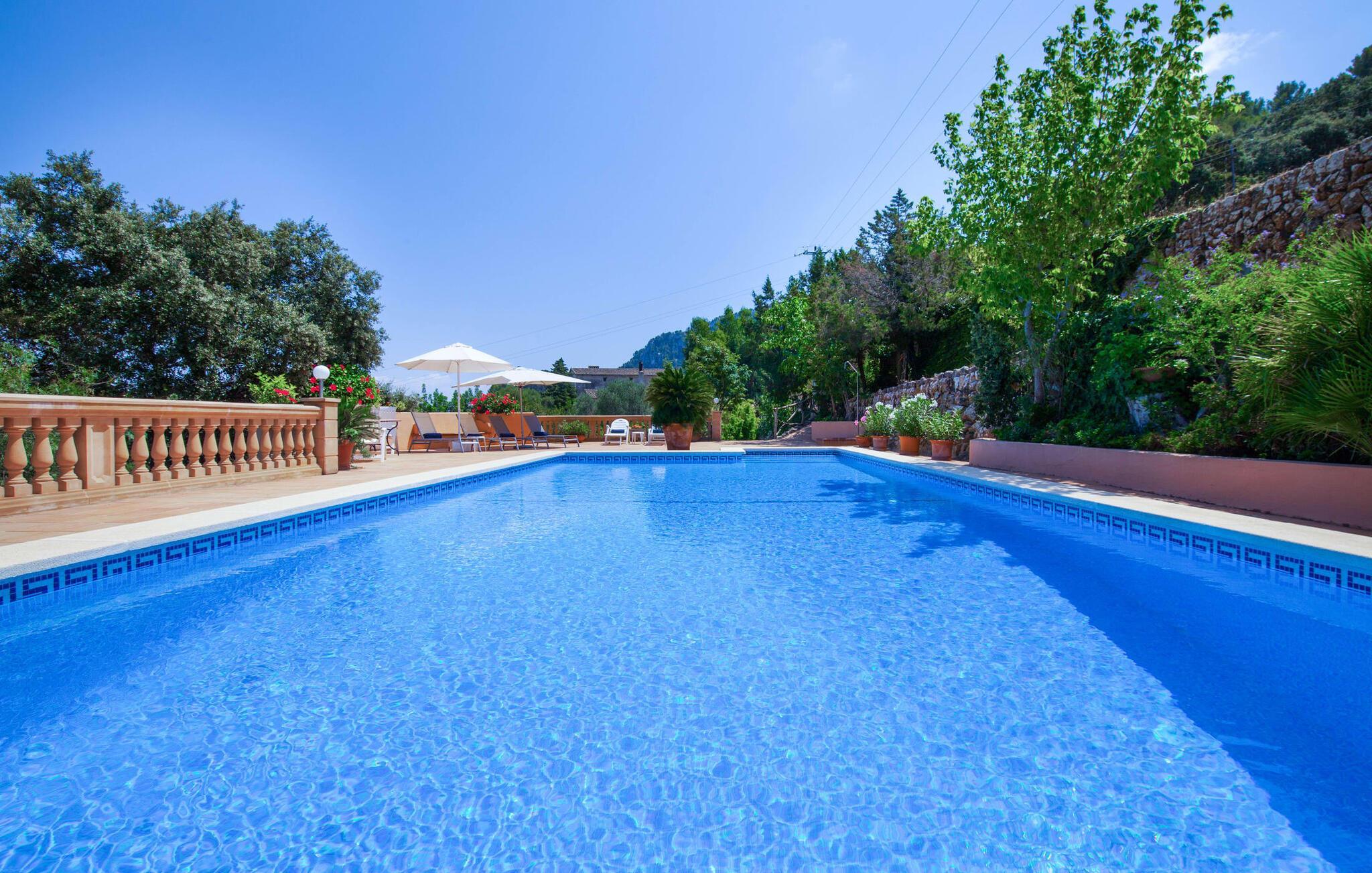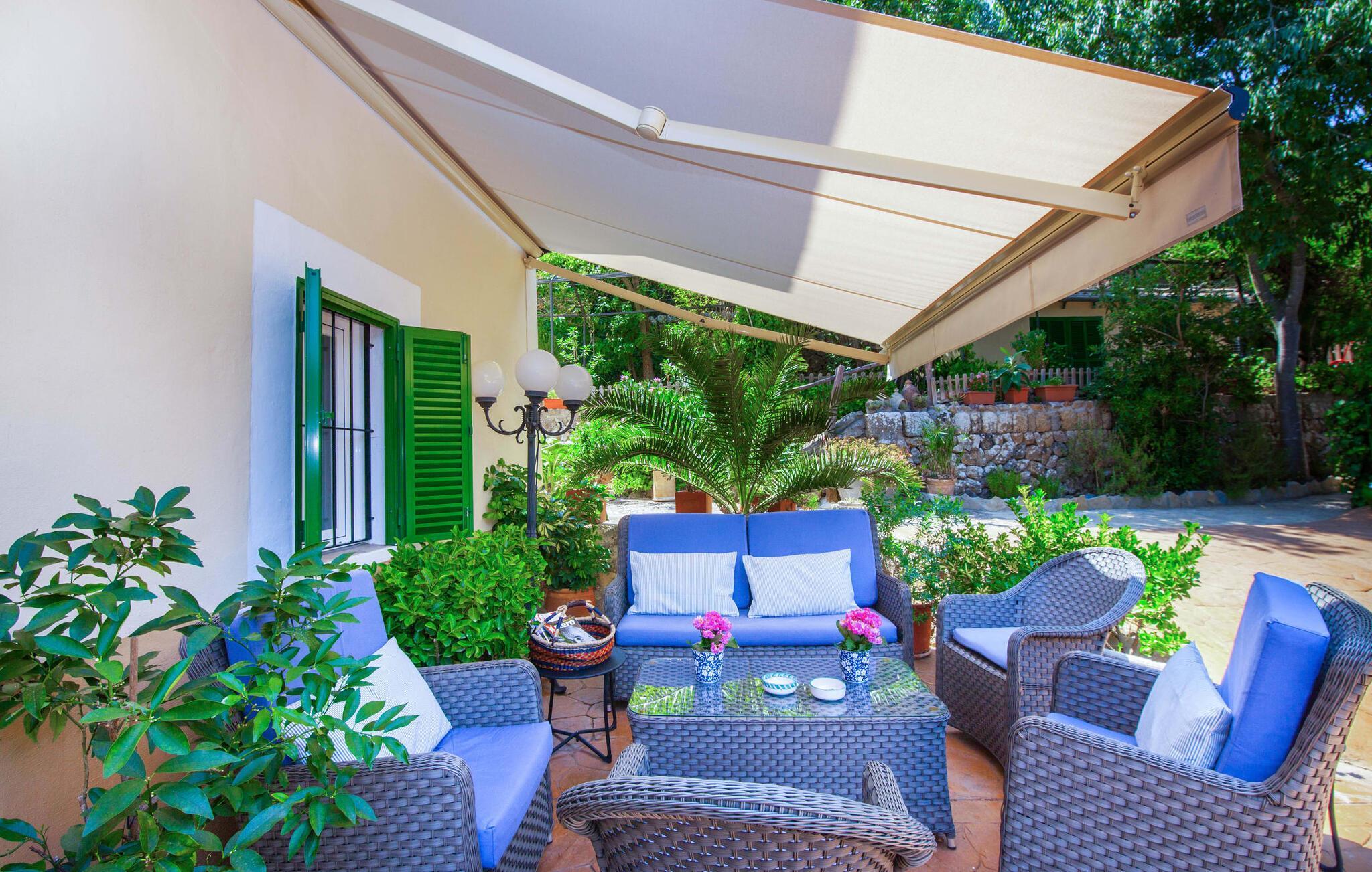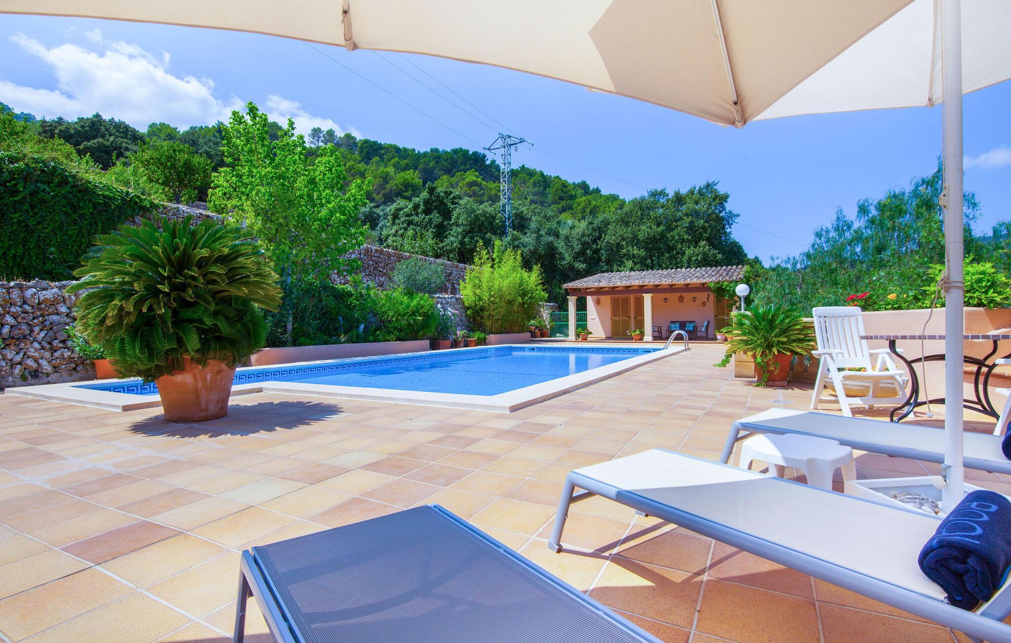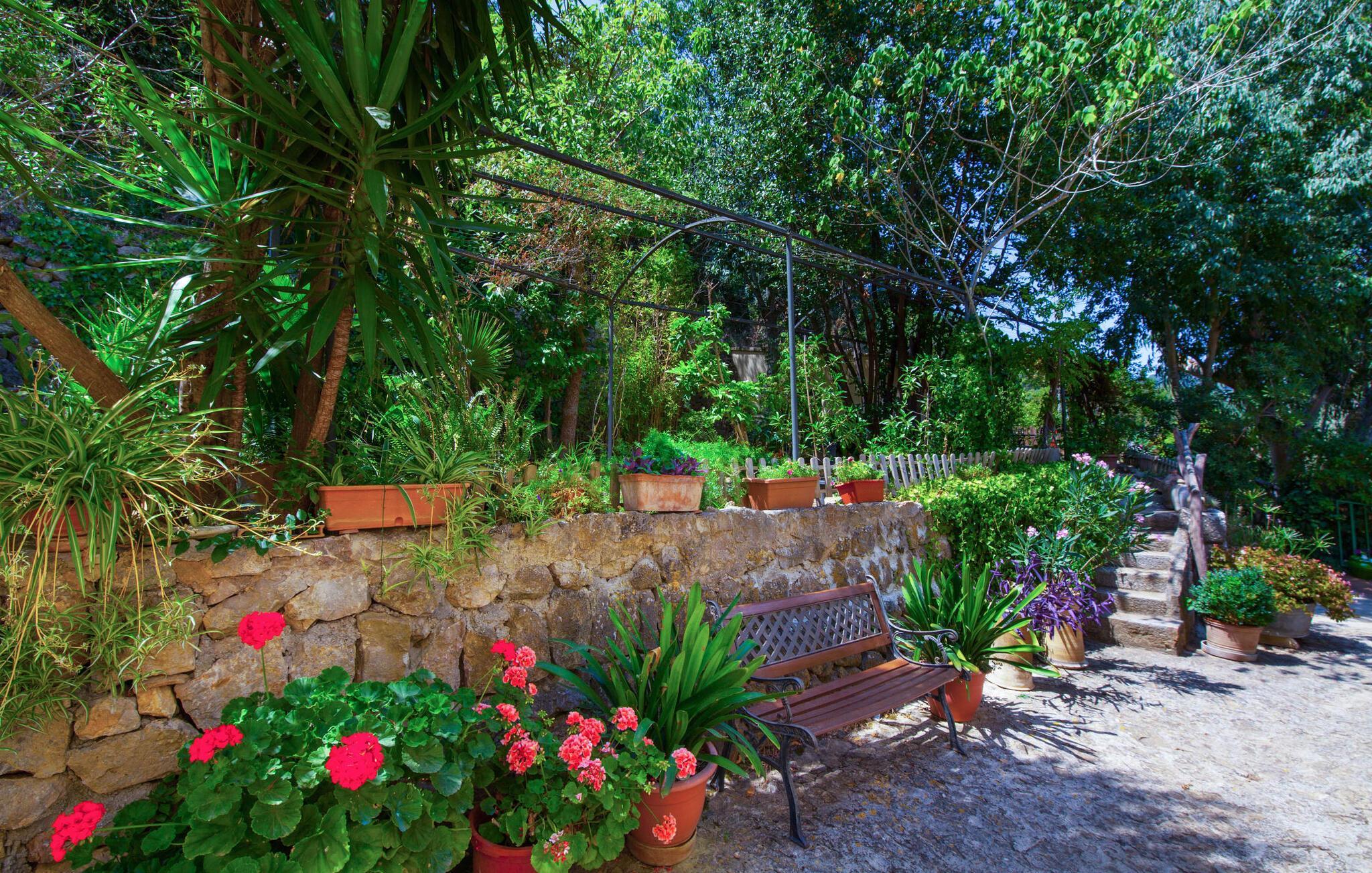 En sand sommerdrøm. Den solgule gamle bygning med hvide trim og æblegrønne skodder ser ud til at observere det afslappede liv i landsbyen Esporles. Det skyldes, at villaen ligger lidt over byen på en bjergskråning, hvilket giver dig en vidunderlig udsigt over den rolige by. Naturstensvægge blander sig i bjerget og skaber et smukt ensemble af terrasserede blomsterbede med frodige buske, buske og høje træer, herunder palmer. Poolen er skjult og skjult kun få meter fra huset. Du kan nå det via en romantisk naturlig havesti. Der vil du finde en stor pool med et bugtende mosaikdesign og en omgivende solterrasse. Hvis du gerne vil slappe af på de komfortable liggestole efter en forfriskende svømmetur, er parasoller til rådighed. For enden af poolen er der et skyggefuldt område med en lounge - ideel til at læse en god bog. Det udendørs badeværelse gør det ekstra nemt at opholde sig udenfor hele dagen. Selve huset byder også på adskillige siddemuligheder med polyrattan-møbler og en spiseplads, der komplementerer murstensgrillen. Du kan tilberede lækre BBQ-retter uden tidspres ved at bruge de aromatiske ingredienser, som den baleariske ø har at byde på. Dette er et Fincallorca feriehus. Det autentiske sommerhus formidler en følelse af mallorcansk ægthed ved at kombinere flair af et landsted med moderne standarder. Det gælder også indretningen, som består af komfortable siddepladser og træ med en varm farve. Dekorative gårdartikler og kærlige detaljer kendetegner den behagelige traditionelle flair. Stueetagen udgør det generelle opholdsrum med stue, stue og spisestue, badeværelse og køkken. Sidstnævnte er fuldt udstyret til din personlige komfort - og det lille siddeområde lavet af murstensbænke tilbyder et utroligt hyggeligt hjørne til at chatte med dine medrejsende. Dette fører til en ubegrænset følelse af at bo og umiddelbar velvære, som også fortsætter i de tre soveværelser på øverste etage. Udover smukke sengerammer er der masser af opbevaringsplads til din feriegarderobe. Der er også to yderligere fuldt renoverede bruserum (et en-suite) til rådighed på dette niveau, så en familie eller en gruppe af venner ikke behøver at gå på kompromis. Der er meget mere at opdage på "C'an Pieres" - vi overlader resten til dig. En gotisk kirke, en landejendom med en naturlig kilde brugt som museum, en flod med talrige broer og utallige egeskove inviterer dig til at tage vandreskoene på. Dette er, hvad Esporles inkarnerer, og derfor er den indbydende villa det ideelle udgangspunkt, især for naturelskere, for at udforske Tramuntana-bjergene. Nogle gode restauranter og smukke butikker supplerer den gode infrastruktur. Takket være sin centrale beliggenhed tæt på landevejen, som kun er hørbar i en bestemt vindretning, kan du nå Valdemossa, kunstnerbyen Deià, og kysten med dens rolige havne og maleriske strande via en spektakulært smuk køretur gennem serpentine veje. Med alt, hvad det har at tilbyde, hjælper "C'an Pieres" dig gerne med at opleve skønheden og originaliteten på Mallorca i al dens mangfoldighed. Villaen "C'an Pieres" ligger midt i det romantiske, vilde bjerglandskab over den smukke bjerglandsby Esporles. Herfra kan du nyde en vidunderlig udsigt over bjergene og byen, som også er i gåafstand til dine indkøb. Det kan selvfølgelig også lade sig gøre ved at besøge det ugentlige marked i det populære Valdemossa. Fantastiske badebugter såsom Port de Canonge eller Puta de sa Galera ligger 9 km derfra.