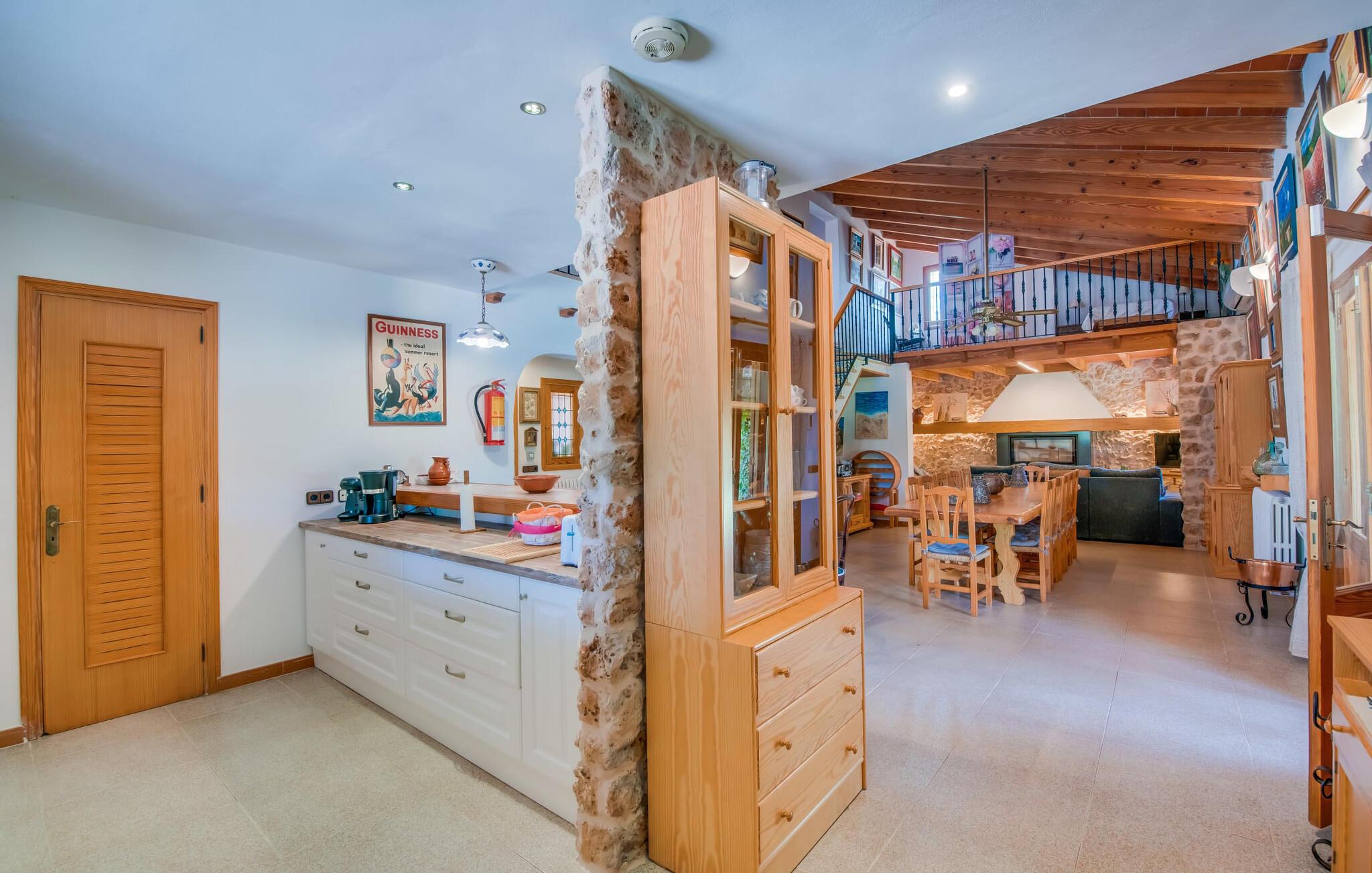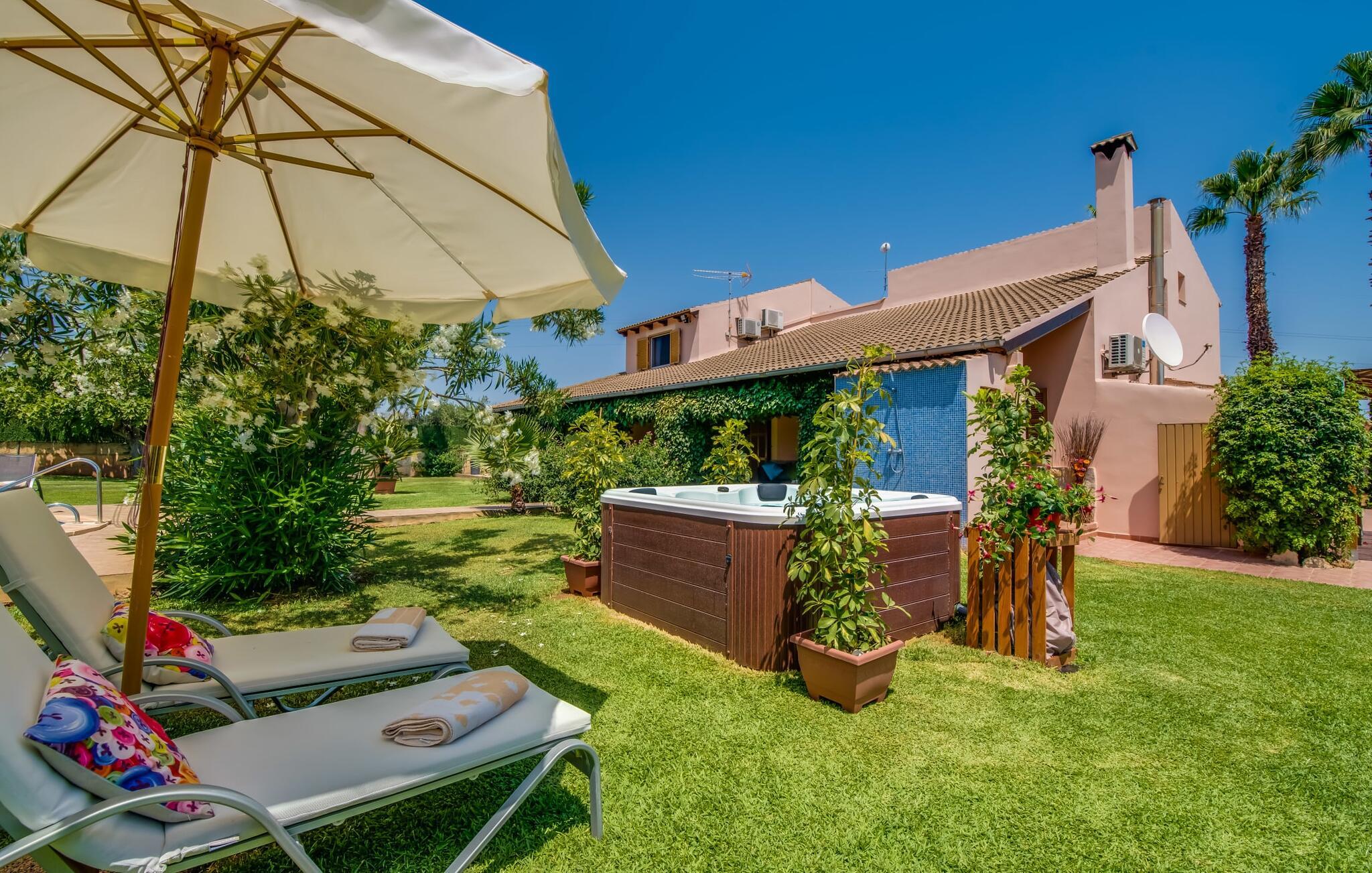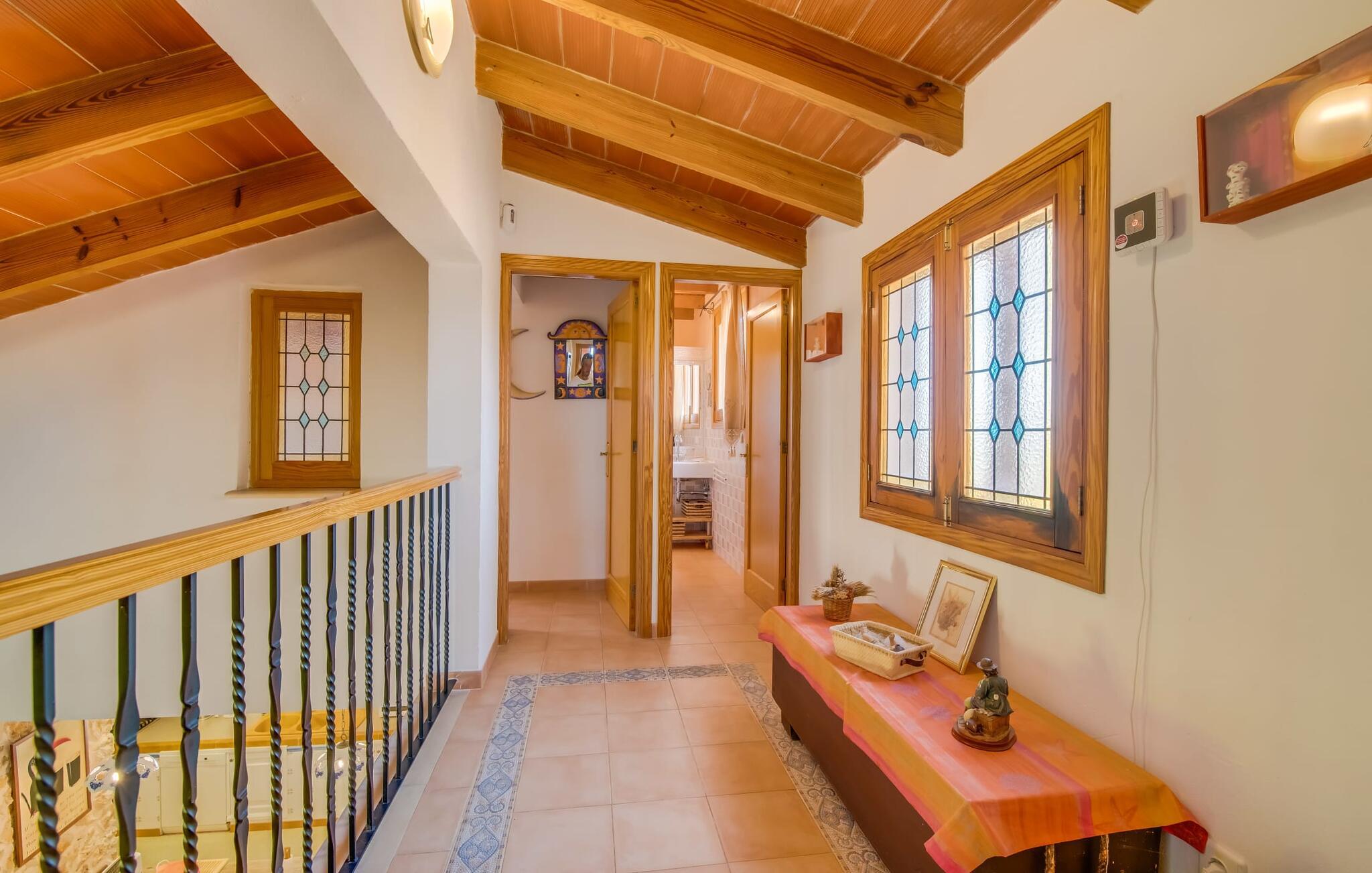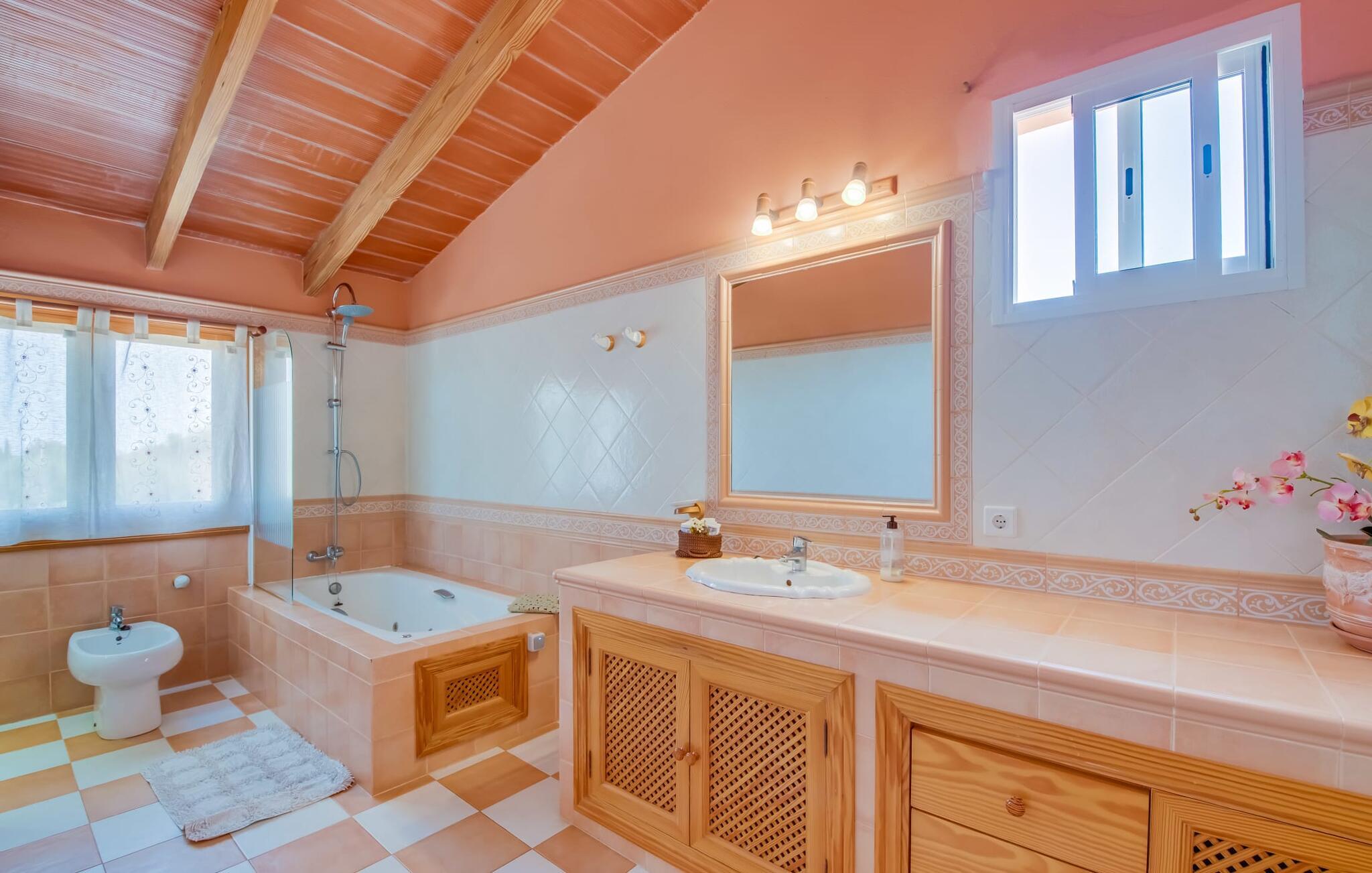 Ydersiden af villaen "Ca Na Bisquerra" er malet med glat puds i en blød abrikos tone, har natursten fodpaneler og charmerende træskodder. Det blev bygget for blot et par år siden af sine nuværende ejere og er smukt indrettet både inde og ude. På trods af sin "ungdom" er villaen designet i en traditionel mallorcansk stil, som er ekstrem varm og hyggelig, og som i bund og grund er det ideelle sted for en familie eller en gruppe venner, der ønsker at holde ferie sammen. Den afsondrede villa er omgivet af smukt anlagte haver med masser af palmer, så I kan nyde de landlige omgivelser, som om det var jeres egen private 'ø', selvom der er andre villaer i området. En lille asfalteret gangsti fører fra huset gennem haven til det smukke poolområde. Poolen er dekoreret med bugtende mosaikfliser og er omgivet af en rummelig græsplæne med otte liggestole til afslapning. Om nødvendigt er der også tre parasoller til rådighed for at beskytte jer mod den varme middagssol. Lidt væk fra poolen, men også midt i den anlagte have, finder I det fuldt udstyrede, overdækkede udekøkken, som indeholder en åben pejsgrill og et langt spisebord; Dette er vores personlige favorit ved denne meget imponerende villa. Udover grillen har køkkenet også et komfur med gaskomfur, masser af skabe til opbevaring af udendørs redskaber og et stort køleskab til kølige drikkevarer. Denne separate struktur kan godt beskyttes mod sol og vind med lidt mere end et par tynde dekorative gardiner, som ikke kun ser meget slående ud, men også er utrolig praktisk. En herligt indbydende overdækket terrasse strækker sig langs husets forside med masser af forskellige siddemuligheder, enten ved et af bordene eller på havemøbler med muntre orange hynder - alt sammen i smart polyrattan og perfekt til afslapning og afslapning. Det, der er særligt imponerende ved indretningen, er den tilbagelænede, tilbagelænede atmosfære, som muliggøres af den store stue/spisestue i åbent plan i stueetagen med en trappe, der fører op til det åbne galleri og værelser på det øverste. etage. I stueetagen er der et komfortabelt sofasæt foran en åben pejs, hvor I kan tilbringe en afslappende aften foran fjernsynet. Lige ved siden af er der et stort spisebord, der giver mere end nok plads til alle, der rejser med jer. Køkkenområdet er visuelt adskilt fra resten af rummet af en lang bordplade med håndmalede fliser og et kraftigt trægulvbræt. Selv når I er på ferie, kan I nyde det fulde udvalg af faciliteter - inklusive en mikrobølgeovn, elkedel, kaffemaskine, gaskomfur og endda en opvaskemaskine - alle de faciliteter, I ønsker til den selvforsynende ferie, I har besluttet jer for. I stueetagen er der også to soveværelser og et komfortabelt badeværelse, som I kan dele. To yderligere soveværelser og to stilfulde badeværelser er placeret ovenpå bag det åbne galleriområde. De hyggelige værelser har synlige trælofter og masser af opbevaringsplads til det tøj, I medbringer eller tager med under jeres ophold. Alle badeværelser er behageligt indrettede i en moderne stil; To af dem har et badeværelse med brusearmatur og det tredje har en specialfremstillet indbygget bruser. På den gæstfri Villa Ca Na Bisquerra er alt praktisk og ukompliceret, præcis som I ønsker jeres ferie skal være, og denne beliggenhed byder på den ideelle stemning til sådan en oplevelse. En anden fordel ved villaen er dens imponerende beliggenhed - stille, men kun 150 m fra landevejen, der forbinder Can Picafort og Santa Margalida. Det betyder, at denne beliggenhed byder på både gode transportforbindelser og et stort potentiale for rekreation og afslapning. Der er kun 7 minutter i bil til Can Picafort og den nærmeste strand. De forskelligartede strande langs Alcúdia-bugten, herunder Platja de Muro, Can Picafort og de mere rolige strande mellem byerne, er hurtige og nemme at nå, hvis en dukkert i poolen ikke er nok, og I har lyst til en dejlig dag på stranden. I får sikkert lyst til at tage til Santa Margalida, hvis I er interesseret i at se en af øens smukkeste landsbyer og opleve det "rigtige" Mallorcas autentiske karakter. Og nu ønsker vi hos Fincallorca jer en skøn ferie i den stærkt anbefalede villa “Ca Na Bisquerra” – ikke mindst på grund af den utroligt gode pris, vi kan tilbyde denne lejevilla til. Den traditionelle villa "Ca Na Bisquerra" ligger i det smukke landskab mellem de charmerende små byer Santa Margalida og Can Picafort. I kan tage til begge byer for at købe dagligvarer og andre daglige fornødenheder, og hver by er vært for et landmandsmarked på forskellige dage i ugen. Alcúdia-bugten med flere sammenhængende kilometer sandstrande ligger kun 5 km væk i bil.