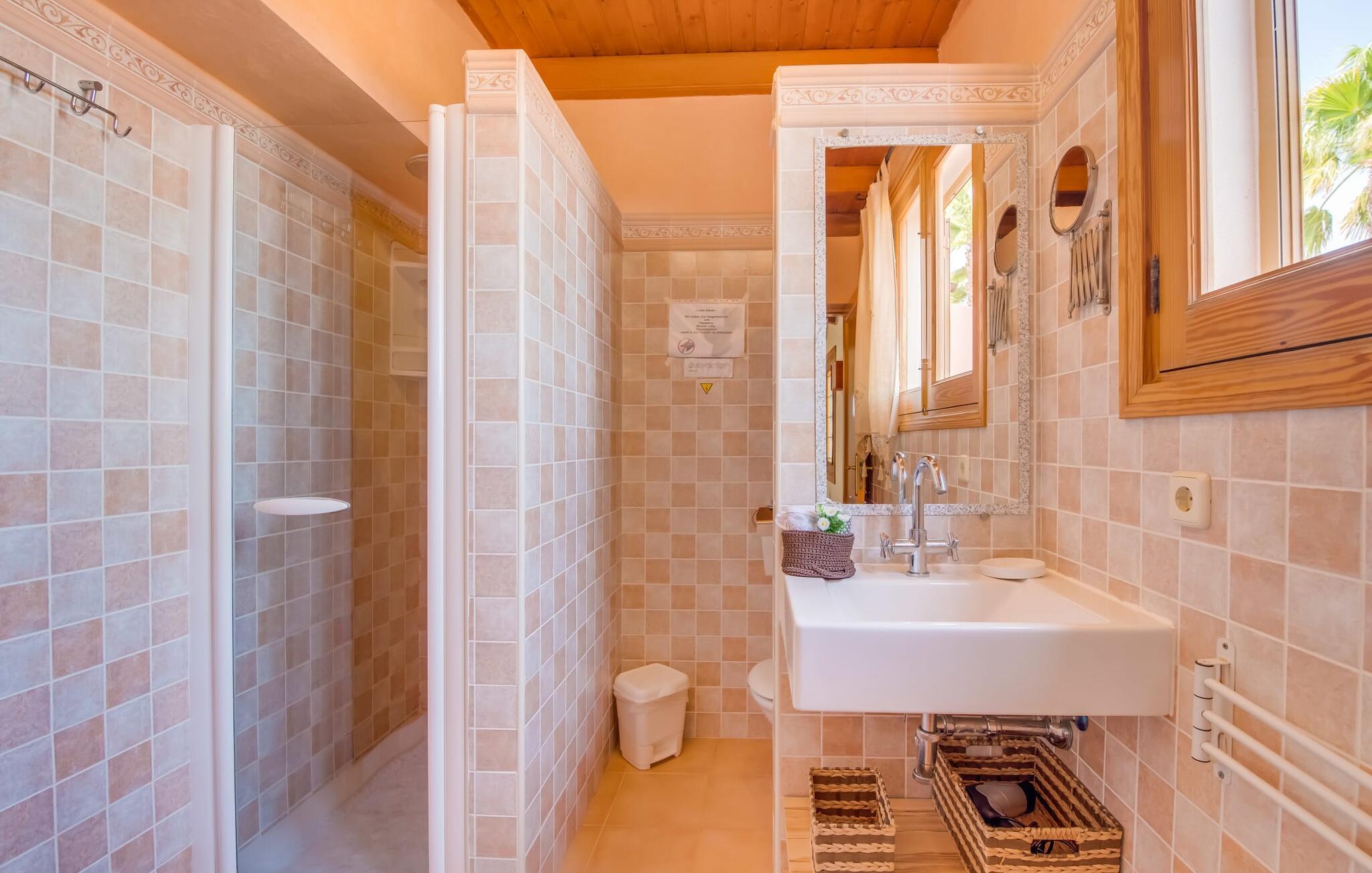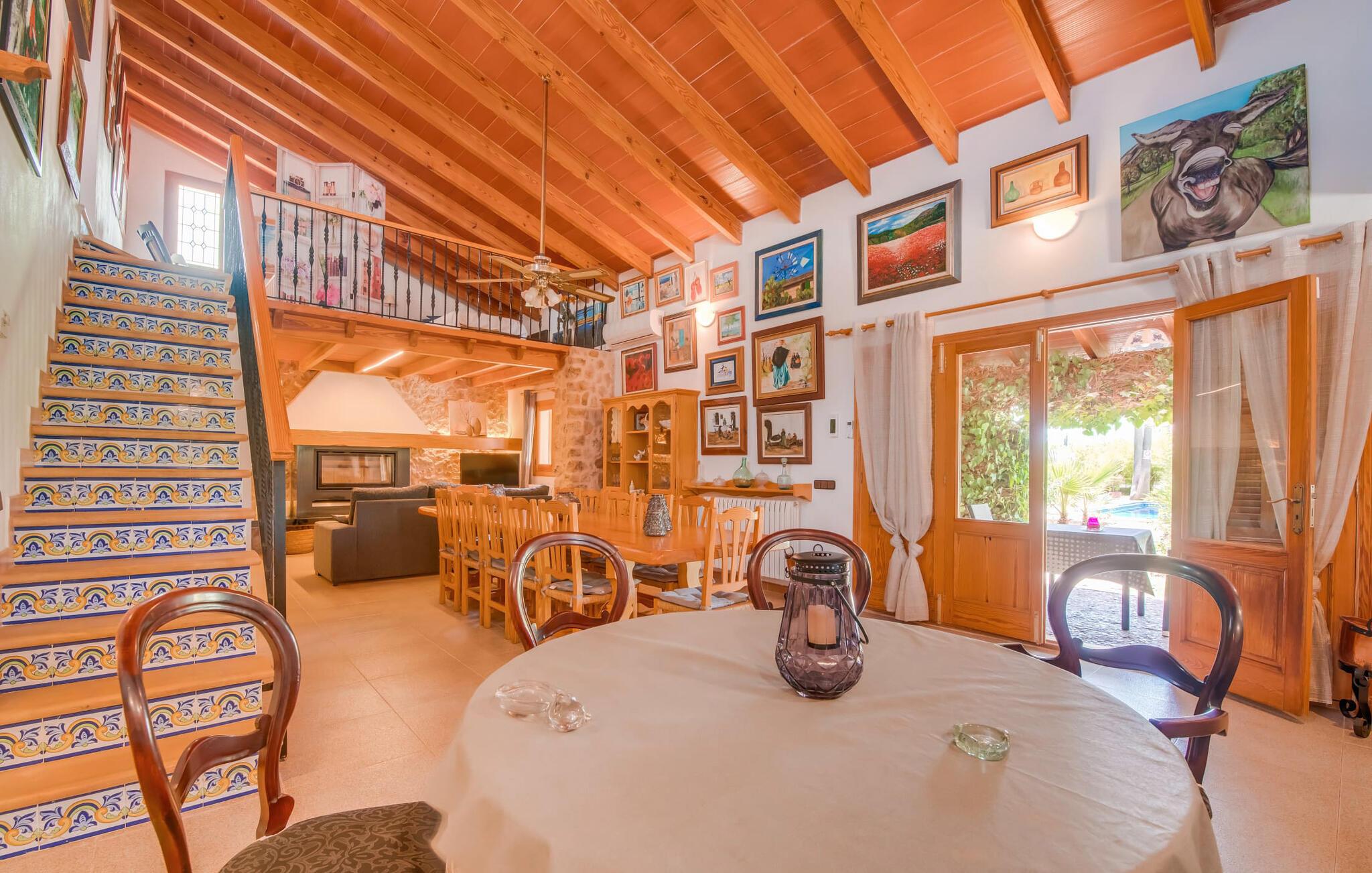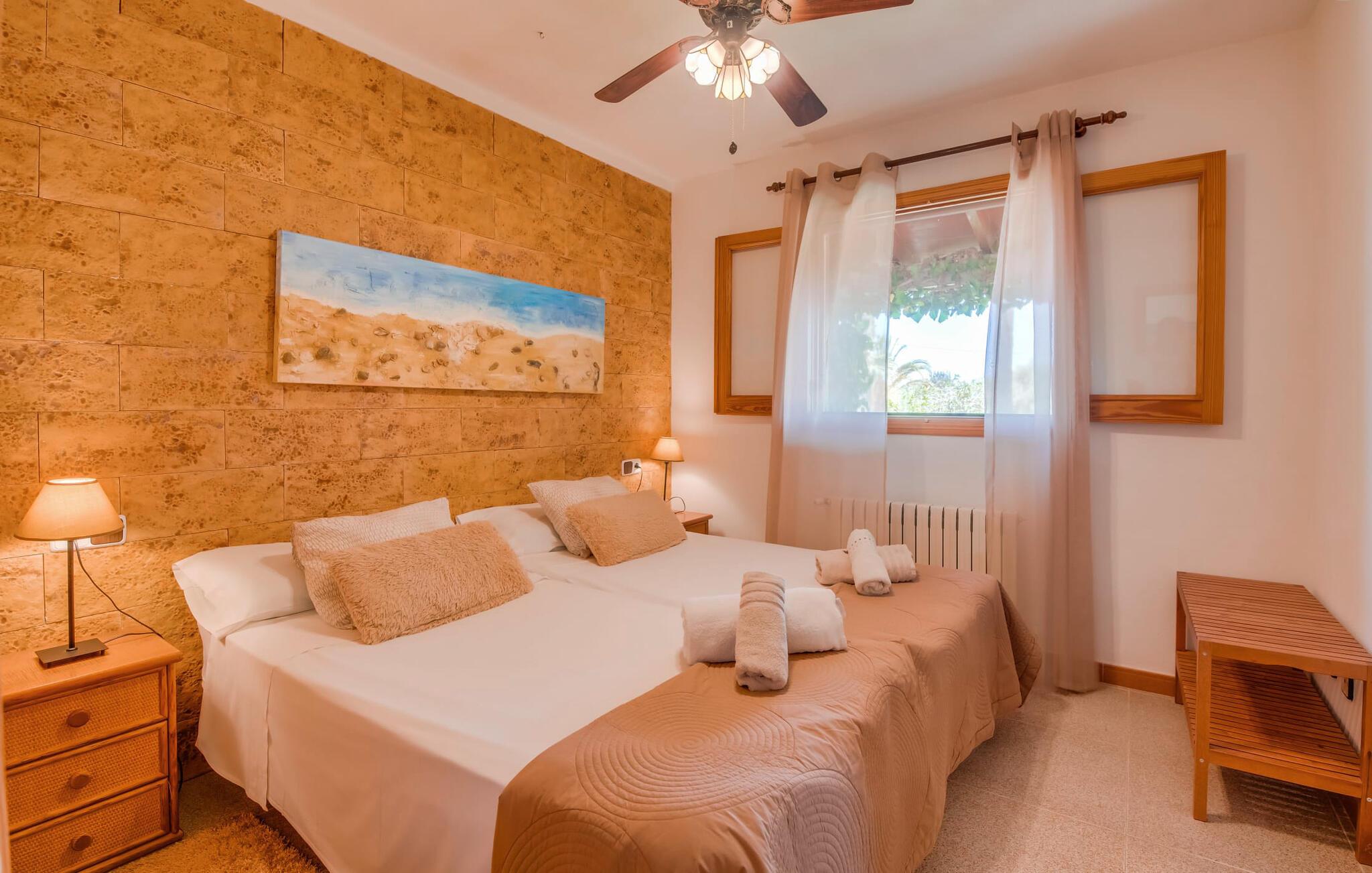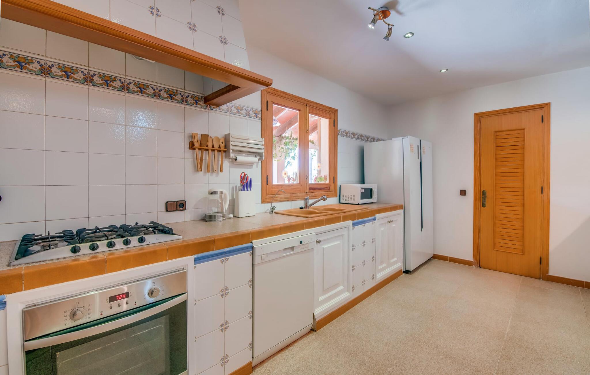 Ydersiden af villaen "Ca Na Bisquerra" er malet med glat puds i en blød abrikos tone, har natursten fodpaneler og charmerende træskodder. Det blev bygget for blot et par år siden af sine nuværende ejere og er smukt indrettet både inde og ude. På trods af sin "ungdom" er villaen designet i en traditionel mallorcansk stil, som er ekstrem varm og hyggelig, og som i bund og grund er det ideelle sted for en familie eller en gruppe venner, der ønsker at holde ferie sammen. Den afsondrede villa er omgivet af smukt anlagte haver med masser af palmer, så I kan nyde de landlige omgivelser, som om det var jeres egen private 'ø', selvom der er andre villaer i området. En lille asfalteret gangsti fører fra huset gennem haven til det smukke poolområde. Poolen er dekoreret med bugtende mosaikfliser og er omgivet af en rummelig græsplæne med otte liggestole til afslapning. Om nødvendigt er der også tre parasoller til rådighed for at beskytte jer mod den varme middagssol. Lidt væk fra poolen, men også midt i den anlagte have, finder I det fuldt udstyrede, overdækkede udekøkken, som indeholder en åben pejsgrill og et langt spisebord; Dette er vores personlige favorit ved denne meget imponerende villa. Udover grillen har køkkenet også et komfur med gaskomfur, masser af skabe til opbevaring af udendørs redskaber og et stort køleskab til kølige drikkevarer. Denne separate struktur kan godt beskyttes mod sol og vind med lidt mere end et par tynde dekorative gardiner, som ikke kun ser meget slående ud, men også er utrolig praktisk. En herligt indbydende overdækket terrasse strækker sig langs husets forside med masser af forskellige siddemuligheder, enten ved et af bordene eller på havemøbler med muntre orange hynder - alt sammen i smart polyrattan og perfekt til afslapning og afslapning. Det, der er særligt imponerende ved indretningen, er den tilbagelænede, tilbagelænede atmosfære, som muliggøres af den store stue/spisestue i åbent plan i stueetagen med en trappe, der fører op til det åbne galleri og værelser på det øverste. etage. I stueetagen er der et komfortabelt sofasæt foran en åben pejs, hvor I kan tilbringe en afslappende aften foran fjernsynet. Lige ved siden af er der et stort spisebord, der giver mere end nok plads til alle, der rejser med jer. Køkkenområdet er visuelt adskilt fra resten af rummet af en lang bordplade med håndmalede fliser og et kraftigt trægulvbræt. Selv når I er på ferie, kan I nyde det fulde udvalg af faciliteter - inklusive en mikrobølgeovn, elkedel, kaffemaskine, gaskomfur og endda en opvaskemaskine - alle de faciliteter, I ønsker til den selvforsynende ferie, I har besluttet jer for. I stueetagen er der også to soveværelser og et komfortabelt badeværelse, som I kan dele. To yderligere soveværelser og to stilfulde badeværelser er placeret ovenpå bag det åbne galleriområde. De hyggelige værelser har synlige trælofter og masser af opbevaringsplads til det tøj, I medbringer eller tager med under jeres ophold. Alle badeværelser er behageligt indrettede i en moderne stil; To af dem har et badeværelse med brusearmatur og det tredje har en specialfremstillet indbygget bruser. På den gæstfri Villa Ca Na Bisquerra er alt praktisk og ukompliceret, præcis som I ønsker jeres ferie skal være, og denne beliggenhed byder på den ideelle stemning til sådan en oplevelse. En anden fordel ved villaen er dens imponerende beliggenhed - stille, men kun 150 m fra landevejen, der forbinder Can Picafort og Santa Margalida. Det betyder, at denne beliggenhed byder på både gode transportforbindelser og et stort potentiale for rekreation og afslapning. Der er kun 7 minutter i bil til Can Picafort og den nærmeste strand. De forskelligartede strande langs Alcúdia-bugten, herunder Platja de Muro, Can Picafort og de mere rolige strande mellem byerne, er hurtige og nemme at nå, hvis en dukkert i poolen ikke er nok, og I har lyst til en dejlig dag på stranden. I får sikkert lyst til at tage til Santa Margalida, hvis I er interesseret i at se en af øens smukkeste landsbyer og opleve det "rigtige" Mallorcas autentiske karakter. Og nu ønsker vi hos Fincallorca jer en skøn ferie i den stærkt anbefalede villa “Ca Na Bisquerra” – ikke mindst på grund af den utroligt gode pris, vi kan tilbyde denne lejevilla til. Den traditionelle villa "Ca Na Bisquerra" ligger i det smukke landskab mellem de charmerende små byer Santa Margalida og Can Picafort. I kan tage til begge byer for at købe dagligvarer og andre daglige fornødenheder, og hver by er vært for et landmandsmarked på forskellige dage i ugen. Alcúdia-bugten med flere sammenhængende kilometer sandstrande ligger kun 5 km væk i bil.
