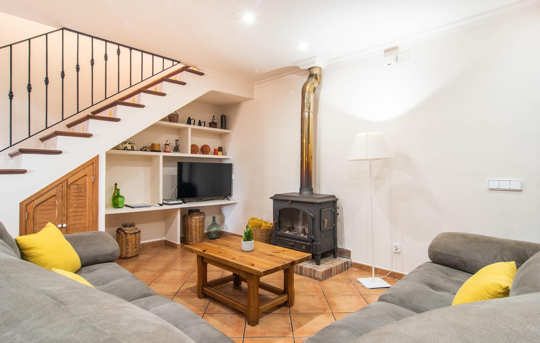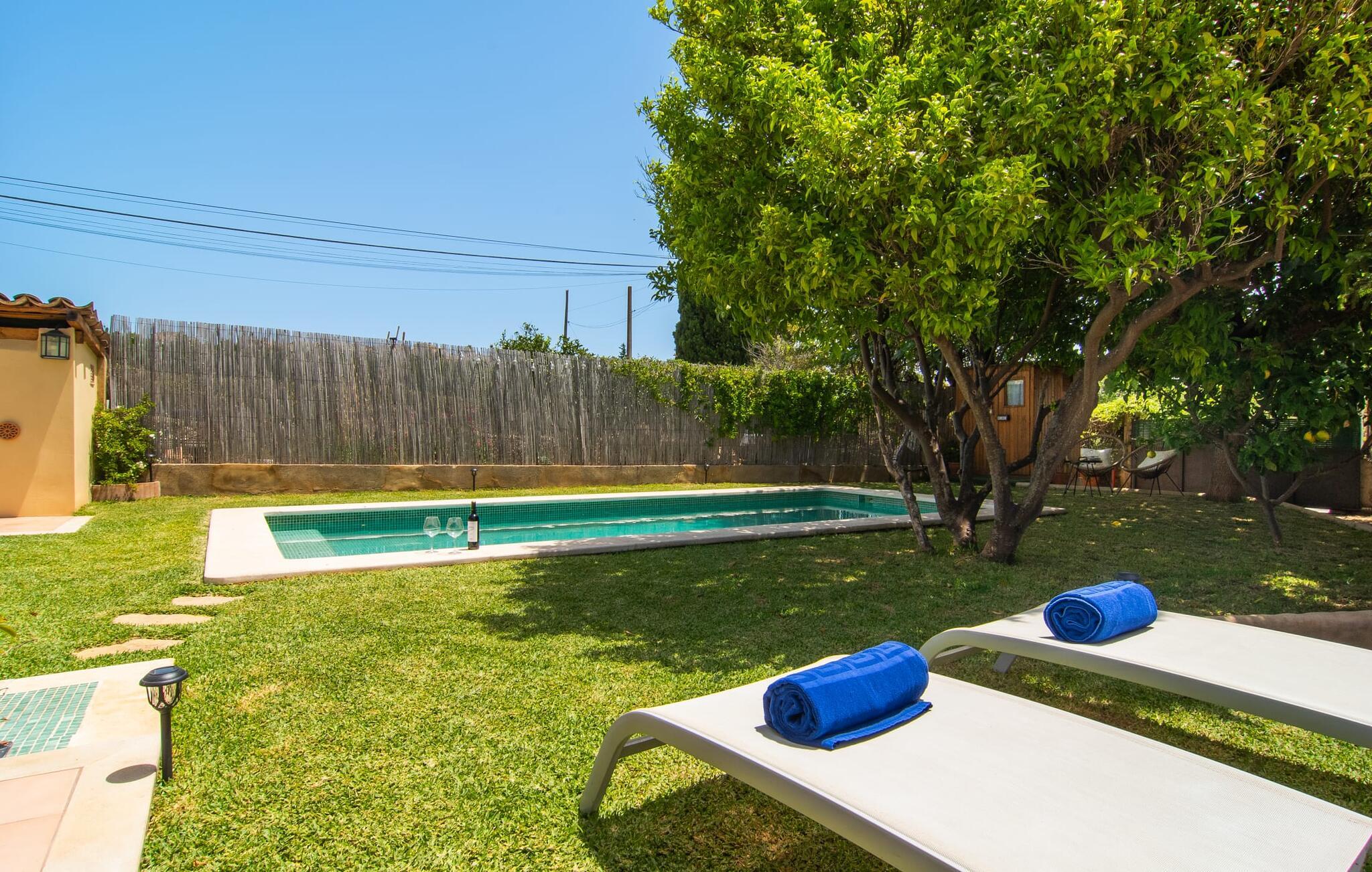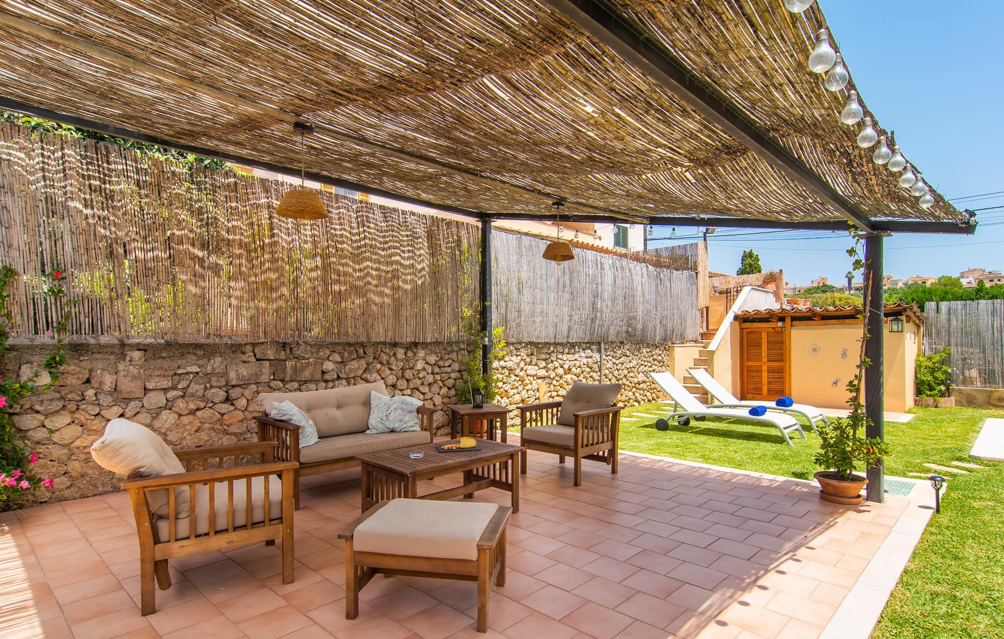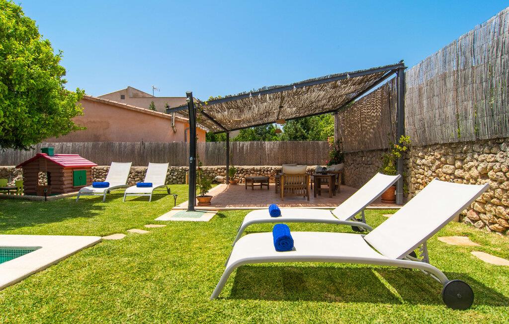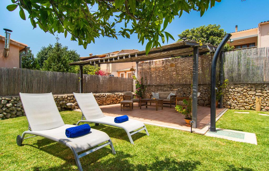 At holde ferie i en by og nyde et vidunderligt privat udendørs paradis på samme tid - dette ønske er ikke så let at opfylde, men det går i opfyldelse med "Ca Na Campins" rækkehuset! Området, kærligt indhegnet med sten og sivmåtter, ligner en lille oase med sin stedsegrønne græsplæne, middelhavstræer og den vidunderlige pool. Grus- og terrassearealer indbyder til at sidde udendørs eller i den luftige skygge. Der er komfortable liggestole og en smuk lounge til jeres rådighed, hvorfra I har en fantastisk udsigt over haven og børnene, der leger i den. Det lille legehus vil helt sikkert bringe glæde til de små på ferie. I kan også nyde en god udsigt over det omkringliggende område fra den hævede, delvist overdækkede terrasse lige ved siden af huset. Her har I behageligt kort inde og en dejlig siddeplads til fællesspisning udendørs. Det er også et godt sted til aftengrill. En varmtvandsudendørsbruser og et udendørstoilet runder i øvrigt komforten af i haven. Husets indretning er hyggeligt og værdigt. Med varme, pejs, aircondition og ventilatorer er temperaturen ideel hele året rundt, og det er skønt at slappe af, især på den meget komfortable sofa, som har perfekt udsigt til tv og brændeovn. I kan tilberede små og store måltider sammen i det store, veludstyrede køkken, der endda har plads til et bord. Praktisk taget er der også udgang til terrassen herfra. På dette niveau er der desuden et hyggeligt soveværelse med dobbeltseng og et badeværelse med bruser. Fra stuen fører en trappe til øverste etage, som rummer et andet, rummeligt soveværelse uden dør - med to enkeltsenge - og et badeværelse med brusebad. Heroppe er der også et omklædningsrum med siddepladser - for maksimalt privatliv, som I kan nyde i fulde drag i dette feriehus på Mallorca. I den lille landsby Campanet på Mallorca tilbyder dette charmerende rækkehus fire feriegæster et indbydende hjem med attraktiv infrastruktur. Gaden foran huset byder på perfekte forbindelser, og I kan gøre mange ting til fods, herunder jeres daglige indkøb. De smukke strande i den lange bugt Alcúdia ligger omkring 20 km væk. Sa Pobla, ca. 9 km væk, inviterer jer til at gå en tur gennem den gamle bydel og besøge de smukke caféer, restauranter og butikker.