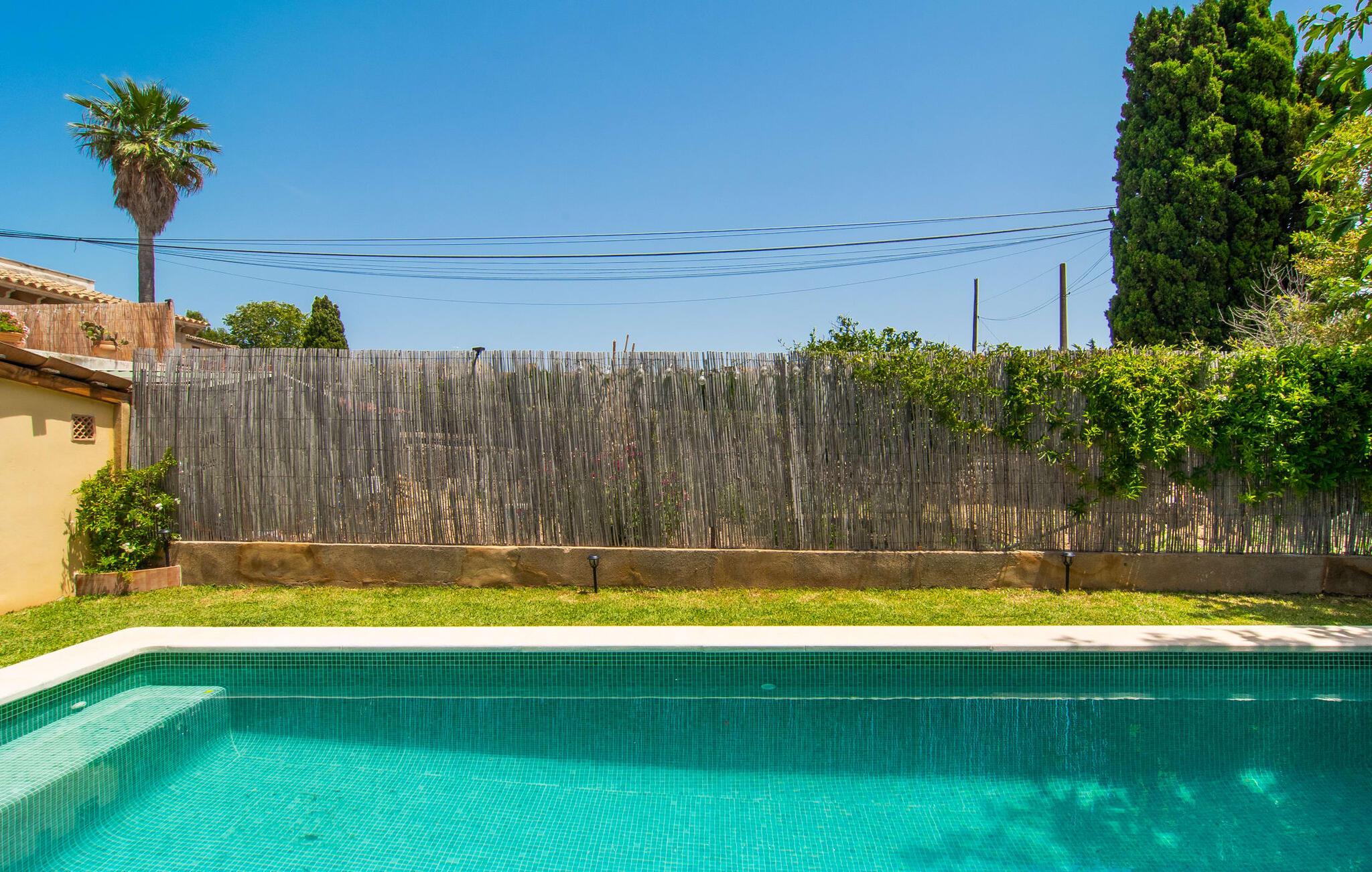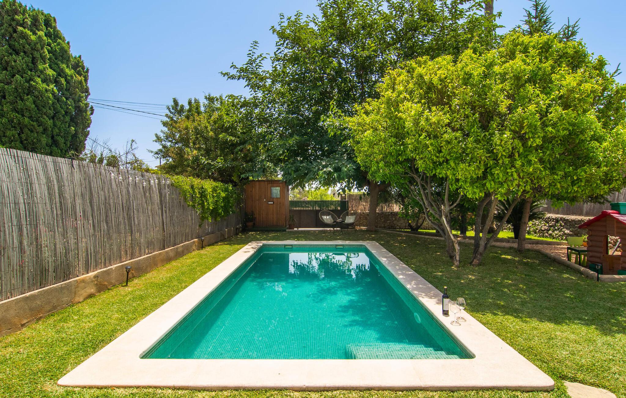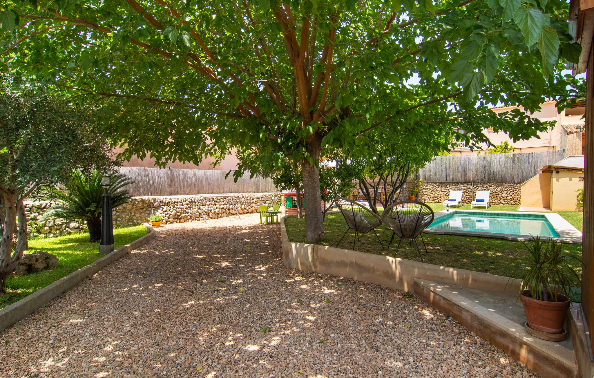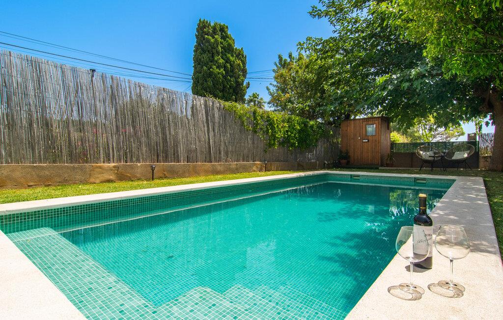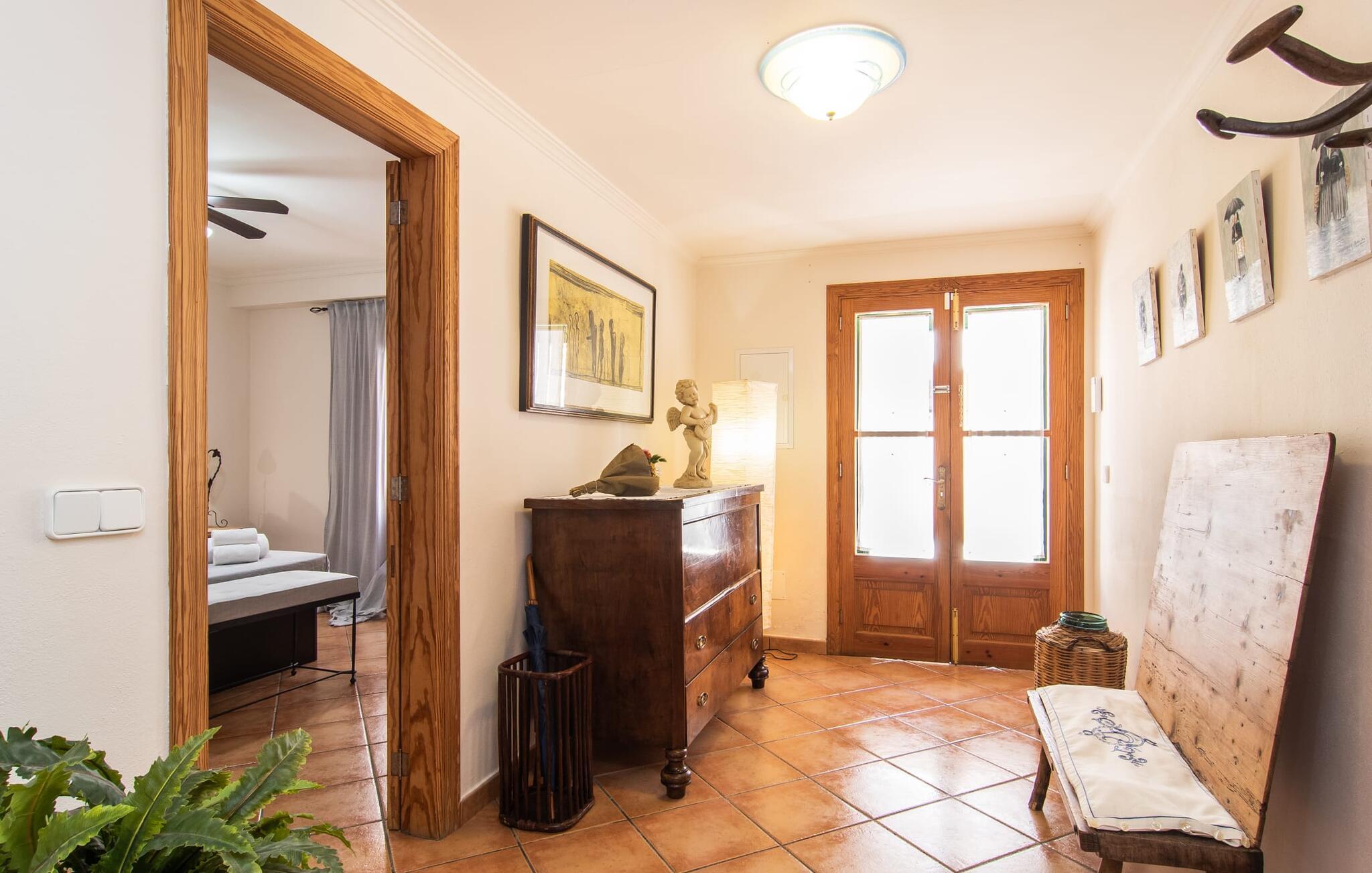At holde ferie i en by og nyde et vidunderligt privat udendørs paradis på samme tid - dette ønske er ikke så let at opfylde, men det går i opfyldelse med "Ca Na Campins" rækkehuset! Området, kærligt indhegnet med sten og sivmåtter, ligner en lille oase med sin stedsegrønne græsplæne, middelhavstræer og den vidunderlige pool. Grus- og terrassearealer indbyder til at sidde udendørs eller i den luftige skygge. Der er komfortable liggestole og en smuk lounge til jeres rådighed, hvorfra I har en fantastisk udsigt over haven og børnene, der leger i den. Det lille legehus vil helt sikkert bringe glæde til de små på ferie. I kan også nyde en god udsigt over det omkringliggende område fra den hævede, delvist overdækkede terrasse lige ved siden af huset. Her har I behageligt kort inde og en dejlig siddeplads til fællesspisning udendørs. Det er også et godt sted til aftengrill. En varmtvandsudendørsbruser og et udendørstoilet runder i øvrigt komforten af i haven. Husets indretning er hyggeligt og værdigt. Med varme, pejs, aircondition og ventilatorer er temperaturen ideel hele året rundt, og det er skønt at slappe af, især på den meget komfortable sofa, som har perfekt udsigt til tv og brændeovn. I kan tilberede små og store måltider sammen i det store, veludstyrede køkken, der endda har plads til et bord. Praktisk taget er der også udgang til terrassen herfra. På dette niveau er der desuden et hyggeligt soveværelse med dobbeltseng og et badeværelse med bruser. Fra stuen fører en trappe til øverste etage, som rummer et andet, rummeligt soveværelse uden dør - med to enkeltsenge - og et badeværelse med brusebad. Heroppe er der også et omklædningsrum med siddepladser - for maksimalt privatliv, som I kan nyde i fulde drag i dette feriehus på Mallorca. I den lille landsby Campanet på Mallorca tilbyder dette charmerende rækkehus fire feriegæster et indbydende hjem med attraktiv infrastruktur. Gaden foran huset byder på perfekte forbindelser, og I kan gøre mange ting til fods, herunder jeres daglige indkøb. De smukke strande i den lange bugt Alcúdia ligger omkring 20 km væk. Sa Pobla, ca. 9 km væk, inviterer jer til at gå en tur gennem den gamle bydel og besøge de smukke caféer, restauranter og butikker.
