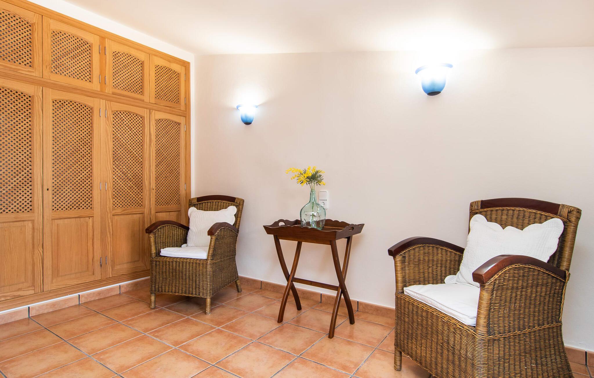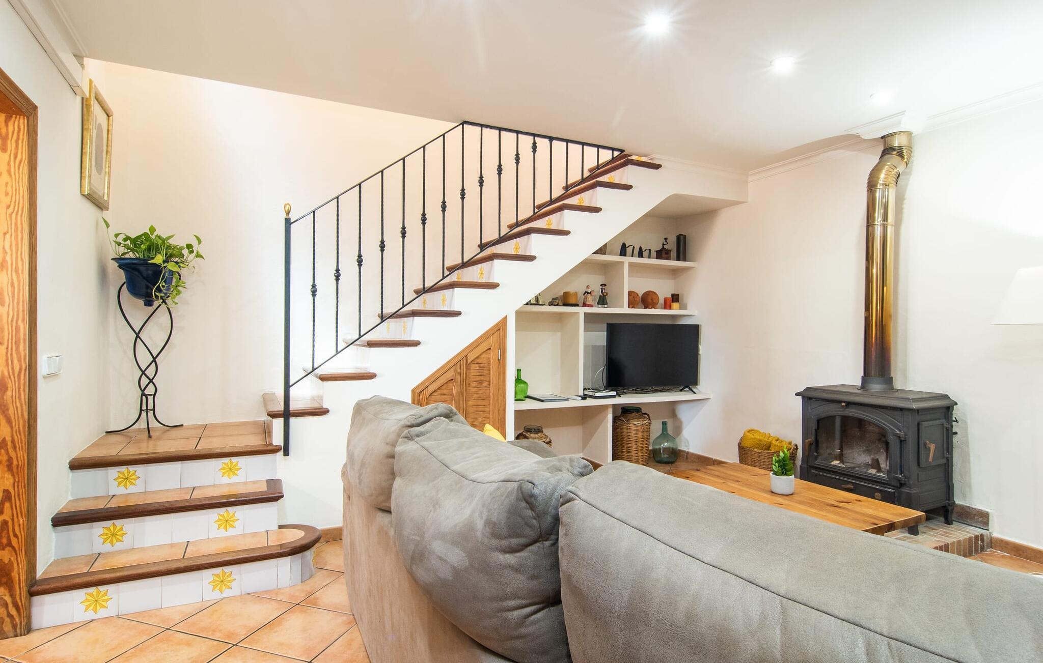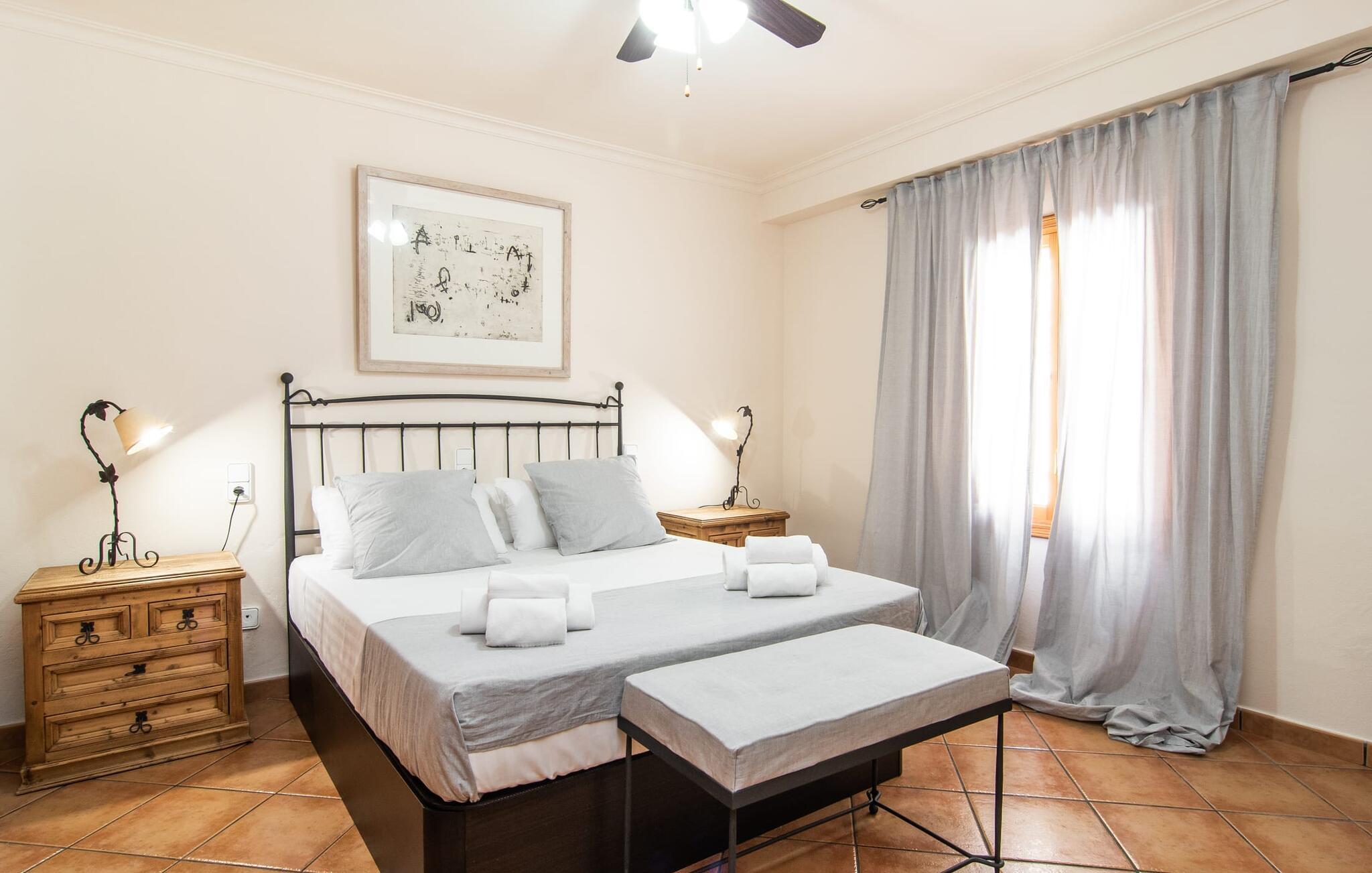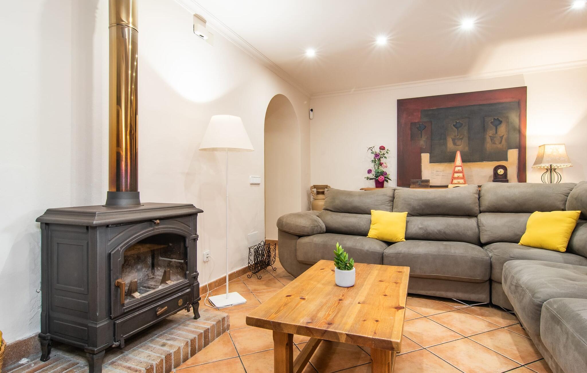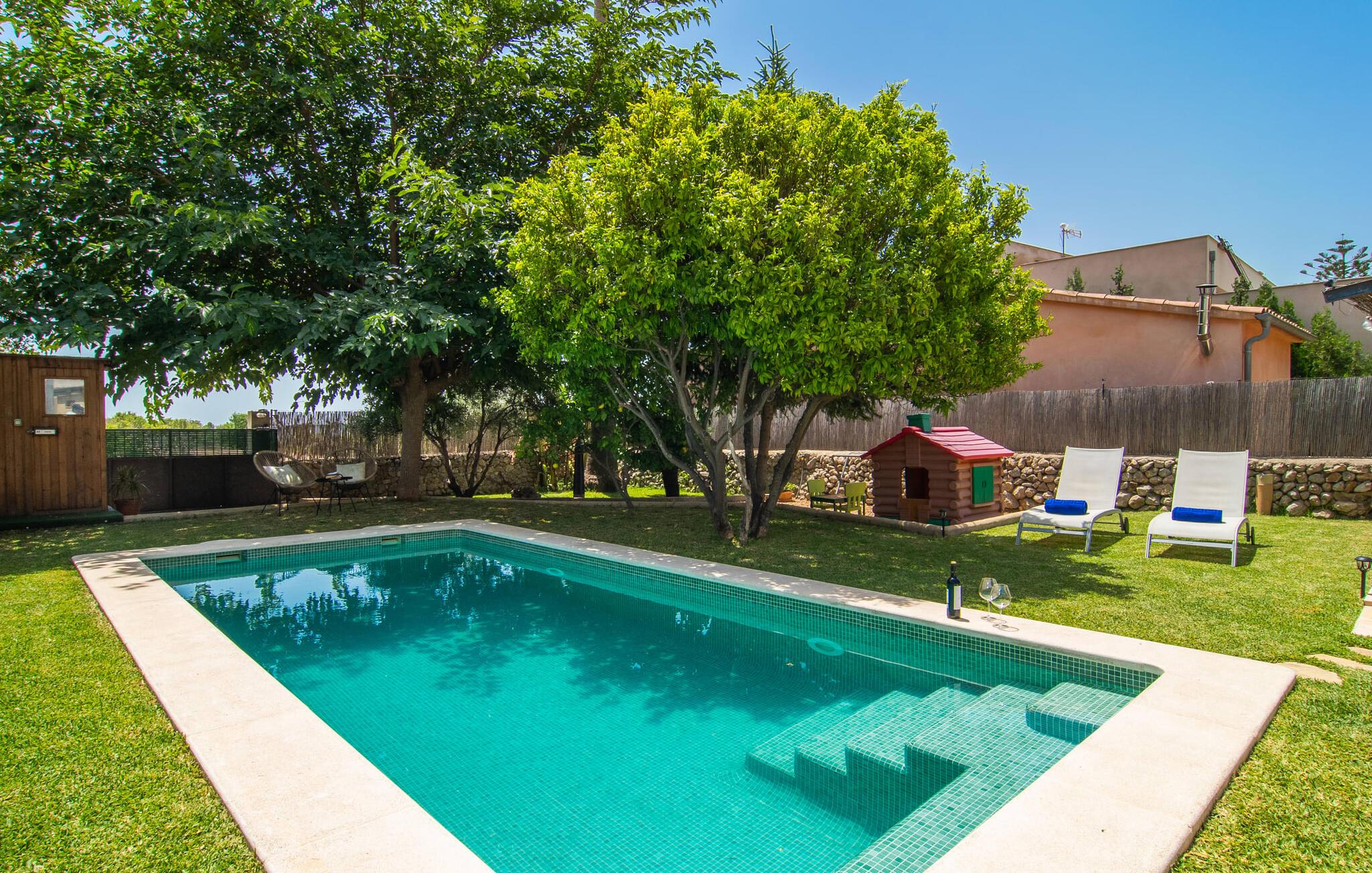 At holde ferie i en by og nyde et vidunderligt privat udendørs paradis på samme tid - dette ønske er ikke så let at opfylde, men det går i opfyldelse med "Ca Na Campins" rækkehuset! Området, kærligt indhegnet med sten og sivmåtter, ligner en lille oase med sin stedsegrønne græsplæne, middelhavstræer og den vidunderlige pool. Grus- og terrassearealer indbyder til at sidde udendørs eller i den luftige skygge. Der er komfortable liggestole og en smuk lounge til jeres rådighed, hvorfra I har en fantastisk udsigt over haven og børnene, der leger i den. Det lille legehus vil helt sikkert bringe glæde til de små på ferie. I kan også nyde en god udsigt over det omkringliggende område fra den hævede, delvist overdækkede terrasse lige ved siden af huset. Her har I behageligt kort inde og en dejlig siddeplads til fællesspisning udendørs. Det er også et godt sted til aftengrill. En varmtvandsudendørsbruser og et udendørstoilet runder i øvrigt komforten af i haven. Husets indretning er hyggeligt og værdigt. Med varme, pejs, aircondition og ventilatorer er temperaturen ideel hele året rundt, og det er skønt at slappe af, især på den meget komfortable sofa, som har perfekt udsigt til tv og brændeovn. I kan tilberede små og store måltider sammen i det store, veludstyrede køkken, der endda har plads til et bord. Praktisk taget er der også udgang til terrassen herfra. På dette niveau er der desuden et hyggeligt soveværelse med dobbeltseng og et badeværelse med bruser. Fra stuen fører en trappe til øverste etage, som rummer et andet, rummeligt soveværelse uden dør - med to enkeltsenge - og et badeværelse med brusebad. Heroppe er der også et omklædningsrum med siddepladser - for maksimalt privatliv, som I kan nyde i fulde drag i dette feriehus på Mallorca. I den lille landsby Campanet på Mallorca tilbyder dette charmerende rækkehus fire feriegæster et indbydende hjem med attraktiv infrastruktur. Gaden foran huset byder på perfekte forbindelser, og I kan gøre mange ting til fods, herunder jeres daglige indkøb. De smukke strande i den lange bugt Alcúdia ligger omkring 20 km væk. Sa Pobla, ca. 9 km væk, inviterer jer til at gå en tur gennem den gamle bydel og besøge de smukke caféer, restauranter og butikker.