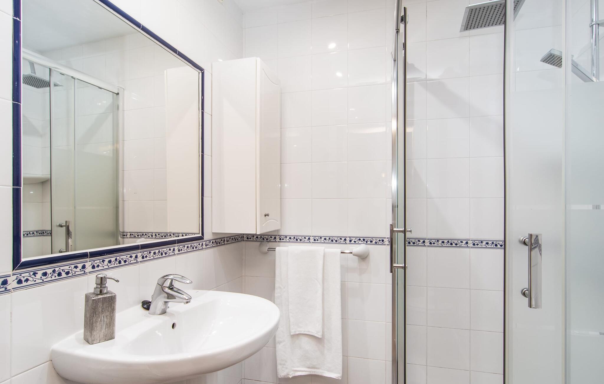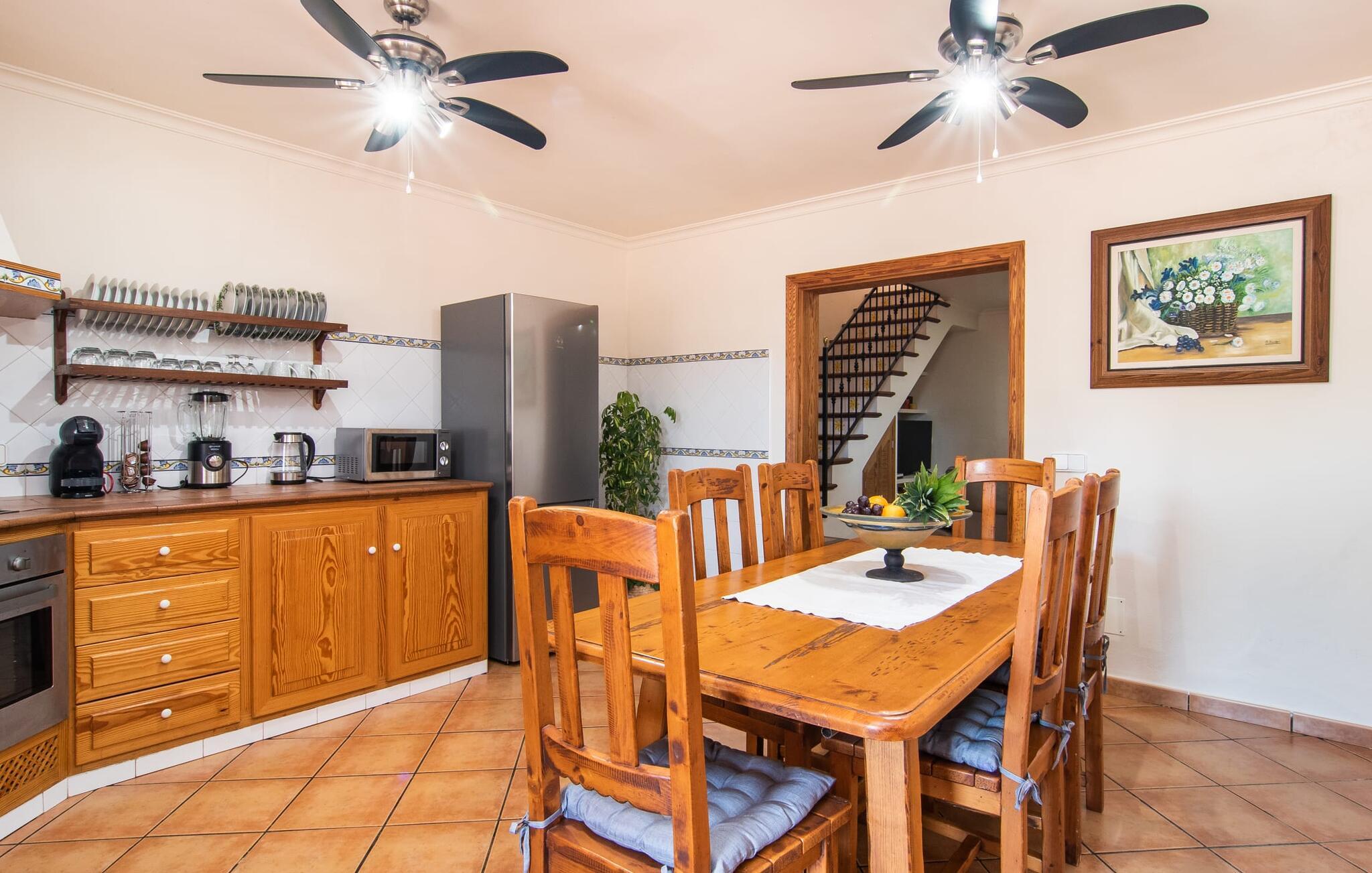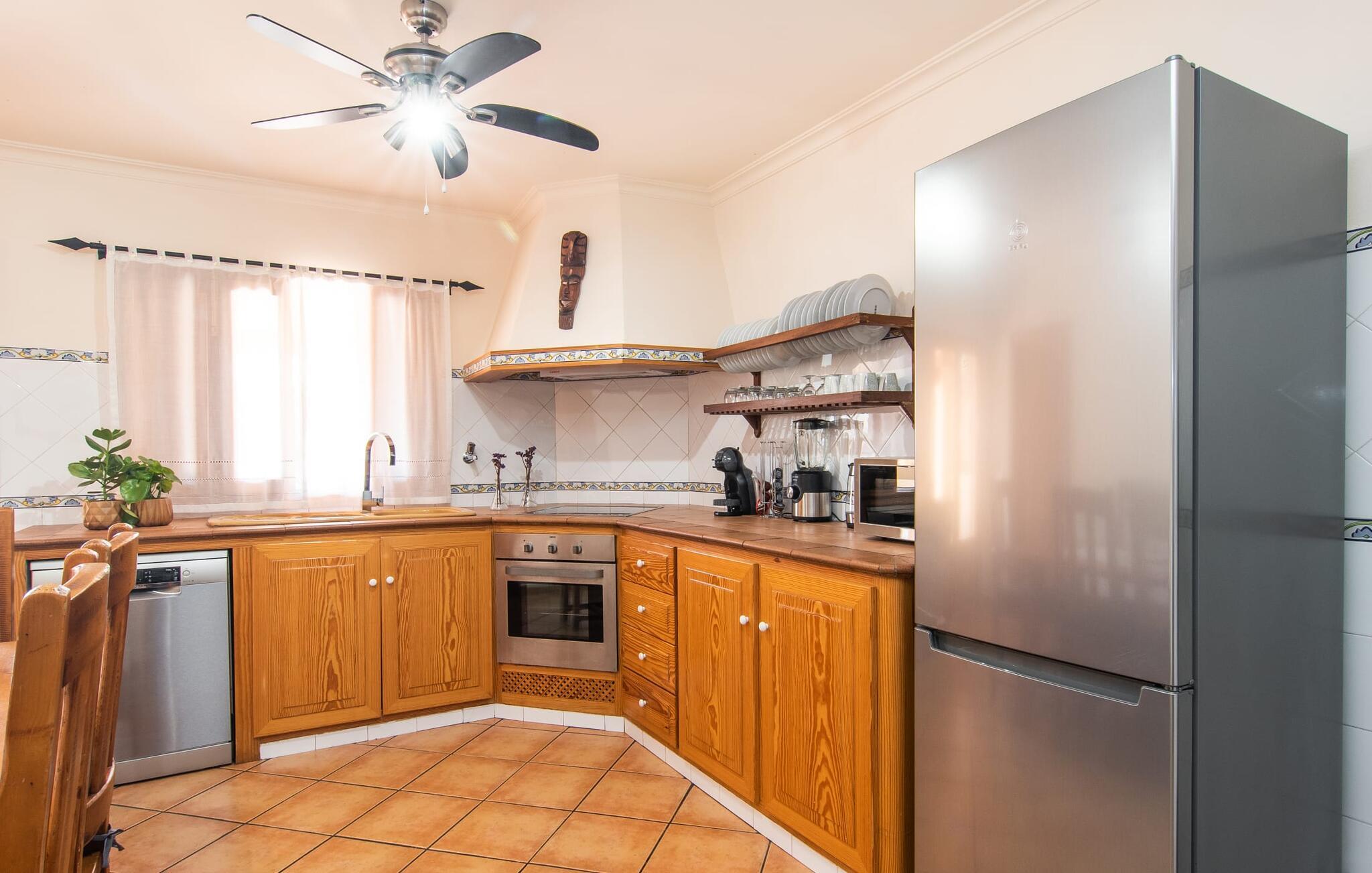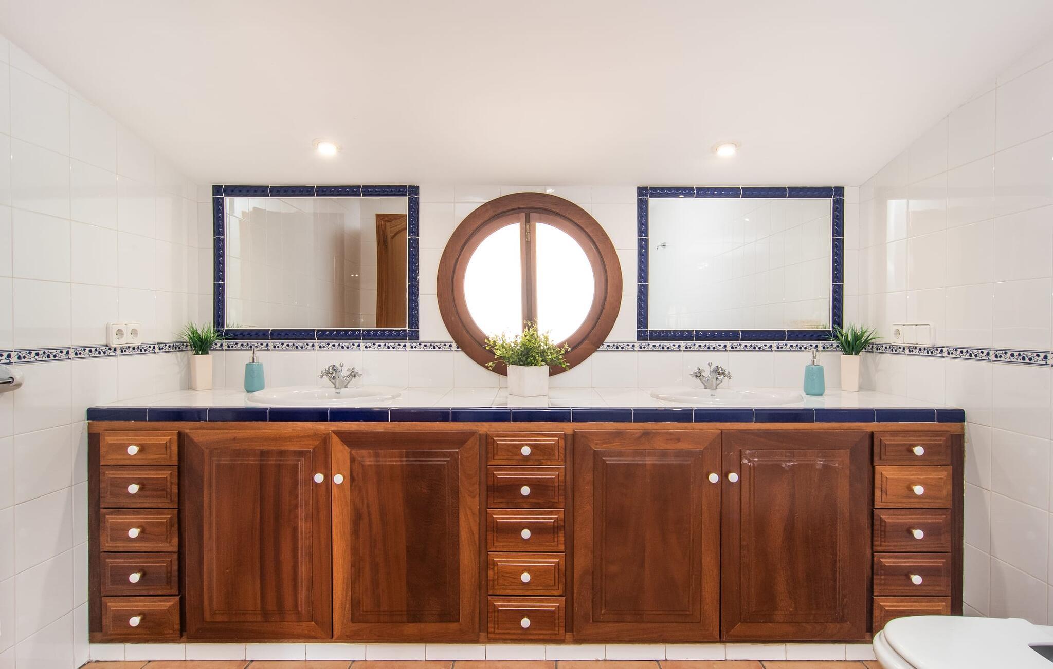 At holde ferie i en by og nyde et vidunderligt privat udendørs paradis på samme tid - dette ønske er ikke så let at opfylde, men det går i opfyldelse med "Ca Na Campins" rækkehuset! Området, kærligt indhegnet med sten og sivmåtter, ligner en lille oase med sin stedsegrønne græsplæne, middelhavstræer og den vidunderlige pool. Grus- og terrassearealer indbyder til at sidde udendørs eller i den luftige skygge. Der er komfortable liggestole og en smuk lounge til jeres rådighed, hvorfra I har en fantastisk udsigt over haven og børnene, der leger i den. Det lille legehus vil helt sikkert bringe glæde til de små på ferie. I kan også nyde en god udsigt over det omkringliggende område fra den hævede, delvist overdækkede terrasse lige ved siden af huset. Her har I behageligt kort inde og en dejlig siddeplads til fællesspisning udendørs. Det er også et godt sted til aftengrill. En varmtvandsudendørsbruser og et udendørstoilet runder i øvrigt komforten af i haven. Husets indretning er hyggeligt og værdigt. Med varme, pejs, aircondition og ventilatorer er temperaturen ideel hele året rundt, og det er skønt at slappe af, især på den meget komfortable sofa, som har perfekt udsigt til tv og brændeovn. I kan tilberede små og store måltider sammen i det store, veludstyrede køkken, der endda har plads til et bord. Praktisk taget er der også udgang til terrassen herfra. På dette niveau er der desuden et hyggeligt soveværelse med dobbeltseng og et badeværelse med bruser. Fra stuen fører en trappe til øverste etage, som rummer et andet, rummeligt soveværelse uden dør - med to enkeltsenge - og et badeværelse med brusebad. Heroppe er der også et omklædningsrum med siddepladser - for maksimalt privatliv, som I kan nyde i fulde drag i dette feriehus på Mallorca. I den lille landsby Campanet på Mallorca tilbyder dette charmerende rækkehus fire feriegæster et indbydende hjem med attraktiv infrastruktur. Gaden foran huset byder på perfekte forbindelser, og I kan gøre mange ting til fods, herunder jeres daglige indkøb. De smukke strande i den lange bugt Alcúdia ligger omkring 20 km væk. Sa Pobla, ca. 9 km væk, inviterer jer til at gå en tur gennem den gamle bydel og besøge de smukke caféer, restauranter og butikker.