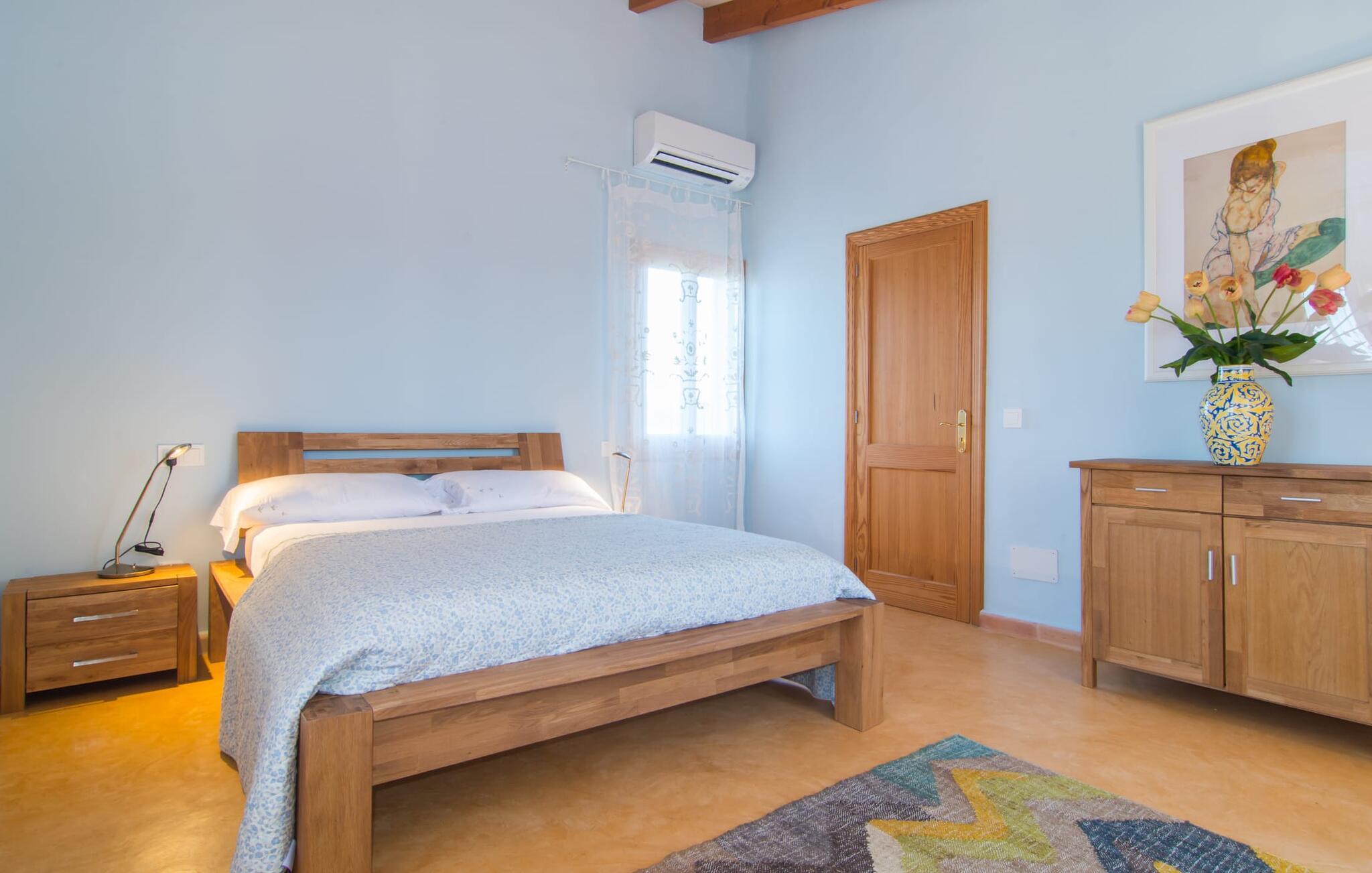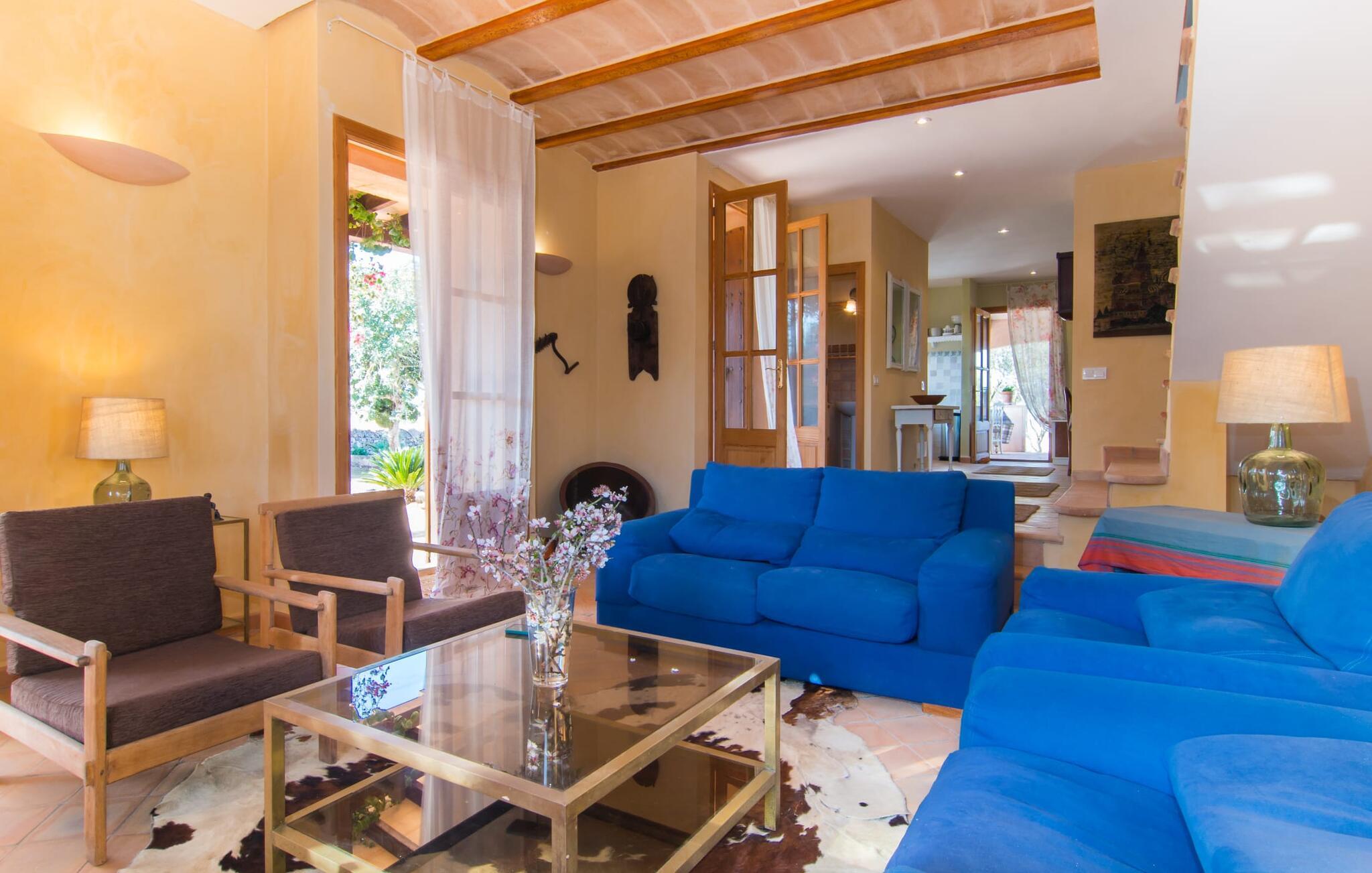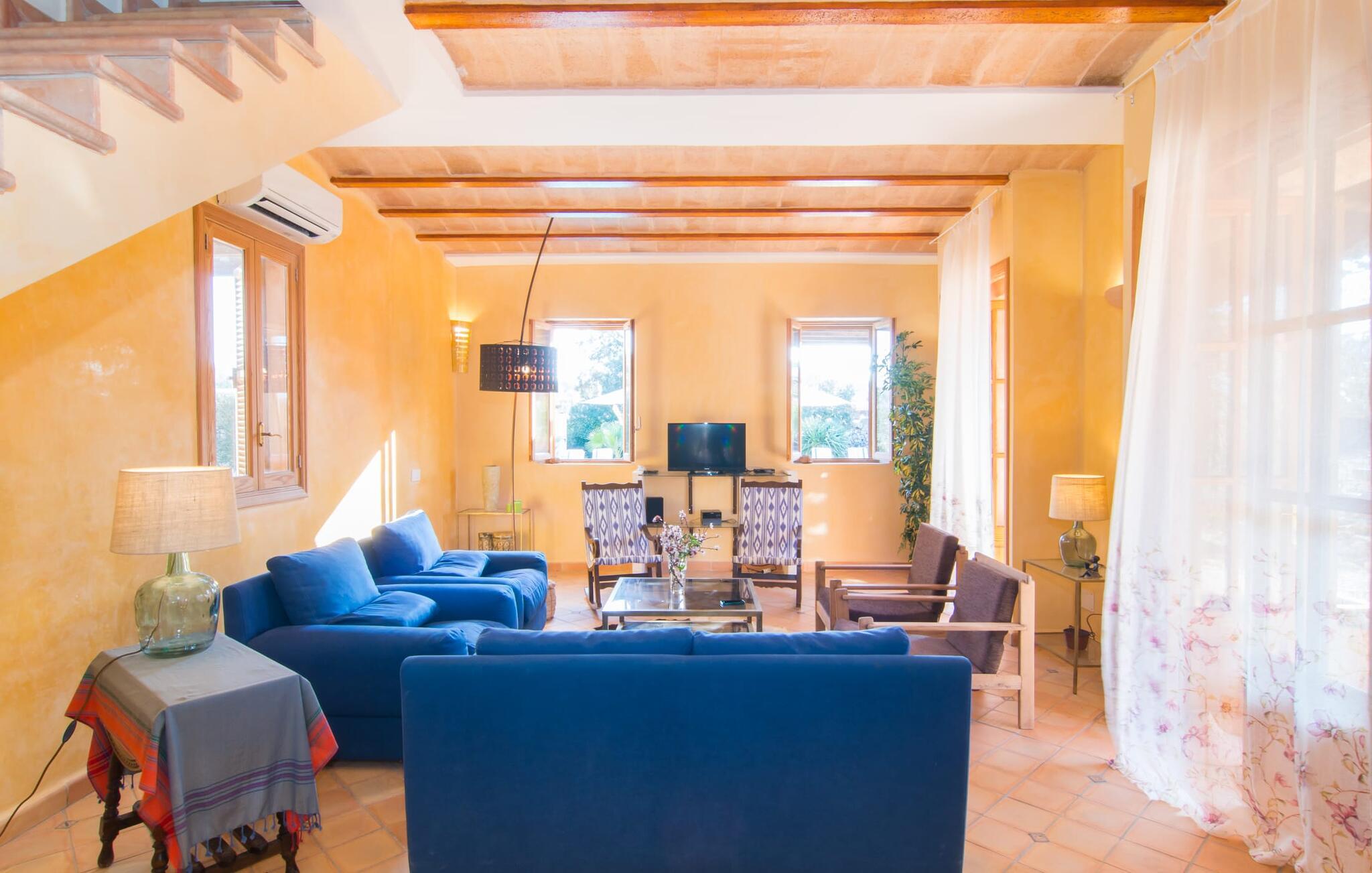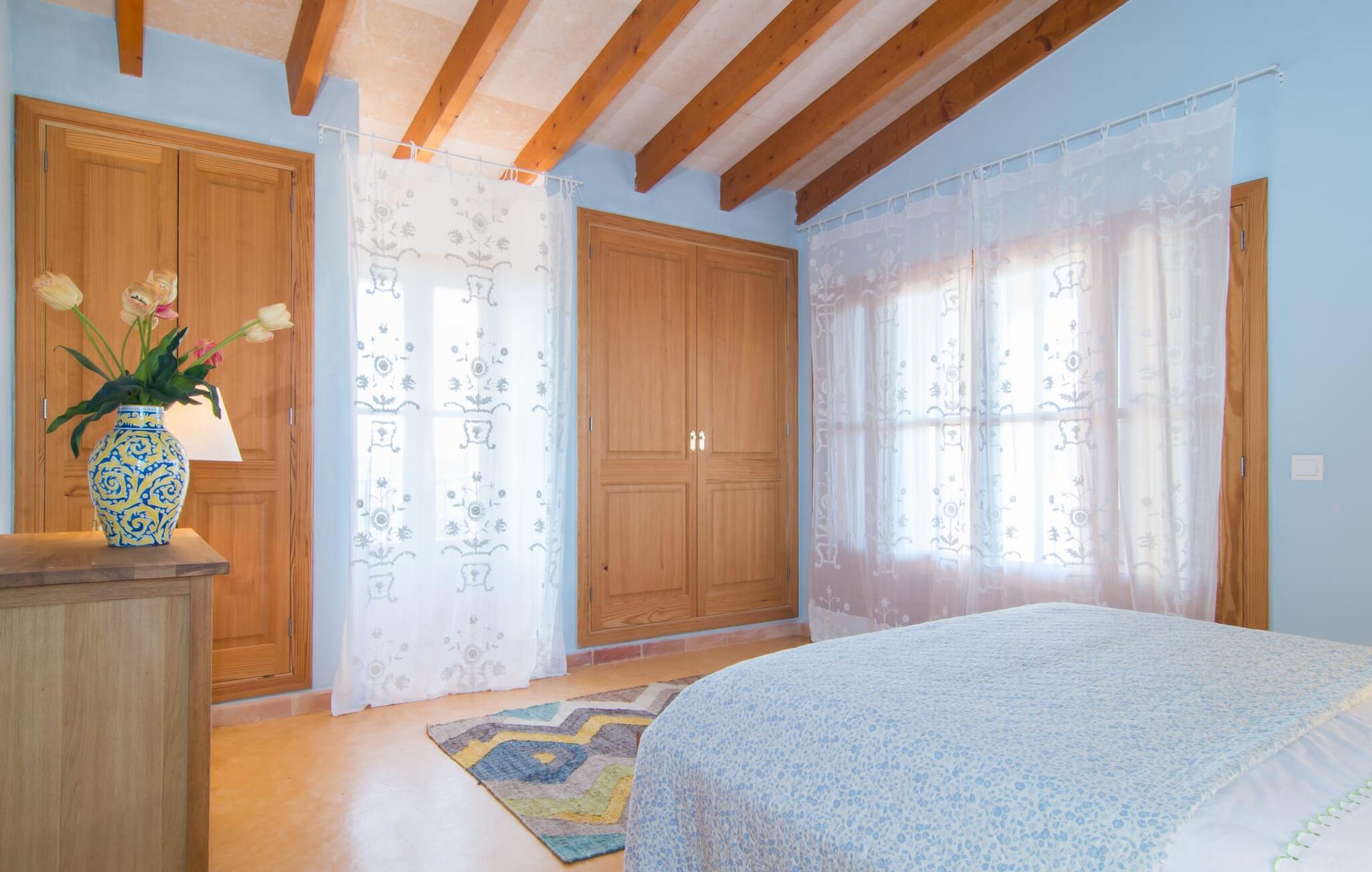 Man kunne næsten tro, at denne safranfarvede middelhavsvilla med sine oliven-, figen- og johannesbrødtræer, sine palmer, cypresser og kaktusser opstod fra selve Campos' frugtbare jord. Nybygget i 2015, lige så ærlig, ukompliceret og solmoden som en god vin, lidt mousserende steder og fuld af karakter, selv den første smag giver lyst til mere. En unik halvmåneformet pool omkring den overdækkede terrasse byder på alt det vand, I har brug for til jeres daglige svømmetur - et rigtigt blikfang! Her kan I afslutte dagen komfortabelt - med en sen morgenmad, et blad eller et glas vin - mens børnene plasker trygt rundt omkring jer. Man kunne næsten tale om en ferie i swimmingpoolen i stedet for ved poolen, og man kunne blive fristet til at hoppe direkte ud af et af vinduerne i det kølige vand (men lad være med det - det er hensynsløst, og I kommer til skade) . )...men "Ca Na Carmen" sikrer, at I ikke taber hovedet. Som en frugt, der holder, hvad dens ydre skal lover, skuffer indersiden heller ikke: Mallorca, jordnær, solrig og blomstret. En frisk brise synes at blæse gennem huset, og luftige gardiner giver rummet et let strejf. Den rummelige, åbne stue, madlavning og spiseplads omgiver hyggelige lyseblå sofaer, der inviterer jer til at fordybe jer i en filmaften. I kan selvfølgelig også drive ud i drømmenes rige i de behageligt enkle soveværelser med solide træsenge; Soveværelserne er indrettet med et udvalg af mørkere eller lysere møbler, og et af de øverste soveværelser har direkte adgang til en overdækket altan med vidunderlig udsigt over træerne til bjergene udenfor. Hvis I sover her, kan I lade døren stå åben. Badeværelserne - et i stueetagen og et på øverste etage - er hver delt af to soveværelser. Det eneste, der er tilbage at nævne, er det moderne, veludstyrede køkken med sin egen plads i solen, på hvis vægge friske, sprøde grøntsager fra det ugentlige marked i Campos hænger appetitligt: et paradis for vegetarer og rawfood-fans - hvis det var tilfældet. Det ville ikke være en fantastisk murstensgrill lige foran døren, der bare råber på at blive brugt. Det ville være en skam ikke at... ¡Buen provencho! I et landskab domineret af køer og marker er det nemt at få appetit op. Ud over dets middelalderlige centrum tilbyder den venlige by Campos nogle kulinariske insidertips, herunder den charmerende bistro Moda Café og Pastisseria Pomar, der er kendt over hele øen for sine mandelkager. Men begynder jeres vandrefødder at klø i “Ca Na Carmen” om sommeren, anbefaler vi en tur til Mallorcas sydspids. I Colònia de Sant Jordi inviterer restauranter og caféer, der ligger direkte på havnen, til at nyde havudsigten. Tag en 30-minutters bådtur til Cabrera (bogstaveligt talt "Gedeøen"), opdag det fortryllende lys fra Den Blå Grotte eller køl blot af i det krystalklare vand. Lyder det ikke som himlen på jorden? I en helt rolig, landlig beliggenhed og alligevel kun få kilometer på Ma-19 fra den lille by Campos med butikker og et supermarked, venter middelhavsvillaen "Ca Na Carmen" på gæster, der ønsker at udforske den sydlige del af øen. Santanyi, Ses Salines og Colònia de Sant Jordi på spidsen af øen er endnu ikke oversvømmet af turister og byder på vidunderlige naturlige sandstrande som Es Trenc eller den lille Cala Santanyi samt imponerende kystvandringer.