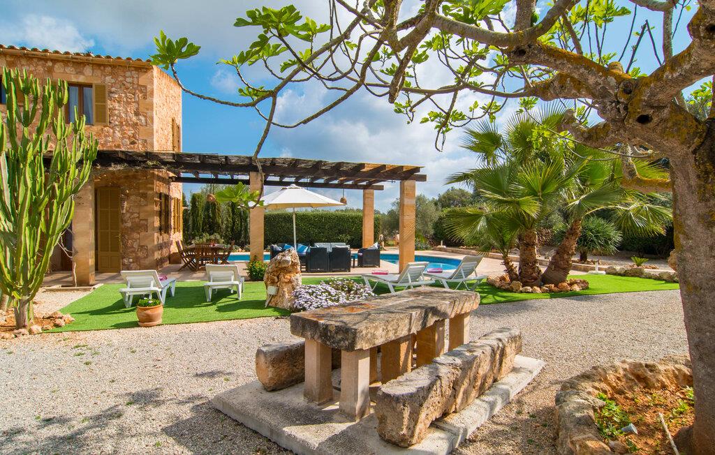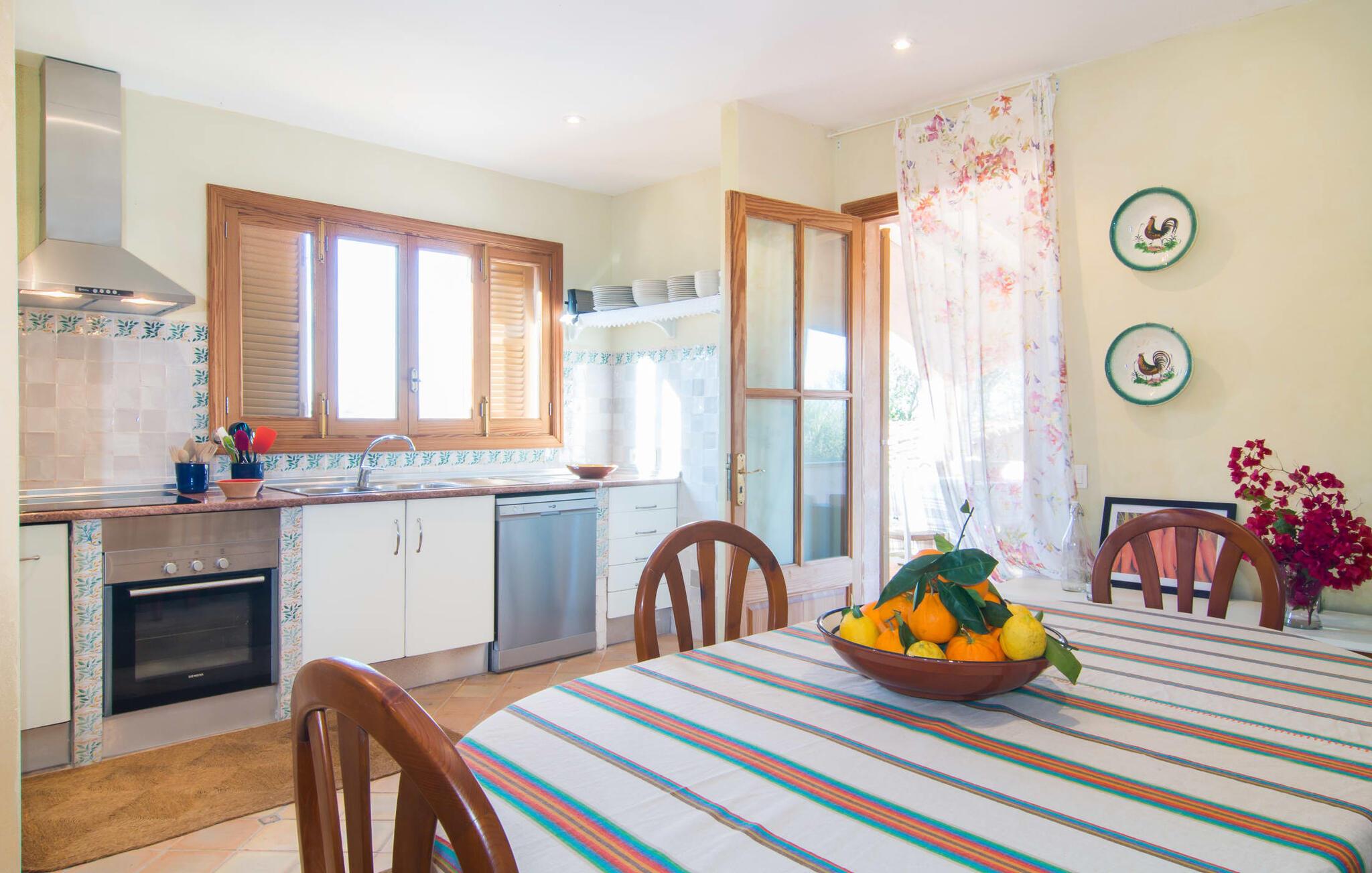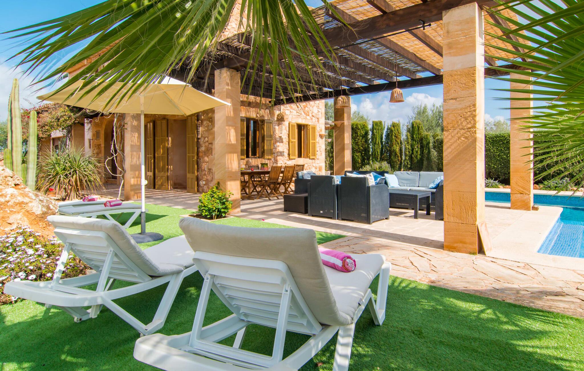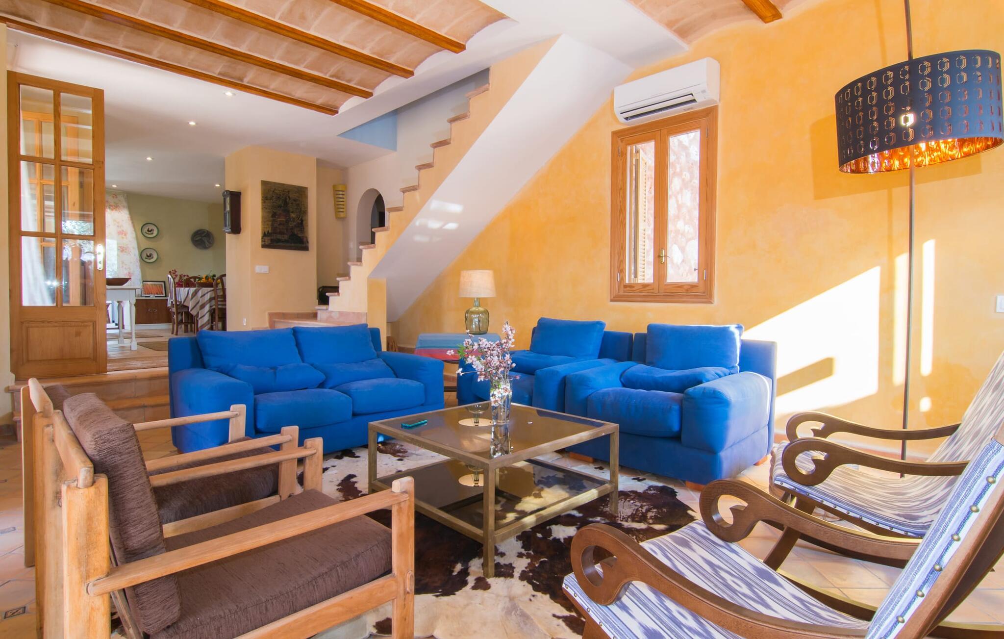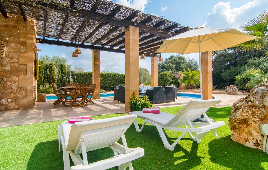 Man kunne næsten tro, at denne safranfarvede middelhavsvilla med sine oliven-, figen- og johannesbrødtræer, sine palmer, cypresser og kaktusser opstod fra selve Campos' frugtbare jord. Nybygget i 2015, lige så ærlig, ukompliceret og solmoden som en god vin, lidt mousserende steder og fuld af karakter, selv den første smag giver lyst til mere. En unik halvmåneformet pool omkring den overdækkede terrasse byder på alt det vand, I har brug for til jeres daglige svømmetur - et rigtigt blikfang! Her kan I afslutte dagen komfortabelt - med en sen morgenmad, et blad eller et glas vin - mens børnene plasker trygt rundt omkring jer. Man kunne næsten tale om en ferie i swimmingpoolen i stedet for ved poolen, og man kunne blive fristet til at hoppe direkte ud af et af vinduerne i det kølige vand (men lad være med det - det er hensynsløst, og I kommer til skade) . )...men "Ca Na Carmen" sikrer, at I ikke taber hovedet. Som en frugt, der holder, hvad dens ydre skal lover, skuffer indersiden heller ikke: Mallorca, jordnær, solrig og blomstret. En frisk brise synes at blæse gennem huset, og luftige gardiner giver rummet et let strejf. Den rummelige, åbne stue, madlavning og spiseplads omgiver hyggelige lyseblå sofaer, der inviterer jer til at fordybe jer i en filmaften. I kan selvfølgelig også drive ud i drømmenes rige i de behageligt enkle soveværelser med solide træsenge; Soveværelserne er indrettet med et udvalg af mørkere eller lysere møbler, og et af de øverste soveværelser har direkte adgang til en overdækket altan med vidunderlig udsigt over træerne til bjergene udenfor. Hvis I sover her, kan I lade døren stå åben. Badeværelserne - et i stueetagen og et på øverste etage - er hver delt af to soveværelser. Det eneste, der er tilbage at nævne, er det moderne, veludstyrede køkken med sin egen plads i solen, på hvis vægge friske, sprøde grøntsager fra det ugentlige marked i Campos hænger appetitligt: et paradis for vegetarer og rawfood-fans - hvis det var tilfældet. Det ville ikke være en fantastisk murstensgrill lige foran døren, der bare råber på at blive brugt. Det ville være en skam ikke at... ¡Buen provencho! I et landskab domineret af køer og marker er det nemt at få appetit op. Ud over dets middelalderlige centrum tilbyder den venlige by Campos nogle kulinariske insidertips, herunder den charmerende bistro Moda Café og Pastisseria Pomar, der er kendt over hele øen for sine mandelkager. Men begynder jeres vandrefødder at klø i “Ca Na Carmen” om sommeren, anbefaler vi en tur til Mallorcas sydspids. I Colònia de Sant Jordi inviterer restauranter og caféer, der ligger direkte på havnen, til at nyde havudsigten. Tag en 30-minutters bådtur til Cabrera (bogstaveligt talt "Gedeøen"), opdag det fortryllende lys fra Den Blå Grotte eller køl blot af i det krystalklare vand. Lyder det ikke som himlen på jorden? I en helt rolig, landlig beliggenhed og alligevel kun få kilometer på Ma-19 fra den lille by Campos med butikker og et supermarked, venter middelhavsvillaen "Ca Na Carmen" på gæster, der ønsker at udforske den sydlige del af øen. Santanyi, Ses Salines og Colònia de Sant Jordi på spidsen af øen er endnu ikke oversvømmet af turister og byder på vidunderlige naturlige sandstrande som Es Trenc eller den lille Cala Santanyi samt imponerende kystvandringer.