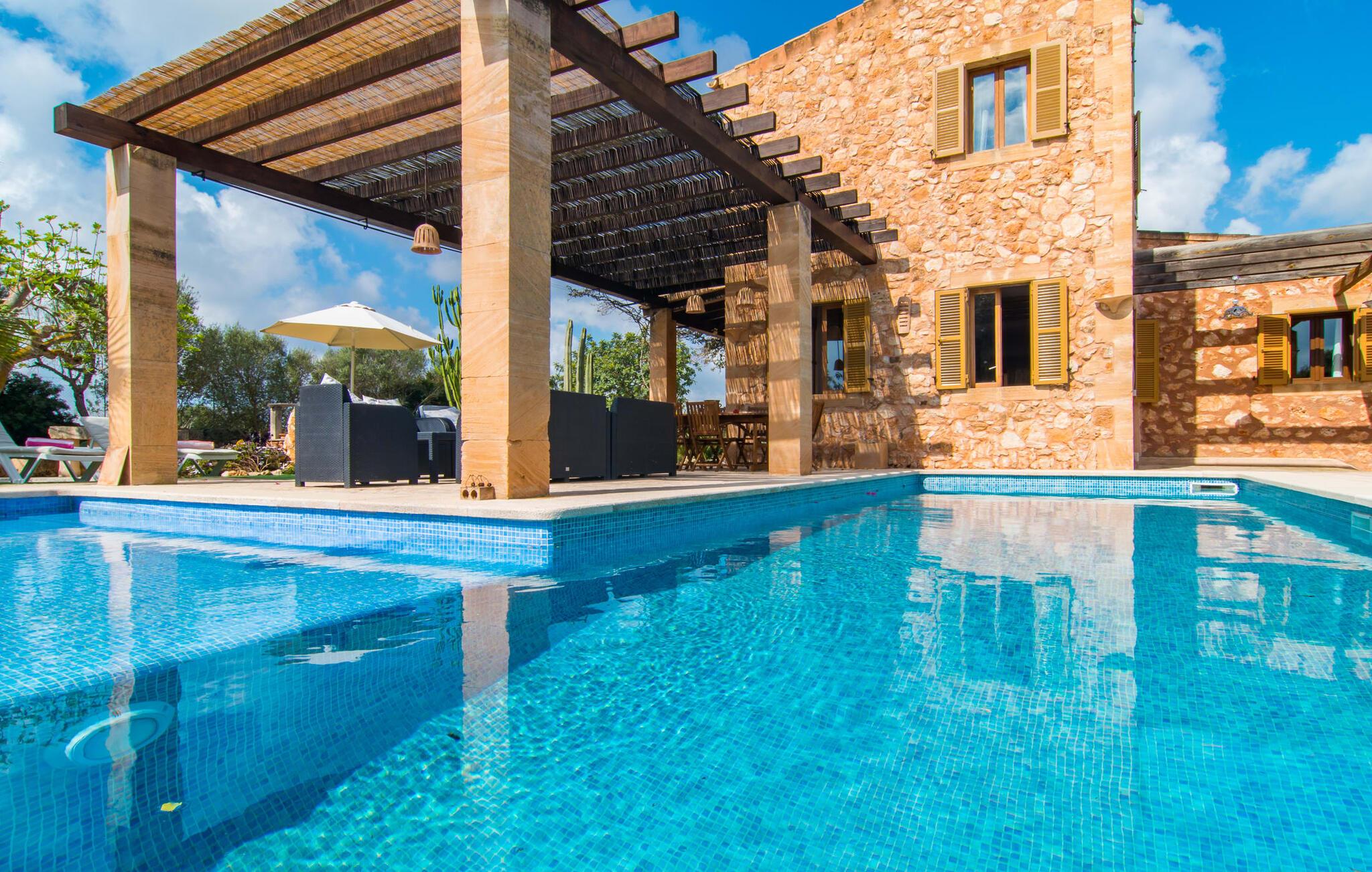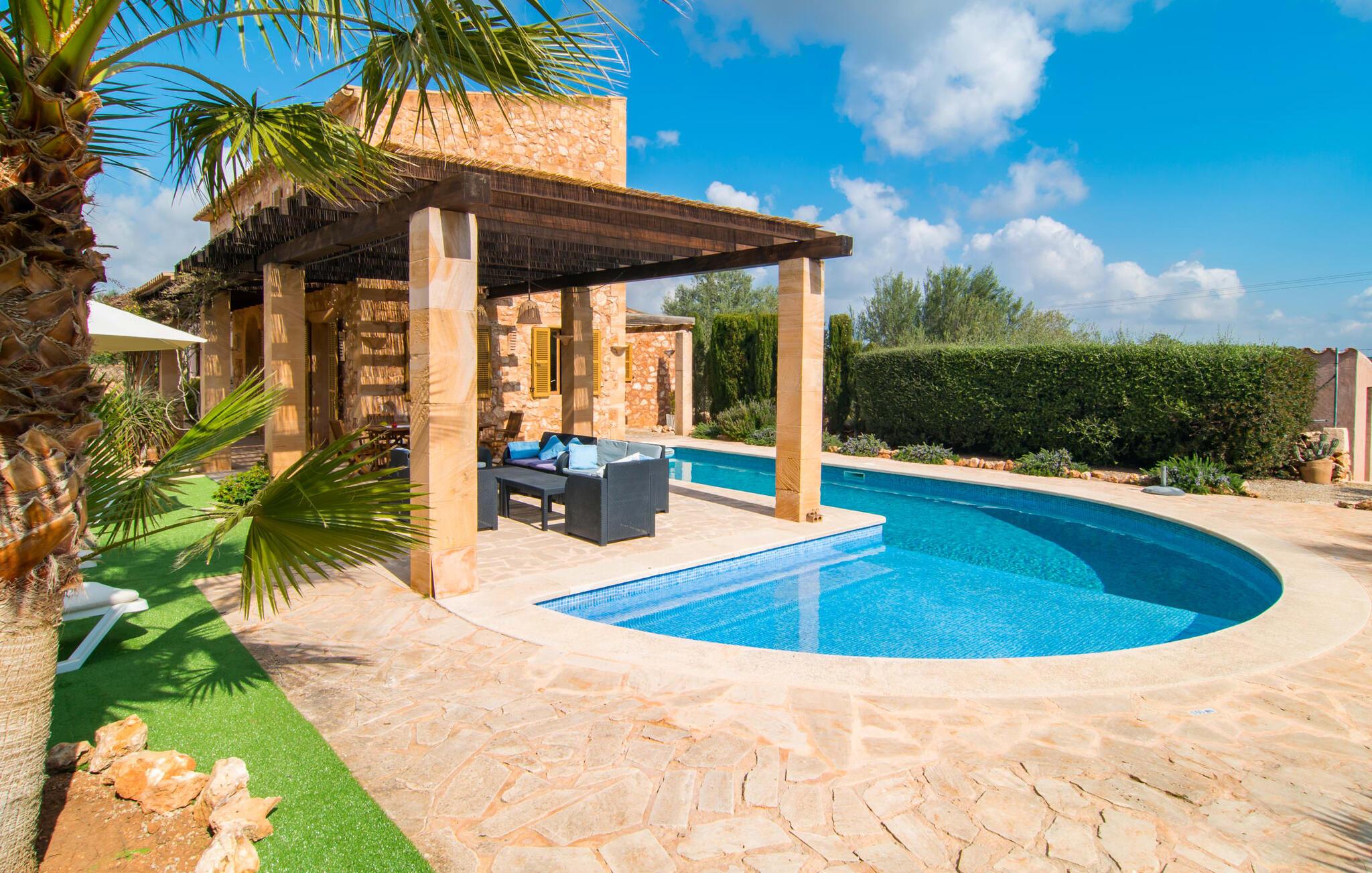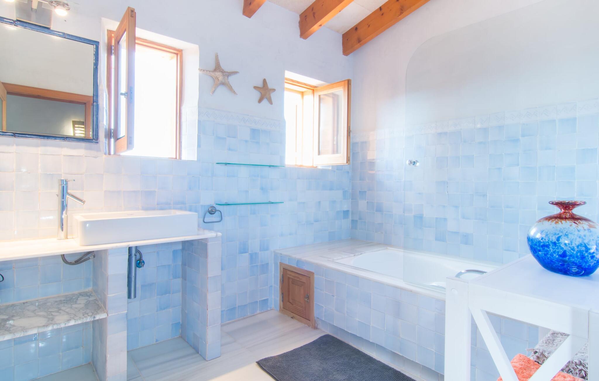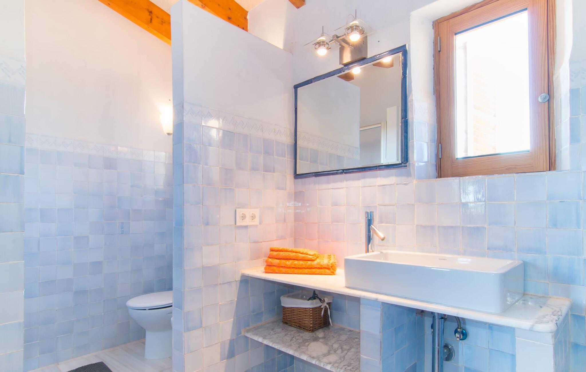 Man kunne næsten tro, at denne safranfarvede middelhavsvilla med sine oliven-, figen- og johannesbrødtræer, sine palmer, cypresser og kaktusser opstod fra selve Campos' frugtbare jord. Nybygget i 2015, lige så ærlig, ukompliceret og solmoden som en god vin, lidt mousserende steder og fuld af karakter, selv den første smag giver lyst til mere. En unik halvmåneformet pool omkring den overdækkede terrasse byder på alt det vand, I har brug for til jeres daglige svømmetur - et rigtigt blikfang! Her kan I afslutte dagen komfortabelt - med en sen morgenmad, et blad eller et glas vin - mens børnene plasker trygt rundt omkring jer. Man kunne næsten tale om en ferie i swimmingpoolen i stedet for ved poolen, og man kunne blive fristet til at hoppe direkte ud af et af vinduerne i det kølige vand (men lad være med det - det er hensynsløst, og I kommer til skade) . )...men "Ca Na Carmen" sikrer, at I ikke taber hovedet. Som en frugt, der holder, hvad dens ydre skal lover, skuffer indersiden heller ikke: Mallorca, jordnær, solrig og blomstret. En frisk brise synes at blæse gennem huset, og luftige gardiner giver rummet et let strejf. Den rummelige, åbne stue, madlavning og spiseplads omgiver hyggelige lyseblå sofaer, der inviterer jer til at fordybe jer i en filmaften. I kan selvfølgelig også drive ud i drømmenes rige i de behageligt enkle soveværelser med solide træsenge; Soveværelserne er indrettet med et udvalg af mørkere eller lysere møbler, og et af de øverste soveværelser har direkte adgang til en overdækket altan med vidunderlig udsigt over træerne til bjergene udenfor. Hvis I sover her, kan I lade døren stå åben. Badeværelserne - et i stueetagen og et på øverste etage - er hver delt af to soveværelser. Det eneste, der er tilbage at nævne, er det moderne, veludstyrede køkken med sin egen plads i solen, på hvis vægge friske, sprøde grøntsager fra det ugentlige marked i Campos hænger appetitligt: et paradis for vegetarer og rawfood-fans - hvis det var tilfældet. Det ville ikke være en fantastisk murstensgrill lige foran døren, der bare råber på at blive brugt. Det ville være en skam ikke at... ¡Buen provencho! I et landskab domineret af køer og marker er det nemt at få appetit op. Ud over dets middelalderlige centrum tilbyder den venlige by Campos nogle kulinariske insidertips, herunder den charmerende bistro Moda Café og Pastisseria Pomar, der er kendt over hele øen for sine mandelkager. Men begynder jeres vandrefødder at klø i “Ca Na Carmen” om sommeren, anbefaler vi en tur til Mallorcas sydspids. I Colònia de Sant Jordi inviterer restauranter og caféer, der ligger direkte på havnen, til at nyde havudsigten. Tag en 30-minutters bådtur til Cabrera (bogstaveligt talt "Gedeøen"), opdag det fortryllende lys fra Den Blå Grotte eller køl blot af i det krystalklare vand. Lyder det ikke som himlen på jorden? I en helt rolig, landlig beliggenhed og alligevel kun få kilometer på Ma-19 fra den lille by Campos med butikker og et supermarked, venter middelhavsvillaen "Ca Na Carmen" på gæster, der ønsker at udforske den sydlige del af øen. Santanyi, Ses Salines og Colònia de Sant Jordi på spidsen af øen er endnu ikke oversvømmet af turister og byder på vidunderlige naturlige sandstrande som Es Trenc eller den lille Cala Santanyi samt imponerende kystvandringer.
