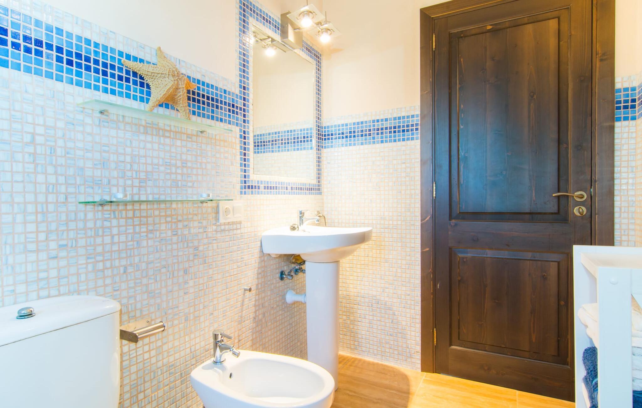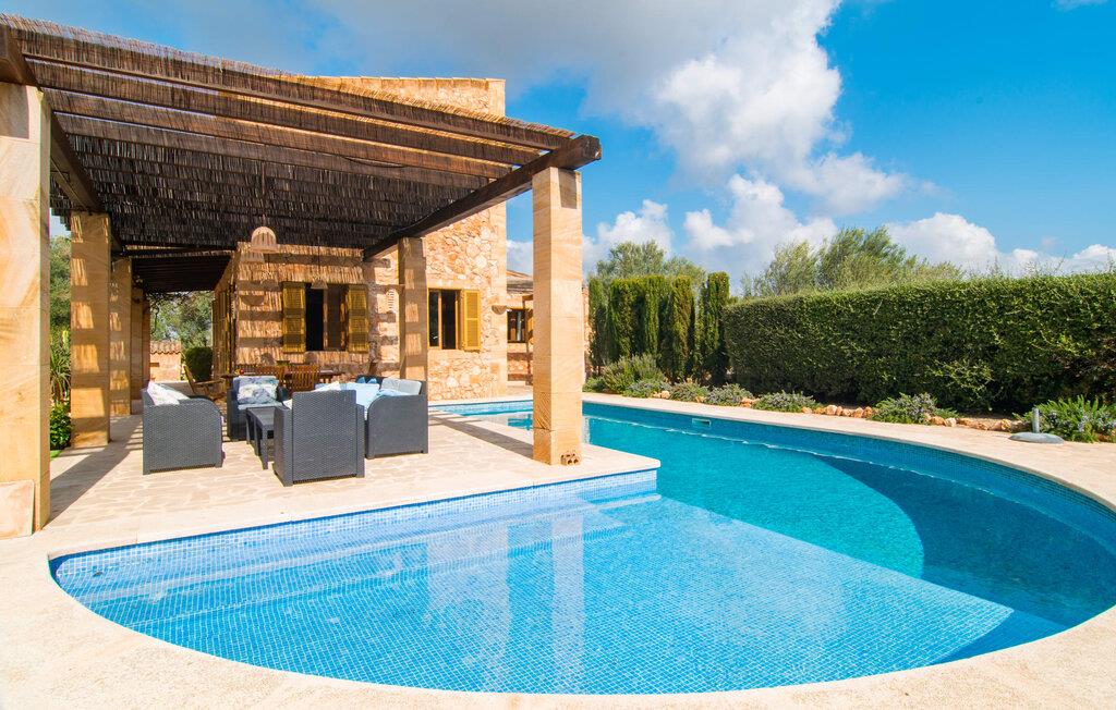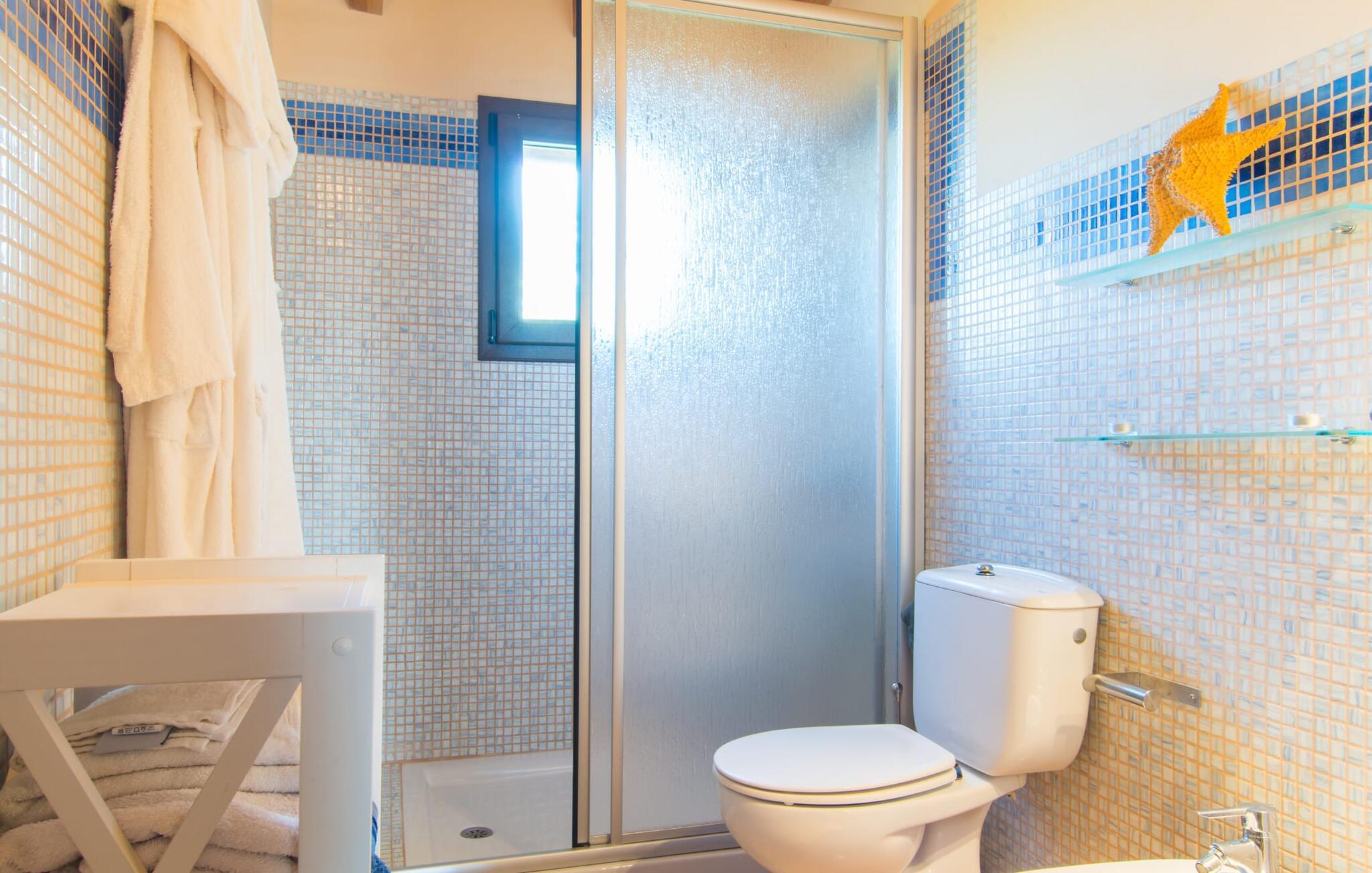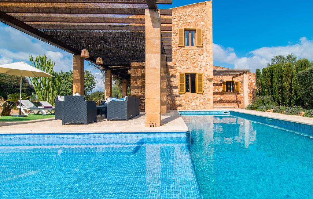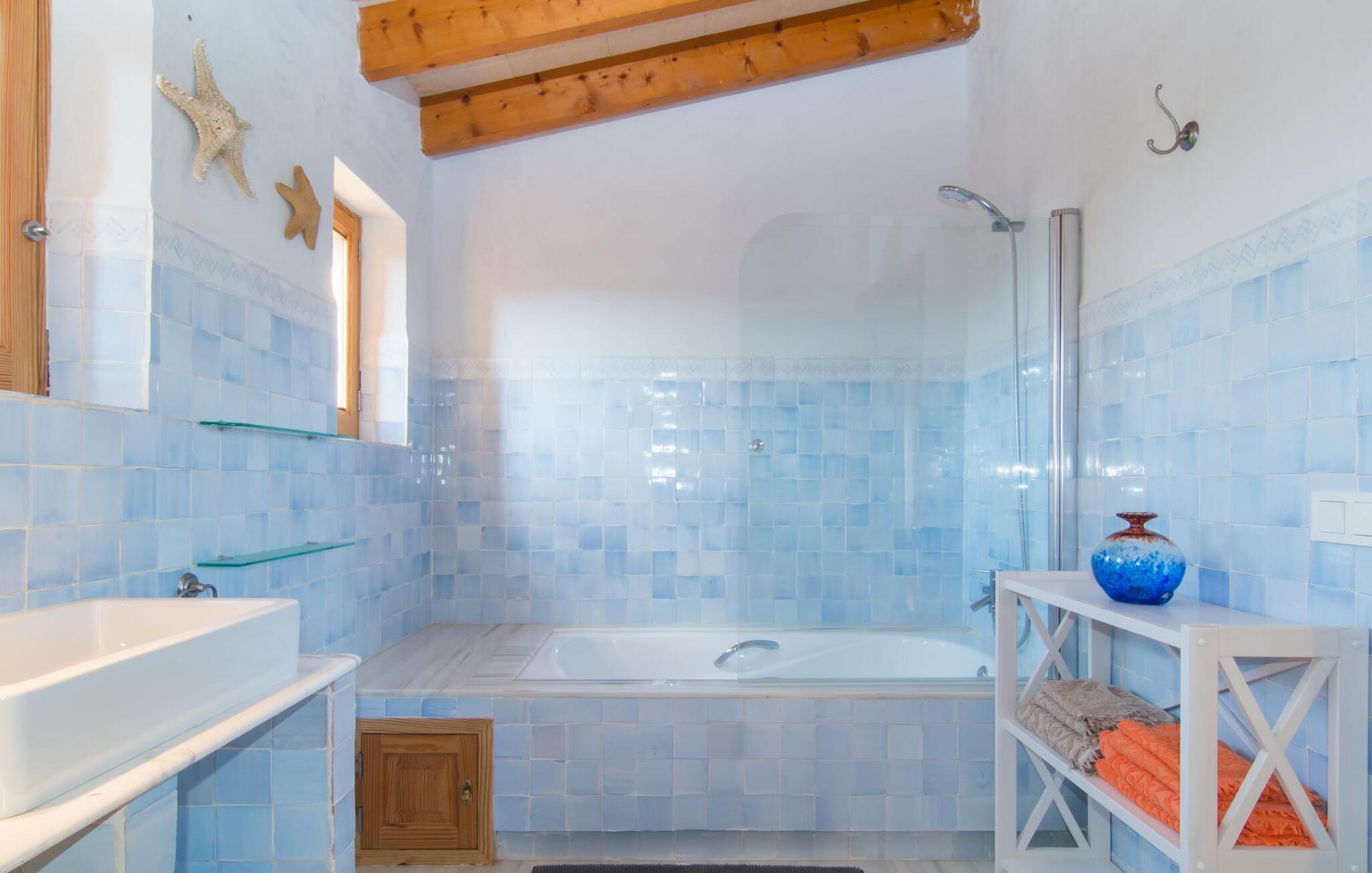 Man kunne næsten tro, at denne safranfarvede middelhavsvilla med sine oliven-, figen- og johannesbrødtræer, sine palmer, cypresser og kaktusser opstod fra selve Campos' frugtbare jord. Nybygget i 2015, lige så ærlig, ukompliceret og solmoden som en god vin, lidt mousserende steder og fuld af karakter, selv den første smag giver lyst til mere. En unik halvmåneformet pool omkring den overdækkede terrasse byder på alt det vand, I har brug for til jeres daglige svømmetur - et rigtigt blikfang! Her kan I afslutte dagen komfortabelt - med en sen morgenmad, et blad eller et glas vin - mens børnene plasker trygt rundt omkring jer. Man kunne næsten tale om en ferie i swimmingpoolen i stedet for ved poolen, og man kunne blive fristet til at hoppe direkte ud af et af vinduerne i det kølige vand (men lad være med det - det er hensynsløst, og I kommer til skade) . )...men "Ca Na Carmen" sikrer, at I ikke taber hovedet. Som en frugt, der holder, hvad dens ydre skal lover, skuffer indersiden heller ikke: Mallorca, jordnær, solrig og blomstret. En frisk brise synes at blæse gennem huset, og luftige gardiner giver rummet et let strejf. Den rummelige, åbne stue, madlavning og spiseplads omgiver hyggelige lyseblå sofaer, der inviterer jer til at fordybe jer i en filmaften. I kan selvfølgelig også drive ud i drømmenes rige i de behageligt enkle soveværelser med solide træsenge; Soveværelserne er indrettet med et udvalg af mørkere eller lysere møbler, og et af de øverste soveværelser har direkte adgang til en overdækket altan med vidunderlig udsigt over træerne til bjergene udenfor. Hvis I sover her, kan I lade døren stå åben. Badeværelserne - et i stueetagen og et på øverste etage - er hver delt af to soveværelser. Det eneste, der er tilbage at nævne, er det moderne, veludstyrede køkken med sin egen plads i solen, på hvis vægge friske, sprøde grøntsager fra det ugentlige marked i Campos hænger appetitligt: et paradis for vegetarer og rawfood-fans - hvis det var tilfældet. Det ville ikke være en fantastisk murstensgrill lige foran døren, der bare råber på at blive brugt. Det ville være en skam ikke at... ¡Buen provencho! I et landskab domineret af køer og marker er det nemt at få appetit op. Ud over dets middelalderlige centrum tilbyder den venlige by Campos nogle kulinariske insidertips, herunder den charmerende bistro Moda Café og Pastisseria Pomar, der er kendt over hele øen for sine mandelkager. Men begynder jeres vandrefødder at klø i “Ca Na Carmen” om sommeren, anbefaler vi en tur til Mallorcas sydspids. I Colònia de Sant Jordi inviterer restauranter og caféer, der ligger direkte på havnen, til at nyde havudsigten. Tag en 30-minutters bådtur til Cabrera (bogstaveligt talt "Gedeøen"), opdag det fortryllende lys fra Den Blå Grotte eller køl blot af i det krystalklare vand. Lyder det ikke som himlen på jorden? I en helt rolig, landlig beliggenhed og alligevel kun få kilometer på Ma-19 fra den lille by Campos med butikker og et supermarked, venter middelhavsvillaen "Ca Na Carmen" på gæster, der ønsker at udforske den sydlige del af øen. Santanyi, Ses Salines og Colònia de Sant Jordi på spidsen af øen er endnu ikke oversvømmet af turister og byder på vidunderlige naturlige sandstrande som Es Trenc eller den lille Cala Santanyi samt imponerende kystvandringer.