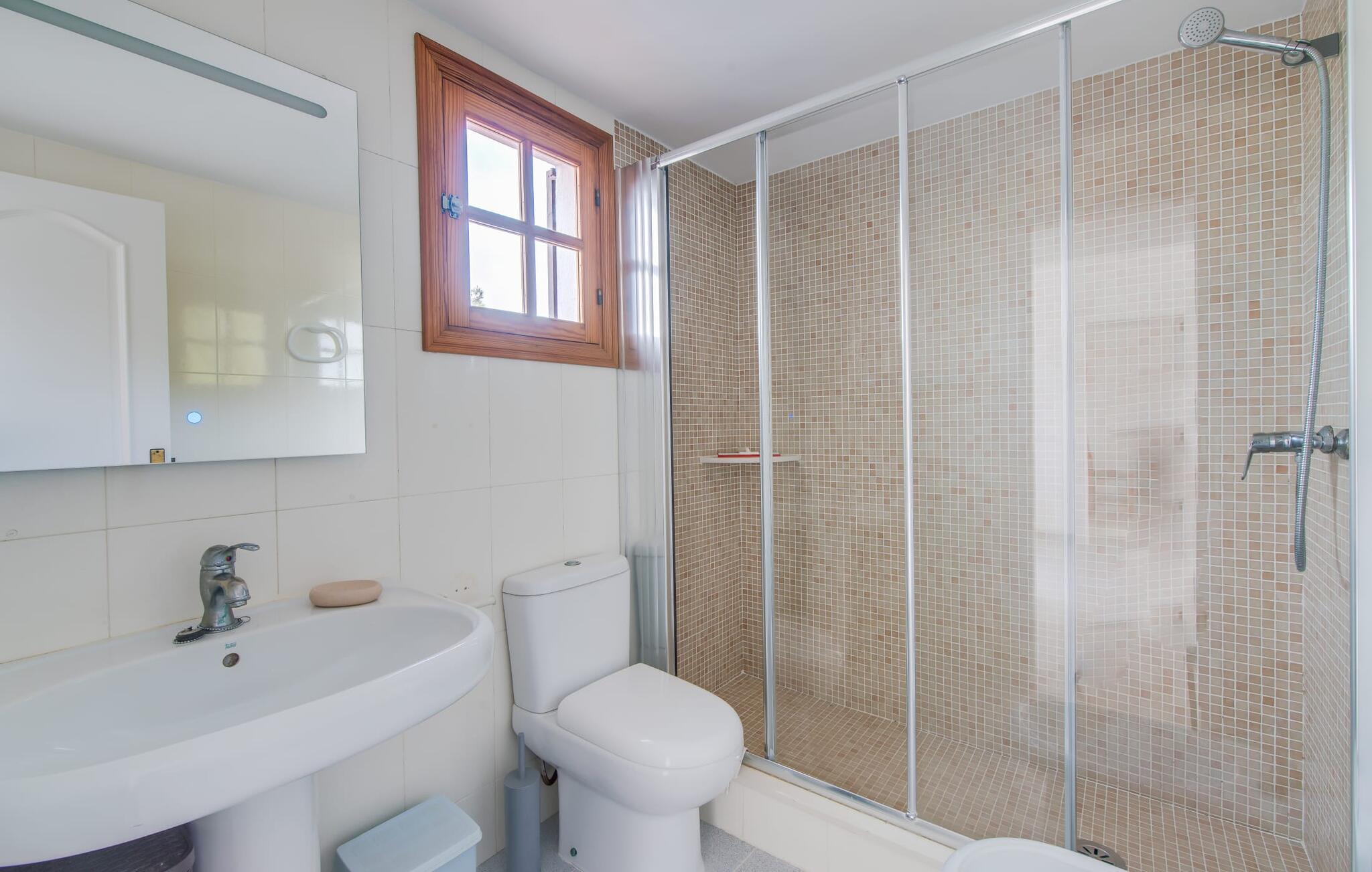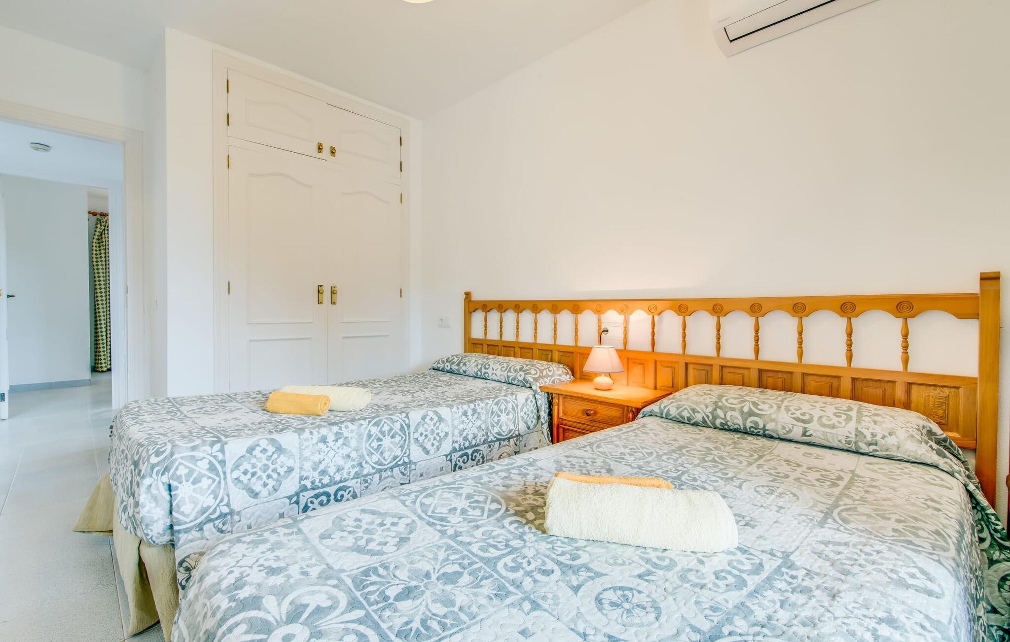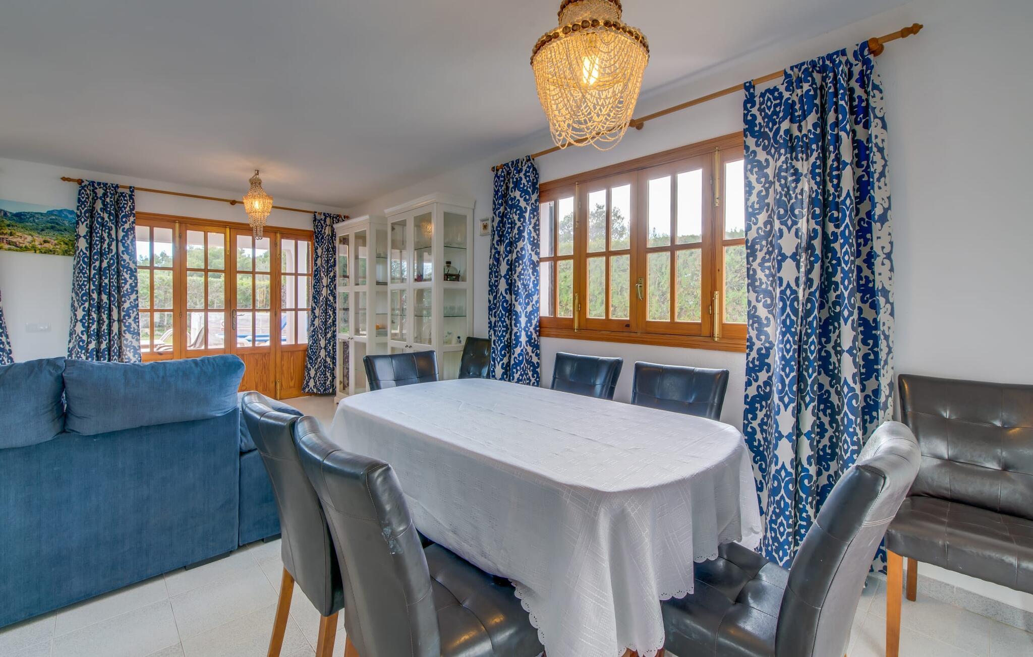 De varme solstråler glitrer på pooloverfladen, en blid vind kærtegner ejendommen og de blidt bølgende persianas. Den blå himmel, oversået med blide hvide skyer, strækker sig over den lyse hvide villa. Brisen bærer havets salt; Ikke så mærkeligt, for ejendommen "Ca Na Martina" ligger afsondret i en urbanisering nær Middelhavet. Dette forklarer også det maritime farveskema i den to-etagers villa. Ejendommen er omkranset af en grøn hæk. Den 30 m² store pool er placeret midt på en munter og frodig grøn græsplæne. I skal blot placere liggestolene på jeres yndlingssted. Hvis I foretrækker at bruge jeres tid udendørs, vil den overdækkede terrasse med det lange spisebord helt sikkert glæde jer. Her kan I nyde ethvert måltid på dagen, lige fra morgenmad og en let frokost til en hyggelig grillaften om aftenen, for derefter at afslutte dagen med et glas vin eller en anden kølig drink. Bagefter kan I trække jer tilbage til det indre af den smarte villa i hvid stil med et roligt sind og sanser og nyde en behagelig nattesøvn. De talrige trægitterdøre giver interiøret en nærmest sensuel atmosfære. Den usædvanligt lyse planløsning med hvidmalede vægge og døre og lysegrå gulvfliser giver villaen den æteriske fornemmelse af et strandhus. Fra terrassen når I direkte ind i det åbne, airconditionerede opholds- og spiseområde med et behageligt opholdsområde foran pejsen. Bliv underholdt af satellit-tv og dvd-afspiller. Spisepladsen er placeret foran køkkenet, som er lille, men stadig har alt hvad I behøver for komfortabel selvforplejning. Huset er ideelt til to familier, hver med en hel etage til deres rådighed. De tre trendy bruserum med brusekabine sørger også for en afslappet stemning om morgenen, for de fleste nyder ikke at skulle stå i kø til badeværelset. En trappe fører fra stuen til øverste etage, hvor yderligere to afslappende stuer med masser af opbevaringsplads i hvide skabe venter gæsterne. Et andet højdepunkt er tagterrassen. Det sætter prikken over i'et på "Ca Na Martina" og gør det til et så attraktivt rejsemål – ikke mindst takket være dens enestående beliggenhed. Cala D'Or - lige så attraktiv som den gyldne bugt, der giver den sit navn. Hvide villaer, et hyggeligt kvarter, fjordlignende bugter med forrevne kyststrækninger og en rigtig god infrastruktur med talrige indkøbsmuligheder, restauranter og barer giver jer et hjemligt miljø. “Ca Na Martina” ligger midt i det livlige Es Forti-kvarter. Det betyder også, at I i stedet for at køre bil, kan gå til en hyggelig bar og nyde en drink med udsigt over havet eller besøge en restaurant for en romantisk middag. At slentre rundt får jer til at føle, at I er på ferie. Og her vil det helt sikkert være en af jeres yndlingsbeskæftigelser, en gåtur langs molerne i den nærliggende lystbådehavn eller en gåtur op til fæstningen. Det er selvfølgelig også værd at tage en lejebil, hvis I vil lære landet og dets befolkning at kende. "Ca Na Martina" tilbyder jer en række muligheder for at opfylde jeres individuelle ferieønsker. Det eneste spørgsmål tilbage er: Hvornår tager vi afsted? "Ca Na Martina", den strålende hvide poolvilla med en lille have, er komfortabelt beliggende i gadelandskabet i den elegante kystby Cala D'Or. Den private ejendom er beliggende i hjertet af landsbyen i Es Forti-distriktet, så shopping og restauranter er inden for nem gåafstand. Havet ligger kun 200 m væk i luftlinje, og smukke badebugter som Caló d'es Pou ligger kun et stenkast væk.