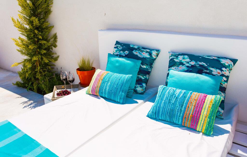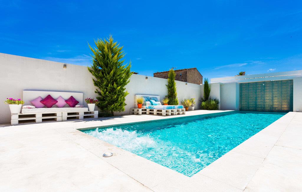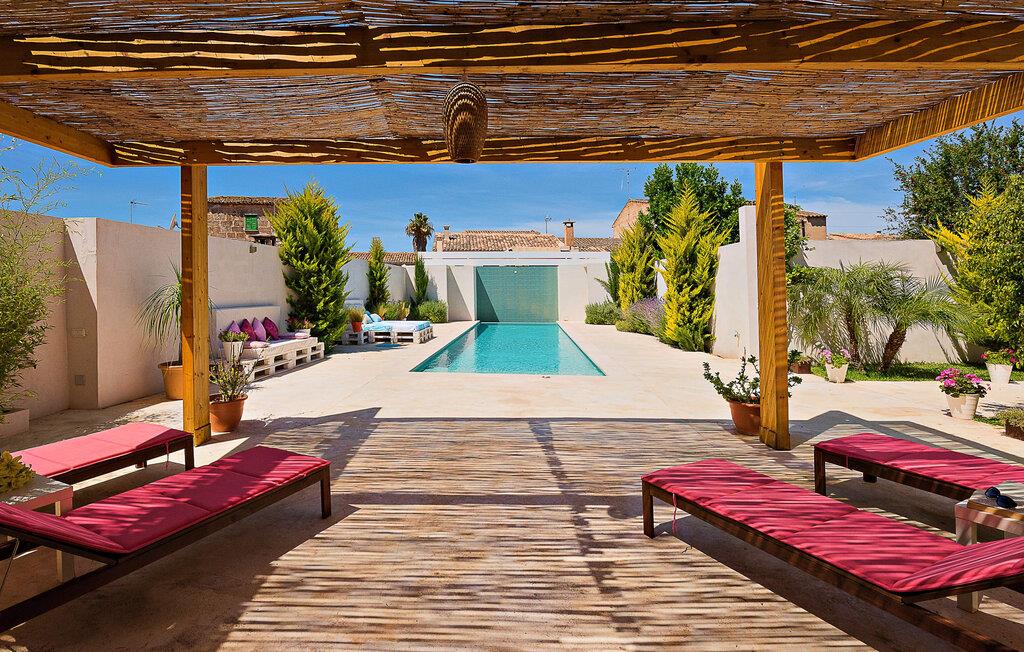 Kunne I tænke jer at holde ferie i et autentisk mallorcansk hus, men stadig være privat og nyde god infrastruktur? Så er det værd at kigge nærmere på. Villaen "Ca Na Molinera" kombinerer ikke kun disse kvaliteter, men supplerer dem med en moderne og meget stilfuld atmosfære, hvor I helt sikkert vil føle jer godt tilpas. Feriehuset ligger direkte i den centrale Pla de Mallorca-region i landsbyen Sant Joan, som byder på en typisk, næsten original flair. Villaen ligner en oase, der skiller sig ud fra omgivelserne takket være dens stilfulde indretning. Ved første øjekast virker alt meget lyst og strålende, og det maleriske udendørsområde inviterer jer til at tilbringe lange, fornøjelige timer udendørs. Et par middelhavsplanter, nogle i krukker, pynter på de ellers enkle og overvejende hvide områder. Der er en fantastisk chill-out zone lavet af pallemøbler lige ved siden af huset. Her kan I slappe af hele dagen lang, ideelt med en kølig drink og måske en forfriskende snack. Farverige puder pifter tingene op med lyse toner. Den brede sti til poolen fører først forbi andre afslapningsområder, som er perfekte steder at slappe af udendørs og med garanti vil være populære blandt alle rejsende. Poolen er meget stor til et rækkehus. I kan svømme rigtige runder over en længde på 12 m – har I nogensinde gjort dette, tidligt om morgenen, når dagens lys og livet begynder at vågne omkring dig? Hvis ikke, så skal I bestemt gøre det og nyde denne helt særlige form for luksus. Der er komfortable liggestole til rådighed, så I kan slappe af bagefter. Der er også et andet højdepunkt ved poolen - en slags renoveret garage, hvor I finder et fantastisk udekøkken med spisebord og køleskab. I denne stilfulde atmosfære med en smuk udsigt over poolen kan I spise sammen og nyde en grillsession om aftenen. Husets indre matcher det ydres æstetik. Moderne, behageligt farverig indretning skaber en meget stilfuld atmosfære, hvor I med det samme ønsker at tilbringe tid. Ekstraordinære arrangementer og individuelle stykker giver hele stemningen et ekstra individuelt præg. Bo i de rummelige værelser og skift frem og tilbage mellem de komfortable udendørs og indendørs områder, som I ønsker. I kan slappe perfekt af i den komfortable sofa i den store, lyse stue. Til underholdning er der et fladskærms-tv med satellitforbindelse og dvd-afspiller samt en højhastigheds internetforbindelse for at sikre jeres digitale forbindelse med venner og familie. Mellem opholds- og køkkenområderne er en spiseplads, der tilbyder en indbydende, eksklusiv fornemmelse for perfekte måltider. Køkkenet er et sandt blikfang med sit sorte og røde look: Her finder I plads nok til alt, hvad I skal bruge, så intet står i vejen for jeres selvforsyning. Der er også et soveværelse og et badeværelse på denne etage. Tager I den ekstravagante trappe op til øverste etage, kommer I til et soveværelse. Herfra kommer I ind i det andet værelse: et stort soveværelse med walk-in closet, en-suite badeværelse og privat terrasse. Der er også et andet badeværelse på dette niveau. Alle værelser er indrettet i elegant stil og har masser af plads. Elegante badeværelser giver plads til alle gæster og er udstyret med attraktive installationer og armaturer. Strygejern og hårtørrer er til rådighed i huset, så I behøver ikke at medbringe jeres eget hjemmefra. Den nærliggende landsby Petra (ca. 7 km) med sine gyldenbrune stenhuse minder om en drømmende by langt væk fra stress og jag. Sørg for at besøge det ugentlige marked og de små barer, caféer og restauranter i denne rolige by, som har udviklet en god infrastruktur, men stadig bevarer sin ro. Lloret de Vistalegre er også en attraktiv by og kun 15 minutter væk i bil. En tur til Inca (20 km) er også umagen værd. Den lille by Inca har en lang tradition inden for læder- og skohåndværk. Dette indbydende hus ligger midt i den smukke landsby Sant Joan - kun 7 km fra Petra, en lille, drømmende by, der har sin charme gennem både smukke gyder og gader omkranset af gamle bygninger. Sineu er også omkring 7 km væk. Et stort marked finder sted her hver onsdag morgen; Markedet i Sant Joan finder sted om torsdagen.