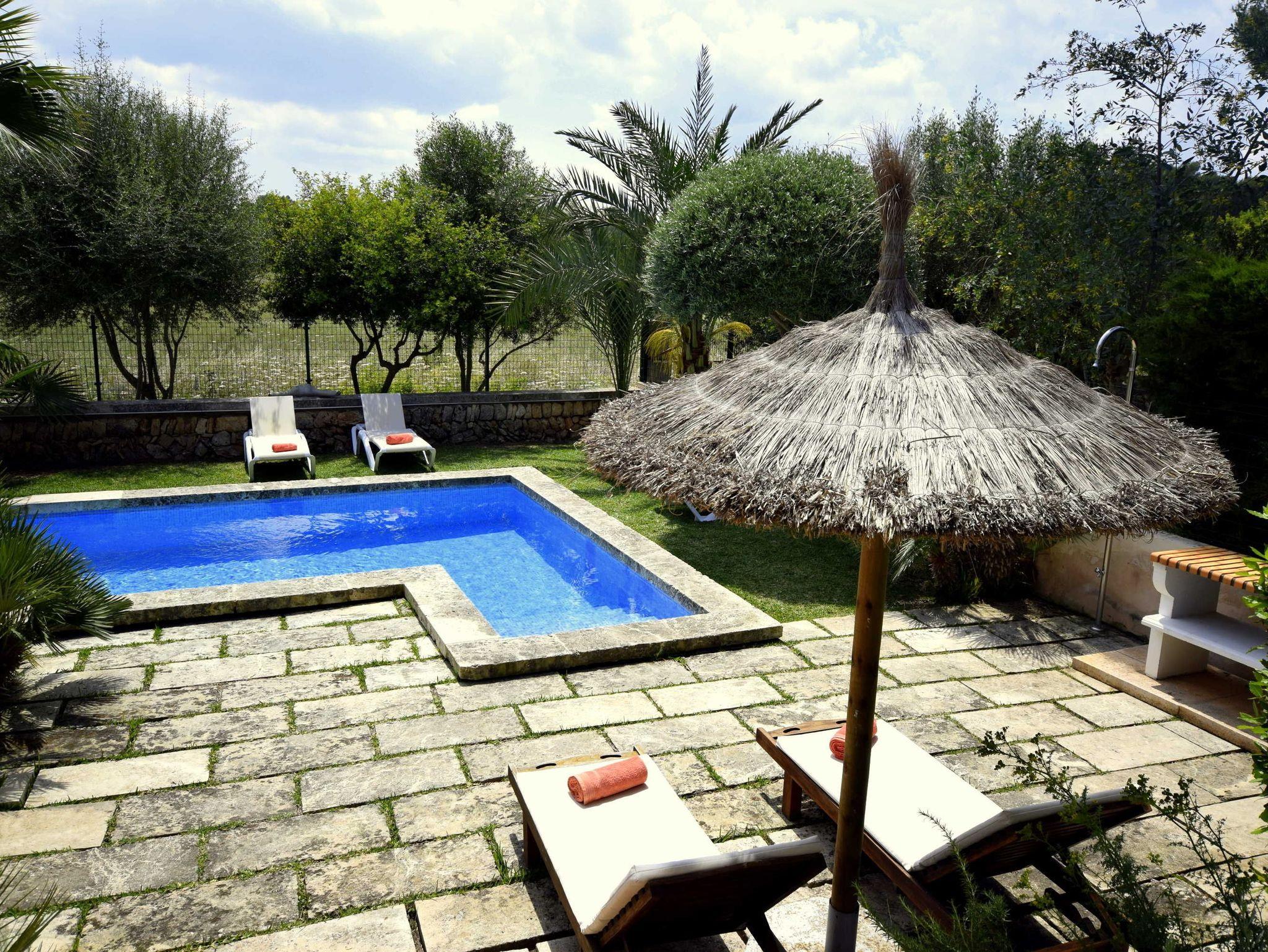 Der Garten ist wunderschön angelegt und gepflegt. Auf der Rückseite des Hauses, in süd/ west Ausrichtung, befindet sich der Pool, umgeben von einer kleinen Rasenfläche mit 8 Liegen. Ein Grillplatz sowie Esstisch und Stühle sind ebenfalls vorhanden. Das Grundstück grenzt hier an unbebaute Landschaft und es ist entsprechend ruhig.