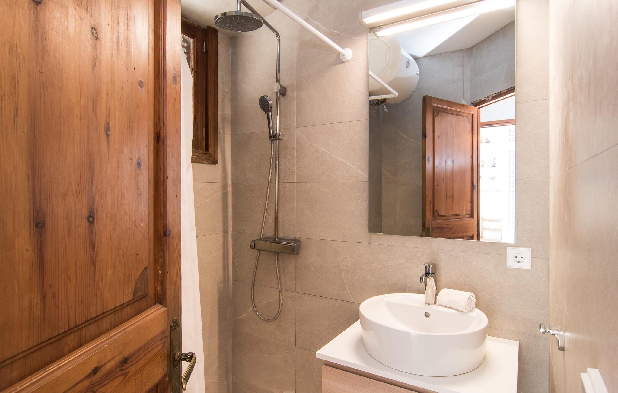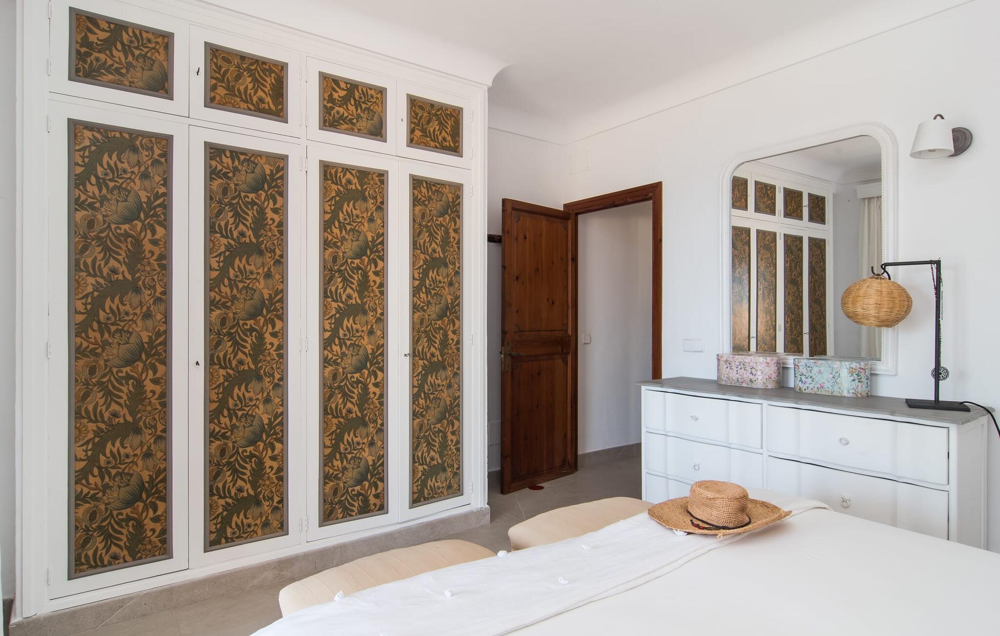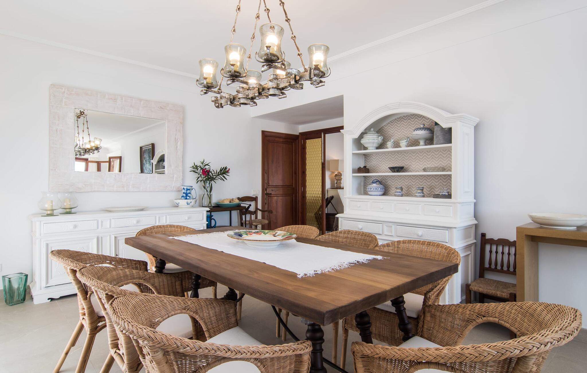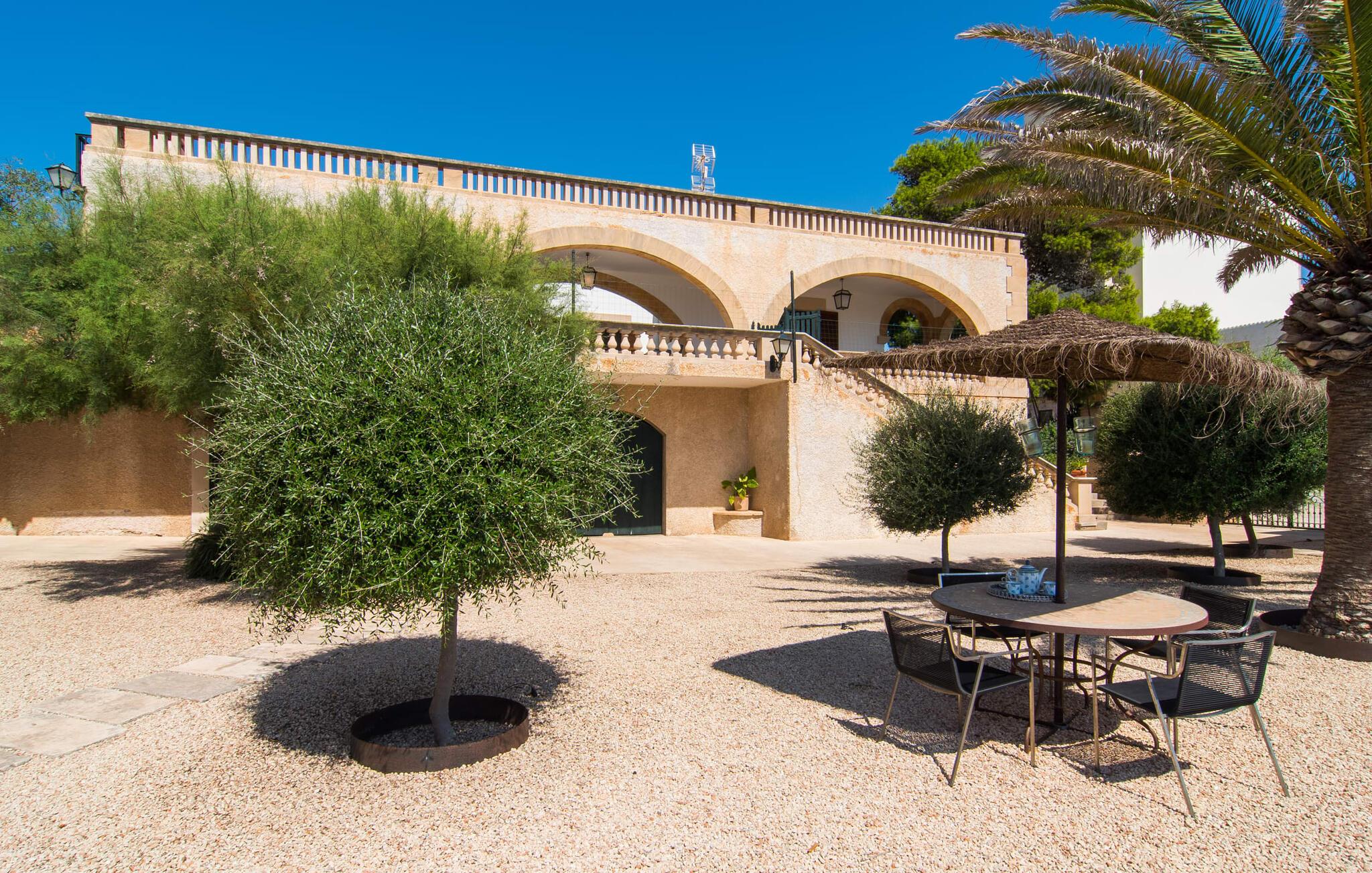 Villaen "Cabrera" tilbyder en yderst attraktiv dobbeltpakke: Mens et par kan nyde en masse privatliv i den lille lejlighed, tilbyder fem ekstra dobbeltværelser i det ikke mindre attraktive hovedhus et lige så attraktivt alternativ til at drage fordel af denne enestående, udsøgte beliggenhed lige ved havet. Fra poolterrassen, som er udstyret med træplanker, kan I se ud over kystbuske på skibene, der fredeligt driver i horisonten. Med en længde på 15 m er poolen ideel til rundsvømning. Majestætiske palmer og oliventræer skaber en særlig storslået parkstemning i middelhavshaven. I en udendørs opholdsstue med et udendørs køkkenområde kan I nyde en festlig grill, men I kan også sidde i de vidunderligt komfortable sofaer eller gøre jer godt tilpas på den blidt svajende liggestol i rattan. Den overdækkede terrasse byder på ekstra siddepladser. Den udendørs terrasse med stråtag er ideel til en omfattende middag i godt selskab, da den er udstyret med et stort bord og giver plads til alle besøgende. I alt 300 m² boligareal sikrer, at I ikke kommer i vejen for hinanden, selv når huset er fyldt. To af de fem soveværelser i hovedhuset er udstyret med en køjeseng i voksenstørrelse - hvoraf det ene har eget badeværelse. De andre tre soveværelser, hver med en dobbeltseng, deler badeværelse. En komfortabelt møbleret stue med pejs, stort smart-tv og spisebord tilbyder panoramaudsigt over den nærliggende kyst takket være sine store vinduer. I det rummelige køkken sørger talrige skabe, hylder og et stort køleskab for, at I uden bekymringer kan fylde op på markedet. Den smart designede lejlighed med sine 50 m² giver mulighed for selvstændig bolig: varme træfarver sikrer, at I føler jer godt tilpas i denne lejlighed, som består af et soveværelse, et badeværelse og en stue med tekøkken. Takket være varme og aircondition kan I nyde behagelige temperaturer hele året rundt. I Villa "Cabrera" har hver sæson sin egen charme. Uanset om I vil slentre gennem byen, stoppe om aftenen på den originale havnerestaurant Sal de Cocó eller nyde de mange vandsports- og aktive feriemuligheder i området - I kommer bestemt ikke til at kede jer i Colonia de Sant Jordi . Villaen er direkte forbundet med vejnettet, så I er dejlig mobil med jeres lejebil. Vi anbefaler også at leje en cykel for at udforske kyststierne. "Hvidguld" produceres stadig i dag i de lyserøde laguner i strandengene, Salinas de Llevant. Sørg for at udforske hulerne, bugterne, naturlige strande og holme i Cabrera Marine Protected Area, et dykkermekka, før I vender tilbage til villaen og nyder solnedgangen. Villaen “Cabrera” med et stort hovedhus og en lejlighed lige ved havet lover en ferie i særklasse: Beliggende på den sydlige spids af kystbyen Colonia de Sant Jordi kan I slentre langs havnepromenaden og slå jer ned for en dag på en af de nærliggende naturstrande Brug vand med et par lækkerier: Es Trenc har kultstatus og ligger kun 7 km væk. Platja d'es Dolc ligger 2 km derfra.