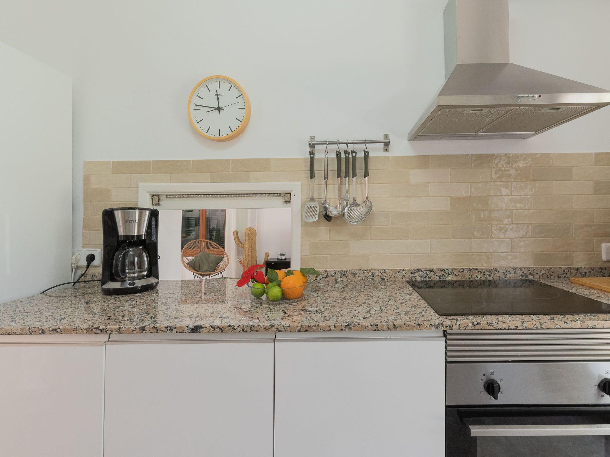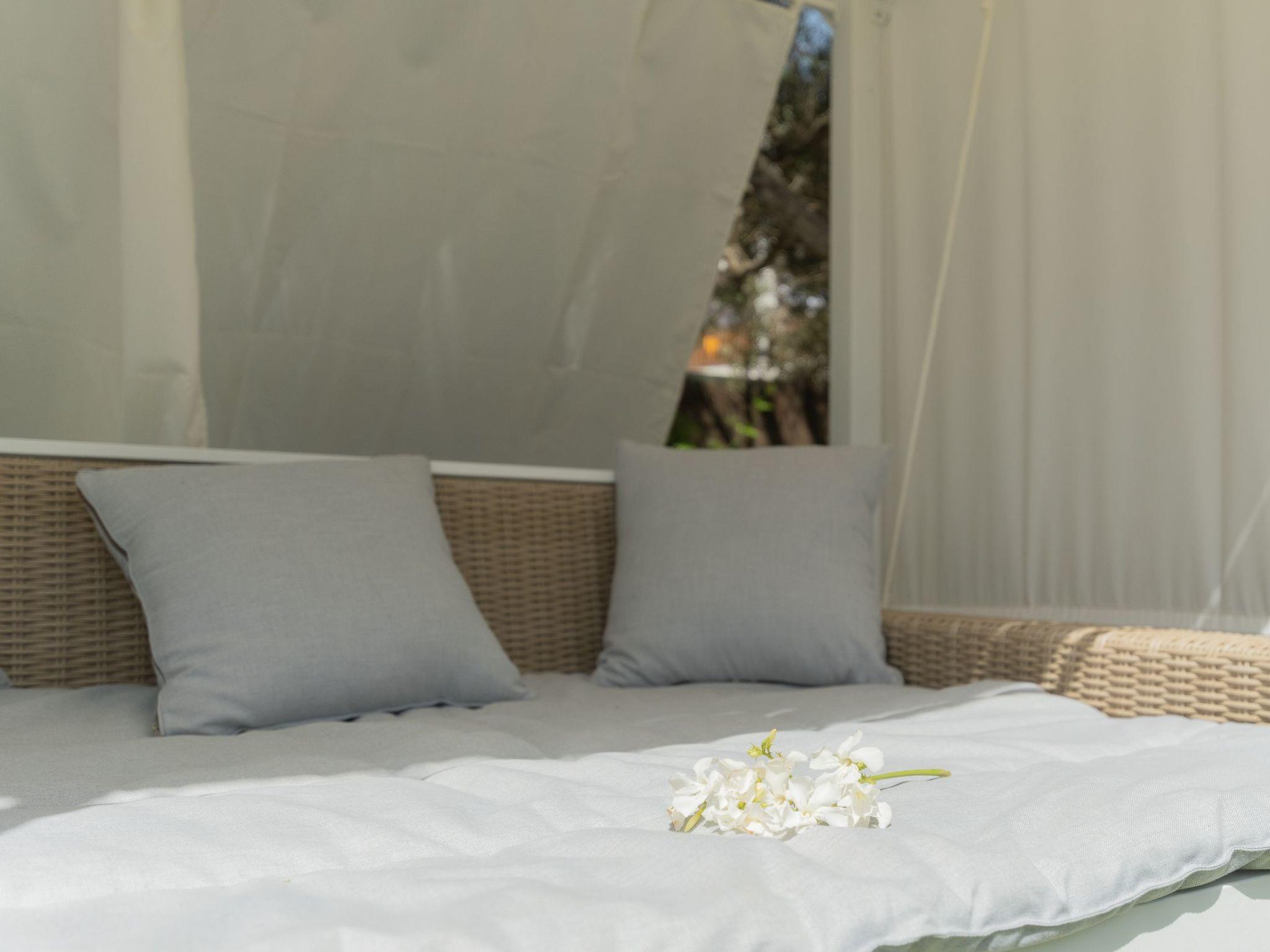 Dora has a garden with a well-kept lawn, Mediterranean plants, palm trees and olive trees, which provide welcome shade during the hot summer days. At the front there is a terrace overlooking the garden and the pool, with a table and chairs so that the delicacies prepared on the barbecue can be enjoyed "al fresco". The kidney-shaped pool with brick steps and a ladder offers refreshment, while the sun loungers invite you to enjoy the long summer days there. A cosy chill-out set also enriches the outdoor area.