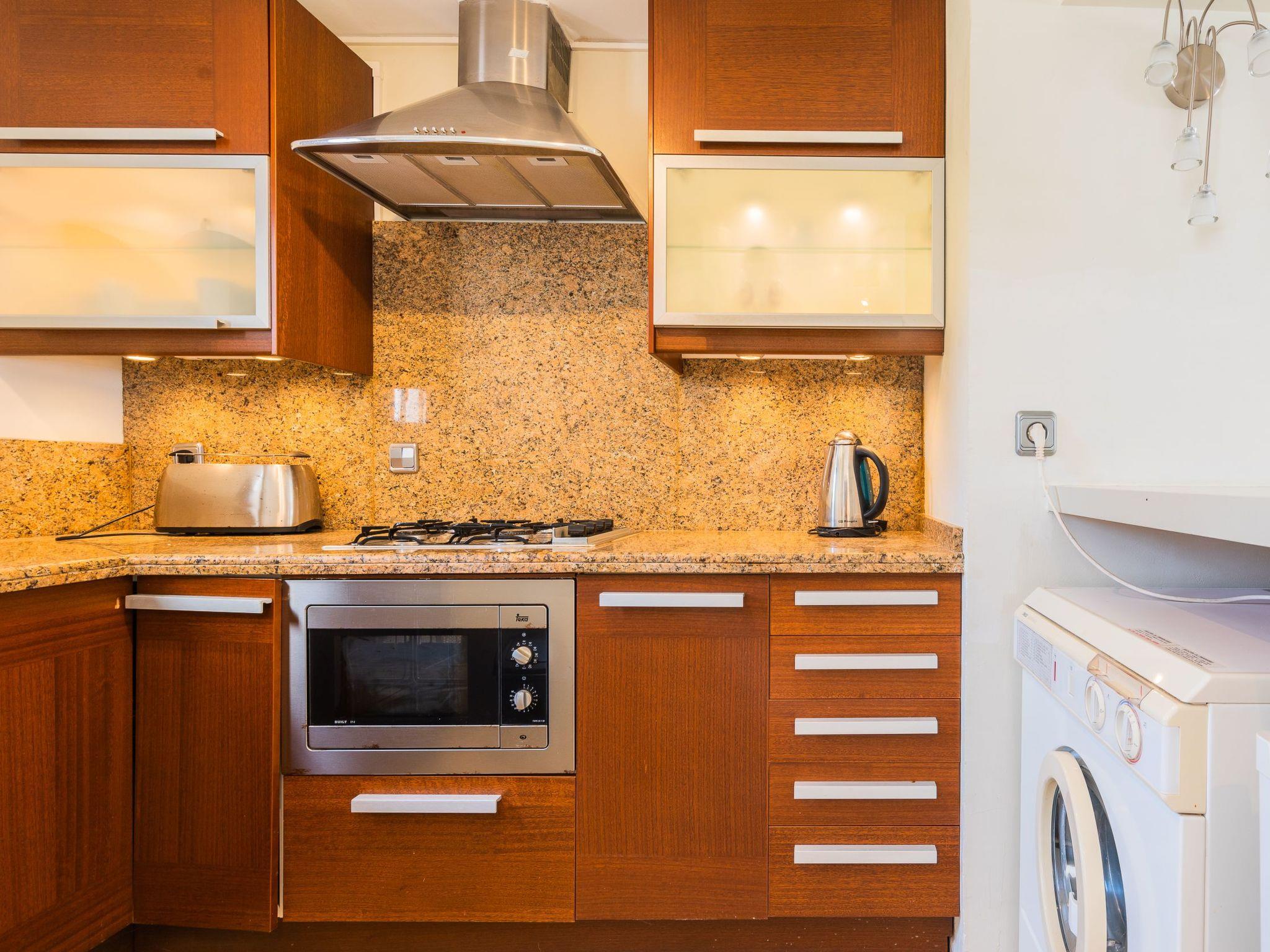 At the heart of this completely renovated flat is the open-plan living and dining room, which flows seamlessly into a modern kitchen with breakfast bar. This central living area is not only well equipped with a gas hob, kettle and coffee machine, but also offers a washing machine for exclusive use. Entertainment is provided by a satellite TV, which is available in the cosy living area. The two bedrooms, one with two single beds and the other with a double bed, promise restful nights. Each bedroom has its own air conditioning and private bathroom with shower for added comfort during your stay.