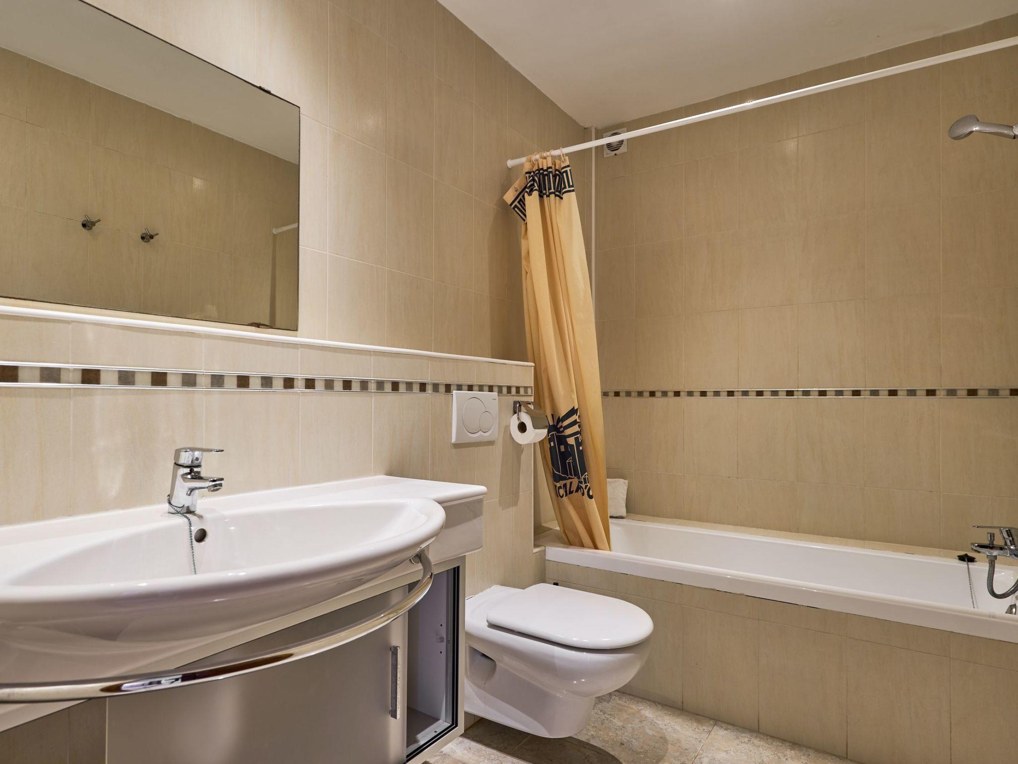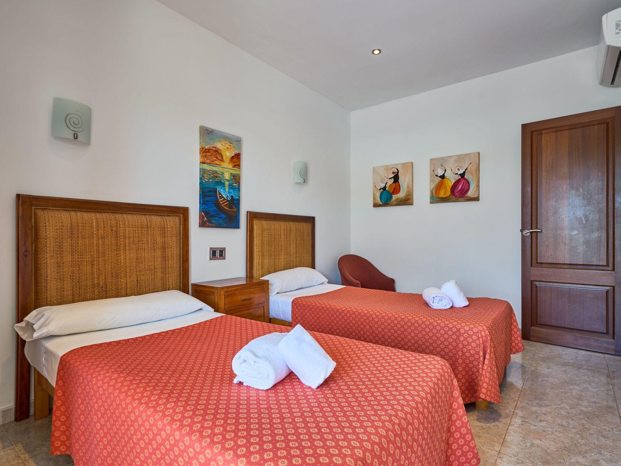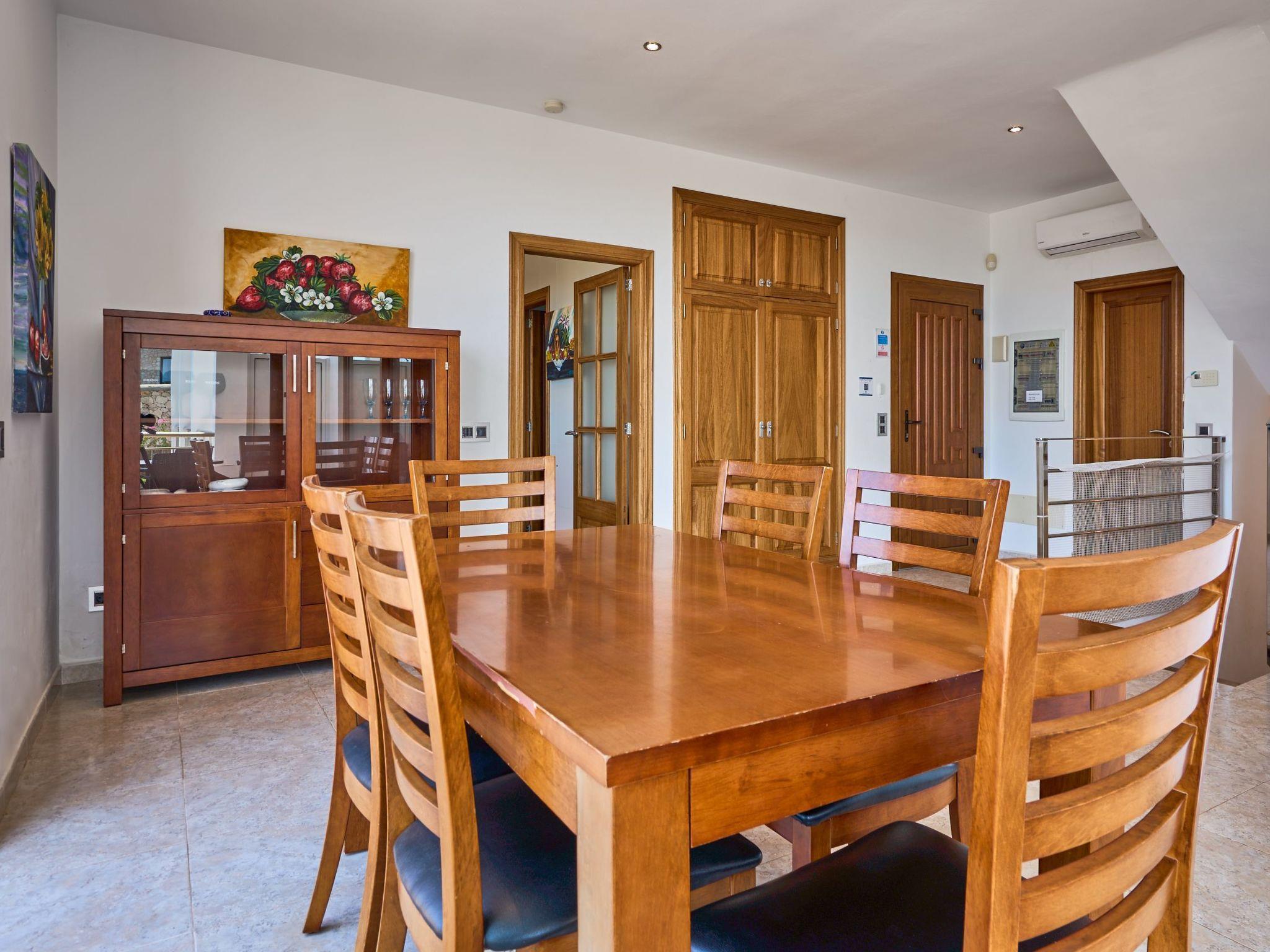 Semi-detached house on three floors. A few steps lead to the entrance of the villa on the ground floor (middle floor). On this level there is an open-plan dining room with access to the terrace. Kitchen and laundry room are accessible from the dining room. Guest toilet. A staircase leads to the first floor where there is a bedroom with two single beds and an ensuite bathroom with shower. This bedroom has access to two terraces. On the lower floor there is a double bedroom with en-suite bathroom with shower and two twin bedrooms sharing a separate bathroom with bathtub. These bedrooms have access to the pool terrace.