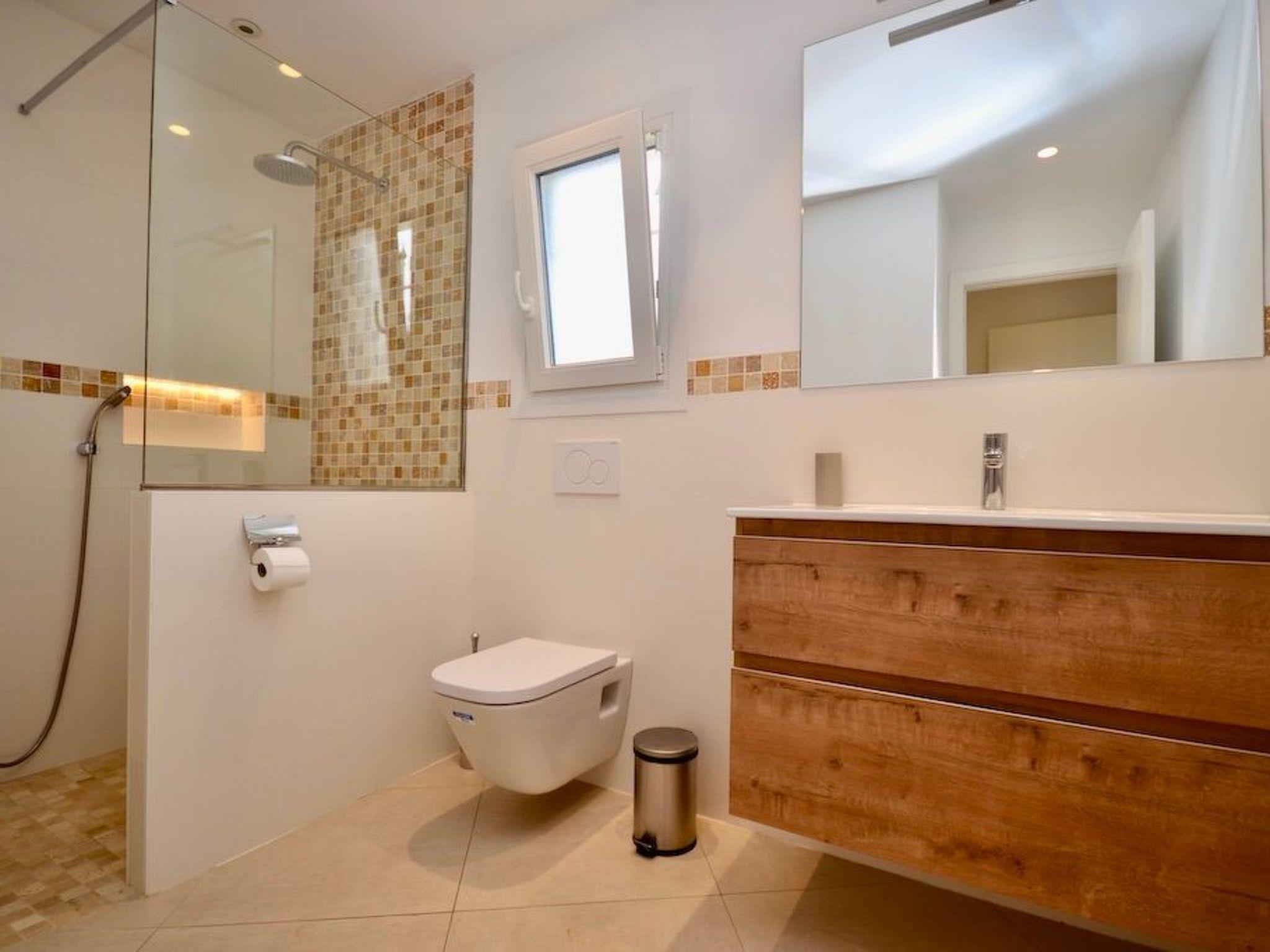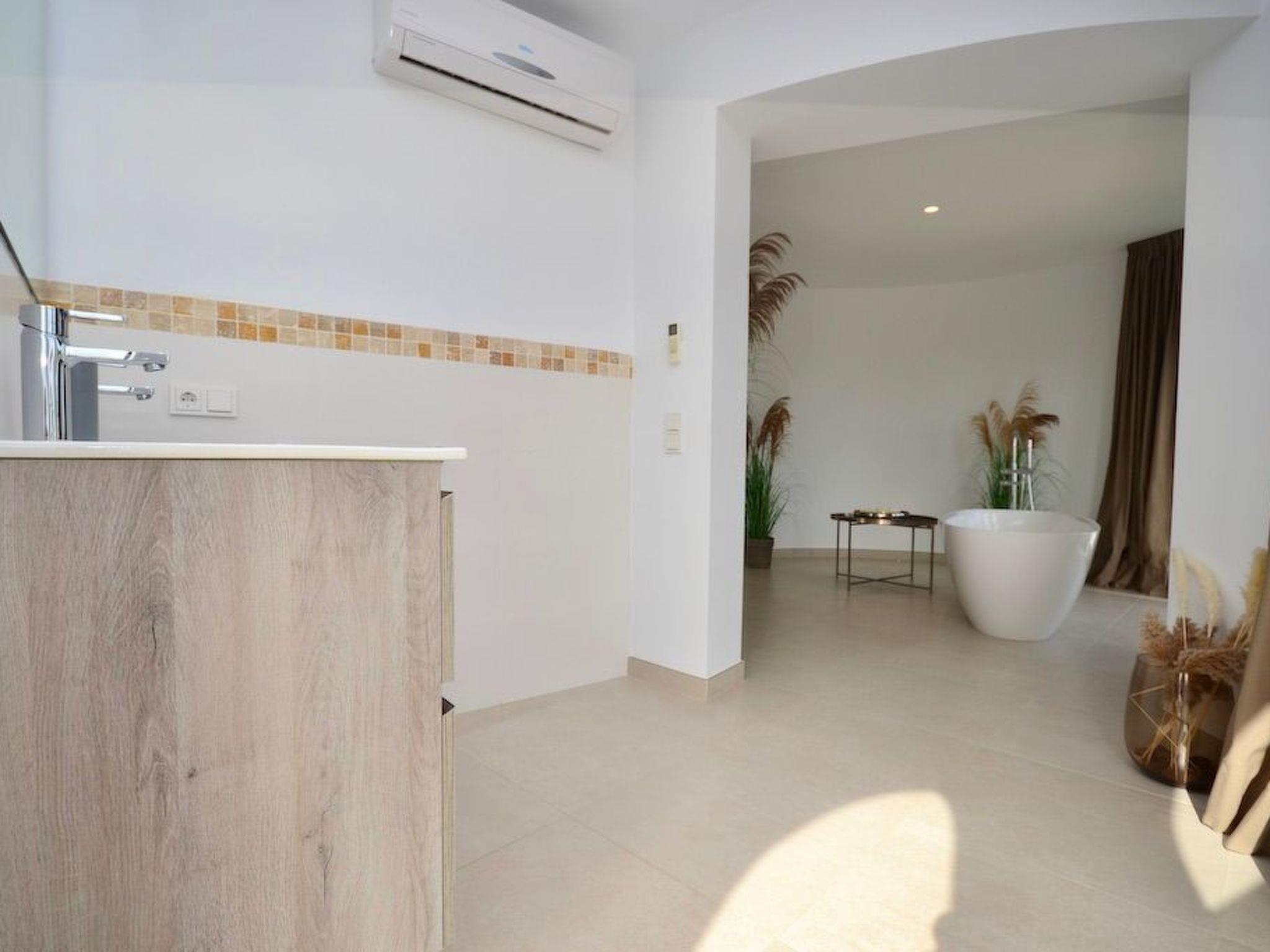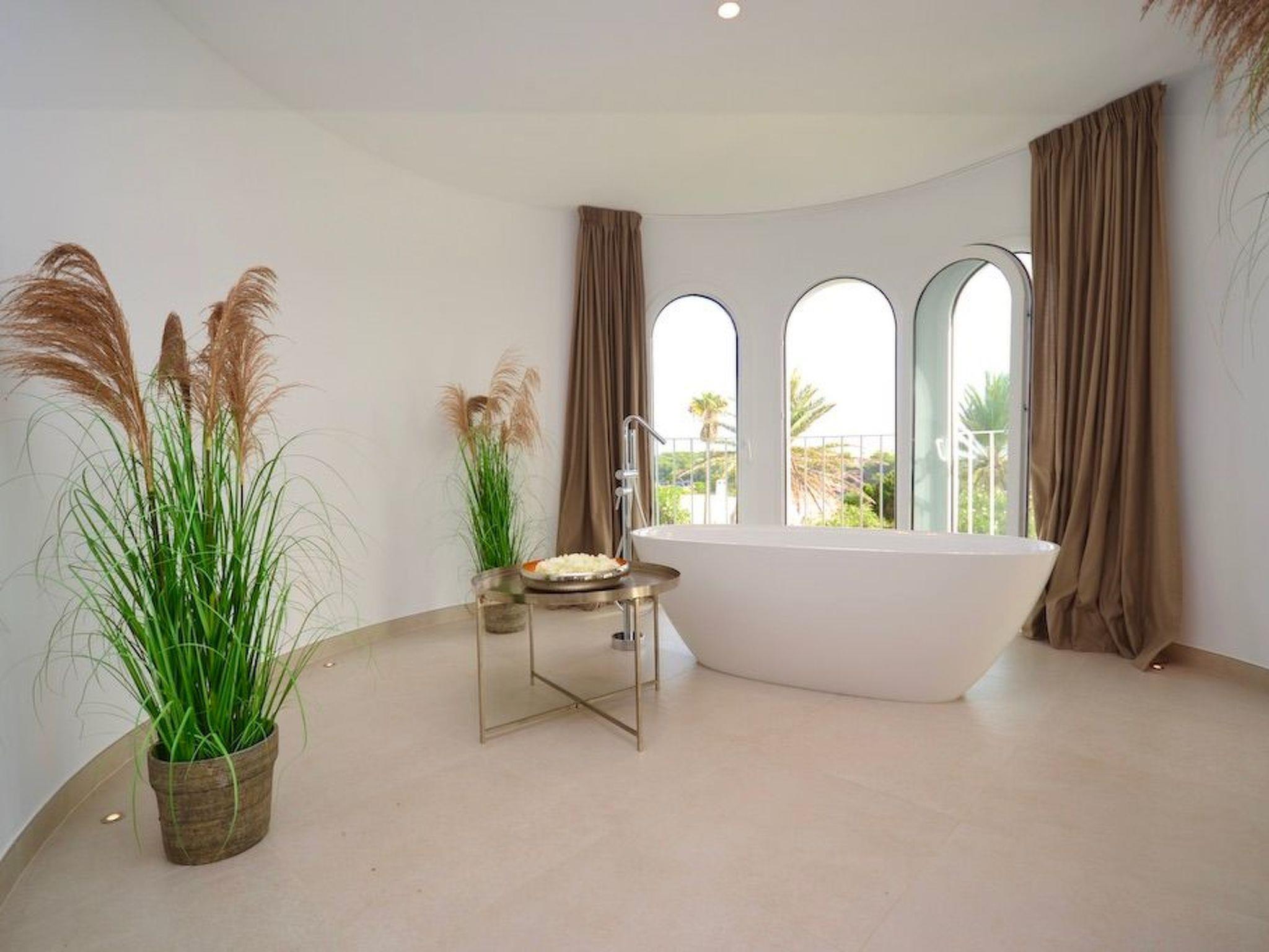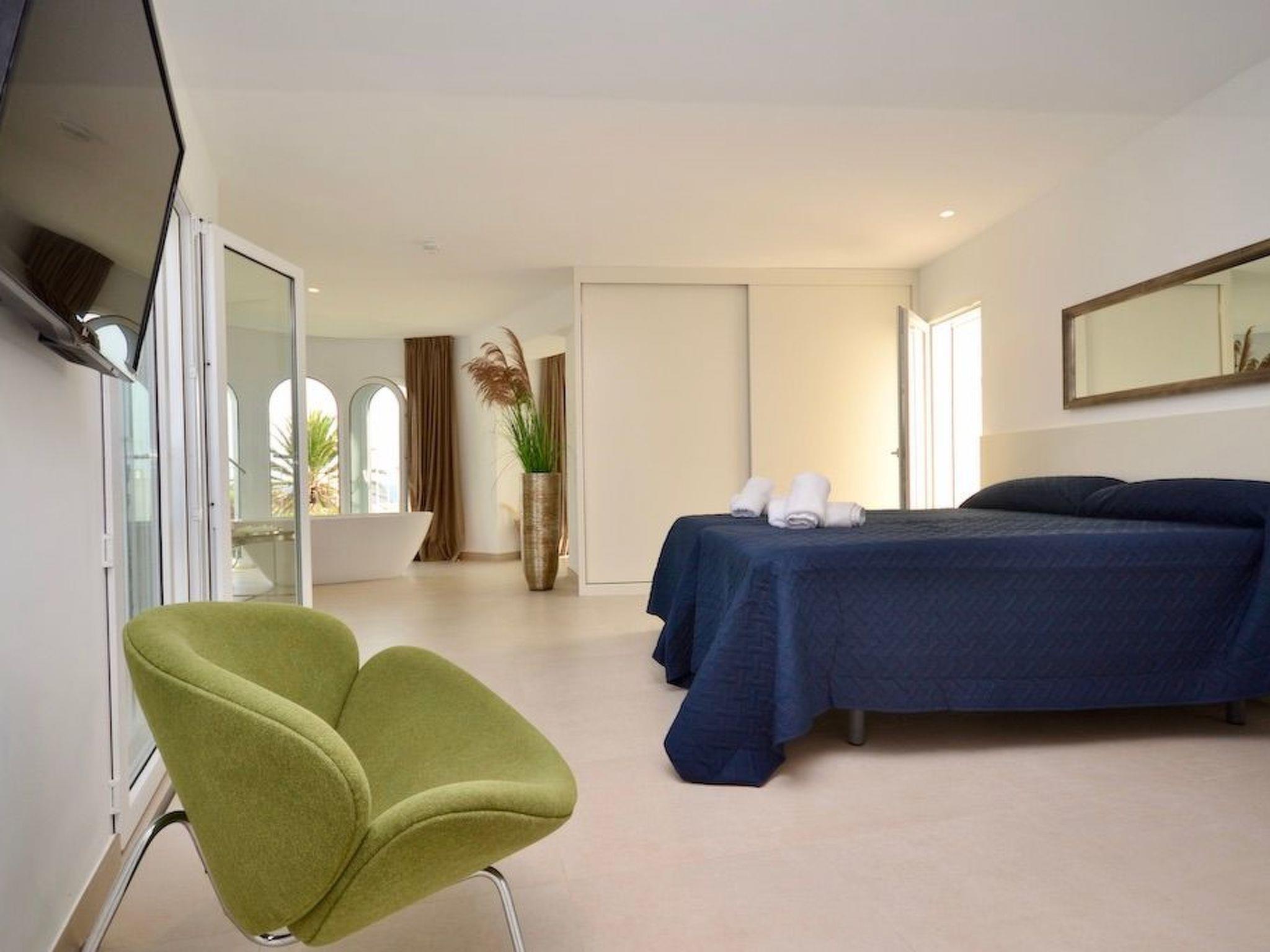 The first floor can be reached from the garden via an external staircase. We enter the bright, spacious master bedroom, which has a semi-circular bay window with a modern bathtub and partial sea views. The bathroom is fully integrated. On this level we find two further bedrooms with ensuite bathrooms. One of them with balcony.