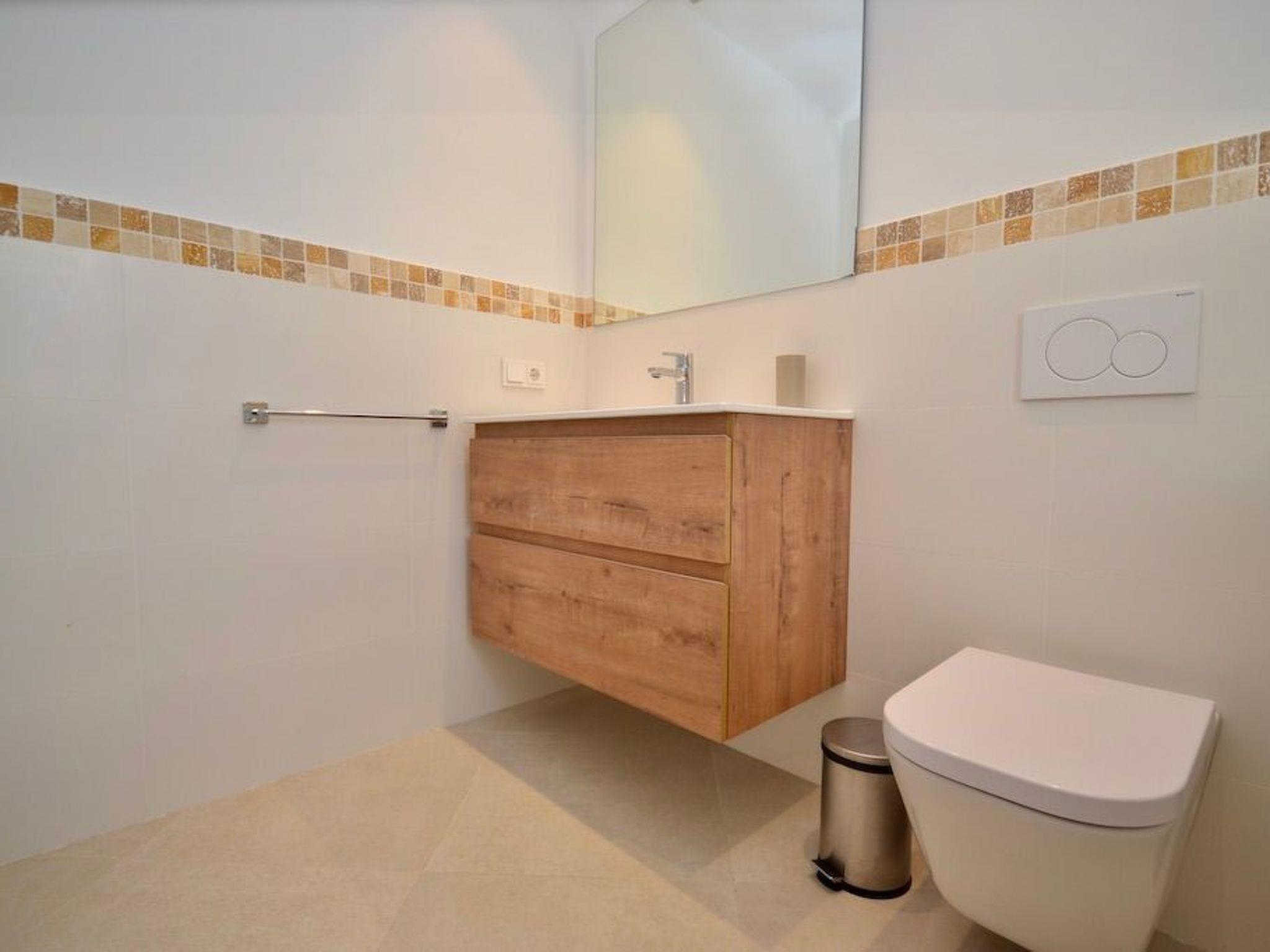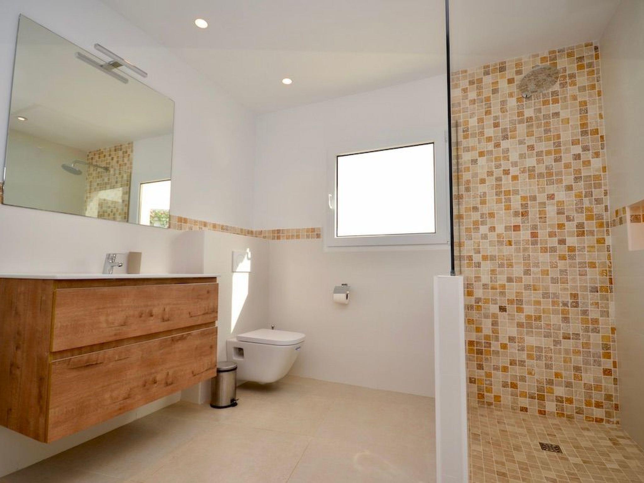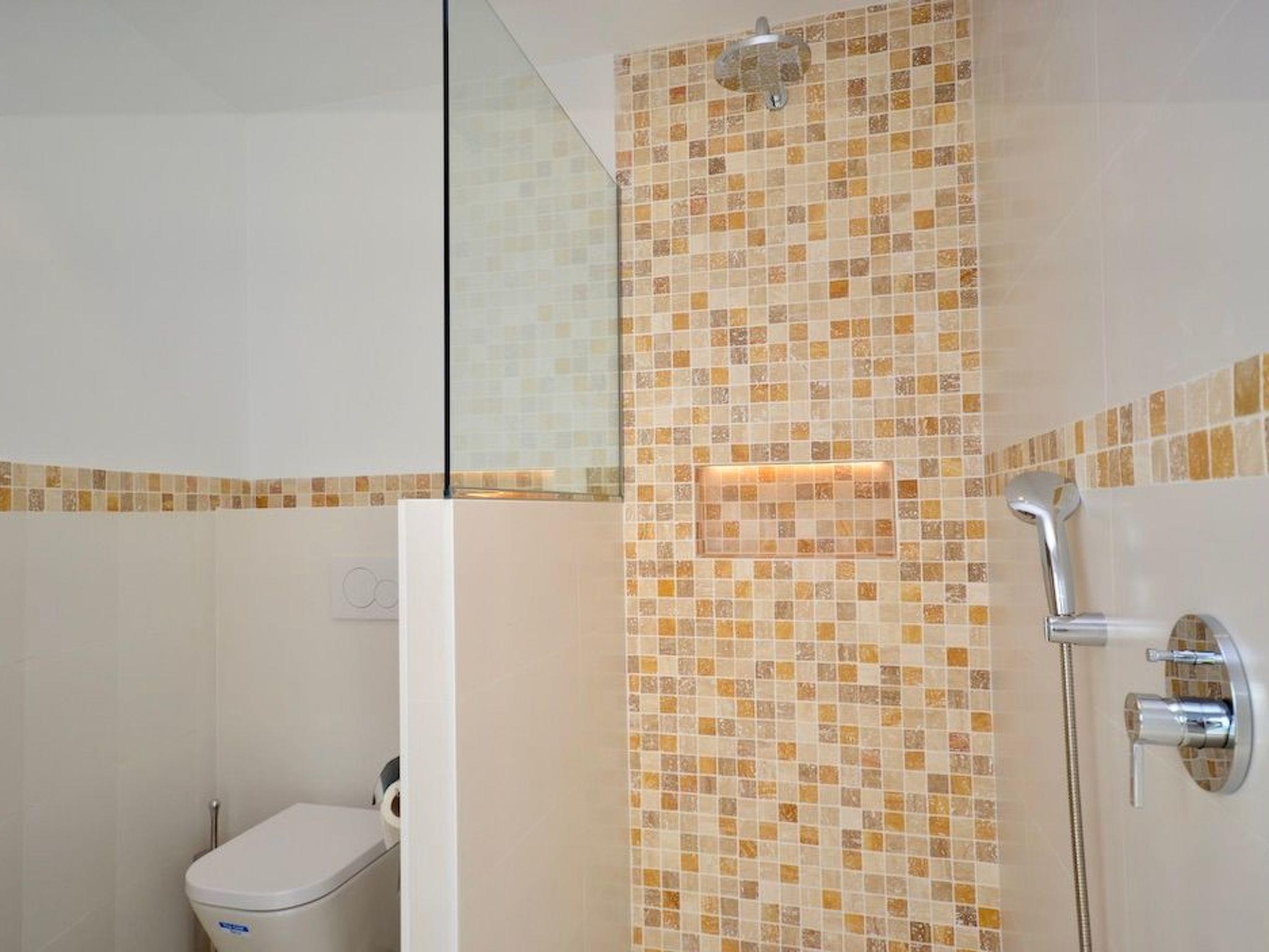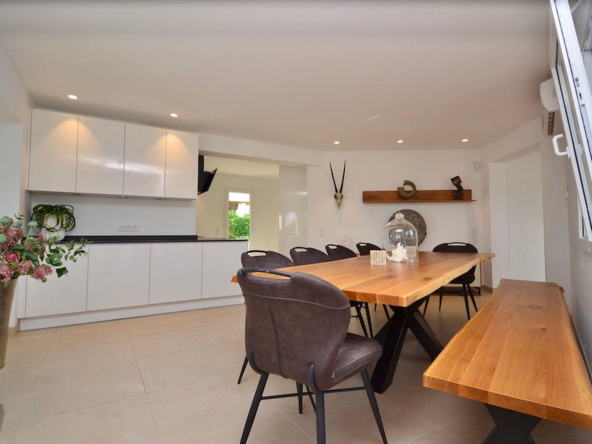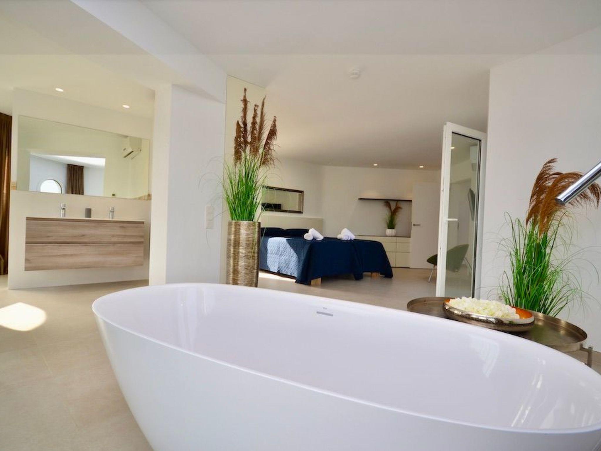 From the entrance you enter the spacious, bright and open-plan living/dining area. From the living area and the elegantly integrated kitchen you have access to the pool. In the adjoining room there is a wine fridge with integrated high table and stylish bar stools for cosy moments. On this level there are three bedrooms with en-suite bathrooms and access to the outside. Two bedrooms have double beds and one has two single beds.