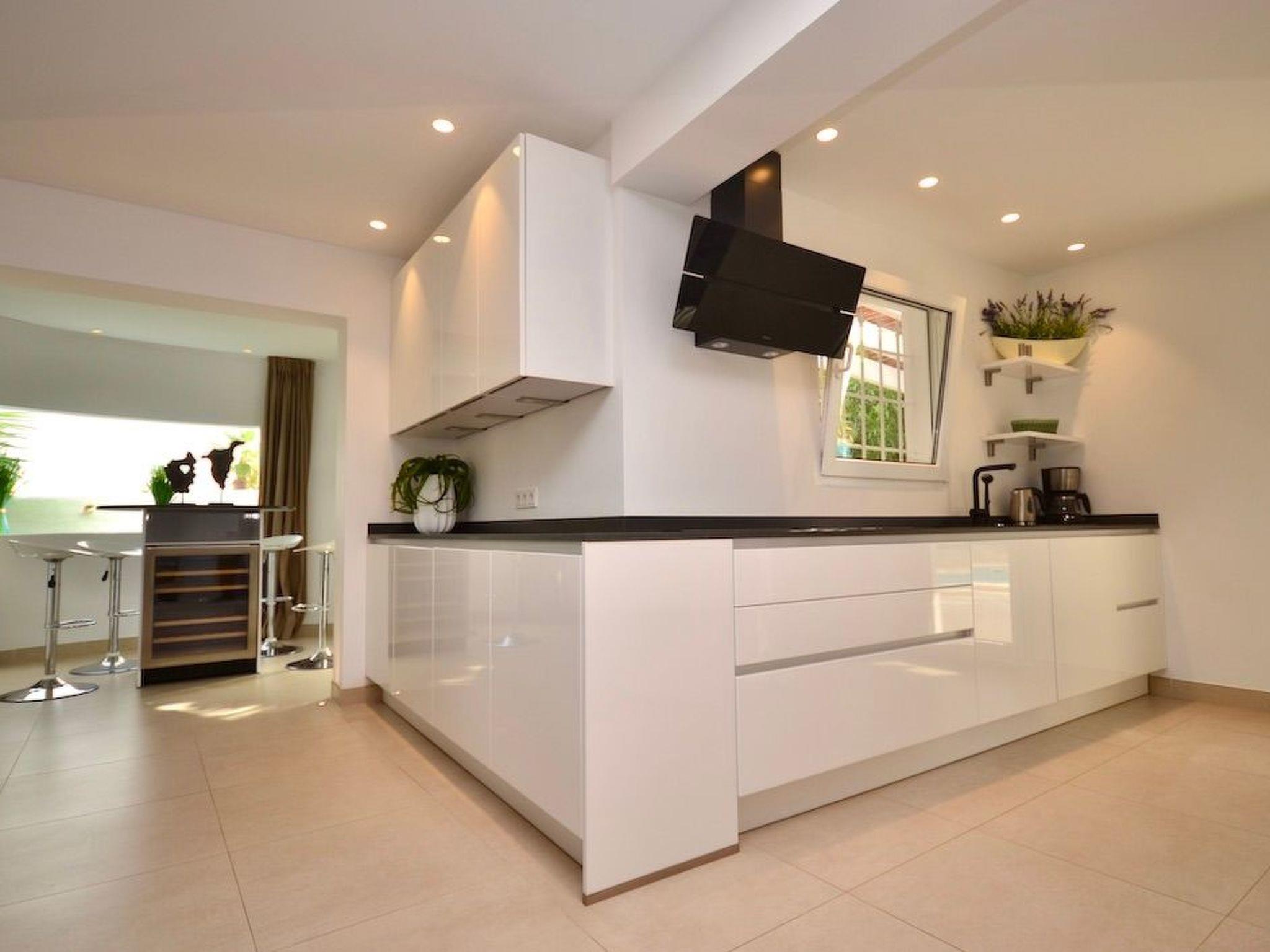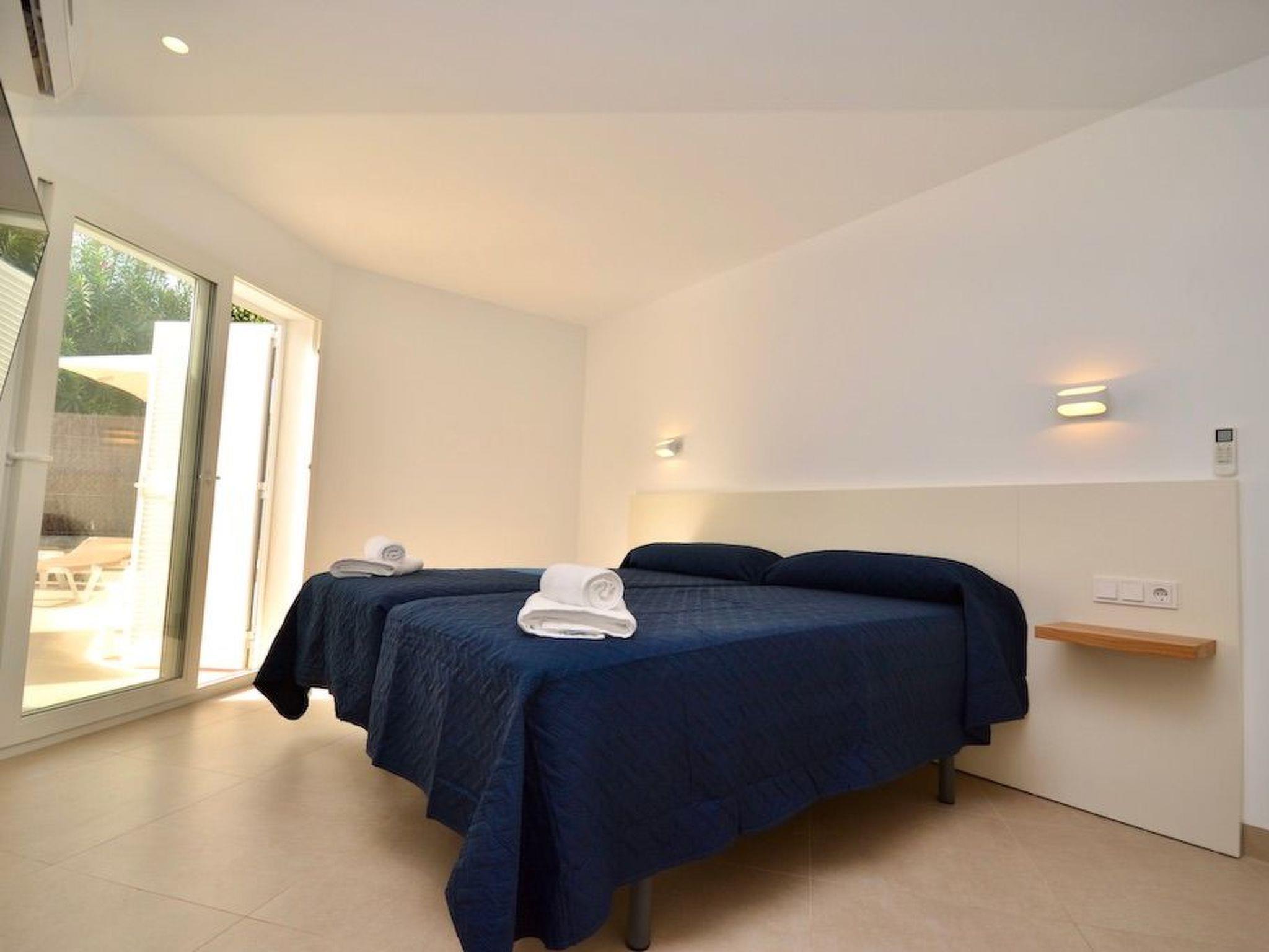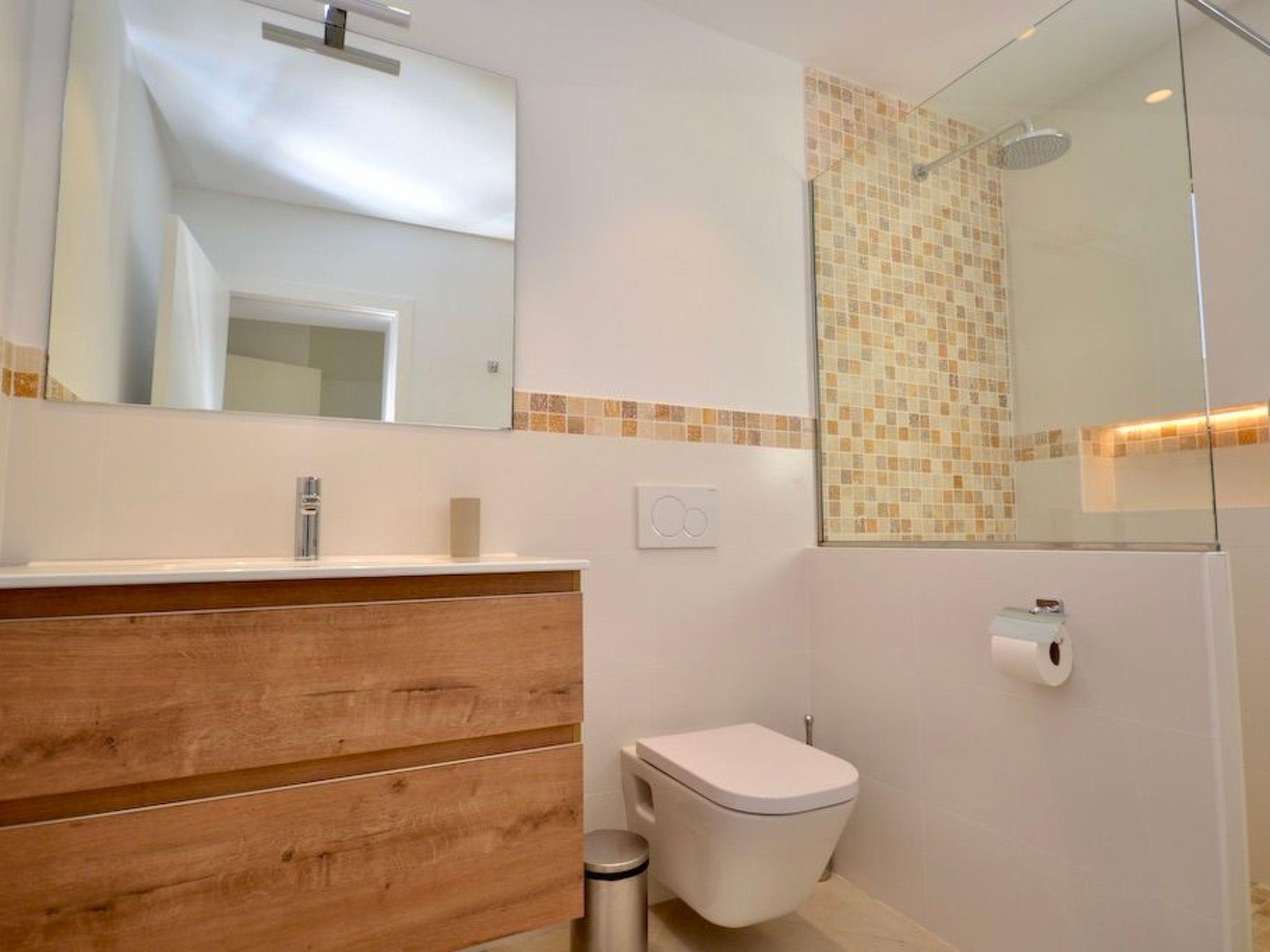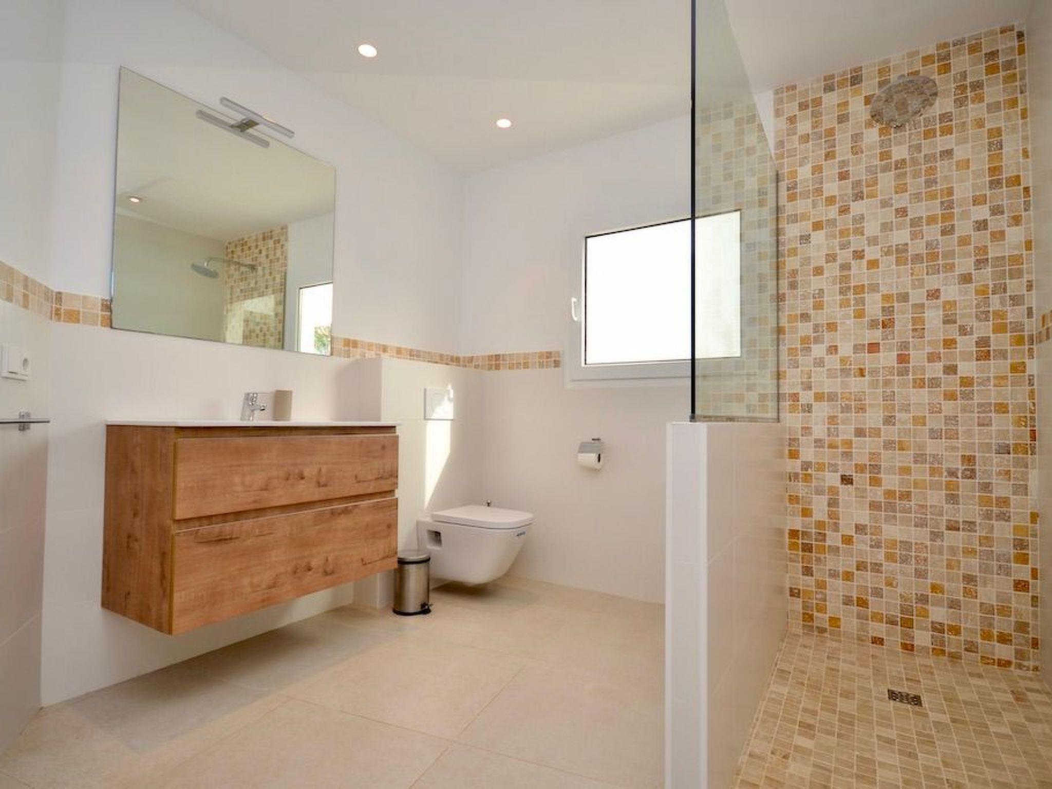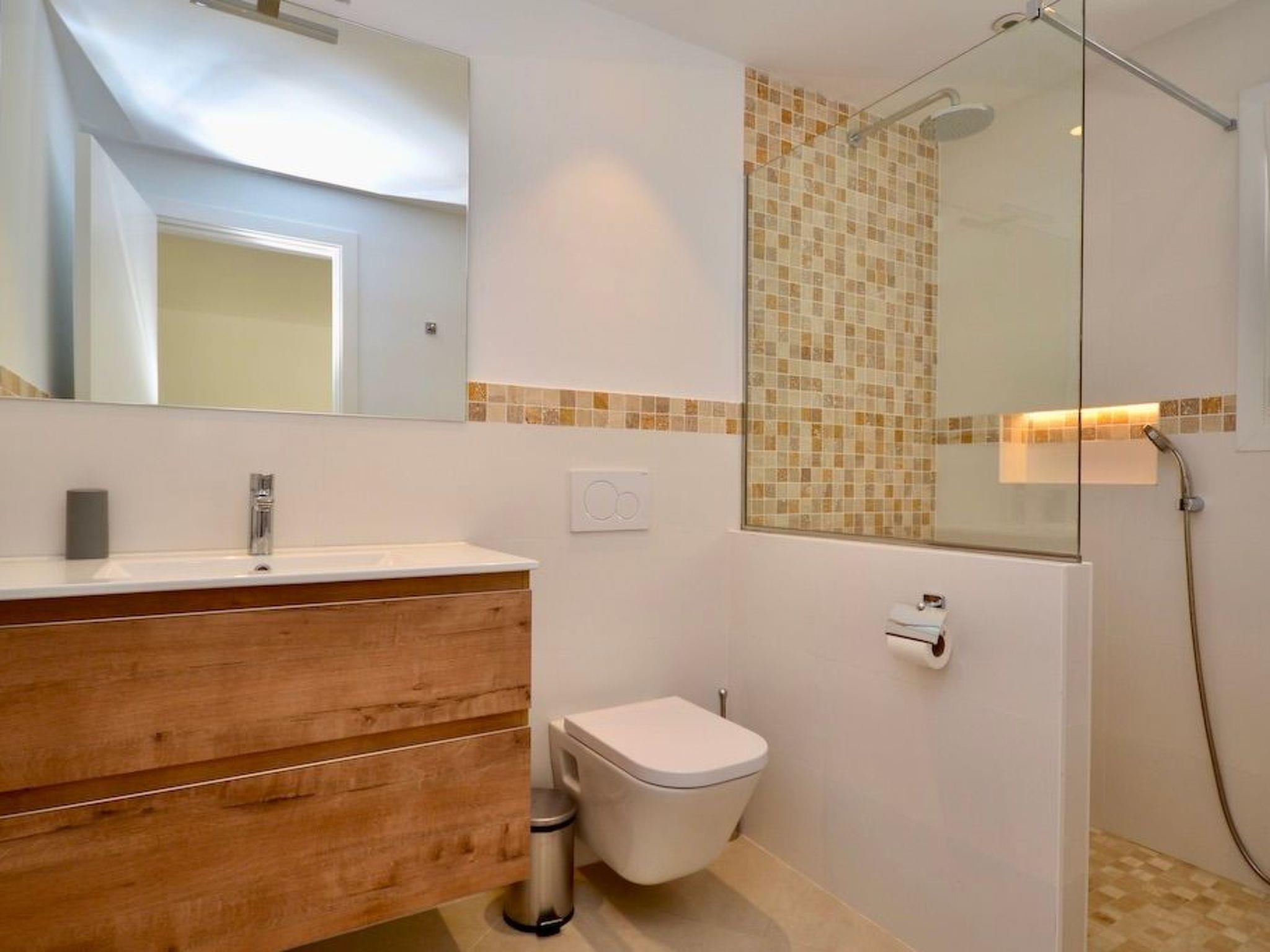 From the entrance you enter the spacious, bright and open-plan living/dining area. From the living area and the elegantly integrated kitchen you have access to the pool. In the adjoining room there is a wine fridge with integrated high table and stylish bar stools for cosy moments. On this level there are three bedrooms with en-suite bathrooms and access to the outside. Two bedrooms have double beds and one has two single beds.