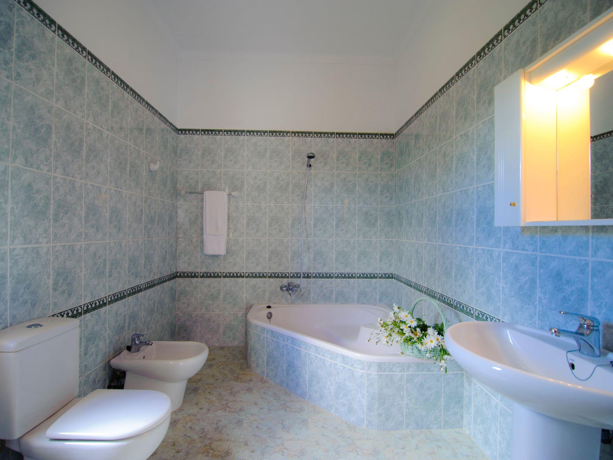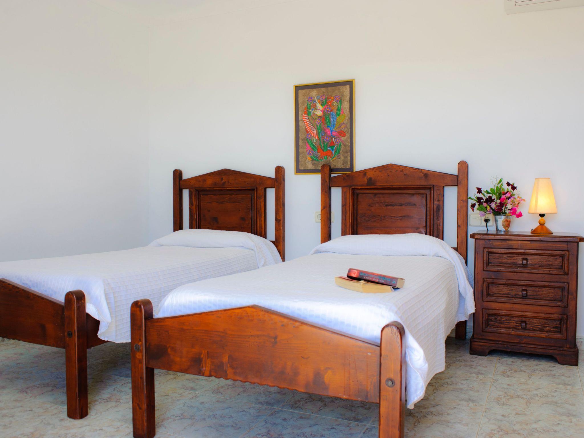 Finca Pleta de Sa Punta is a two-storey finca with plenty of natural light. The bedrooms are spacious and have en suite bathrooms. From the bright entrance, we reach the spacious living room with glass doors leading to the covered terrace and the pool. A door at the side leads into the inner courtyard. On the other side of the entrance is the dining room, which also leads onto the covered terrace. From the dining room we reach the kitchen with breakfast table and the utility room with washing machine. Access to the patio. There are two bedrooms in the inner courtyard. One with a double bed, the other with two single beds. Both bedrooms have en suite bathrooms with bathtub. From the inner courtyard, a staircase leads to the first floor, where there are two further bedrooms. One with a double bed and en suite bathroom with a corner bathtub, the other bedroom has two single beds and en suite bathroom with bathtub. These two bedrooms each have their own terrace.