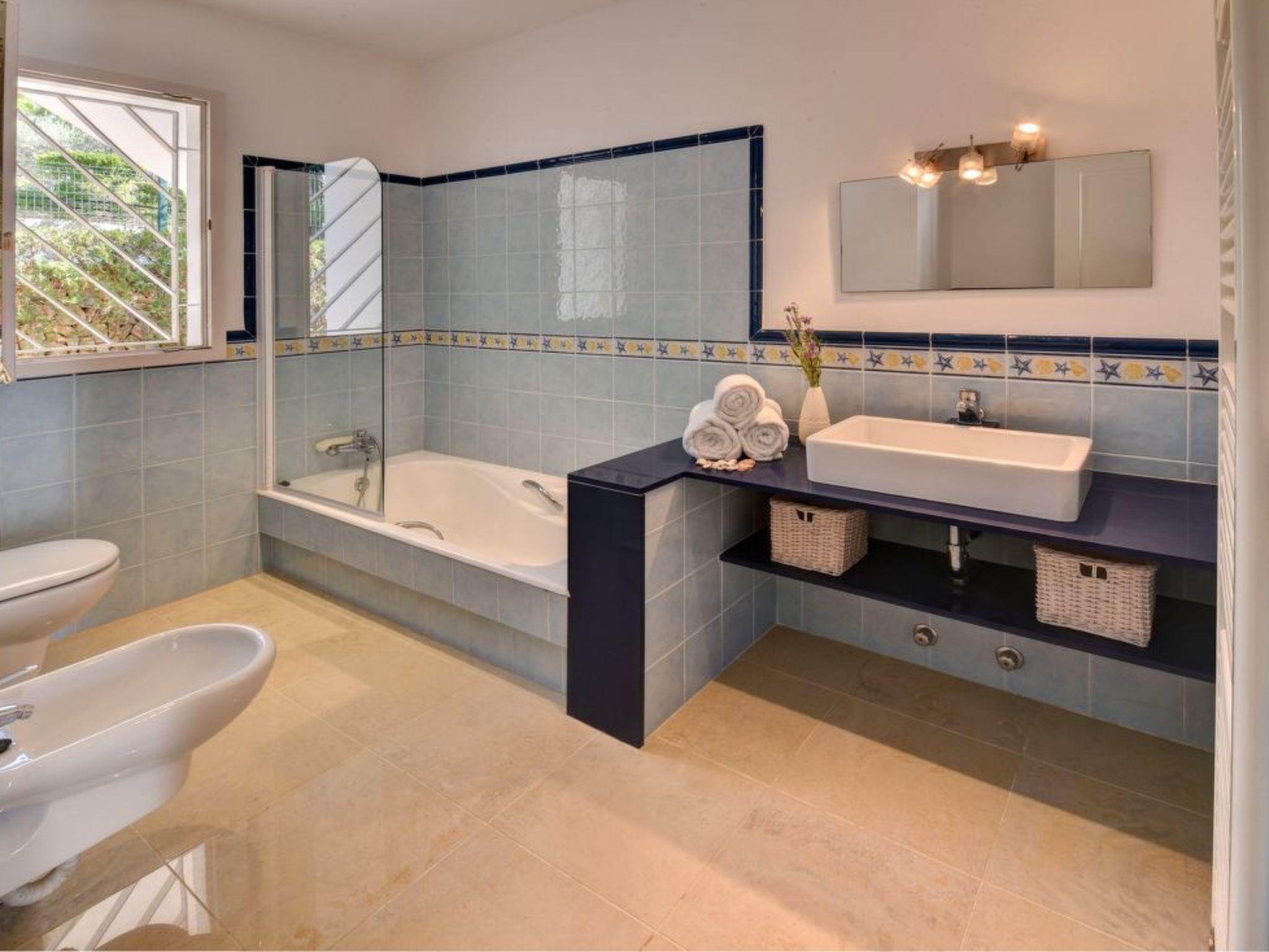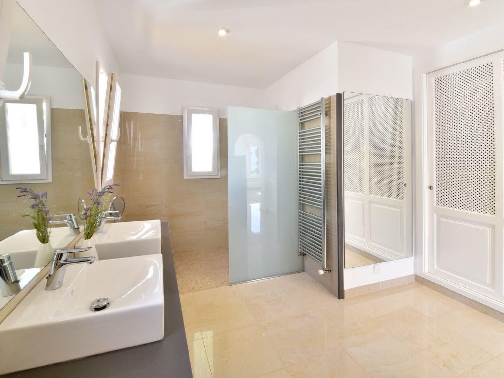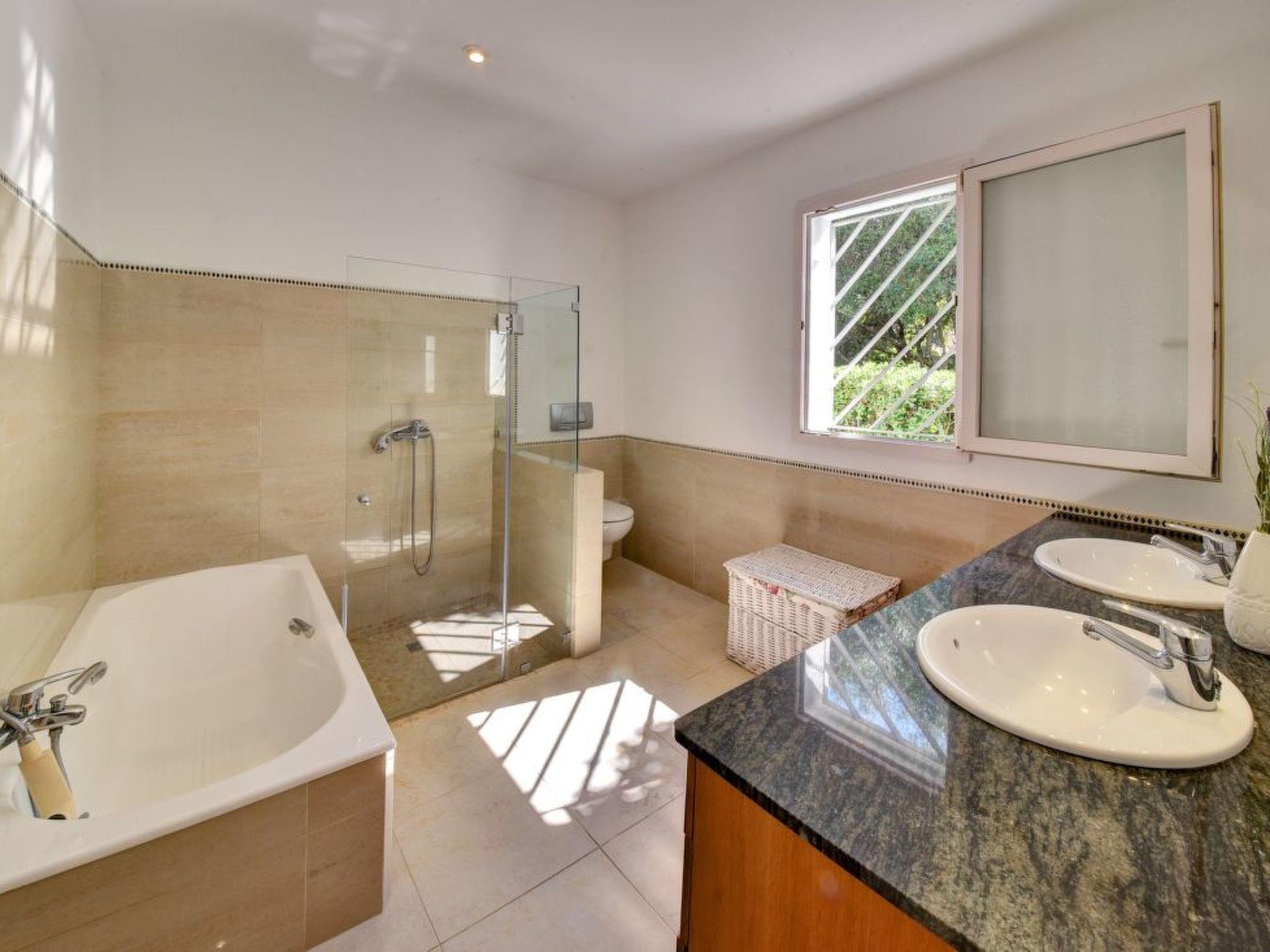 This spacious, light and airy villa consists of several levels. On the street level there is a spacious open-plan living/dining room with access to the covered terrace overlooking the lower pool area - this terrace also offers a vertical awning. The modern and large kitchen is equipped with a further dining table. Utility room and guest WC available. There is also the master bedroom with a double bed and en suite bathroom with separate bath and shower, as well as two twin bedrooms sharing a separate bathroom. On the upper floor there is a very spacious twin bedroom with an open-plan bathroom with shower. This bedroom has its own terrace with a lovely chill-out area and a side view of the small sandy bay of Cala Dor.