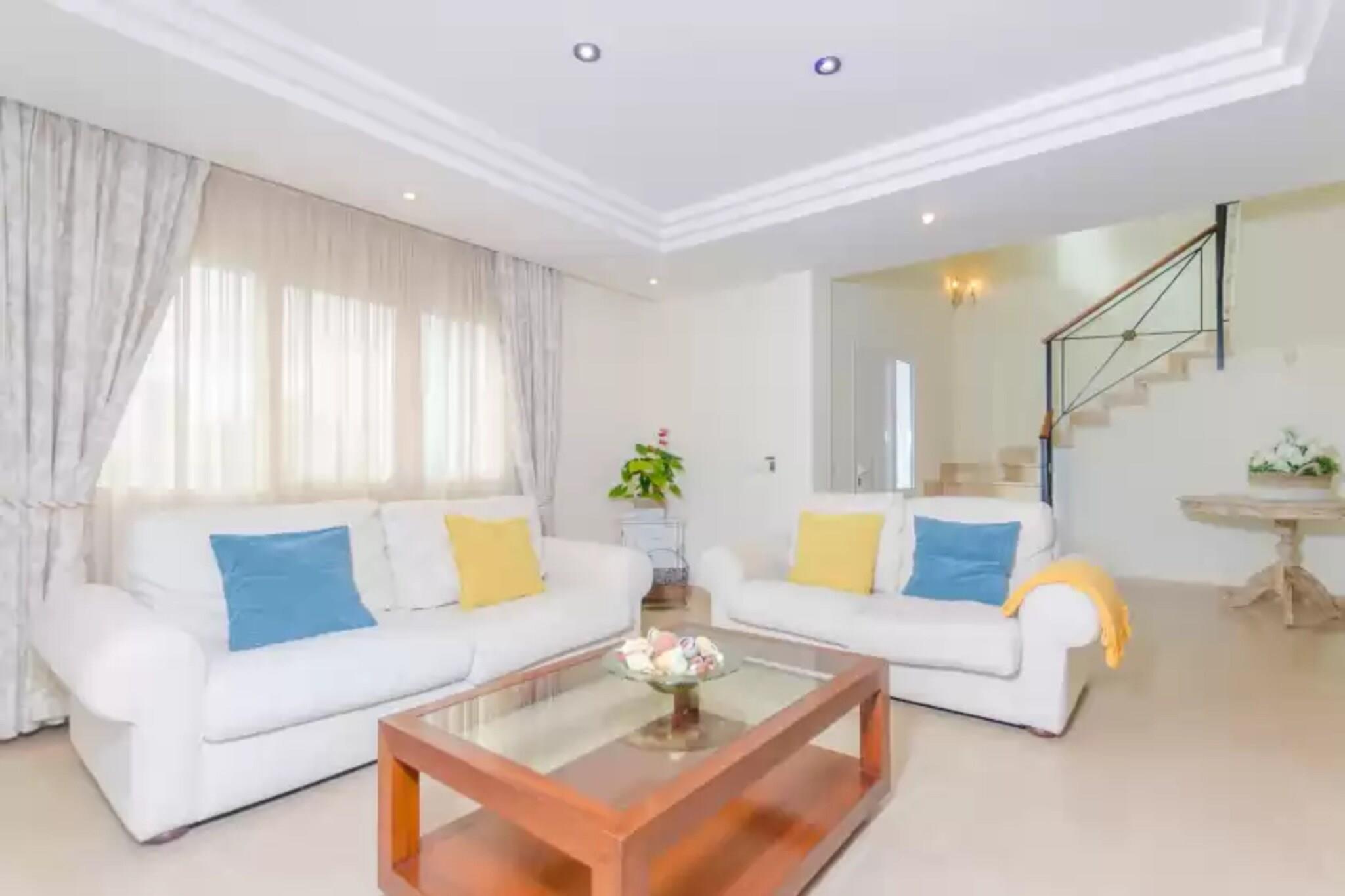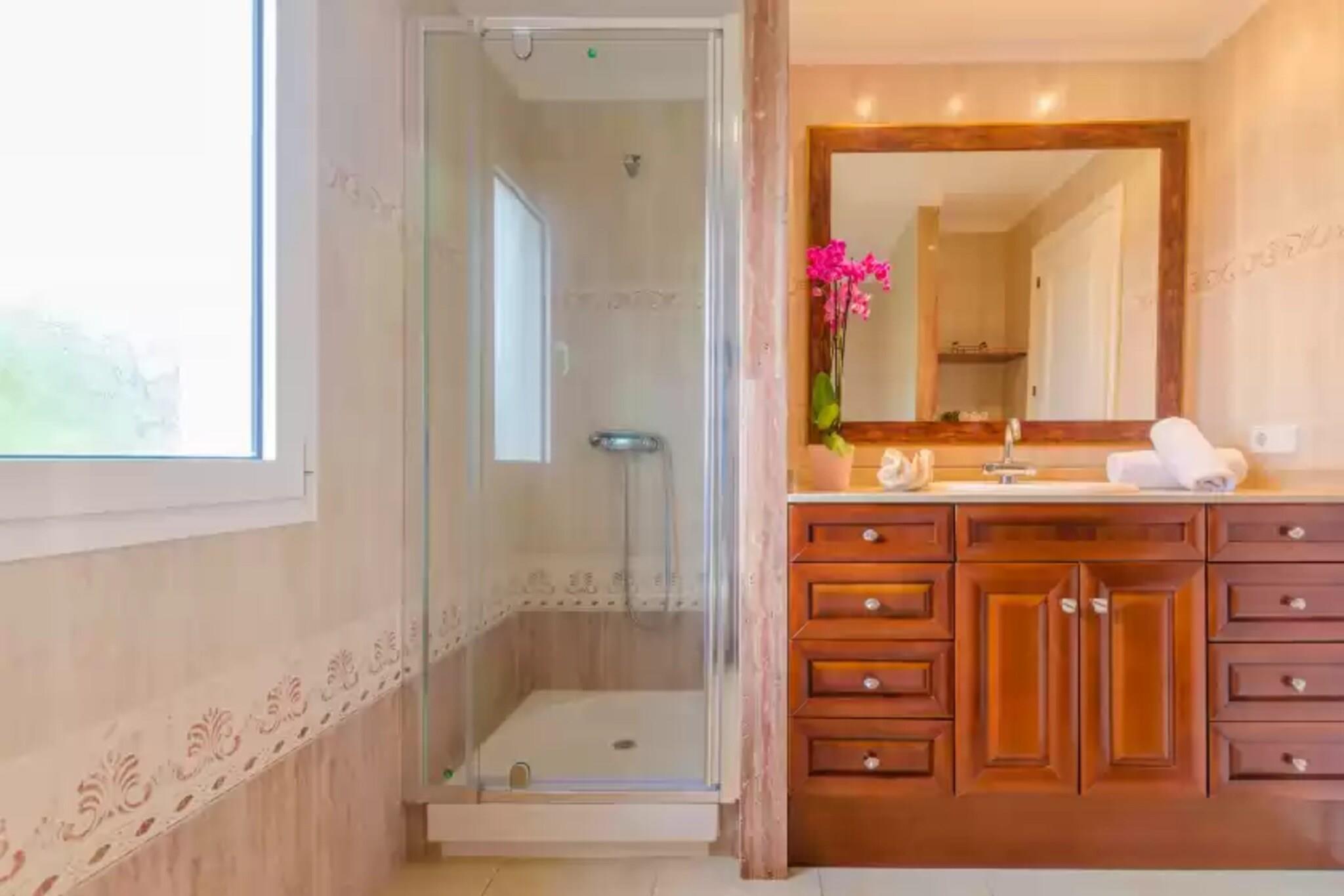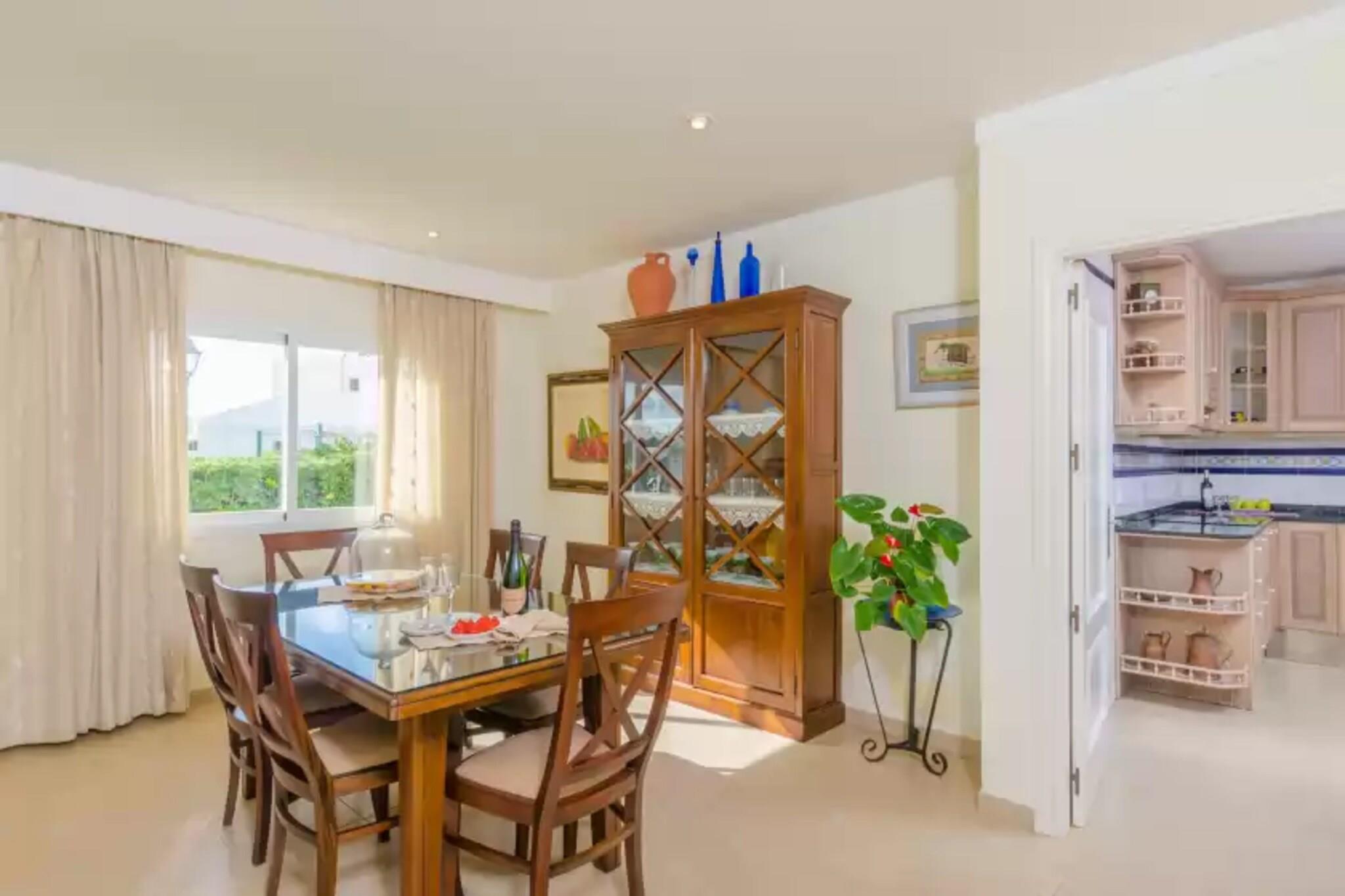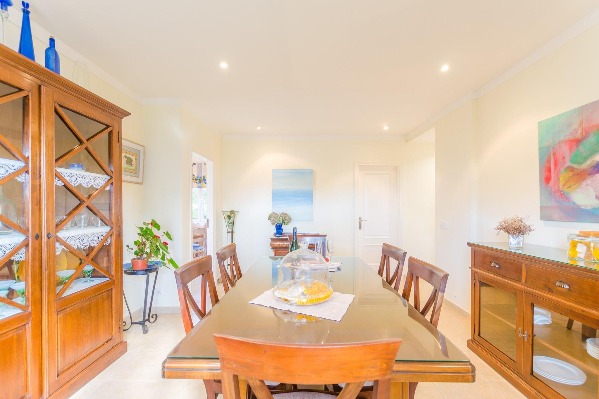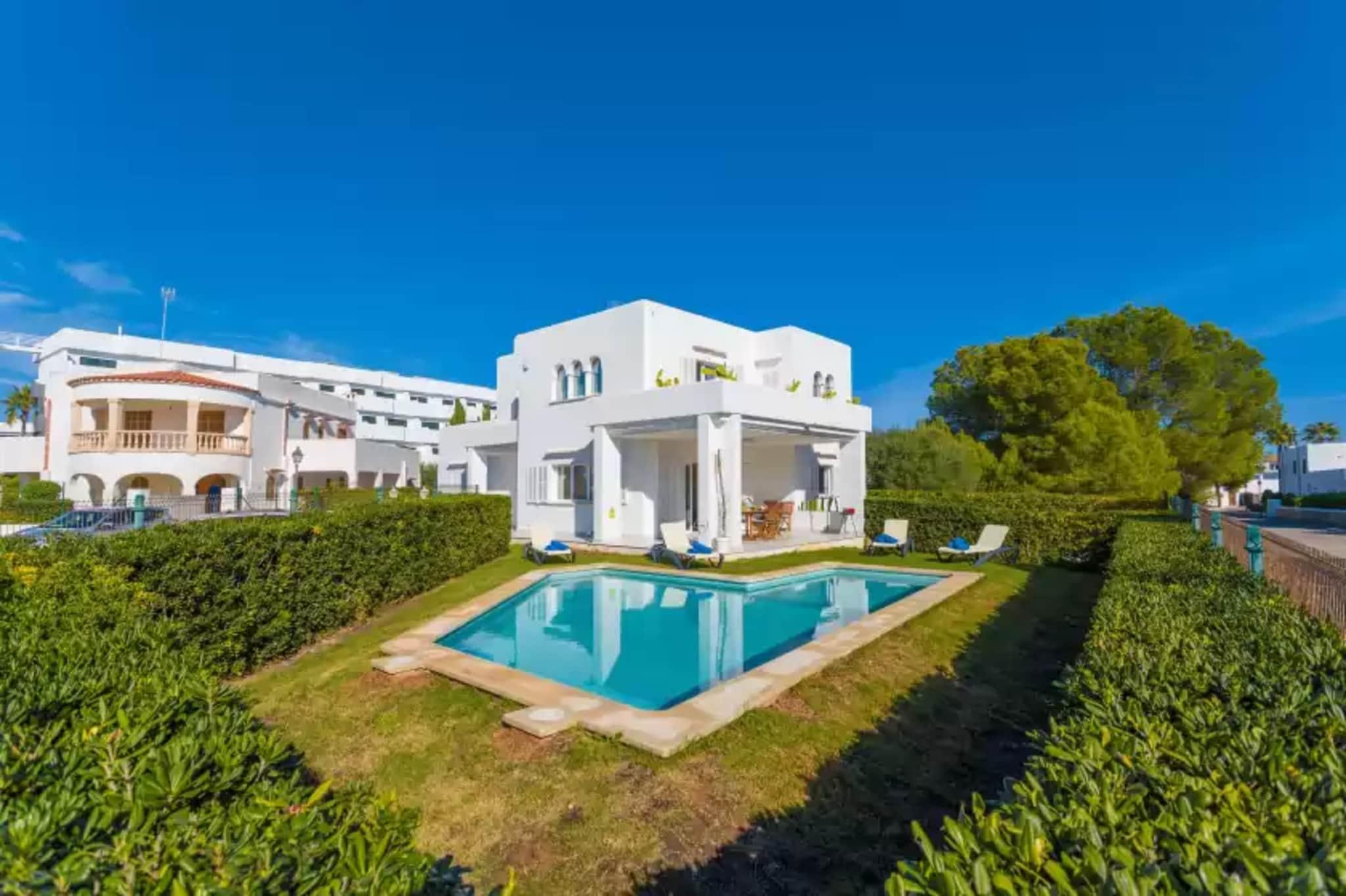 Slap af i denne smukke villa med en privat 9 x 2,8 m klorpool (0,5–1,8 m dyb), perfekt til at slappe af og nyde den mallorcanske sol. Udendørsområdet er omgivet af en græsplæne og en privat hæk og har også en veranda med spiseplads og en mobil grill - ideel til at nyde måltider med familie eller venner. Den indhegnede ejendom sikrer et fredeligt ophold med direkte naboer i nærheden. Fordelt på 2 etager og 360 m² byder villaen på et lyst, moderne interiør i naturlige toner. Den airconditionerede stue inviterer dig til at slappe af med satellit-tv eller en god bog, mens den uafhængige spisestue komfortabelt har plads til 6. Det fuldt udstyrede køkken omfatter en keramisk kogeplade, ovn, opvaskemaskine og et morgenbord. En vaskemaskine, strygejern og strygebræt er også tilgængelige. Vælg mellem 3 soveværelser med aircondition: et dobbeltværelse med en-suite (badekar) i stueetagen og to ovenpå (en dobbeltseng og en tvilling) sammen med et ekstra brusebadeværelse. En barneseng og høj stol er til rådighed. Beliggende i Cala Egos, kun 950 m fra stranden, og tæt på Cala d'Or og Porto Petro. Nyd nærliggende butikker, restauranter og fantastiske strande som Cala Esmeralda og Mondragó Naturpark. Ingen kæledyr eller arrangementer tilladt.