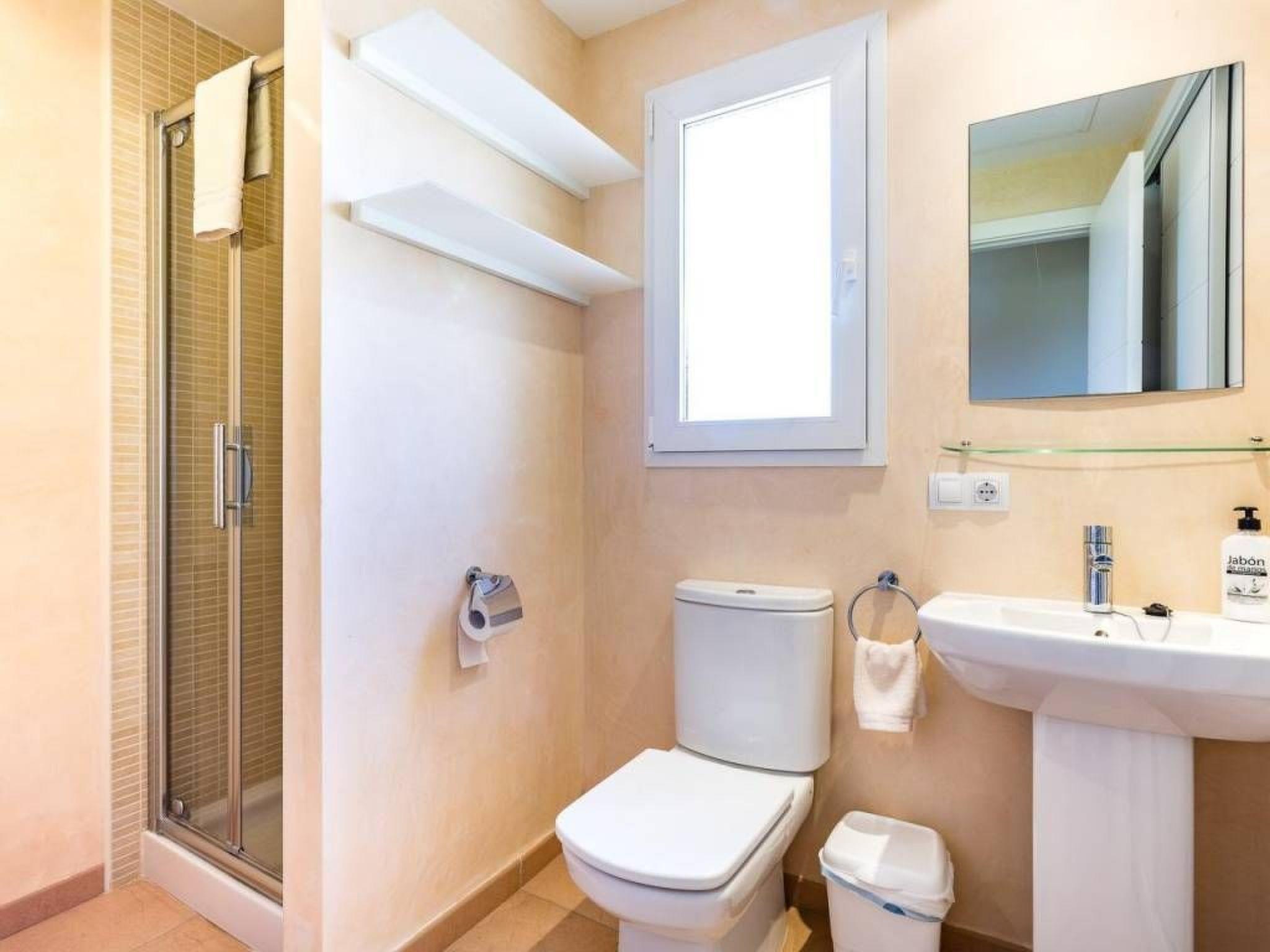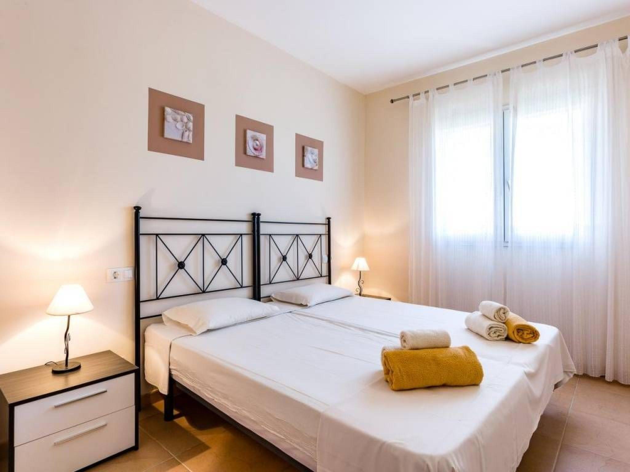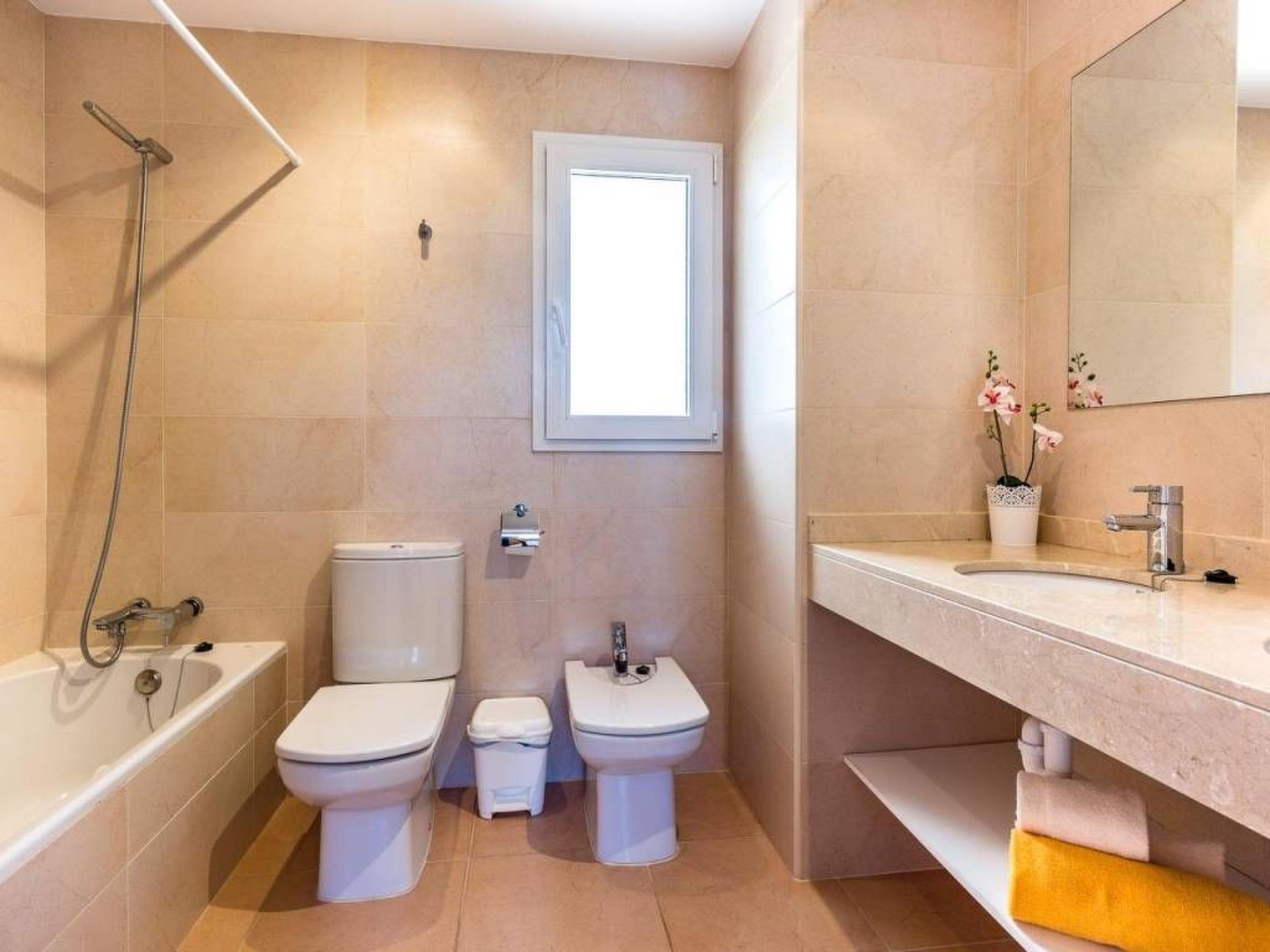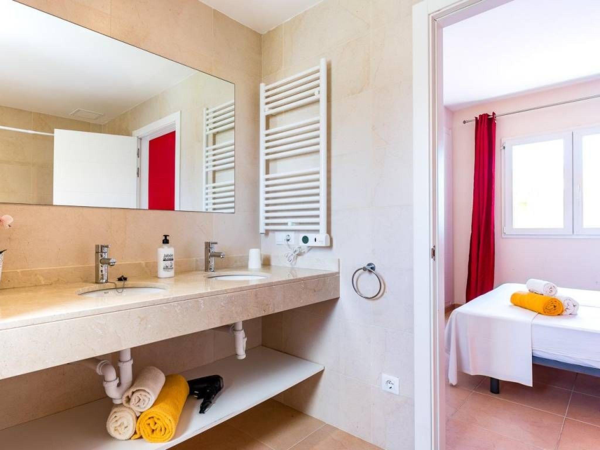 Modern holiday apartment with communal pool near to the beach and golf courses in the surrounding areaThe Mediterranean second floor apartment is located in the beautiful residential area of El Paraiso (Campos municipality/ Sa Rapita area). The complex is in close proximity to the beach of Es Trenc.The maximum occupancy is six people (four adults and two children) per apartment. This modern second floor apartment has high-quality furnishings. A spacious and light-filled living-dining area with direct access to the balcony, two bedrooms, two bathrooms are available. The modern kitchen is equipped with dishwasher, large fridge with separate freezer compartment, oven, Ceran hob, coffee machine, toaster, electric hand mixer and washing machine. Further amenities include satellite TV, an ironing board, iron and tea towels.A roofed and open balcony, as well as a private roof terrace with a partial sea view are available. There is a very large communal swimming pool (including children's pool). The residential complex has a very spacious pool area.Free WLAN access for all tenants is available throughout the whole complex. Upon request, children’s or extra beds can be provided.The second floor apartment in Sa Rapita (Campos municipality) is just 2 km from the beautiful sandy beach of Es Trenc. You can reach the popular natural sandy beach of Es Trenc and the surrounding golf courses of Son Antem, Son Gual and Maioris in a few minutes by car.