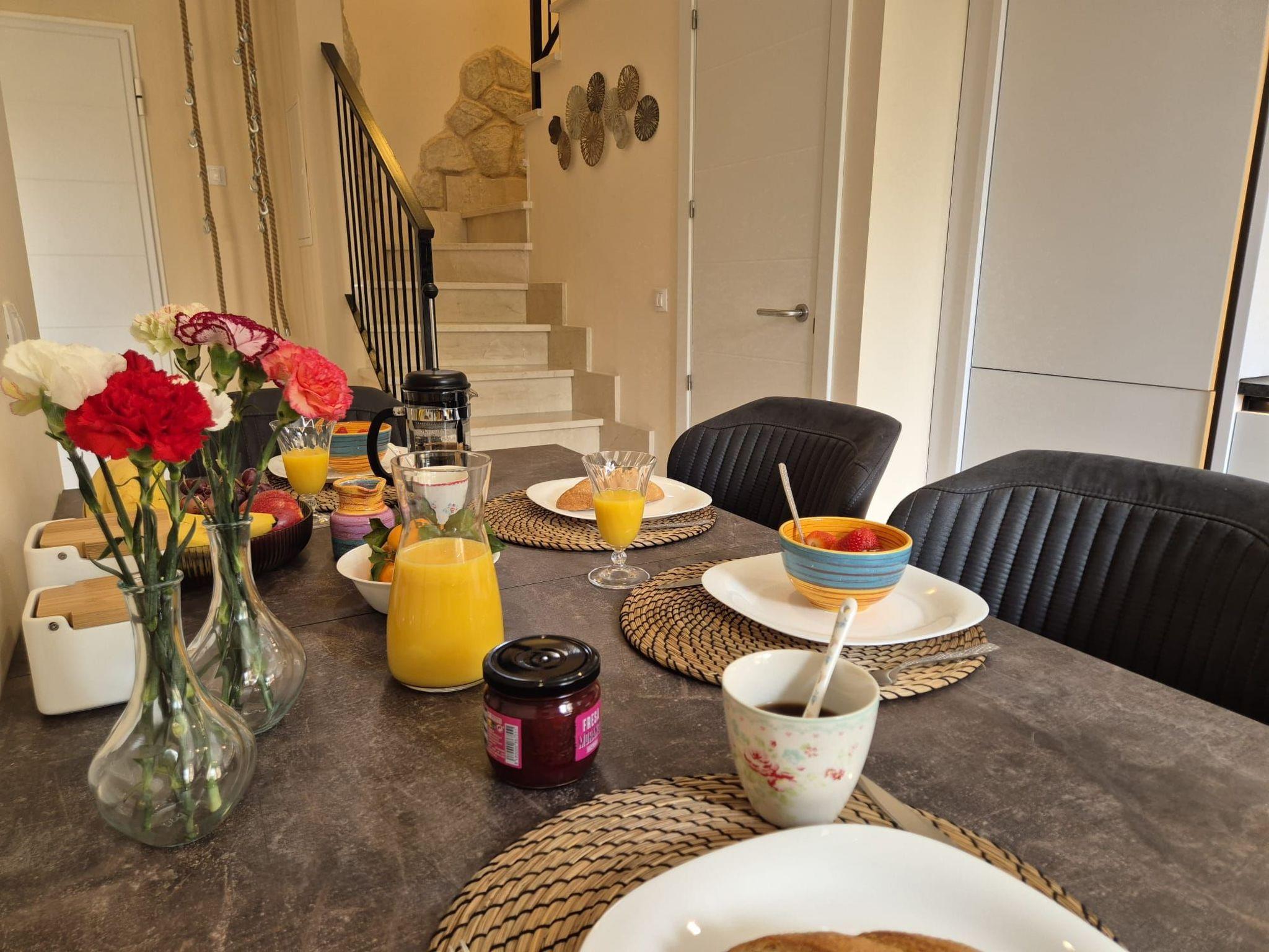 Our 100m² Mediterranean holiday home was completely renovated in March 2024 and equipped with a new kitchen and high-quality furniture. It was individually + lovingly furnished. The house has a modern and fully equipped kitchen on the ground floor. It is equipped with a dishwasher, large fridge with separate freezer compartment, oven with microwave, ceramic hob, coffee machine, toaster, blender and tea towels. A cosy living room with satellite TV and a guest WC with washing machine, ironing board and iron are also located on the ground floor. The living room door leads to the covered and open terrace with adjoining small private garden. The garden provides access through the holiday complex to the spacious communal pool (including children's pool).
