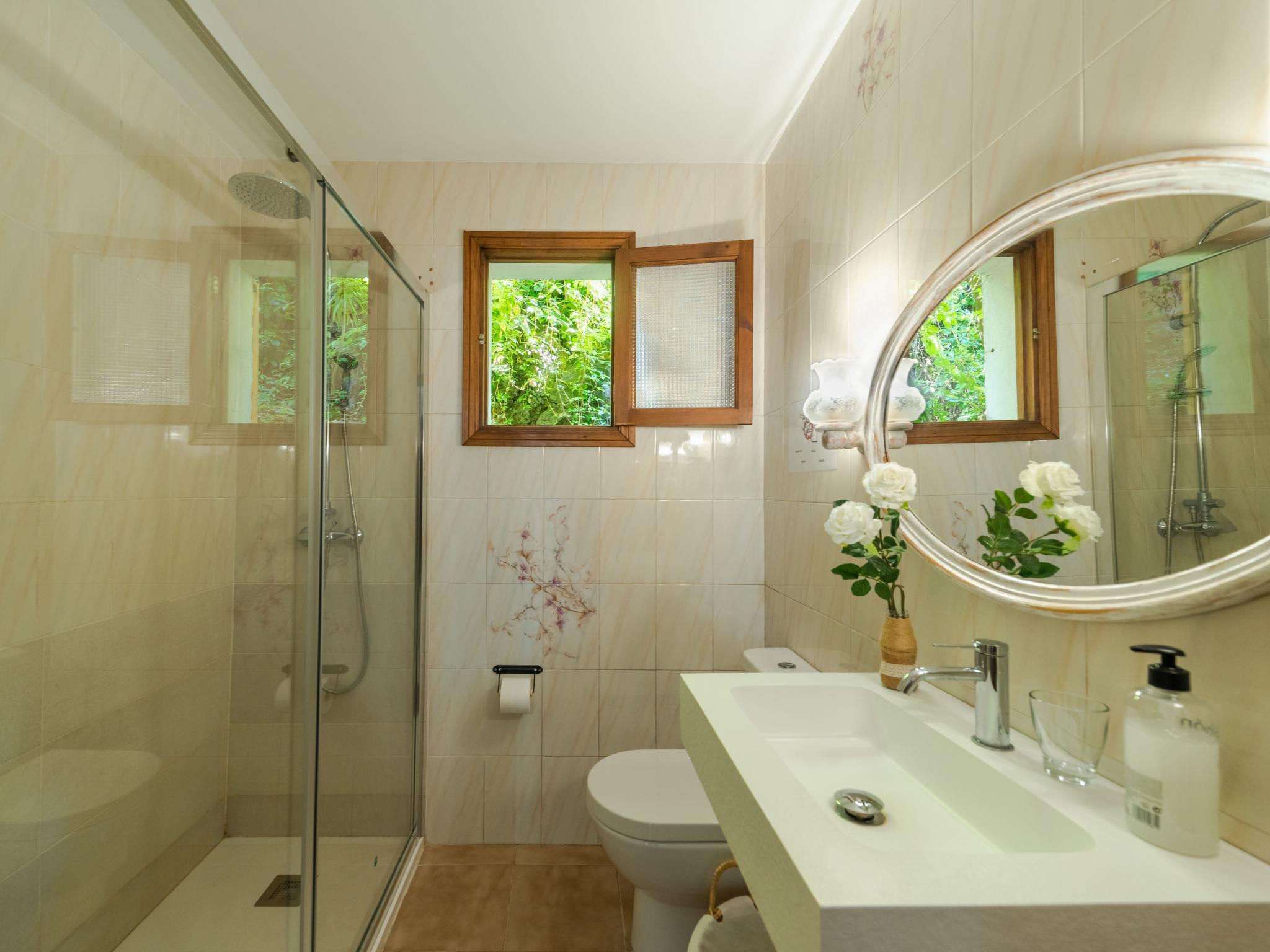 Cala Tuent 27 km from Lluc: Very cosy, rustic farm estate "Cala Tuent", 2 storeys, detached, surrounded by trees and meadows. In the district of Cala Tuent, in a secluded, quiet, sunny position on top of a hill, 200 m from the sea, from the beach. Private: natural state property (fenced), natural garden (fenced). Patio, pergola, garden furniture, barbecue. In the house: internet access, WiFi, air conditioning, laundry, washing machine, tumble dryer. Steep, narrow motor access. Parking (for 2 cars) on the premises. Shop 26.9 km, grocery 26.9 km, supermarket 26.9 km, restaurant, bar 300 m, bakery 26.9 km, café, pub garden 300 m, bus stop "Lluc" 26 km, railway station "Soller" 40 km, shingle beach "Cala Tuent" 200 m. Walking paths from the house, cycle lane 100 m. Nearby attractions: Sa Calobra 6.4 km, Torrent de Pareis 7.6 km, Santuario de Lluc 26.1 km. Please note: car recommended. Suitable for families. Object suitable for 6 adults groups of teenagers on request only. Loading and unloading of baggage is possible at the holiday house. Animals in the neighbourhood. Main road close by. Airfield 75 km from the property.