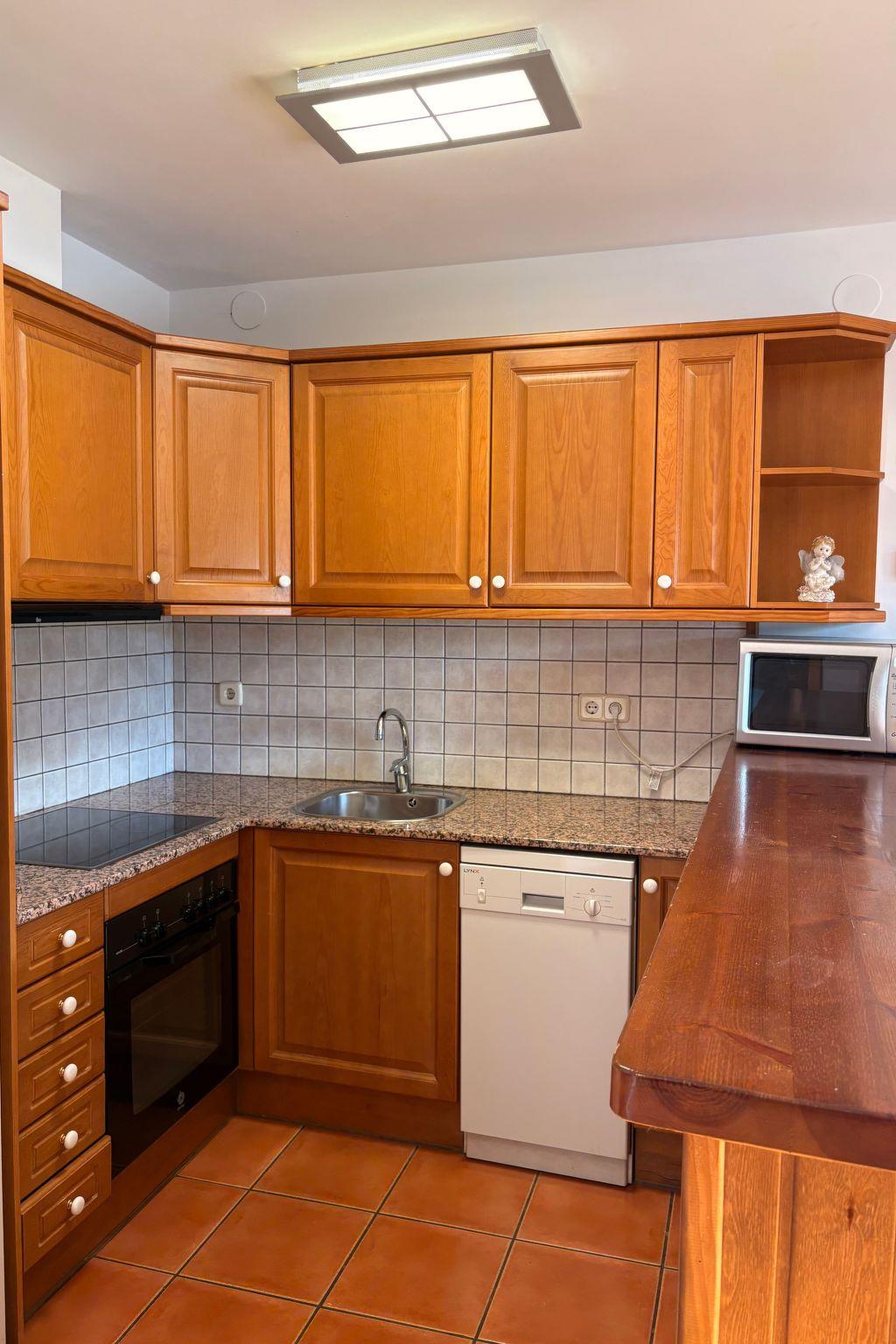 The interior of the flat is notable for its well laid out and well-equipped spaces to ensure a comfortable and pleasant stay. It consists of three cosy bedrooms, one of them with two single beds, and two double bedrooms, ensuring a refreshing rest after a day of adventures. In addition, the living room has a comfortable 1'50 sofa bed, ideal for accommodating two additional people. The kitchen comes fully equipped, including a ceramic hob and dishwasher, making it easy to prepare delicious meals as if you were at home. The washing machine for exclusive use adds even more convenience to your stay.